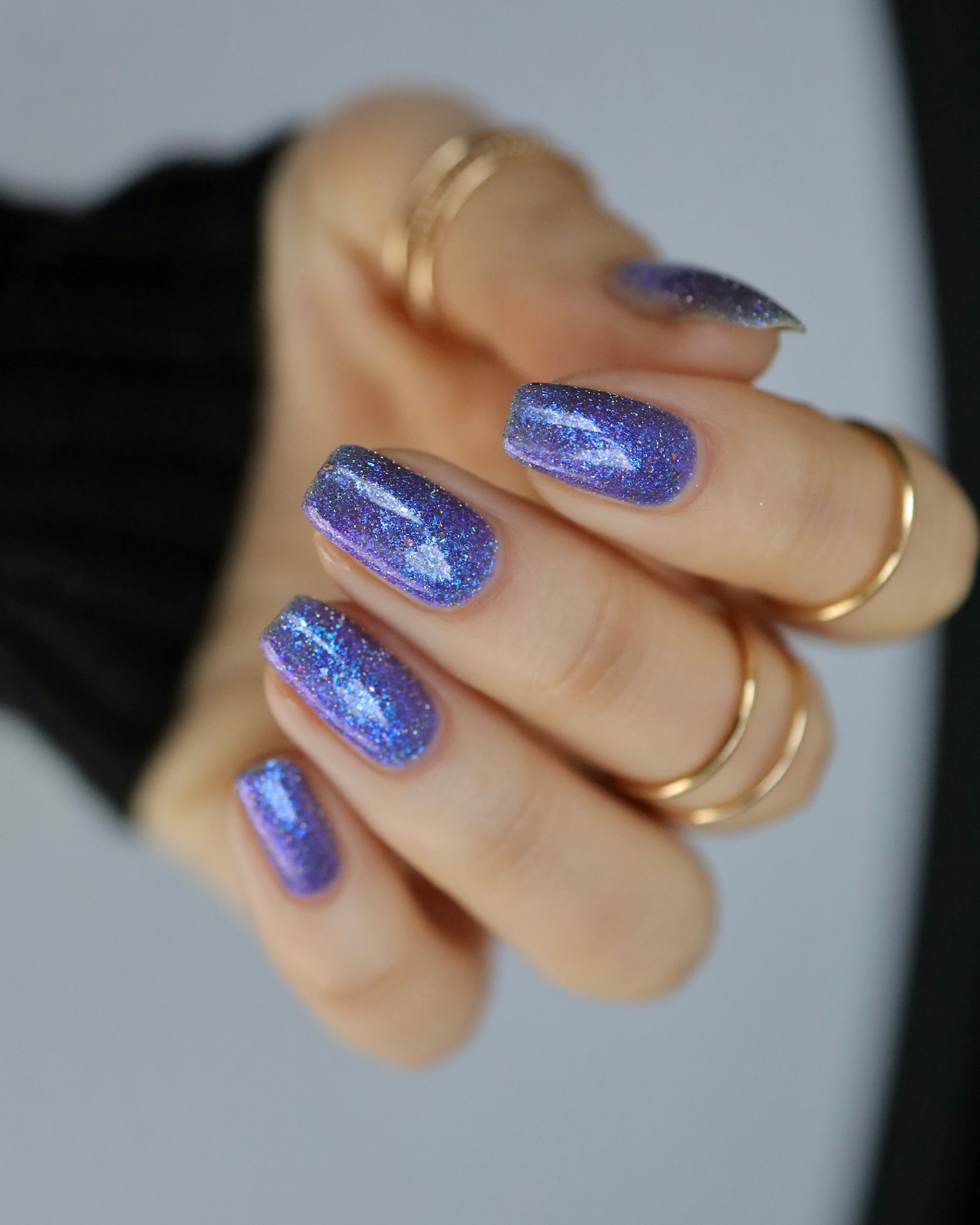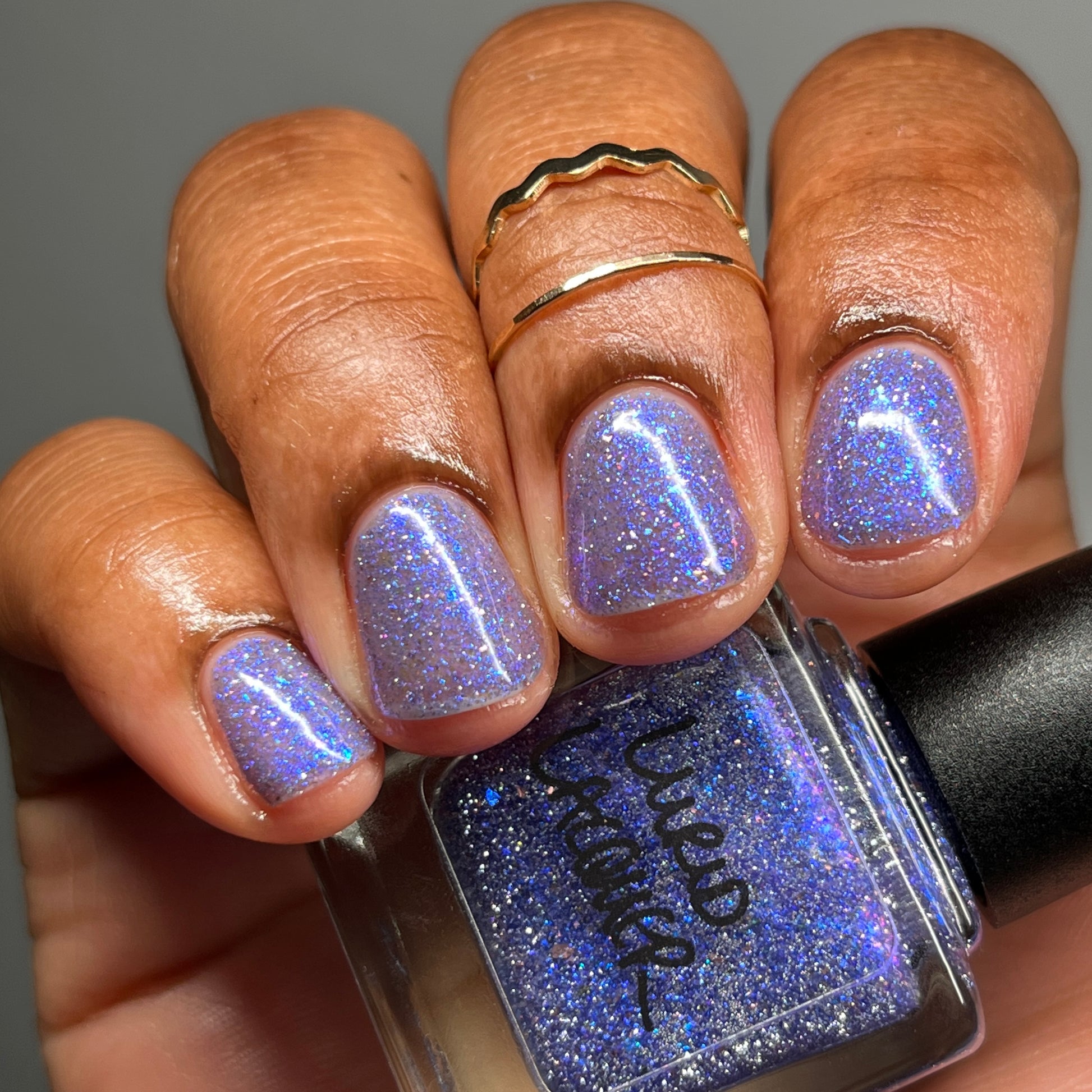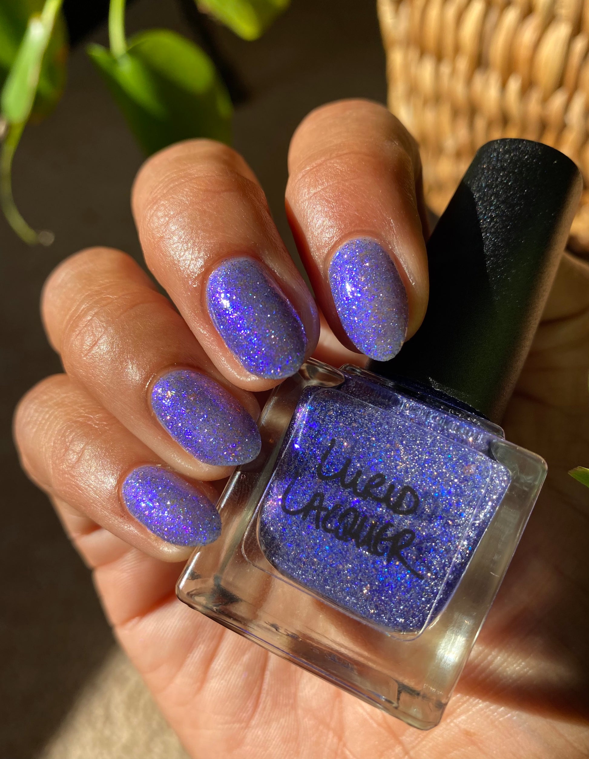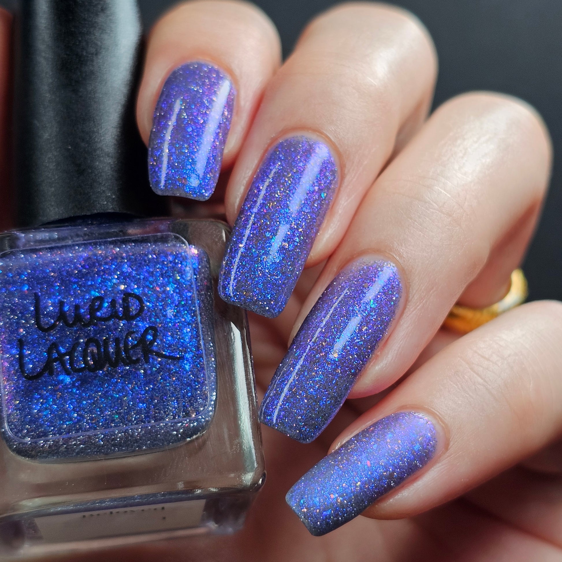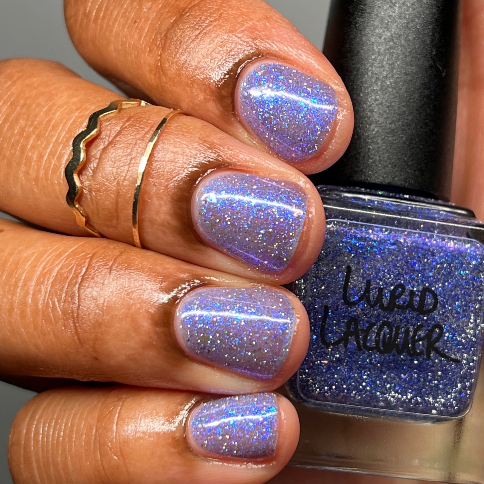 An indigo jelly base with iridescent flakes that shift from blue to purple, rose gold metallic flakies, silver light reflective glitter, and a sprinkle of aurora pigment that shifts from blue to purple to pink.