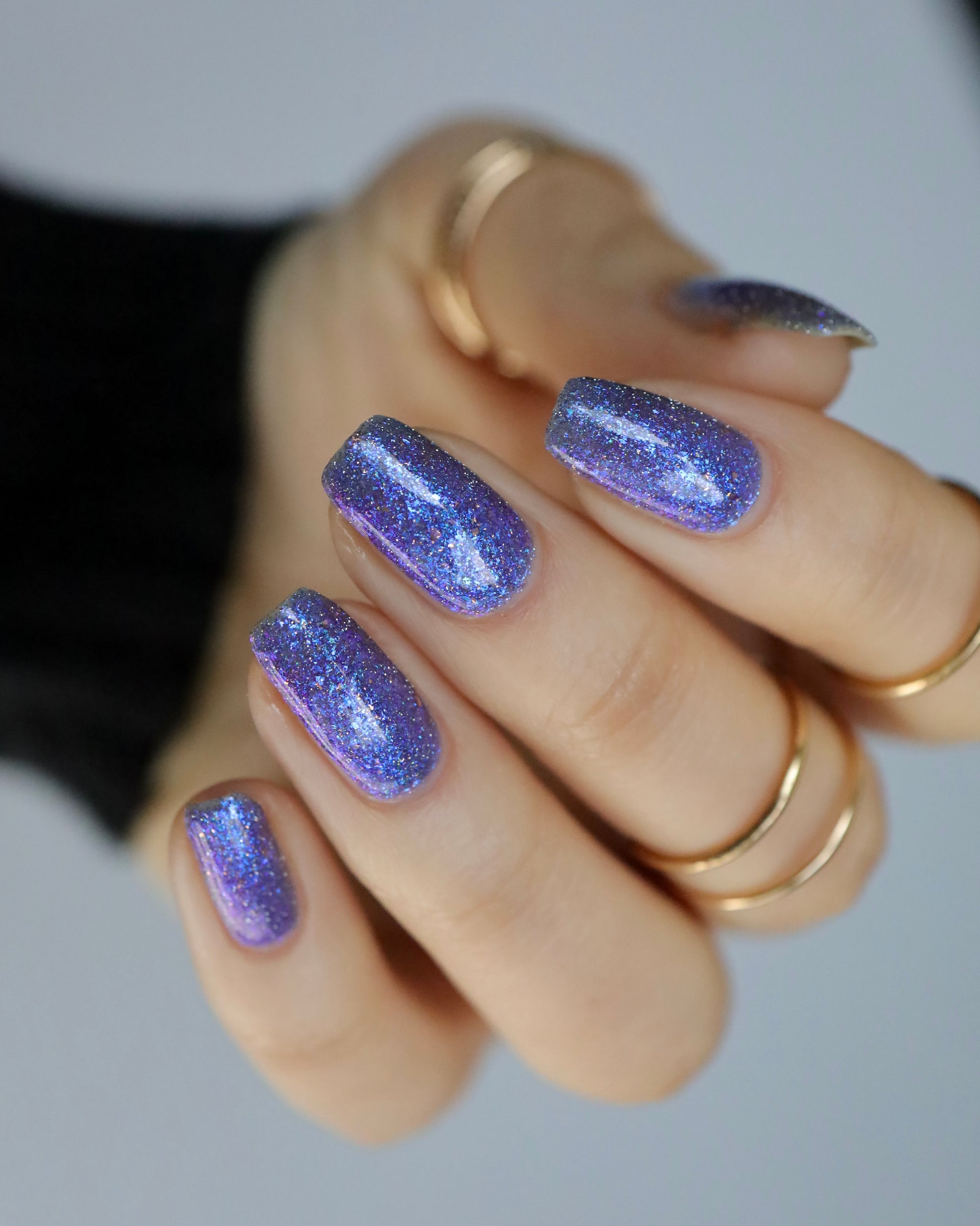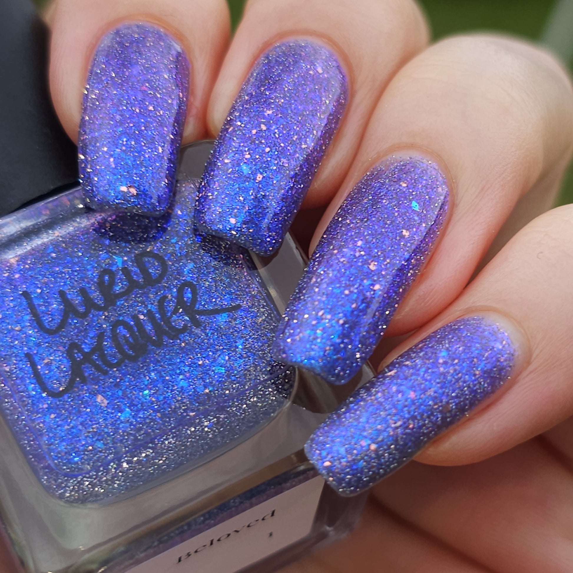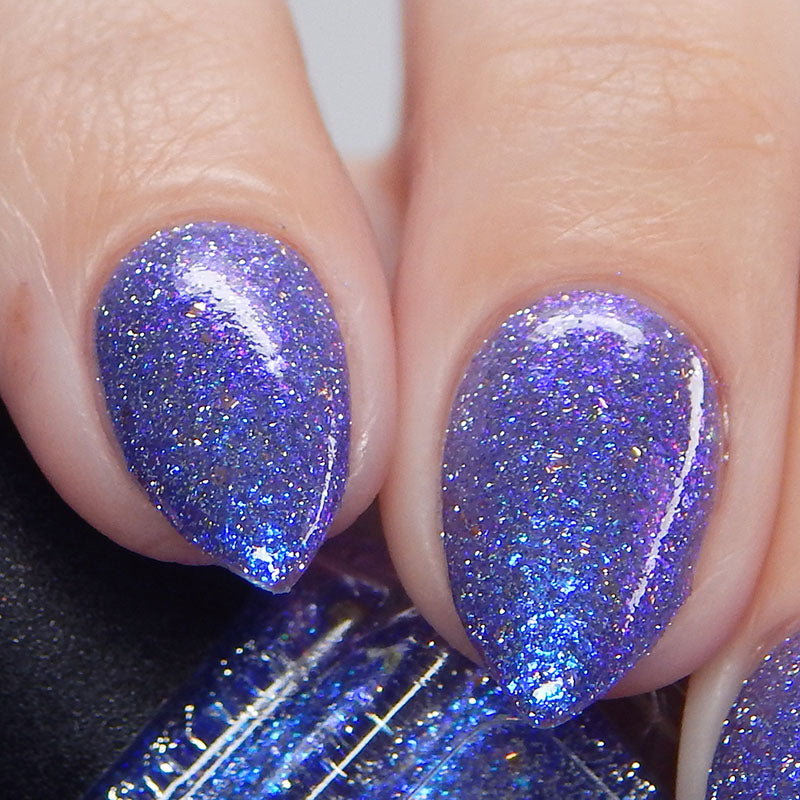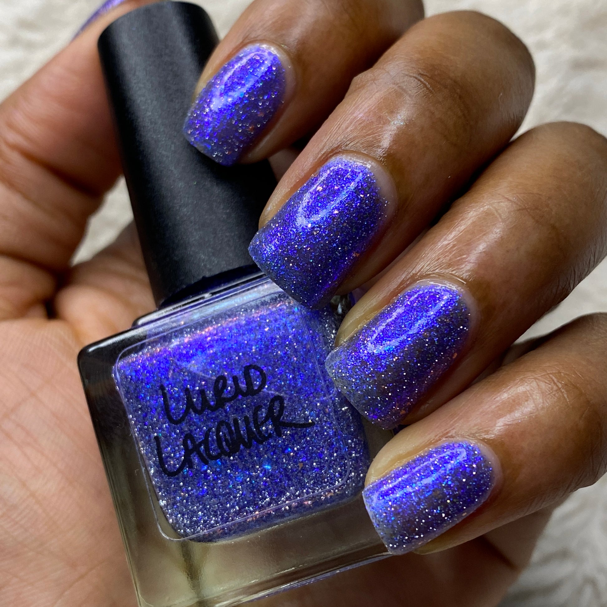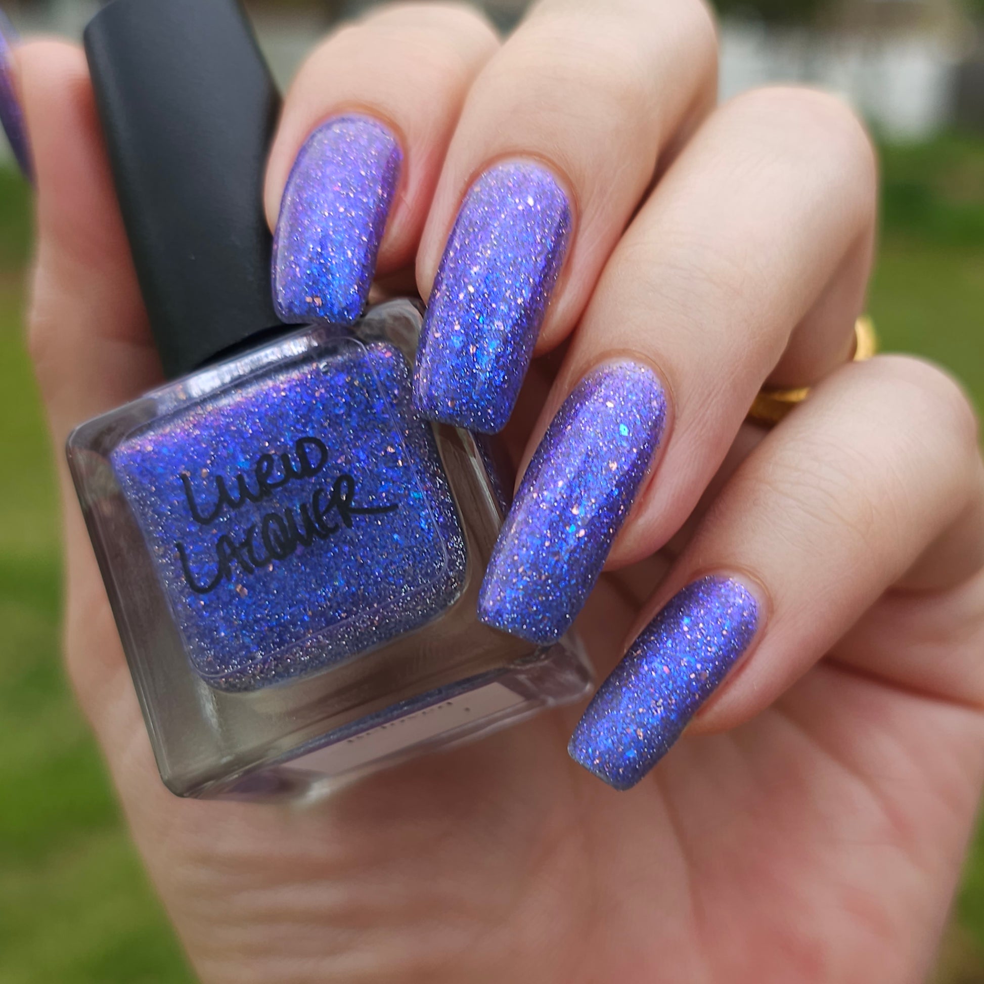 An indigo jelly base with iridescent flakes that shift from blue to purple, rose gold metallic flakies, silver light reflective glitter, and a sprinkle of aurora pigment that shifts from blue to purple to pink.