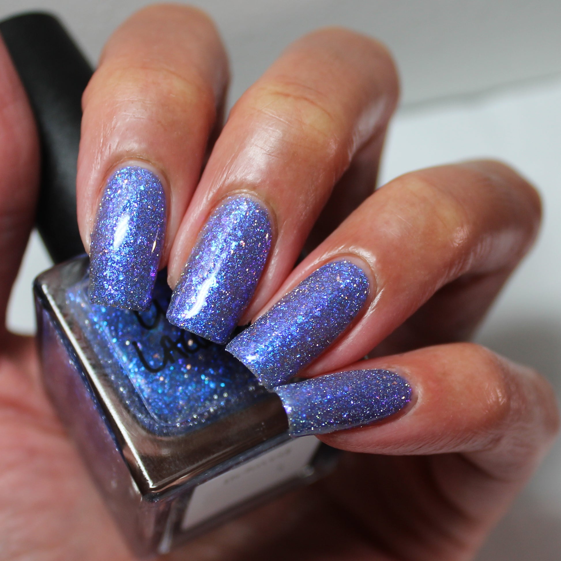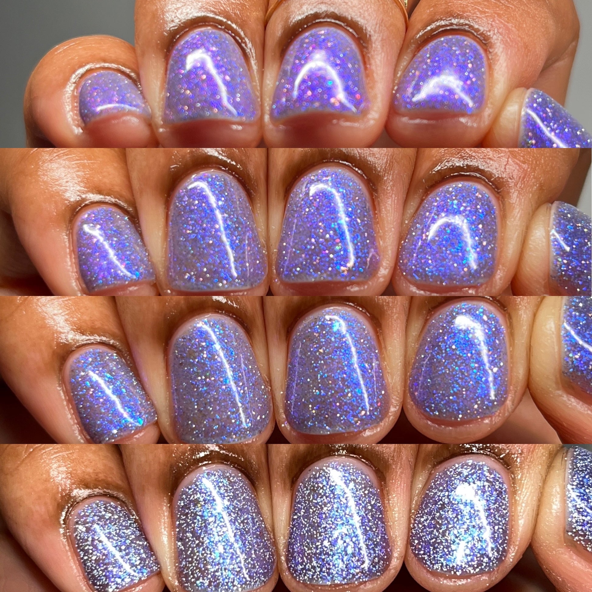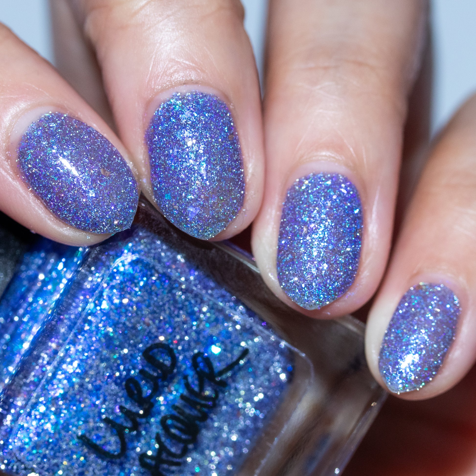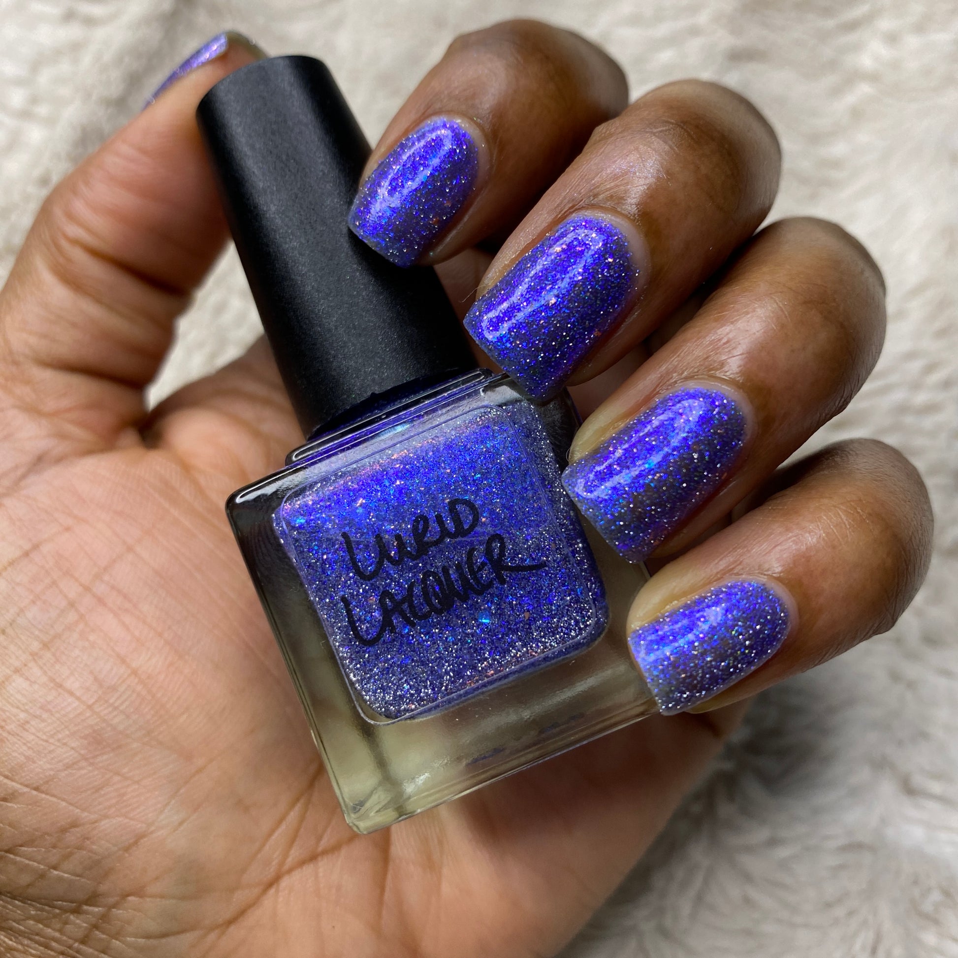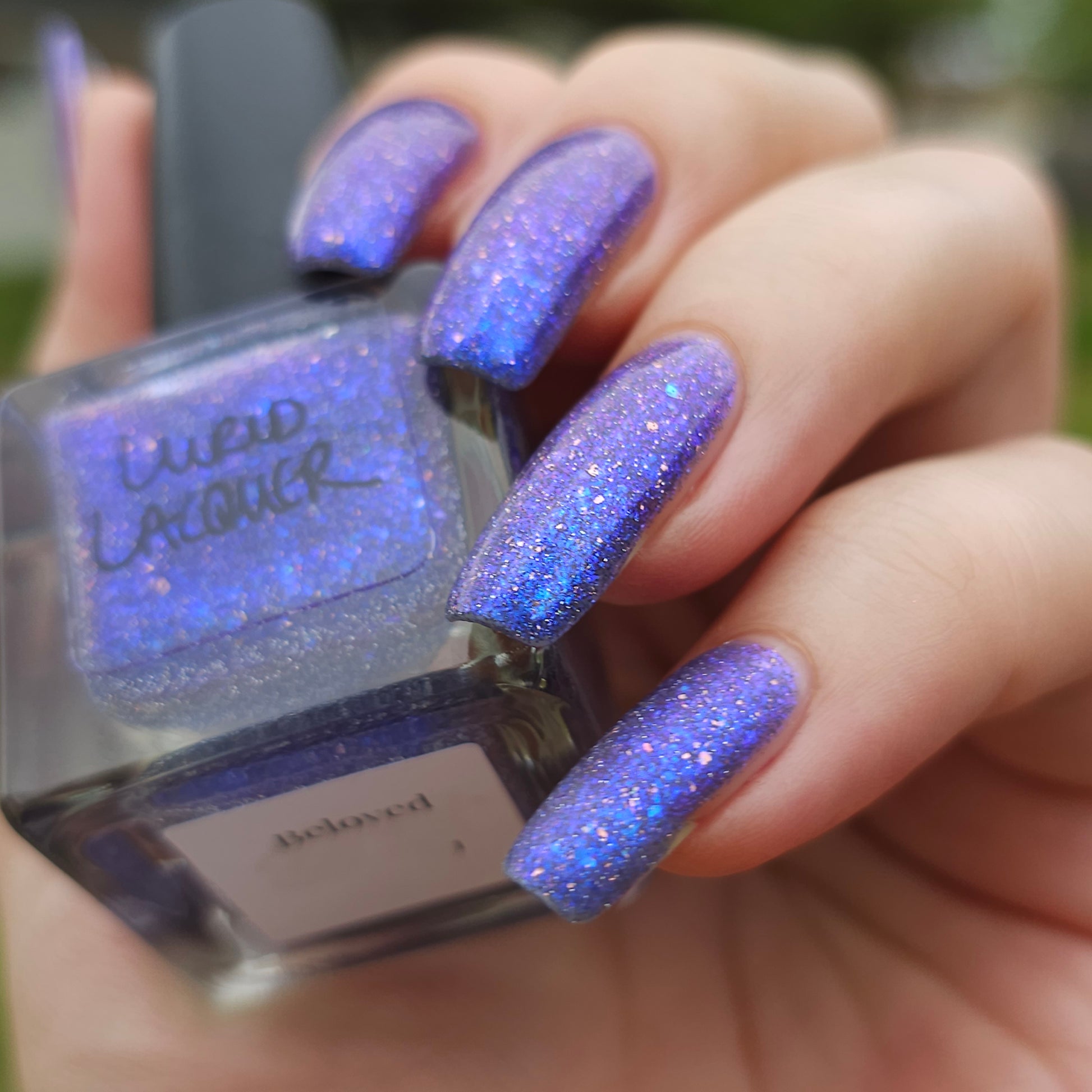 An indigo jelly base with iridescent flakes that shift from blue to purple, rose gold metallic flakies, silver light reflective glitter, and a sprinkle of aurora pigment that shifts from blue to purple to pink.