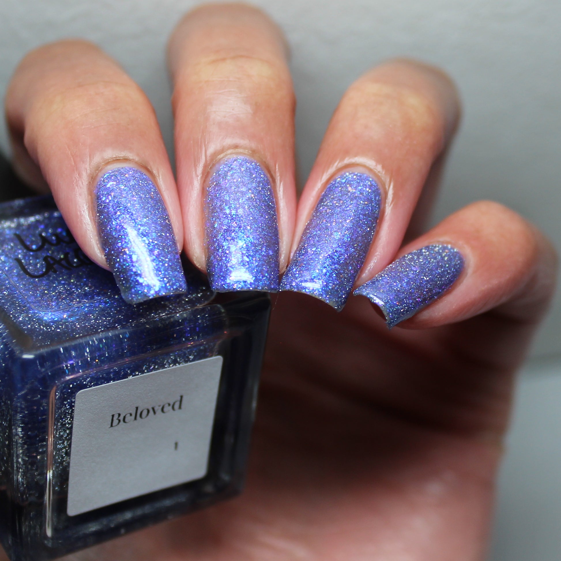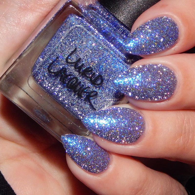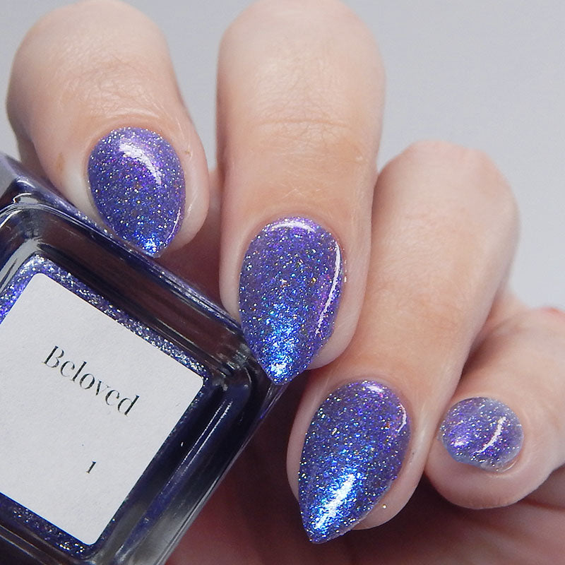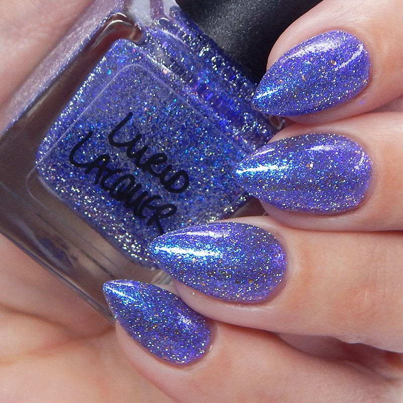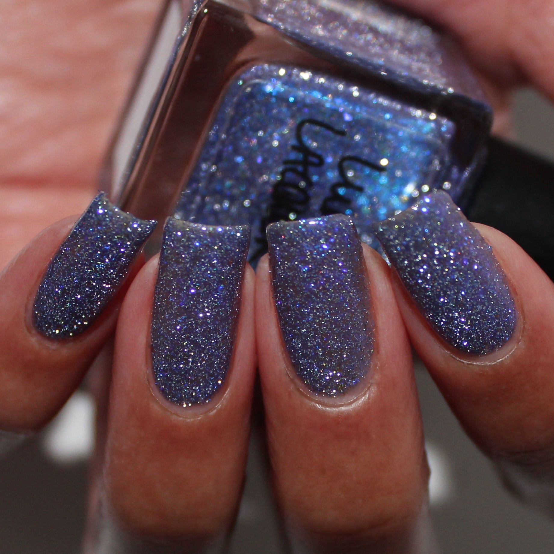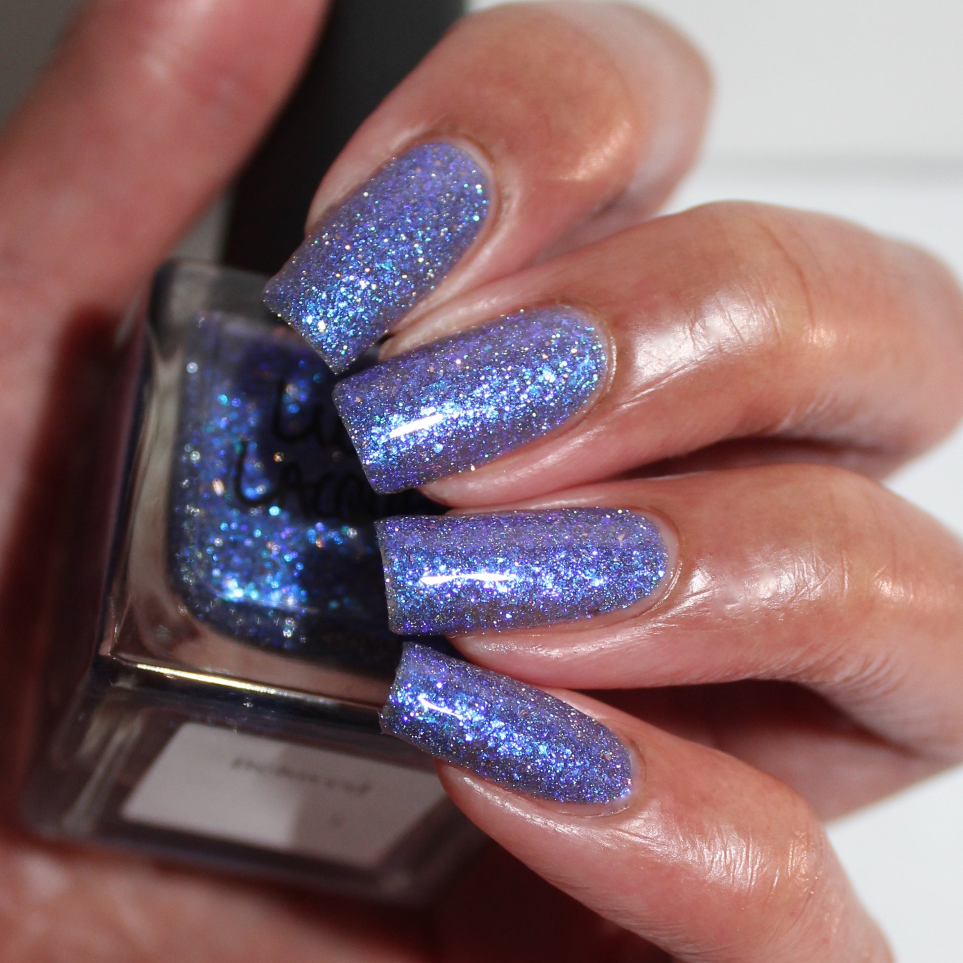 An indigo jelly base with iridescent flakes that shift from blue to purple, rose gold metallic flakies, silver light reflective glitter, and a sprinkle of aurora pigment that shifts from blue to purple to pink.