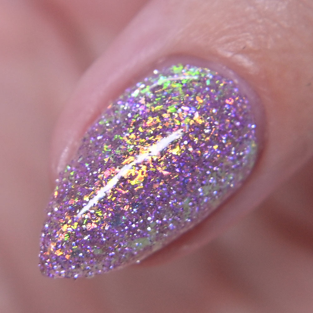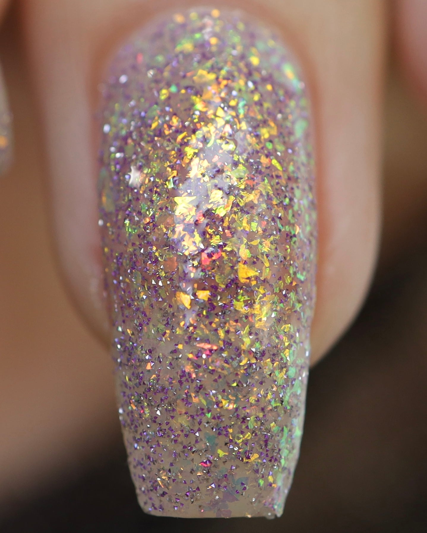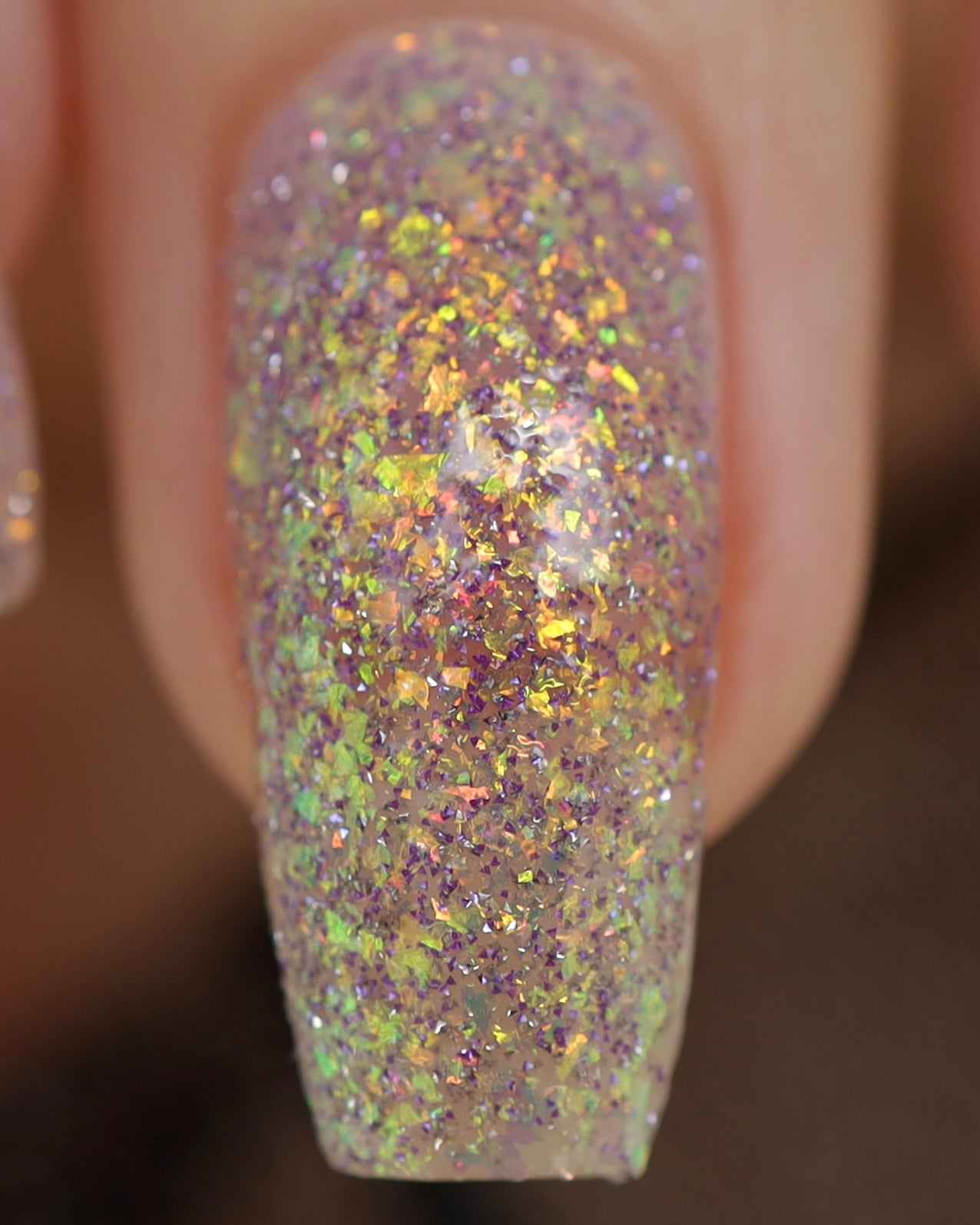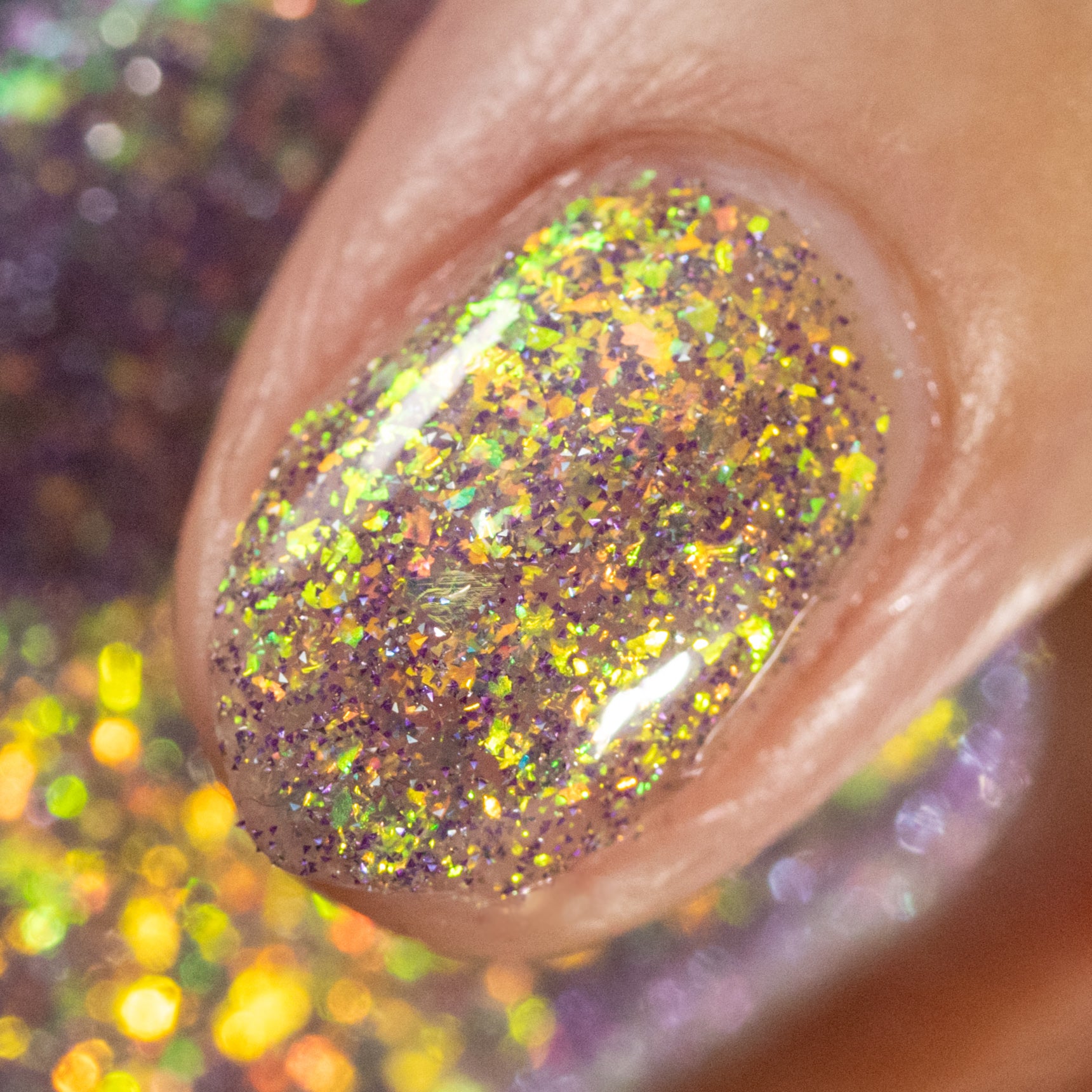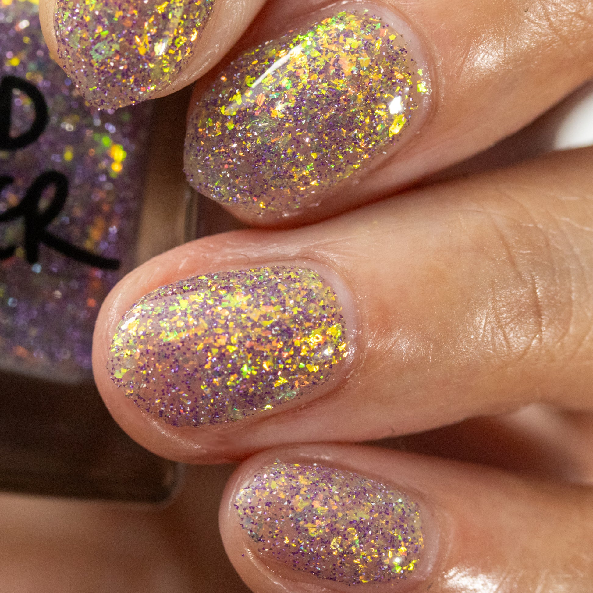 A clear base packed with purple light reflective glitter and iridescent flakies that shift from orange to gold to green