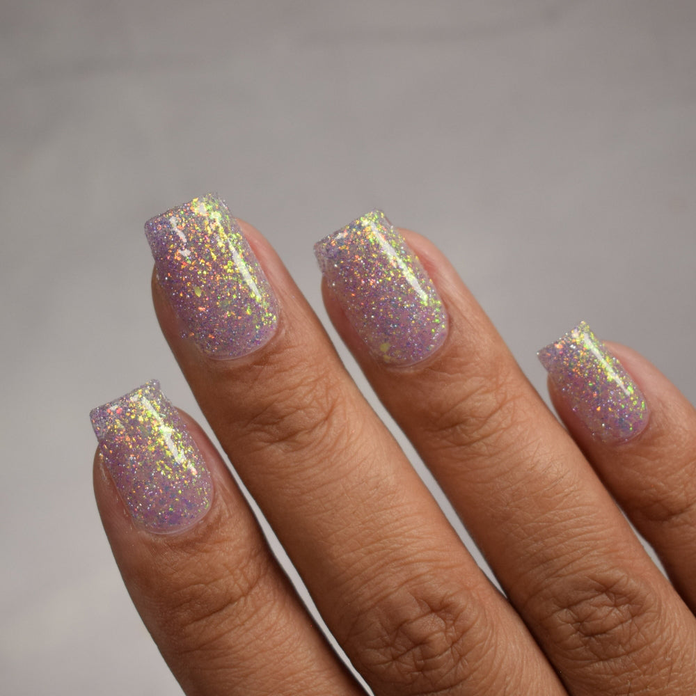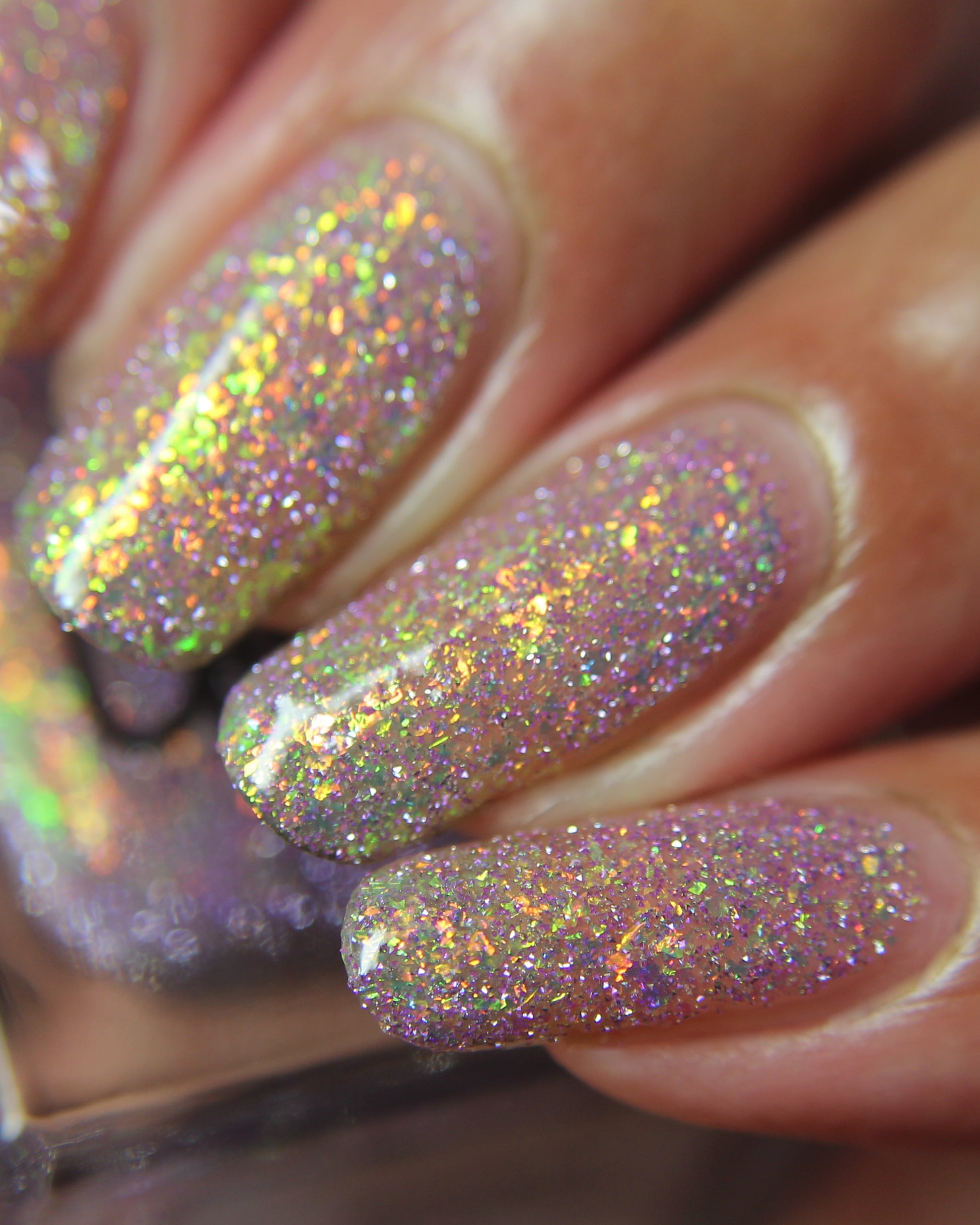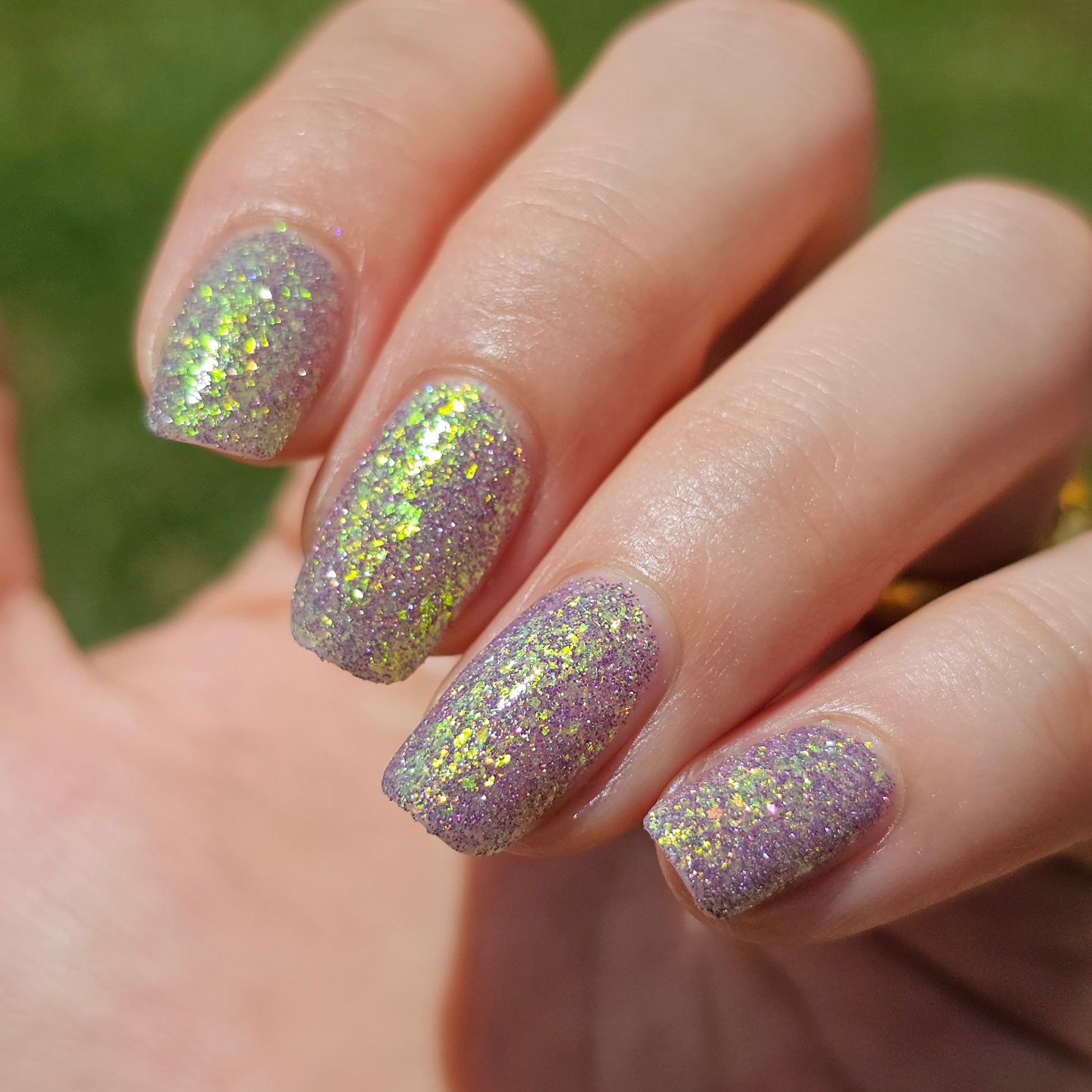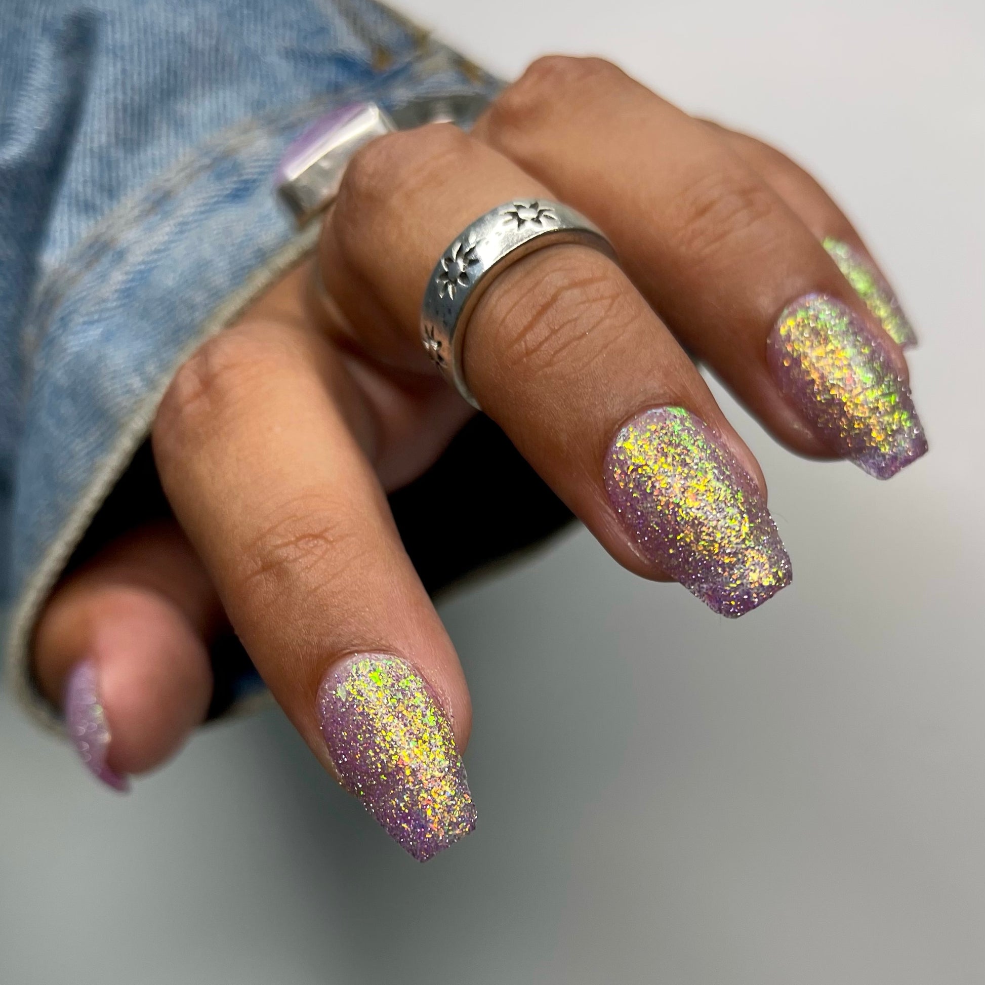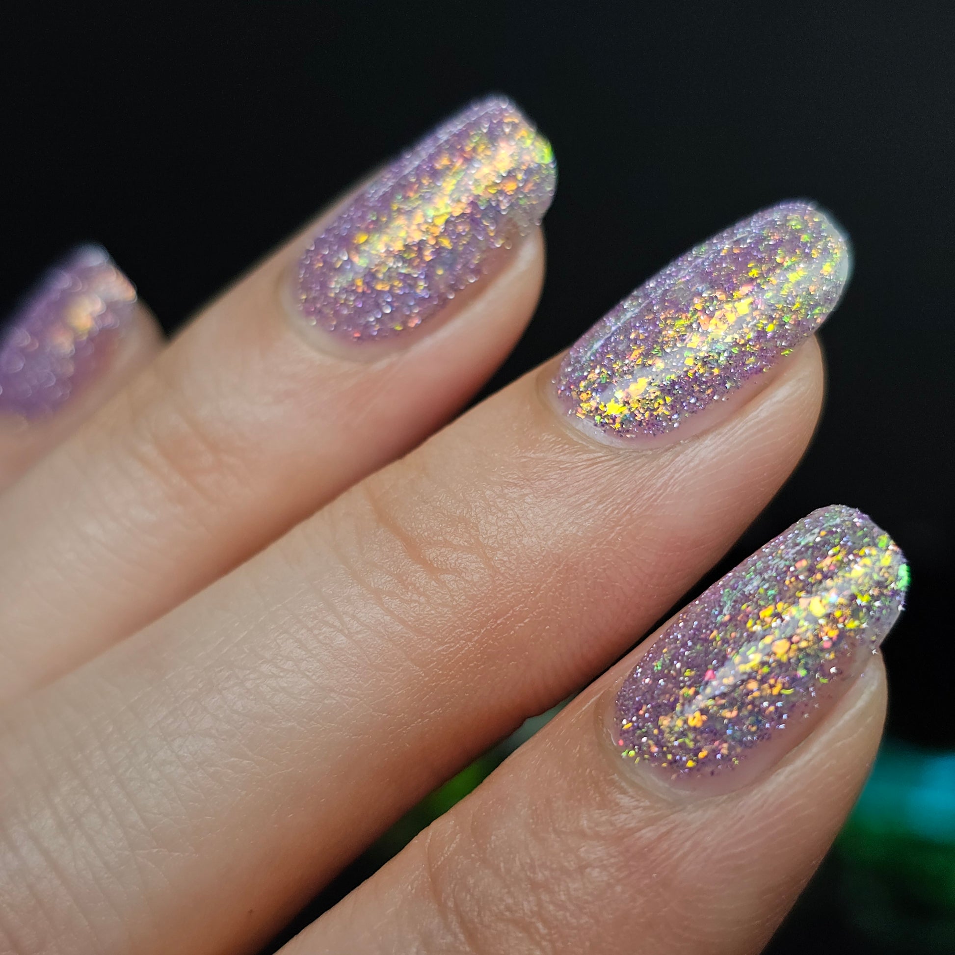 A clear base packed with purple light reflective glitter and iridescent flakies that shift from orange to gold to green