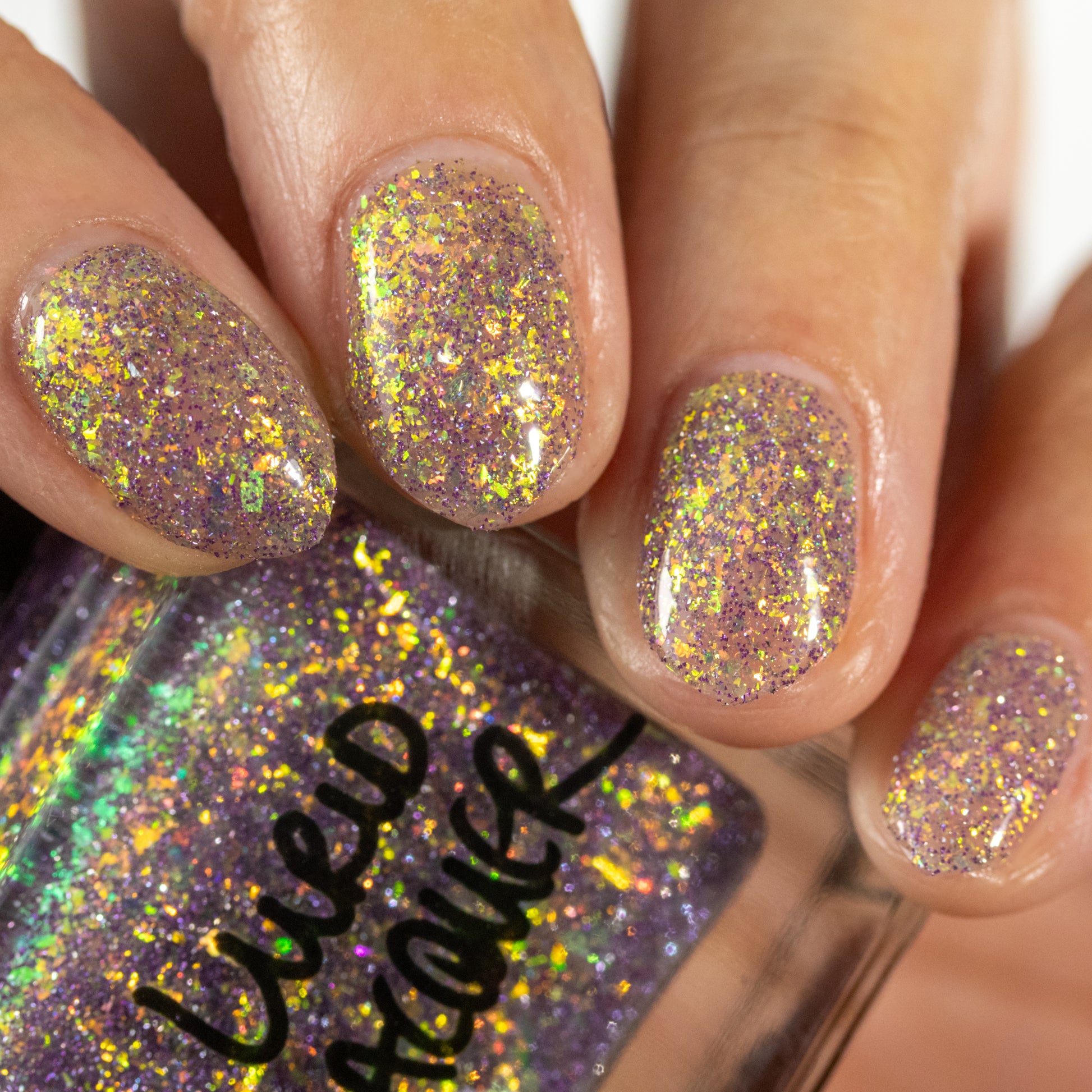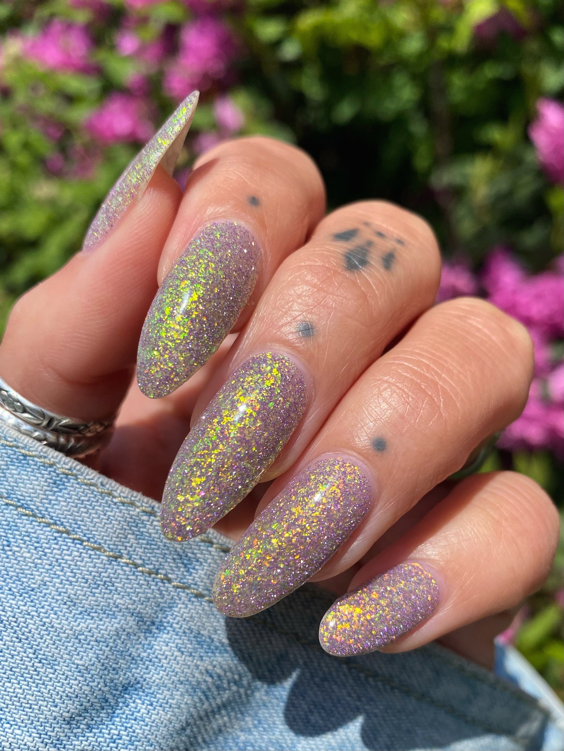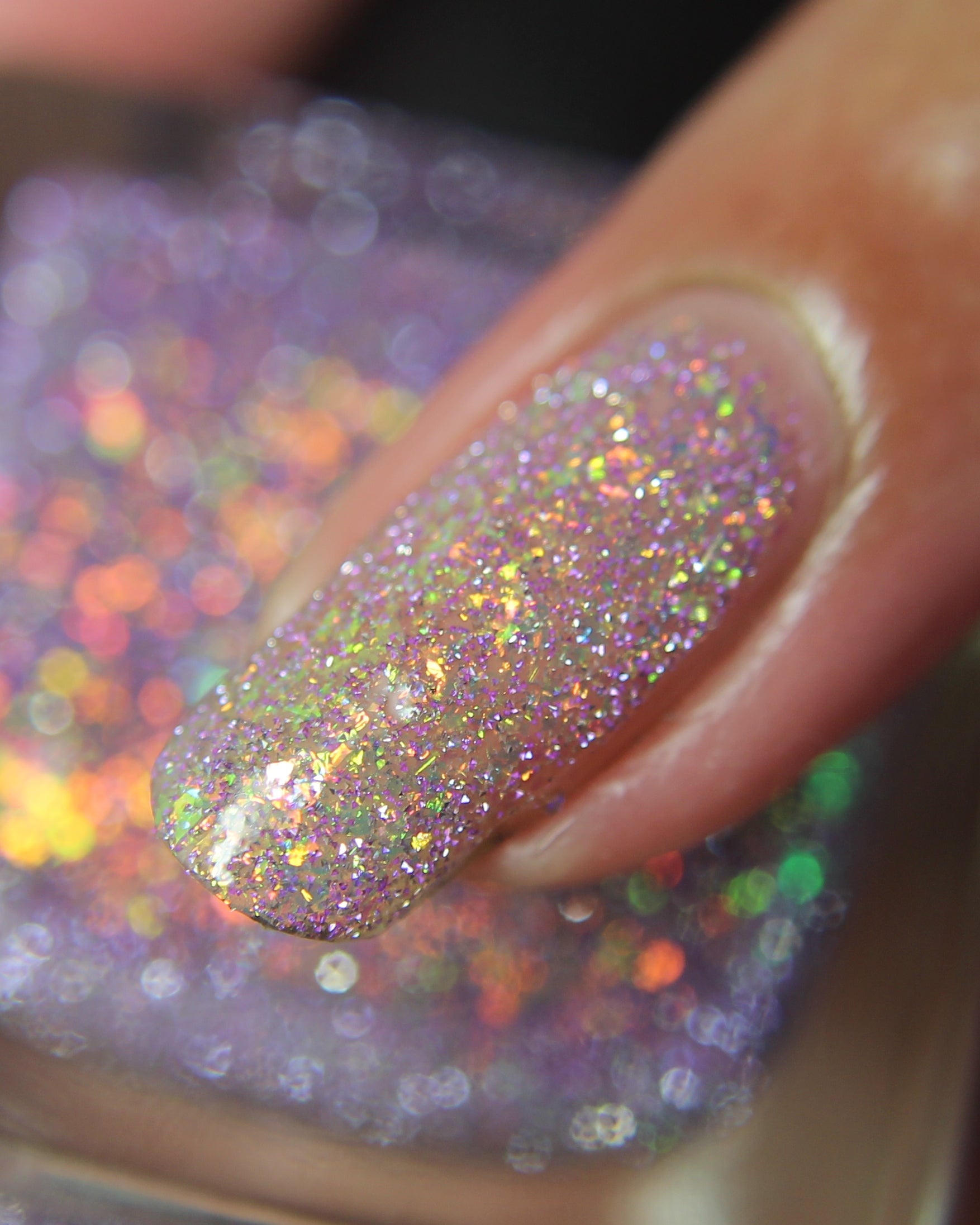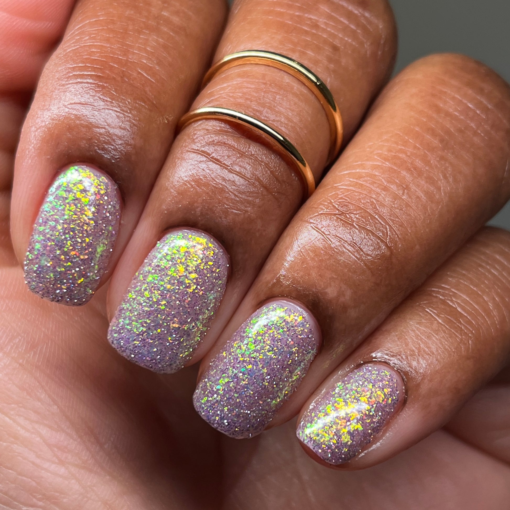 A clear base packed with purple light reflective glitter and iridescent flakies that shift from orange to gold to green