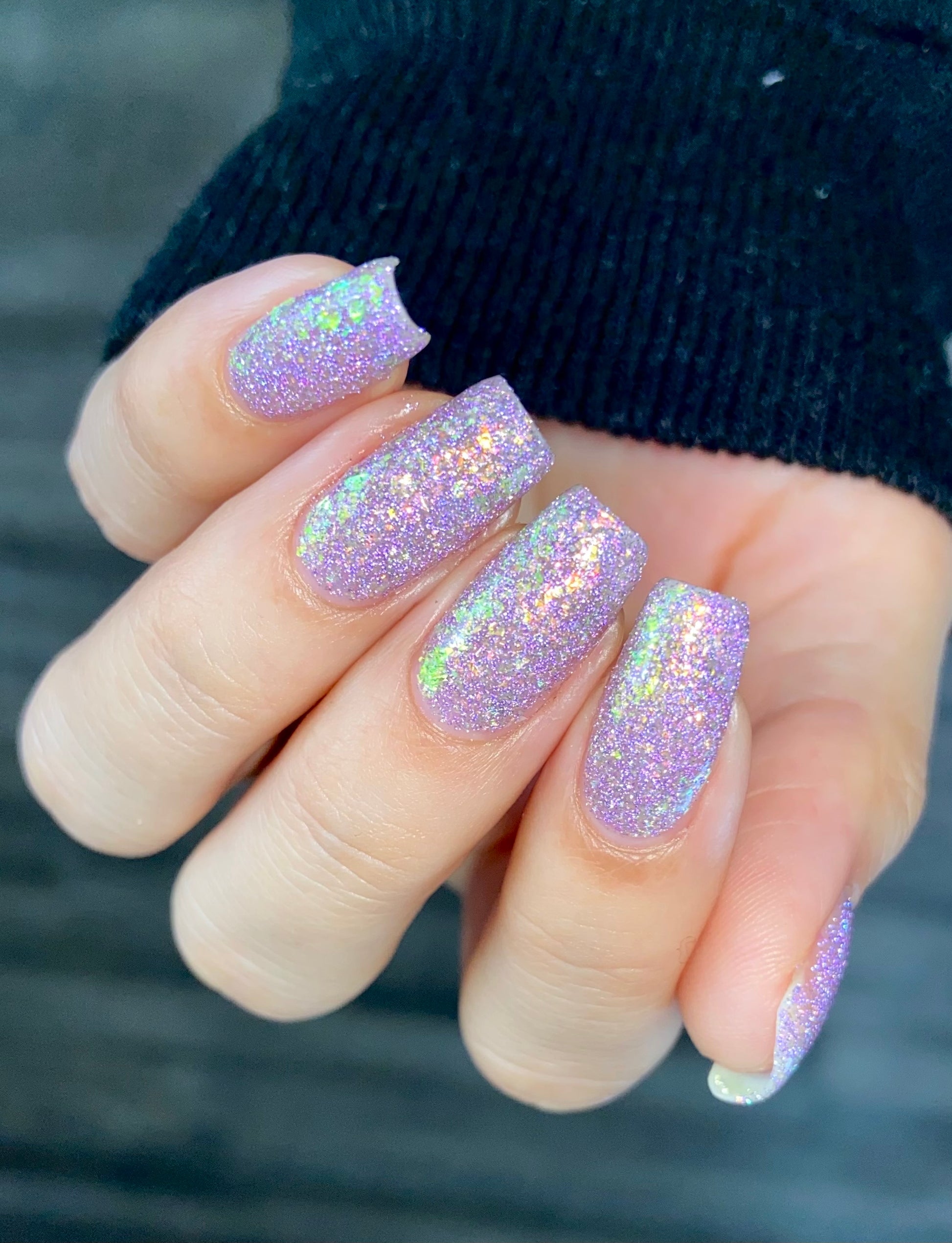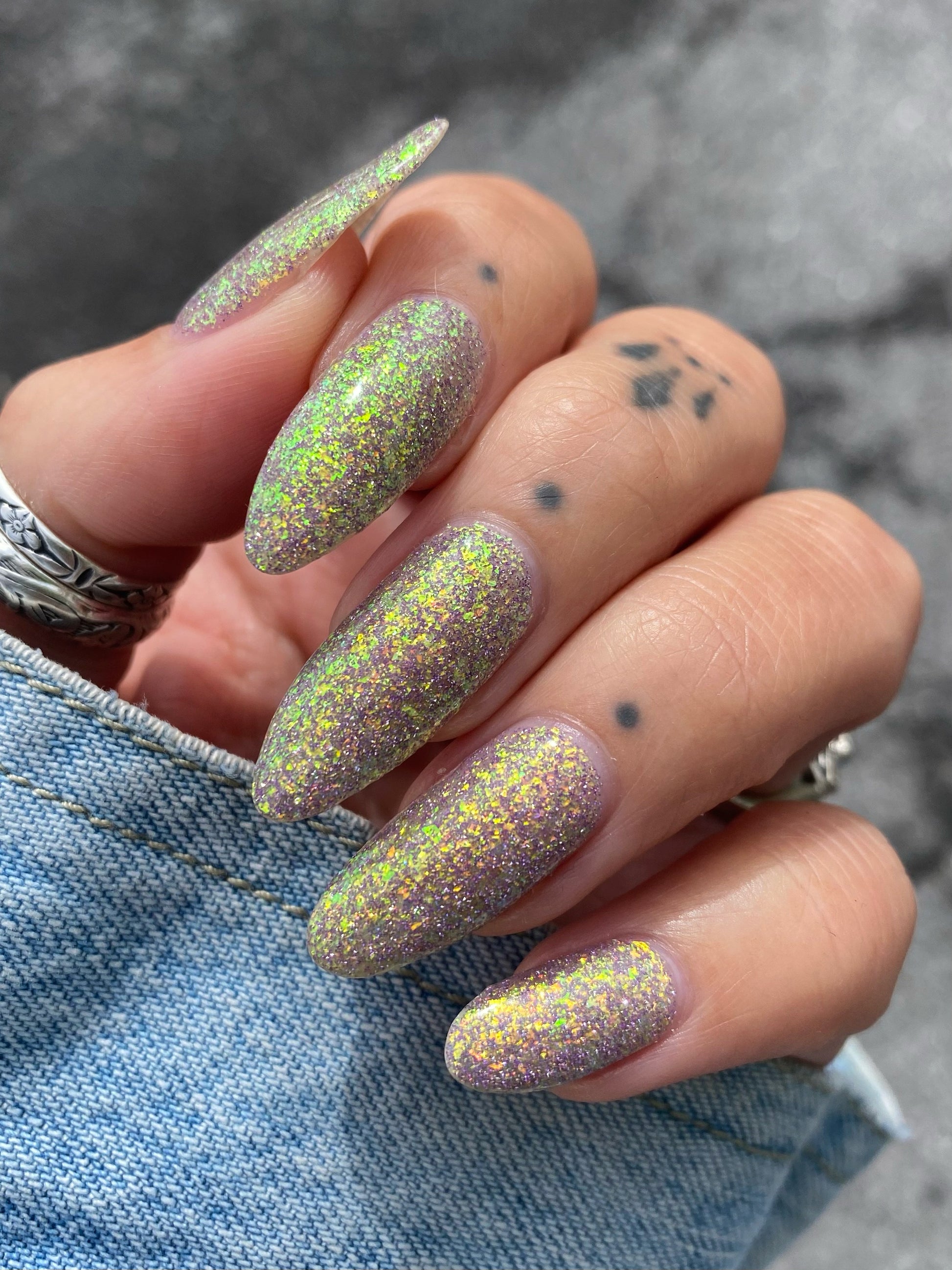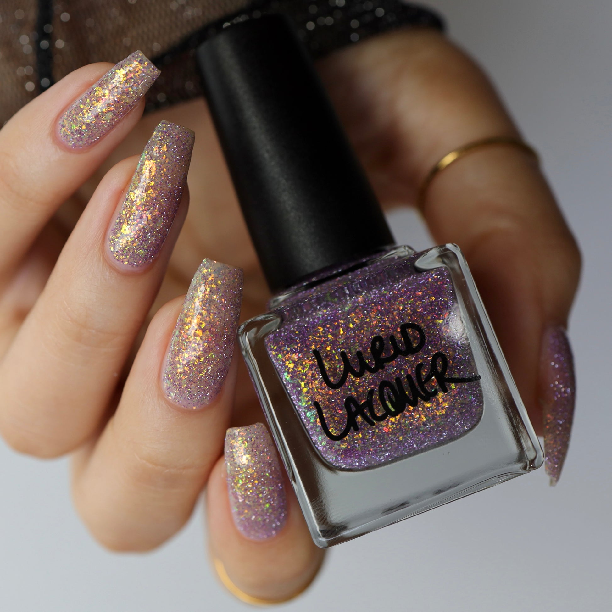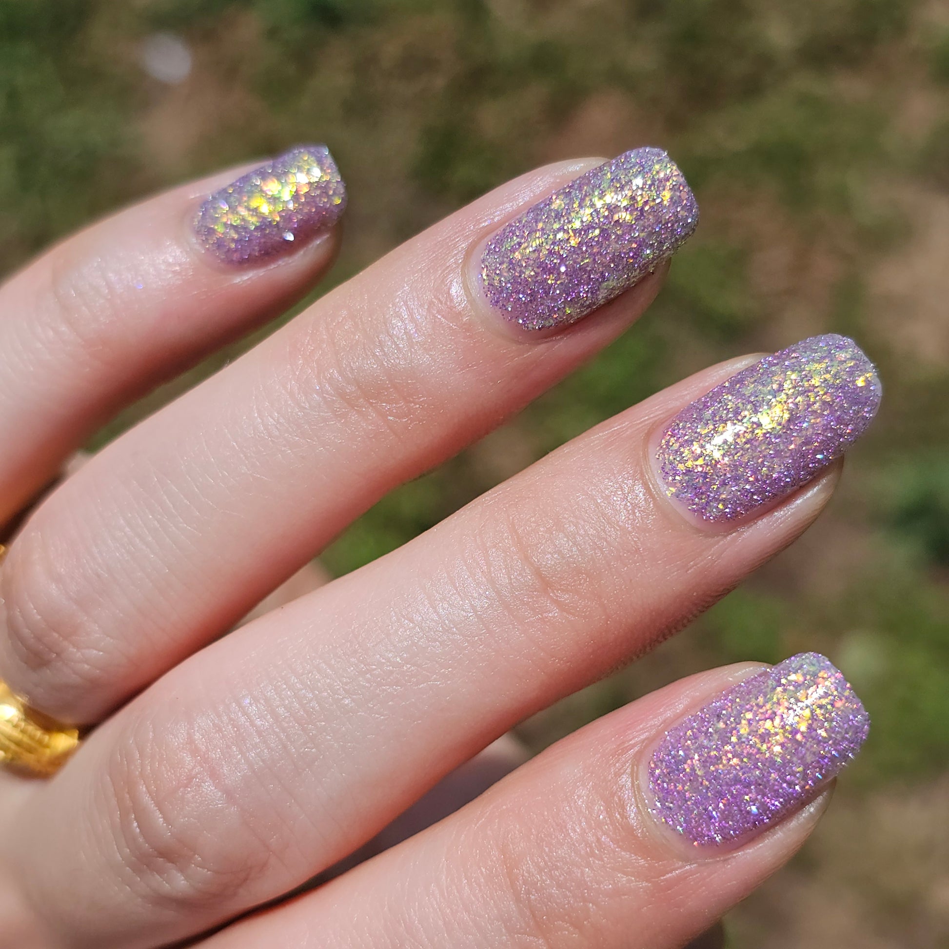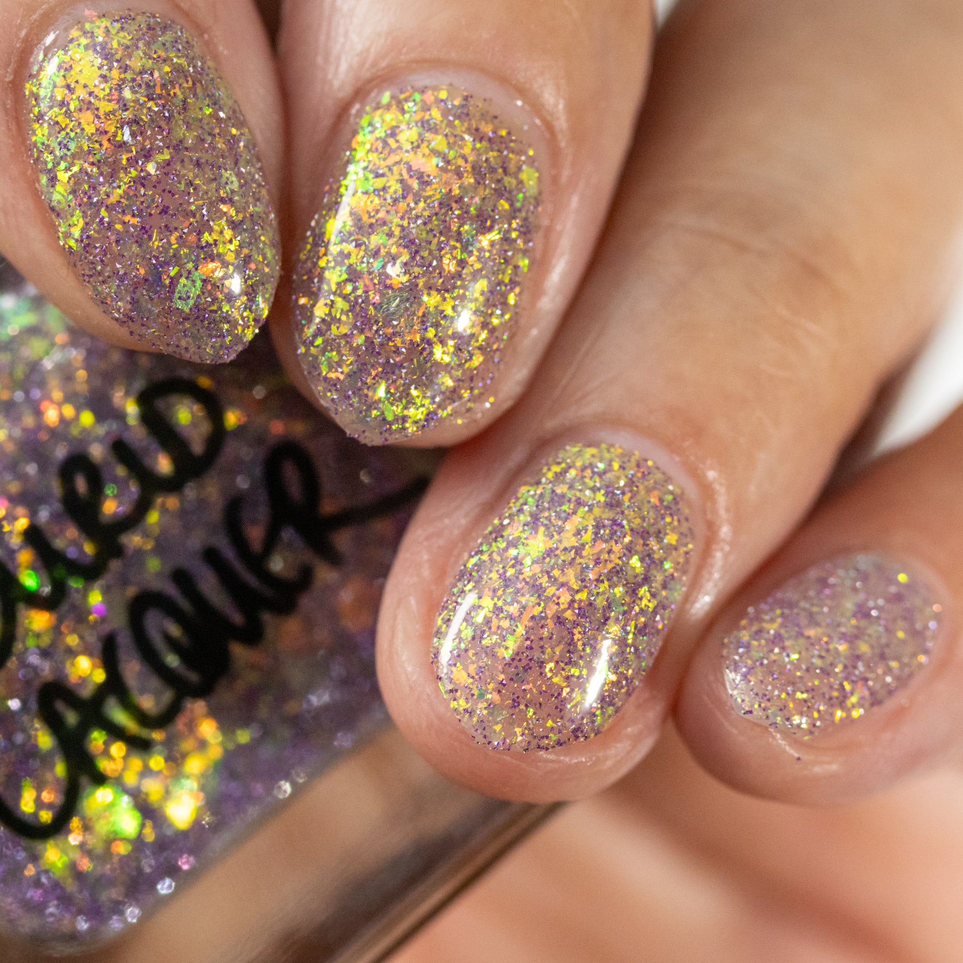 A clear base packed with purple light reflective glitter and iridescent flakies that shift from orange to gold to green
