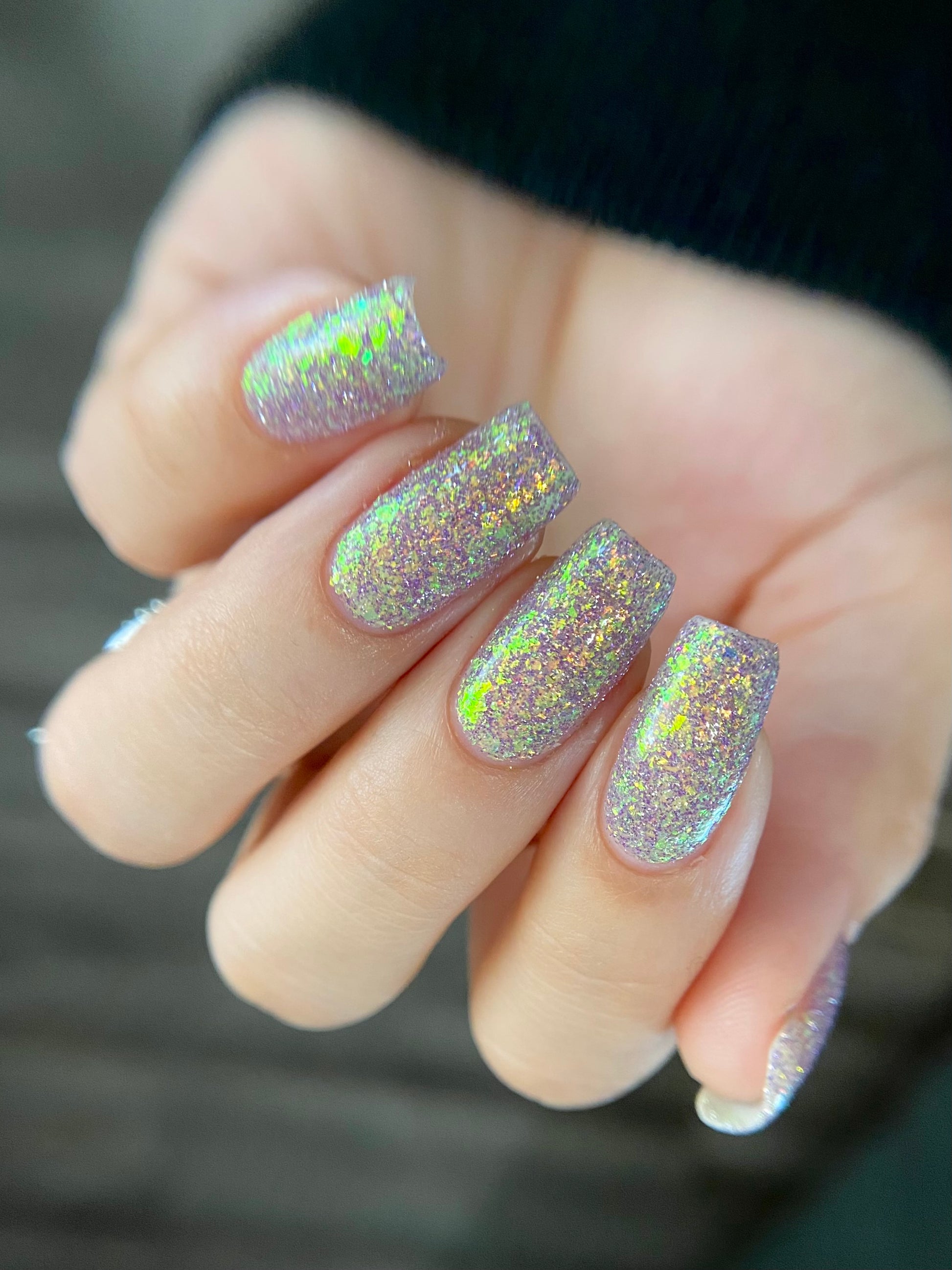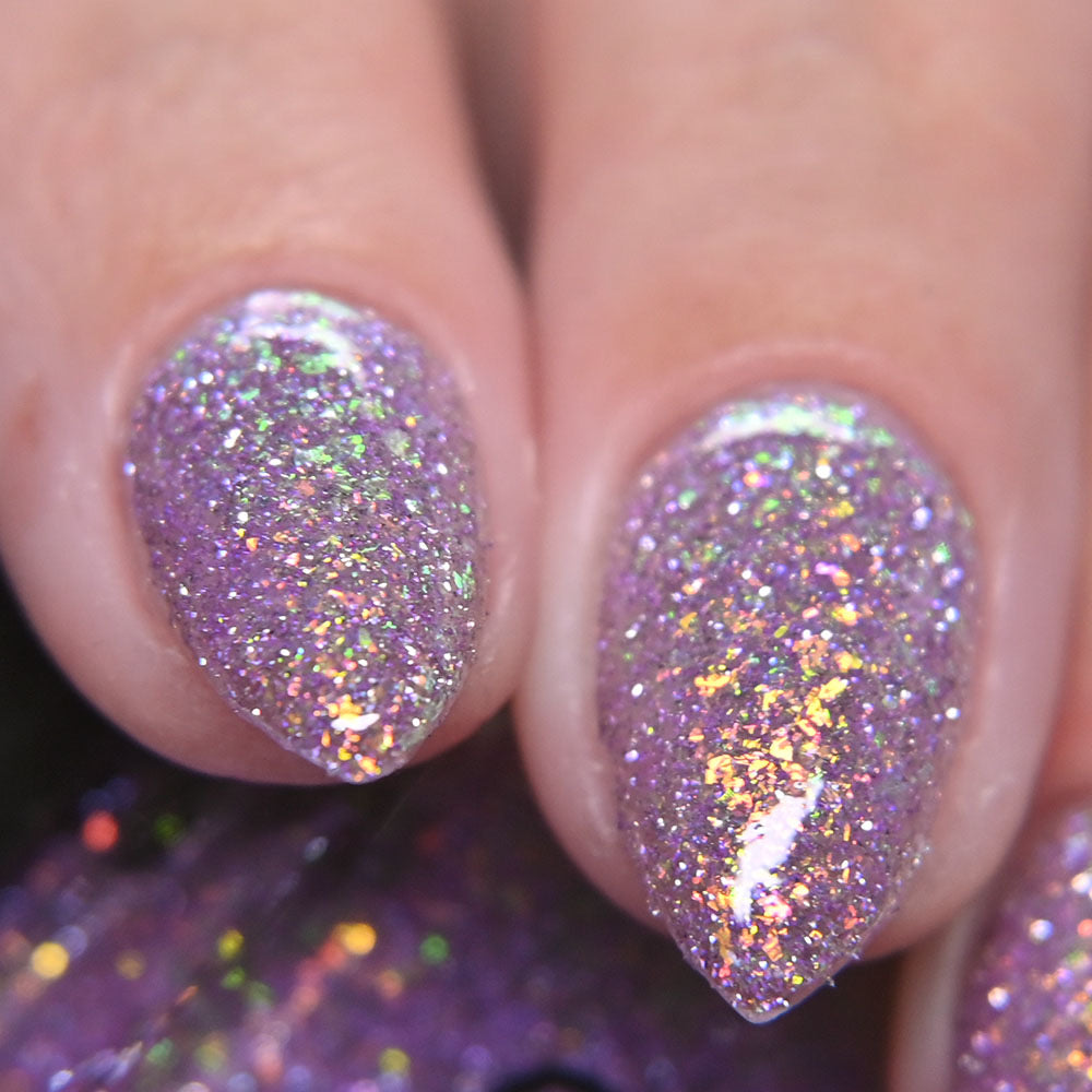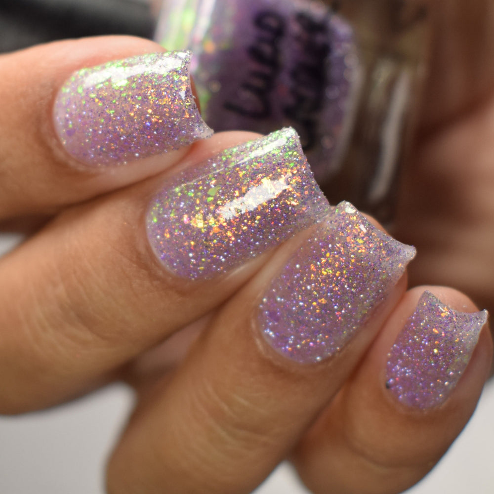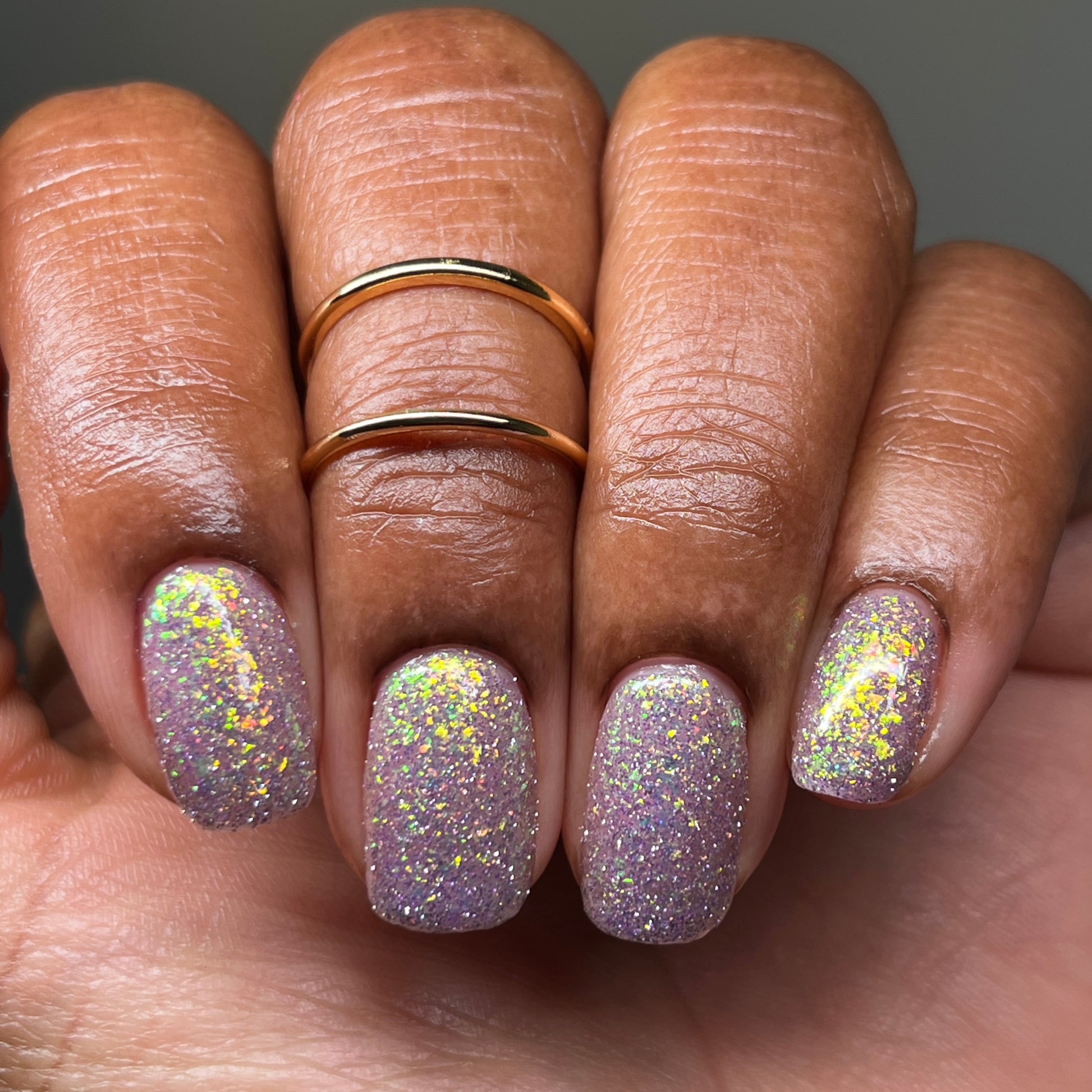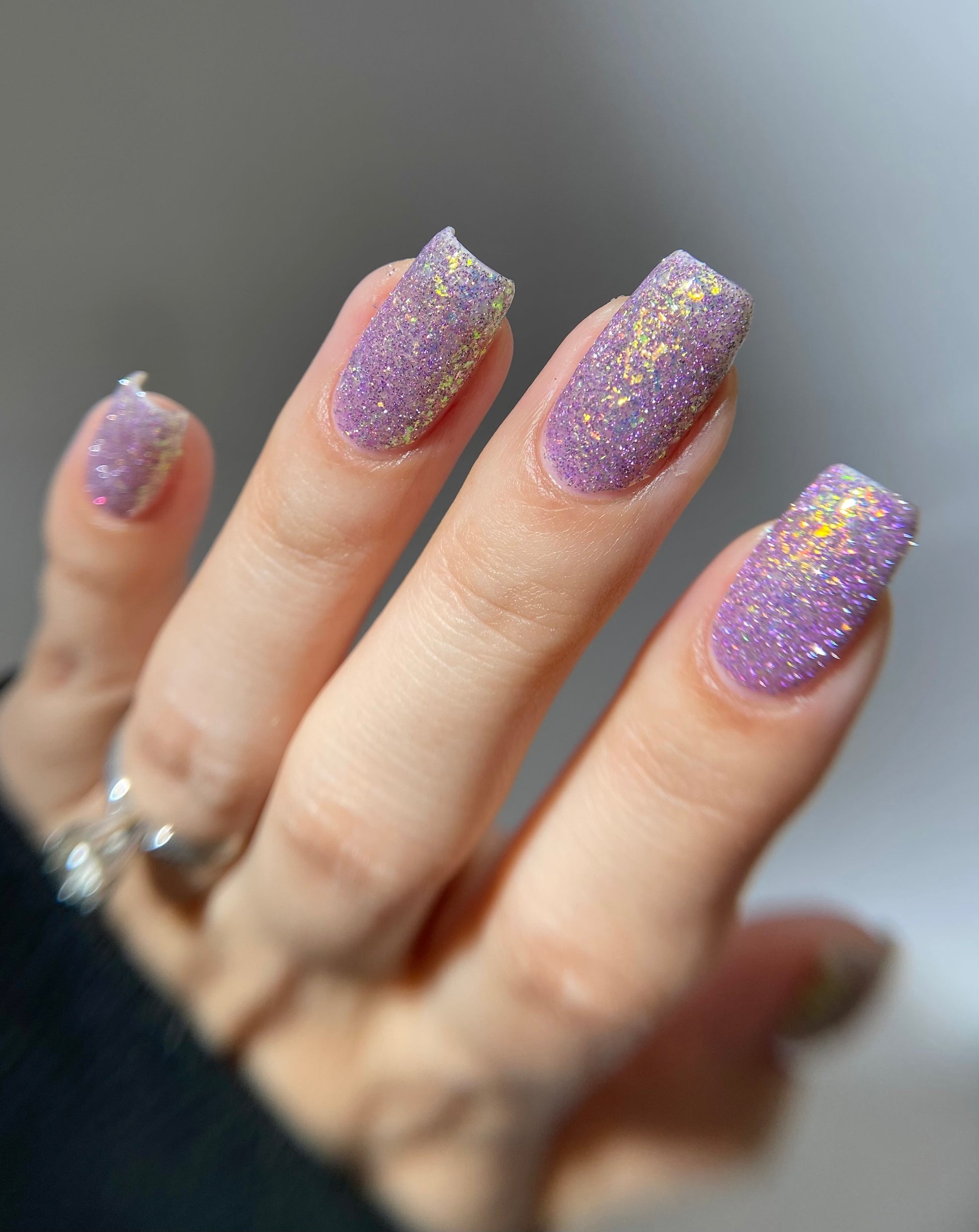 A clear base packed with purple light reflective glitter and iridescent flakies that shift from orange to gold to green