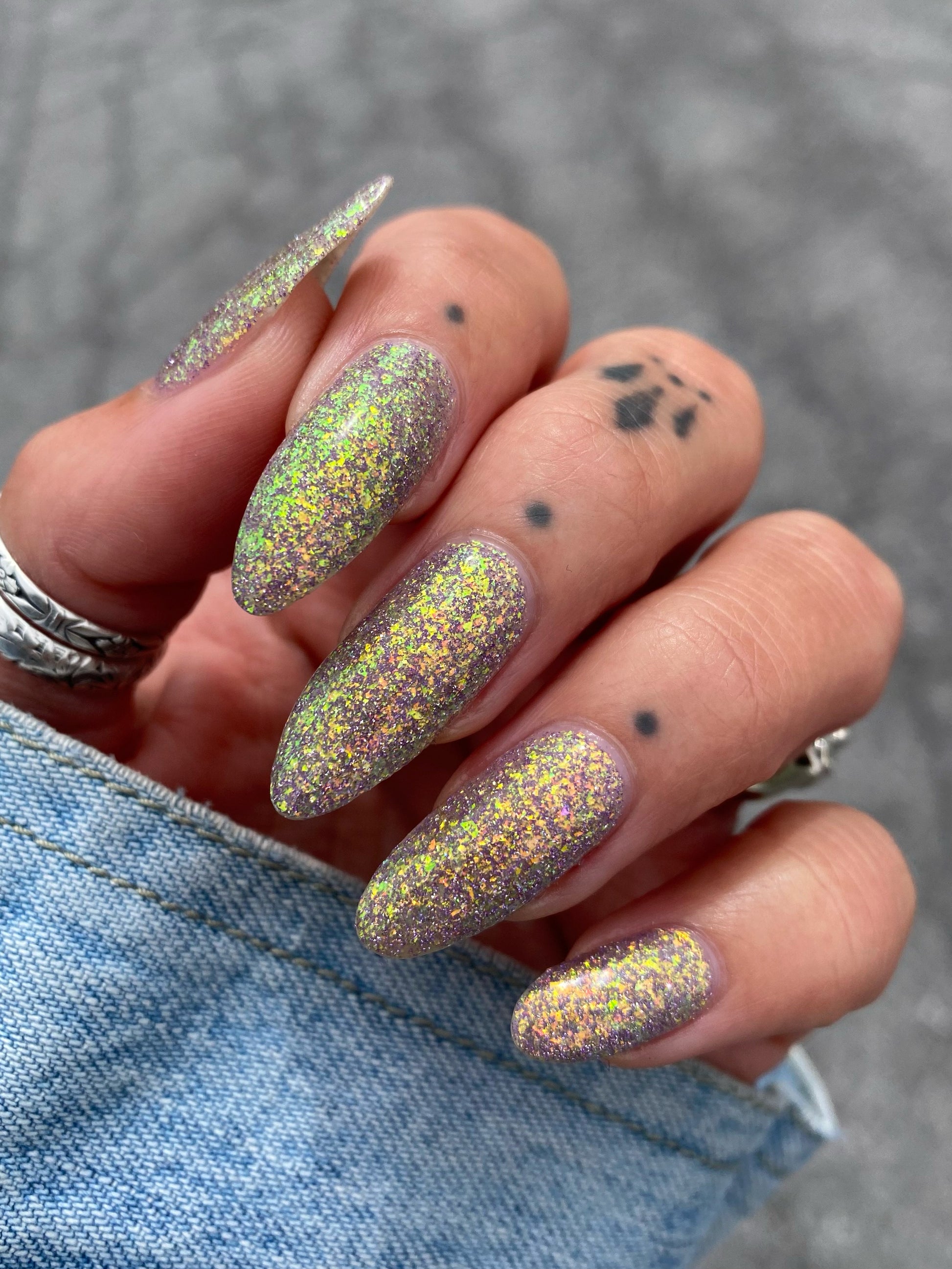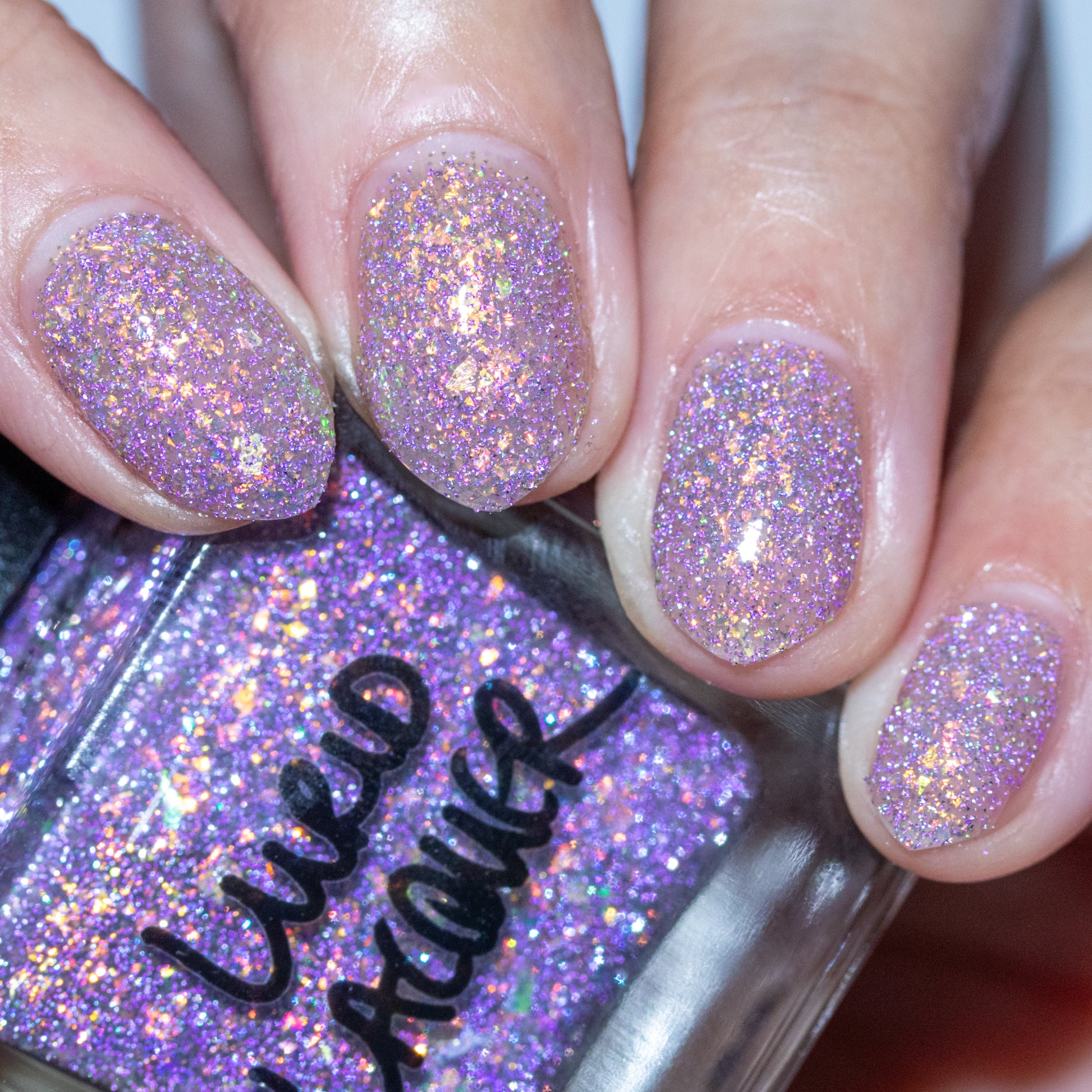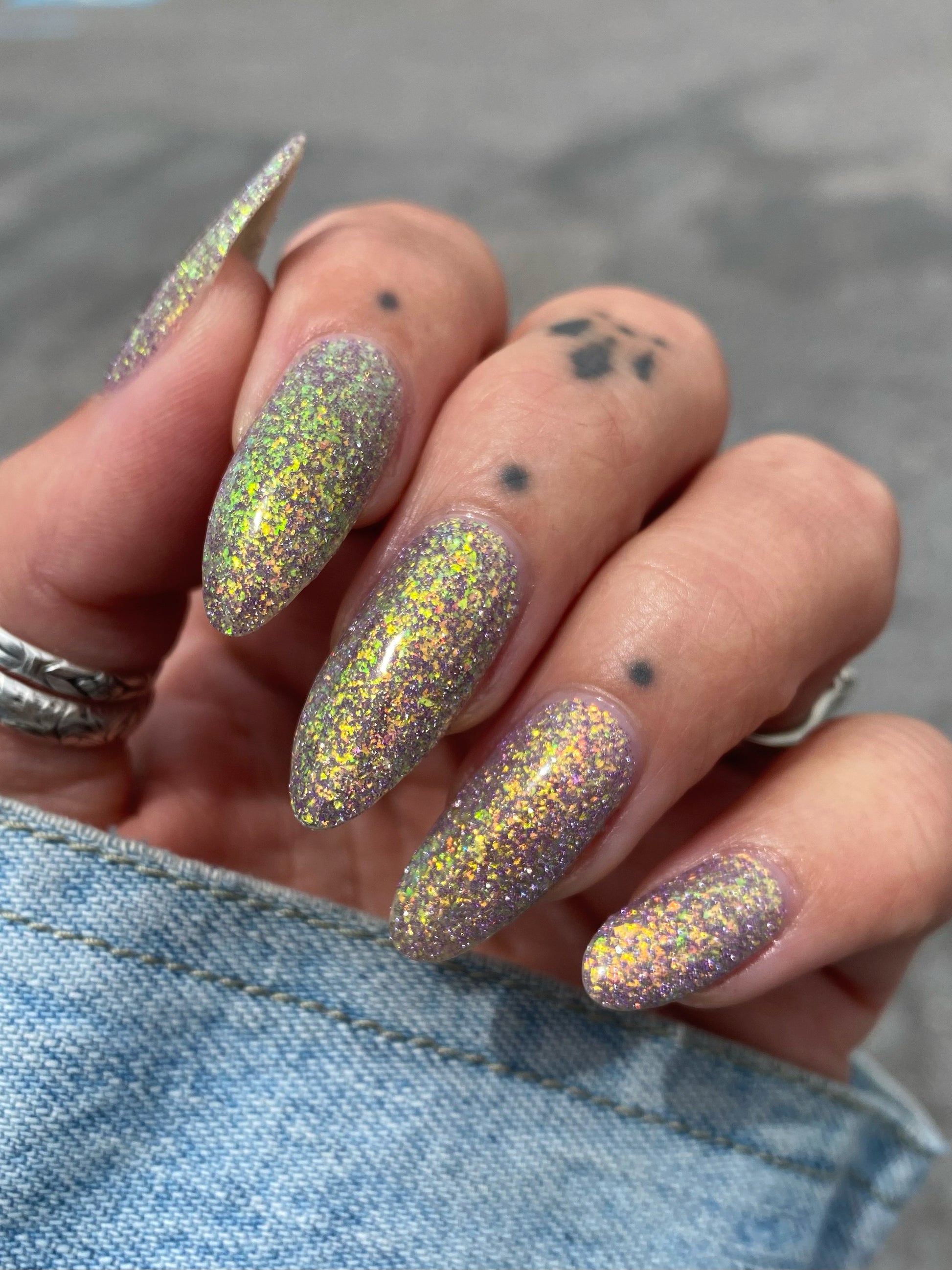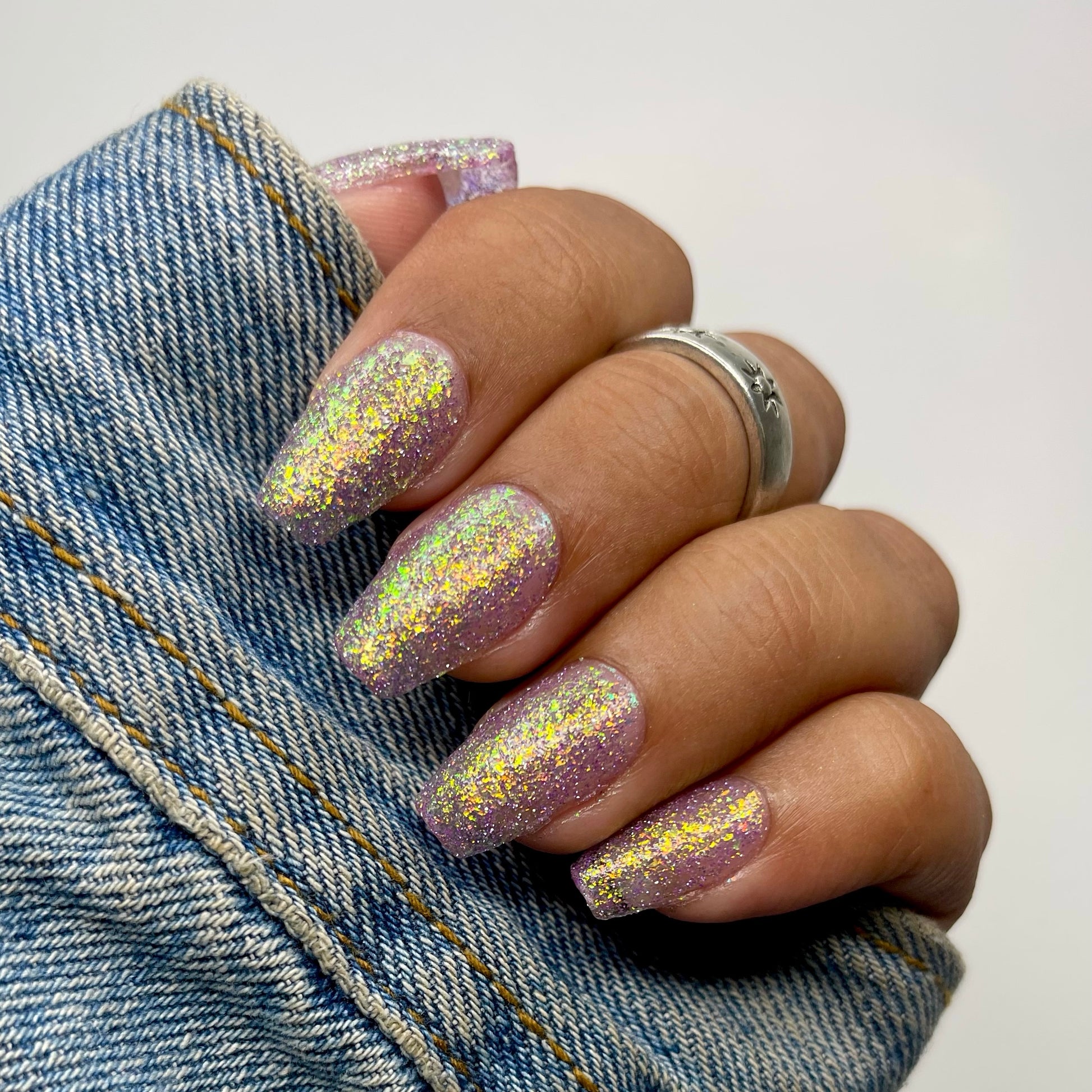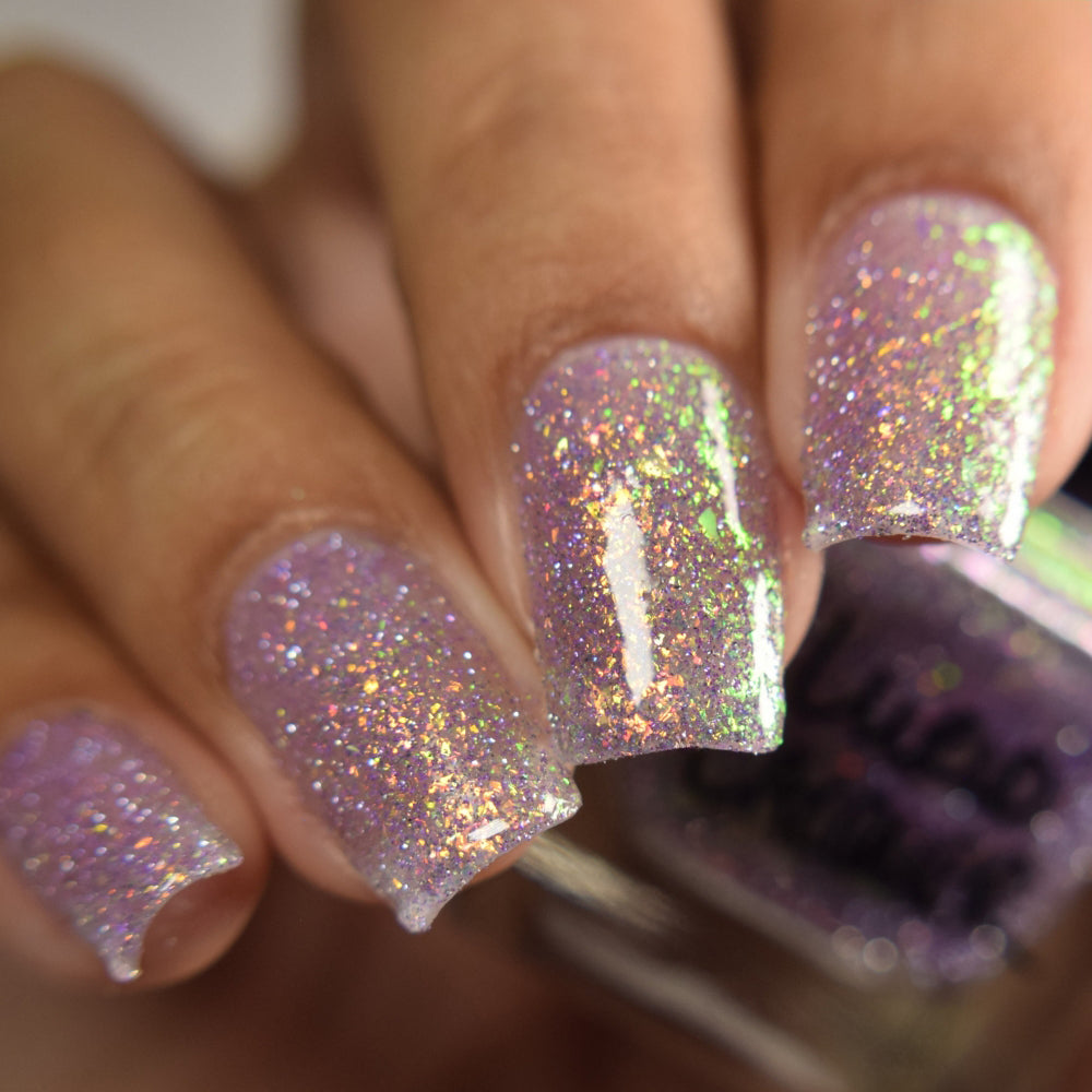 A clear base packed with purple light reflective glitter and iridescent flakies that shift from orange to gold to green
