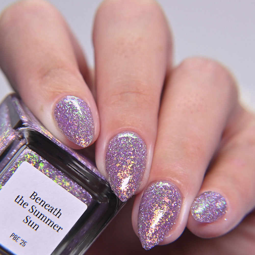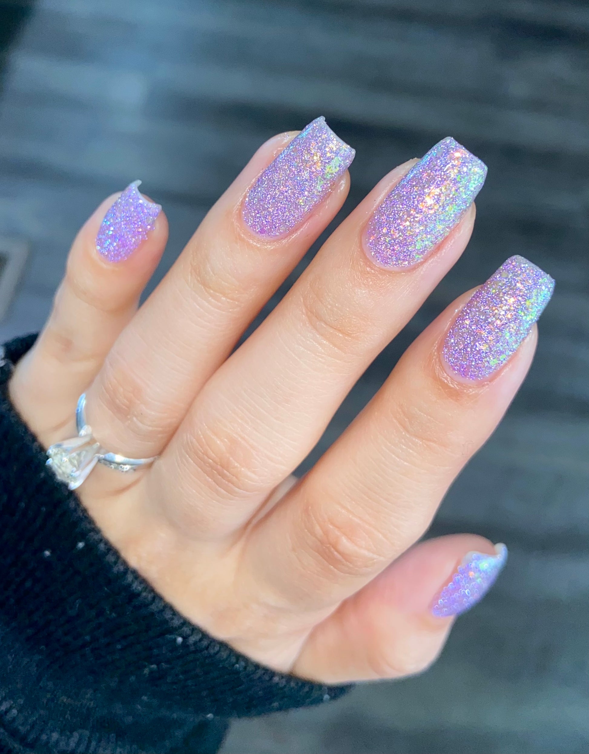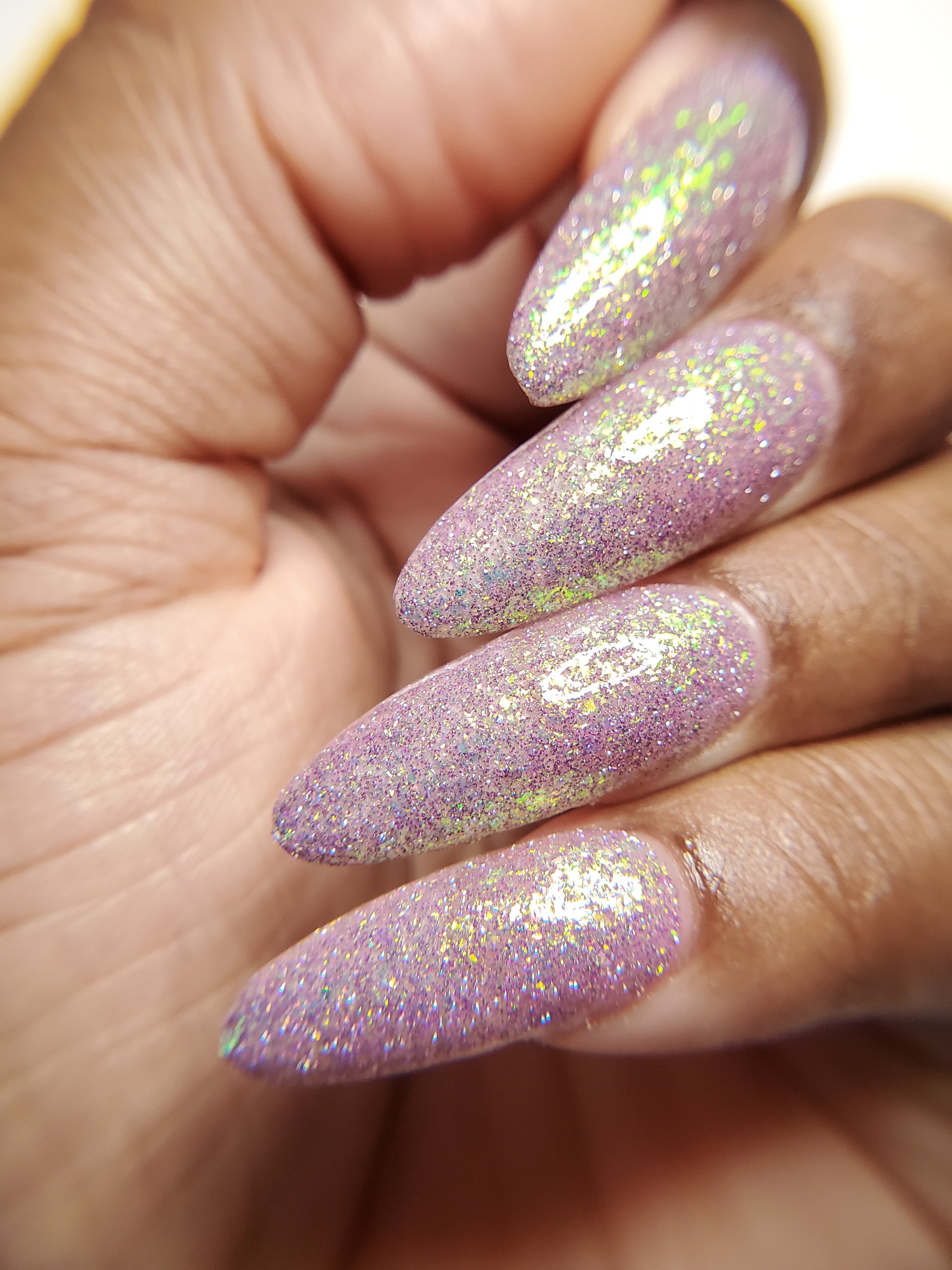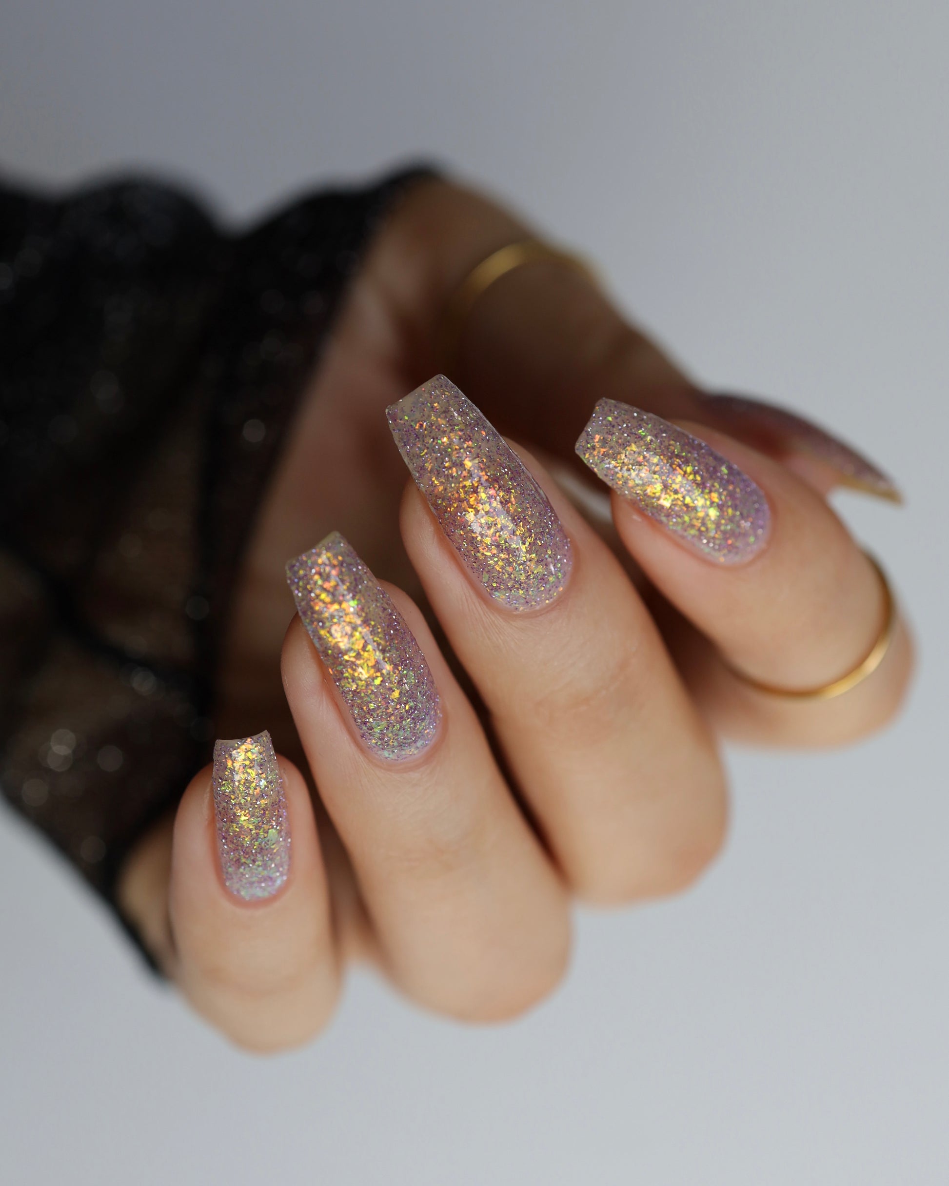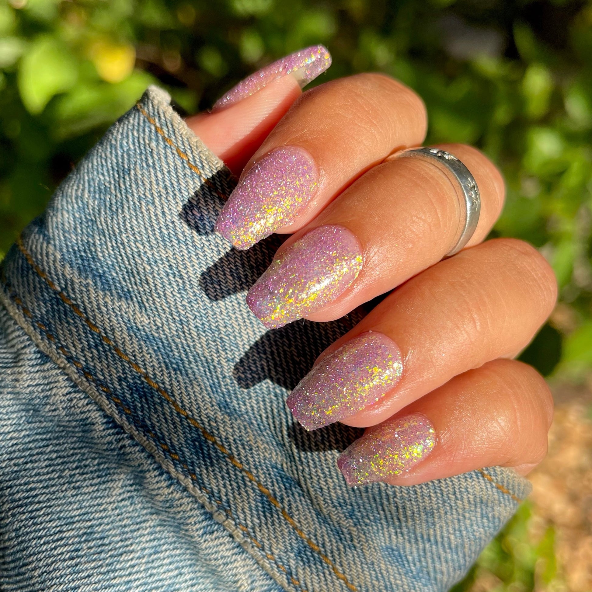 A clear base packed with purple light reflective glitter and iridescent flakies that shift from orange to gold to green