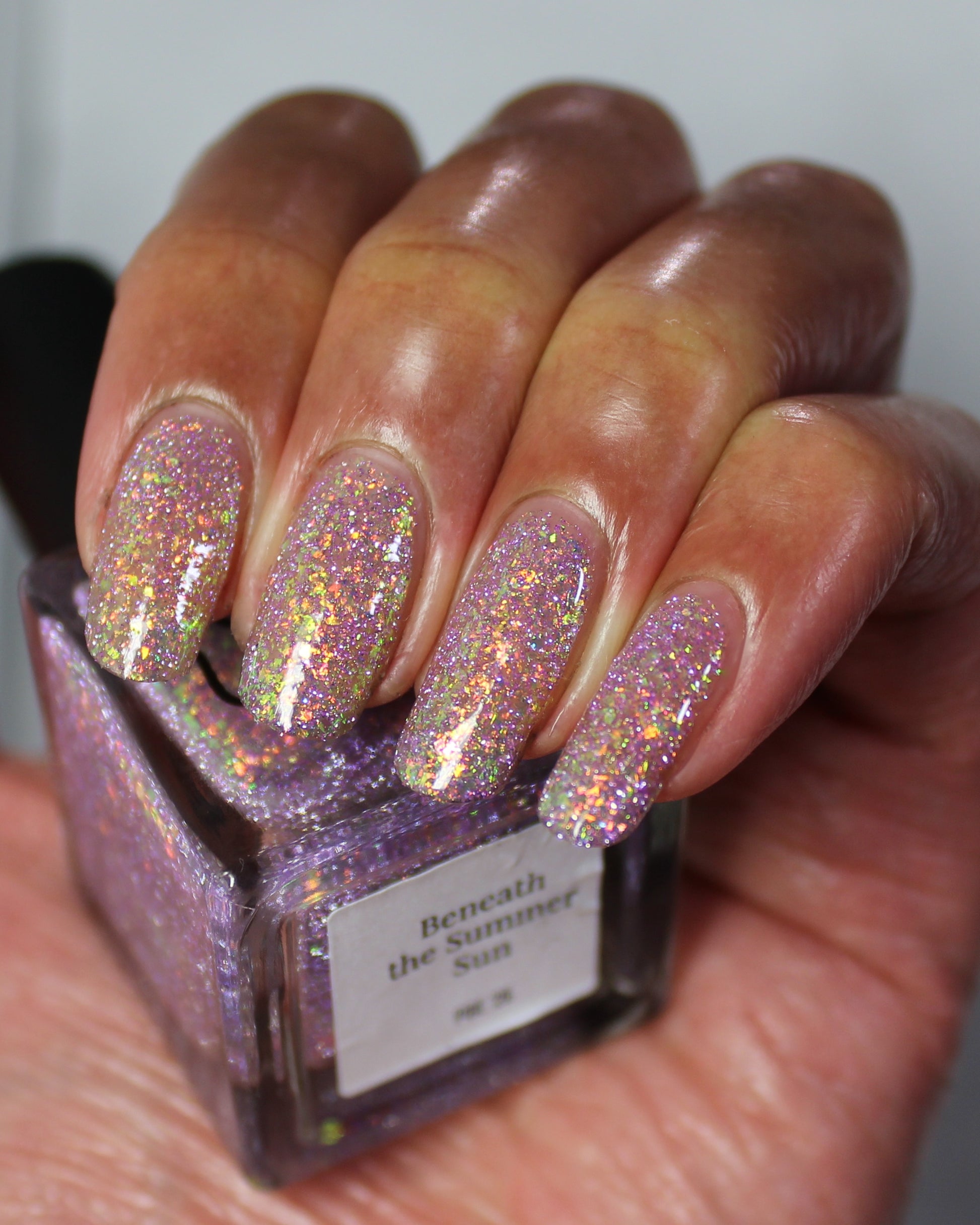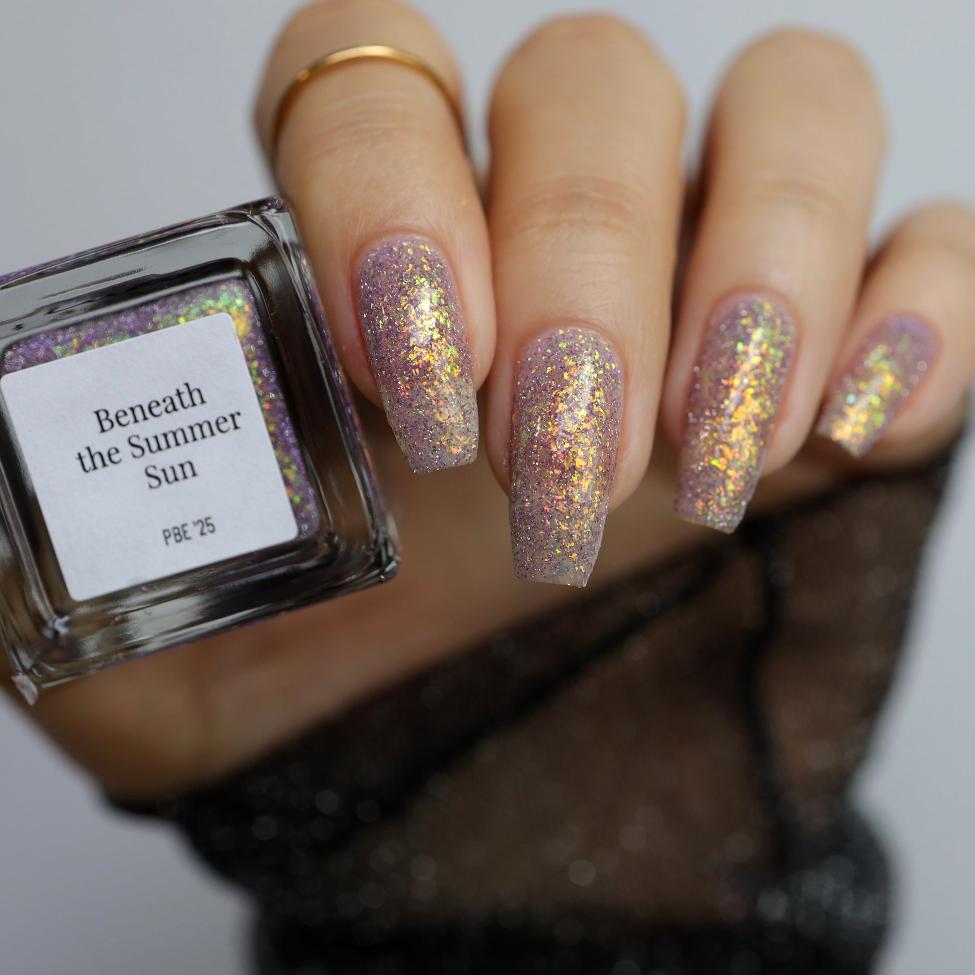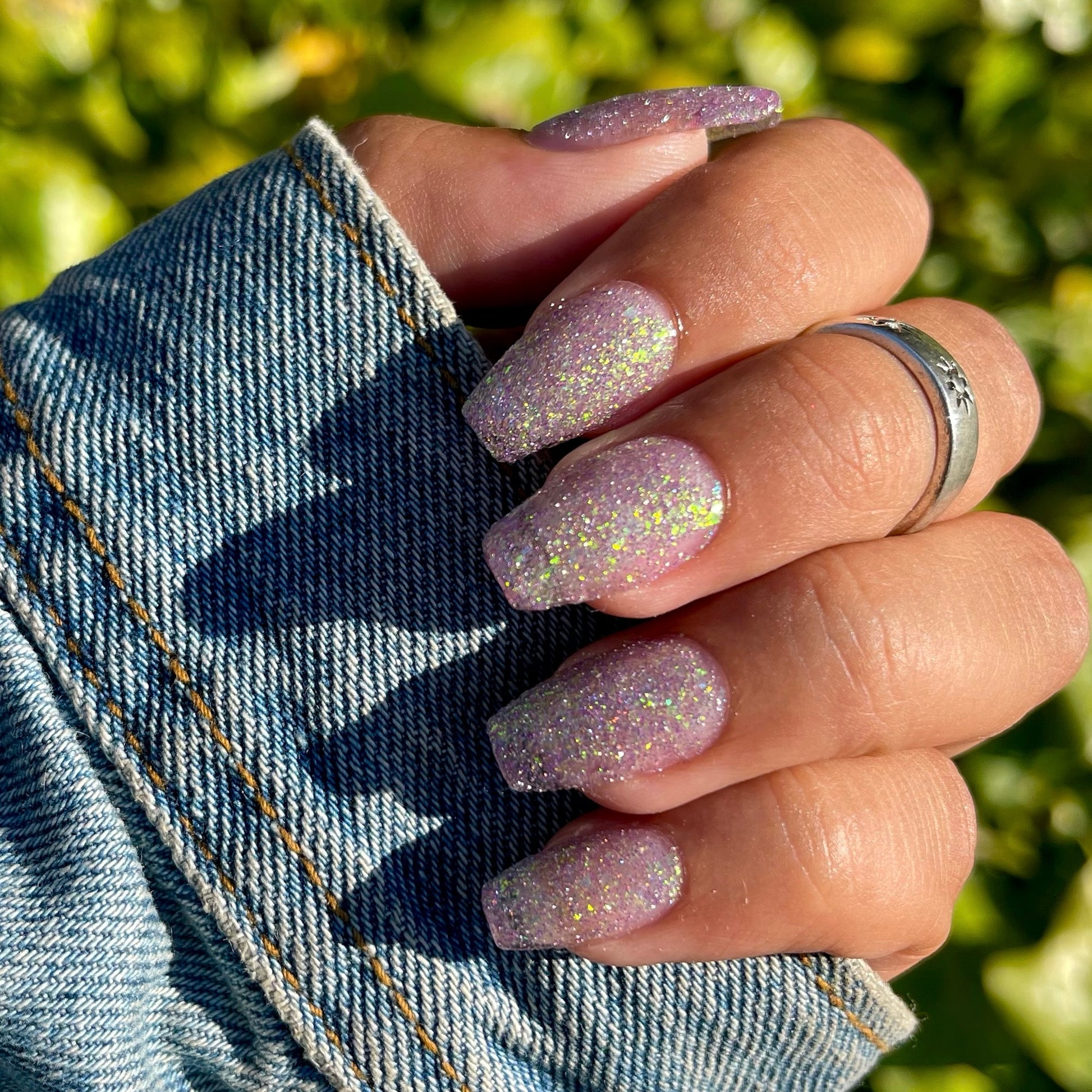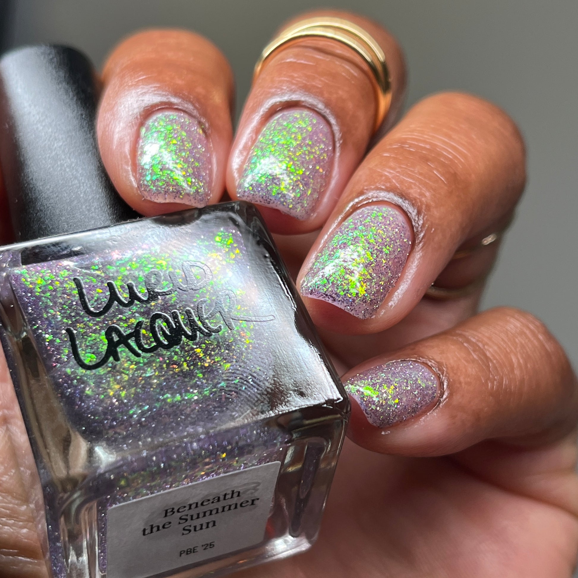 A clear base packed with purple light reflective glitter and iridescent flakies that shift from orange to gold to green