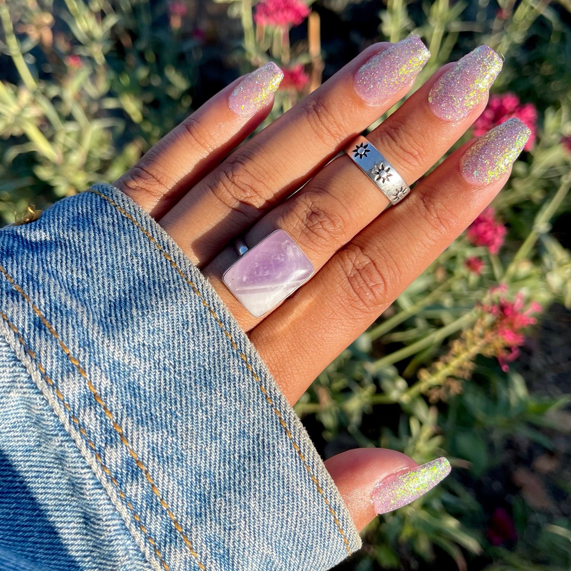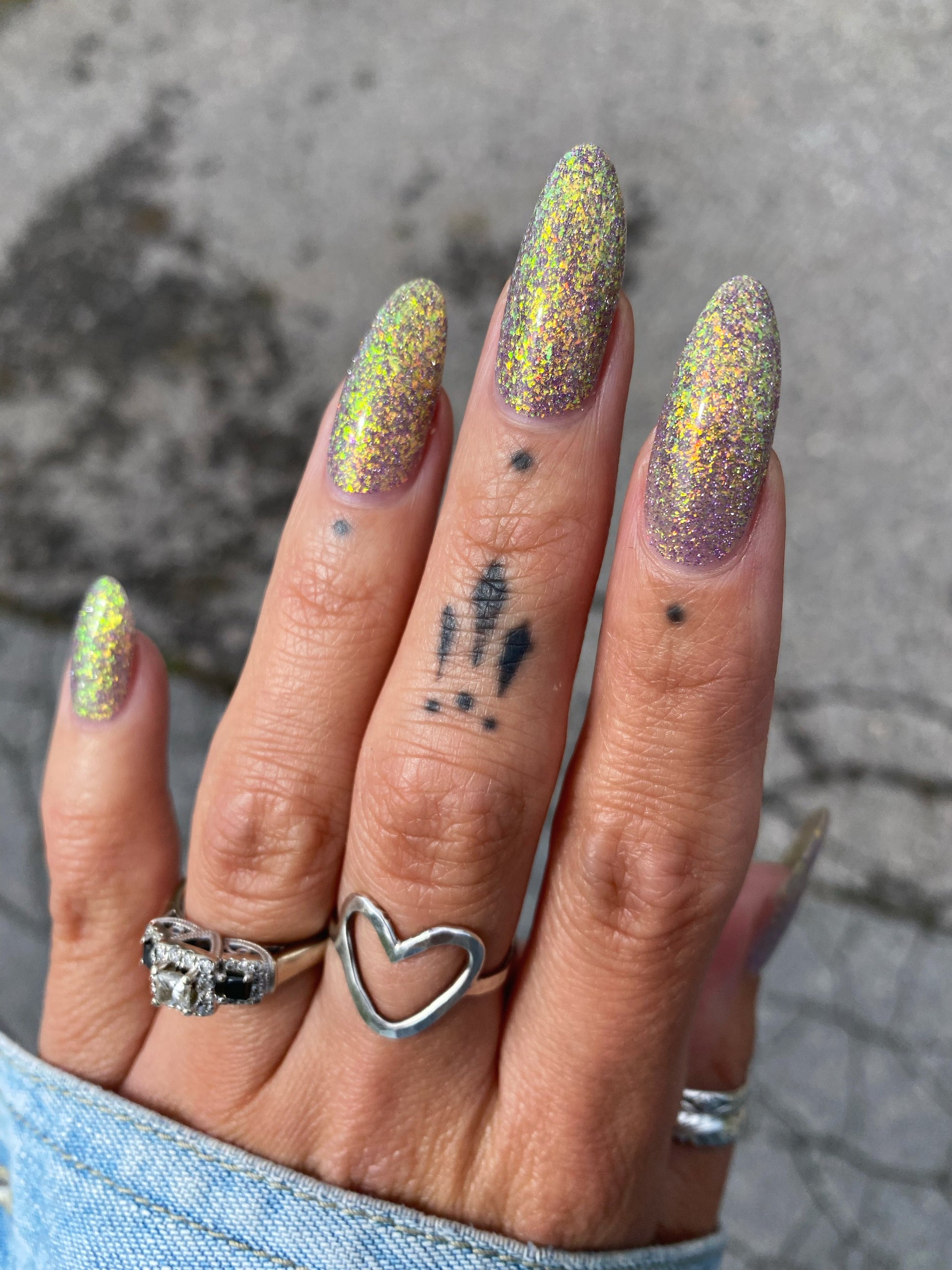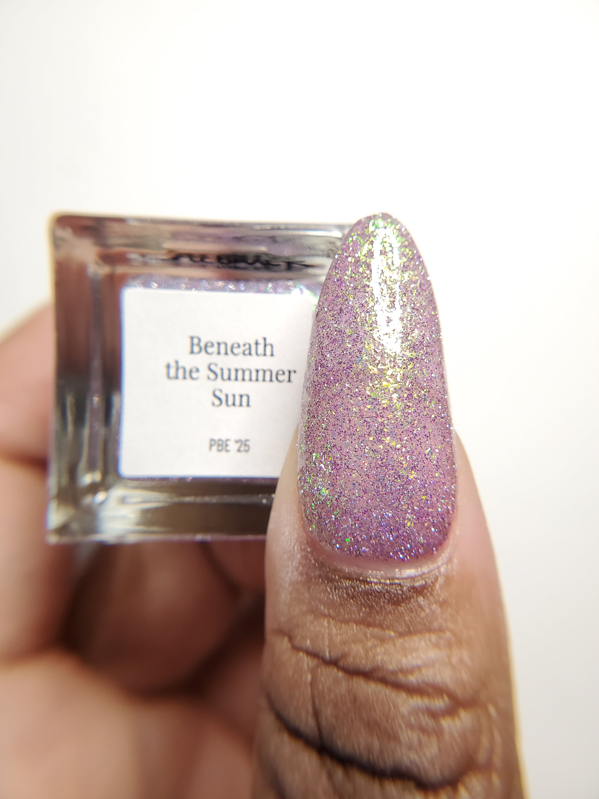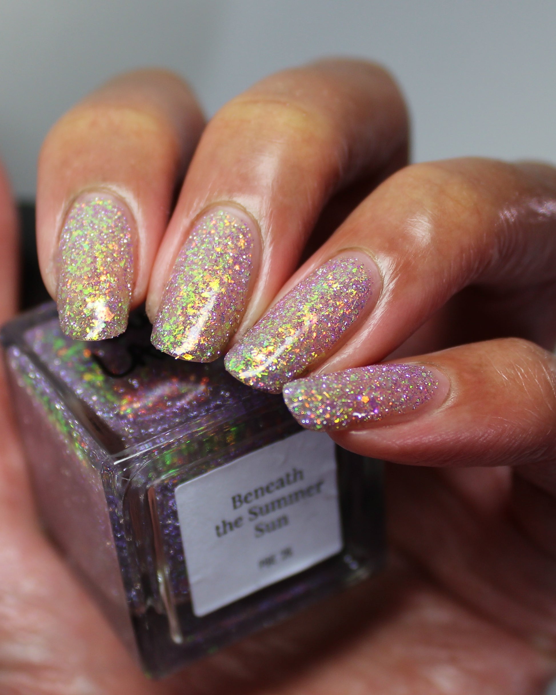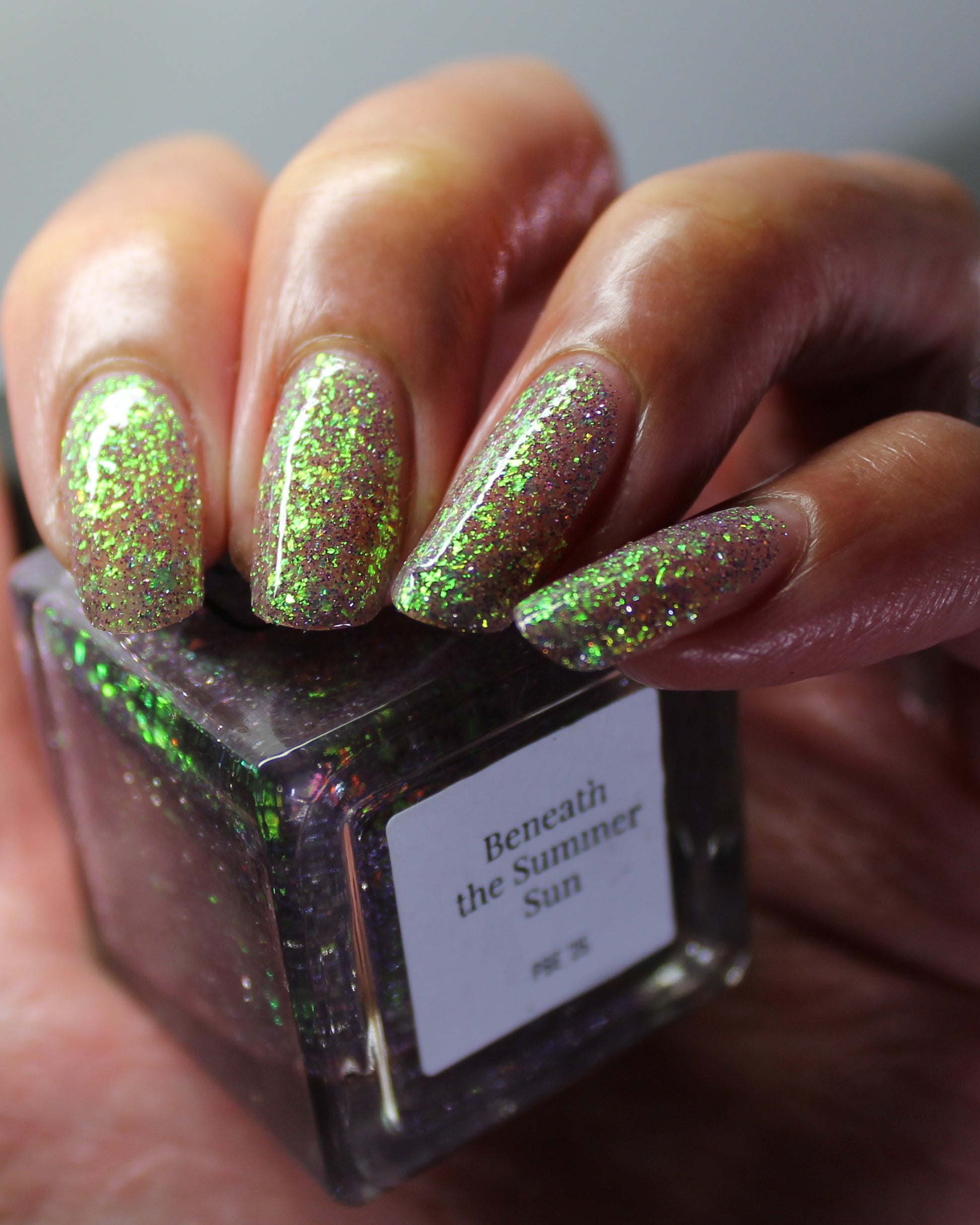 A clear base packed with purple light reflective glitter and iridescent flakies that shift from orange to gold to green