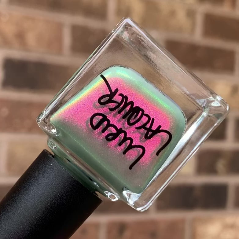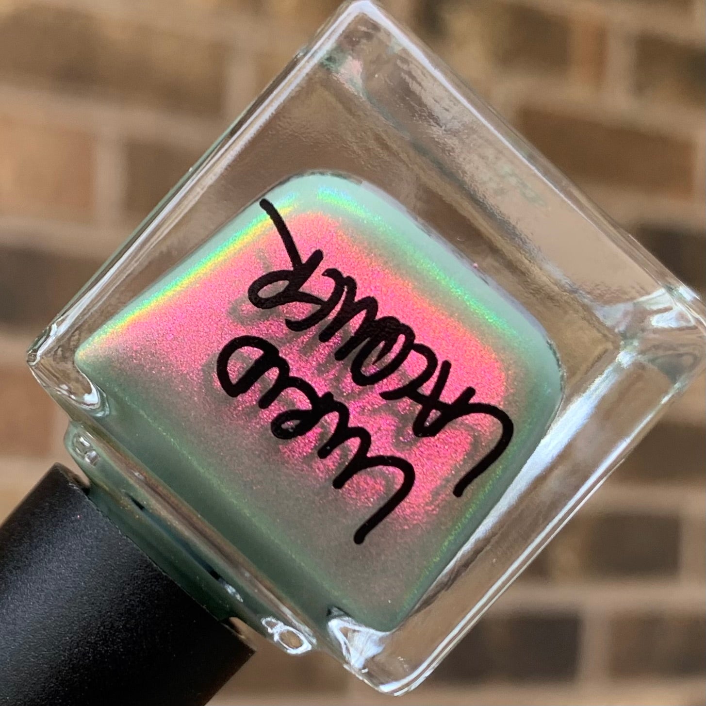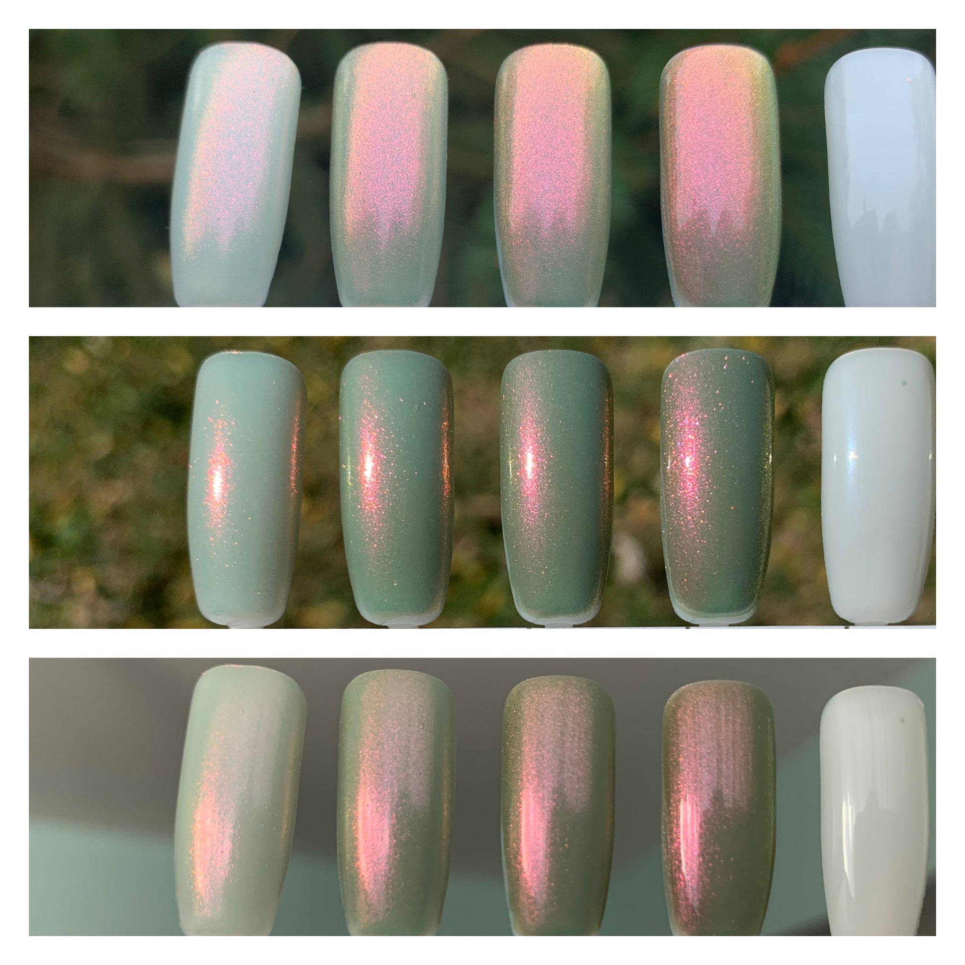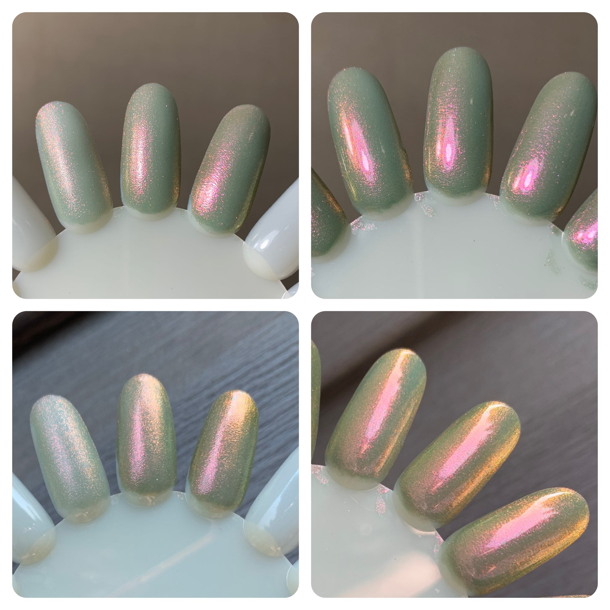 Brunhilda features a khaki green base with a vibrant, twinkly aurora shimmer that shifts from a reddish pink to orange to gold.