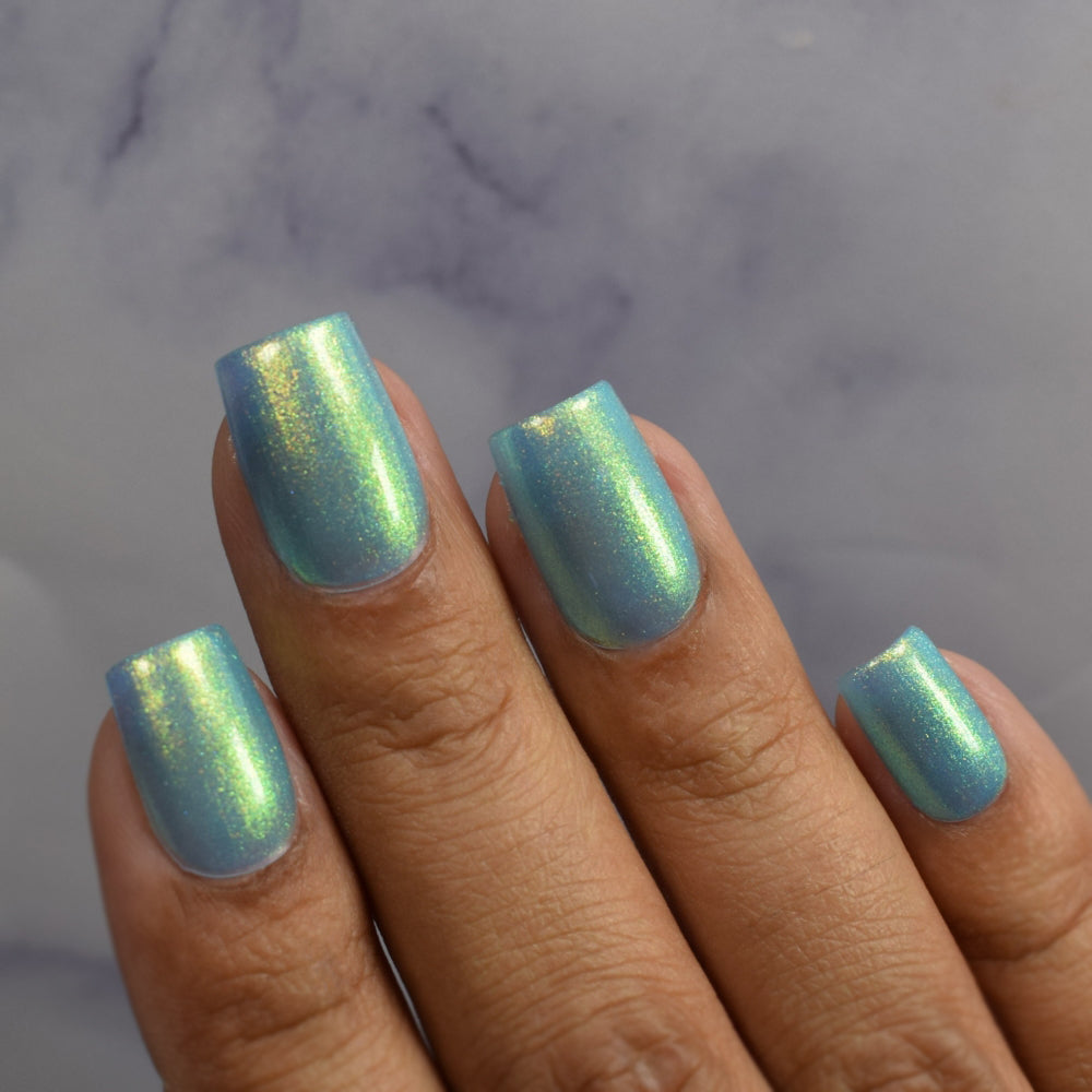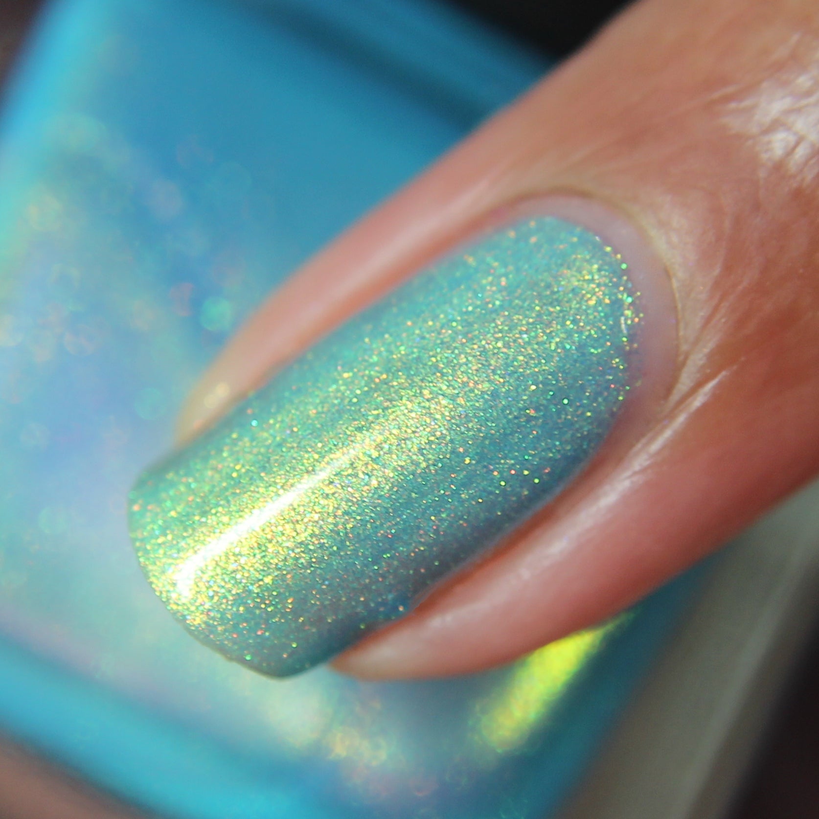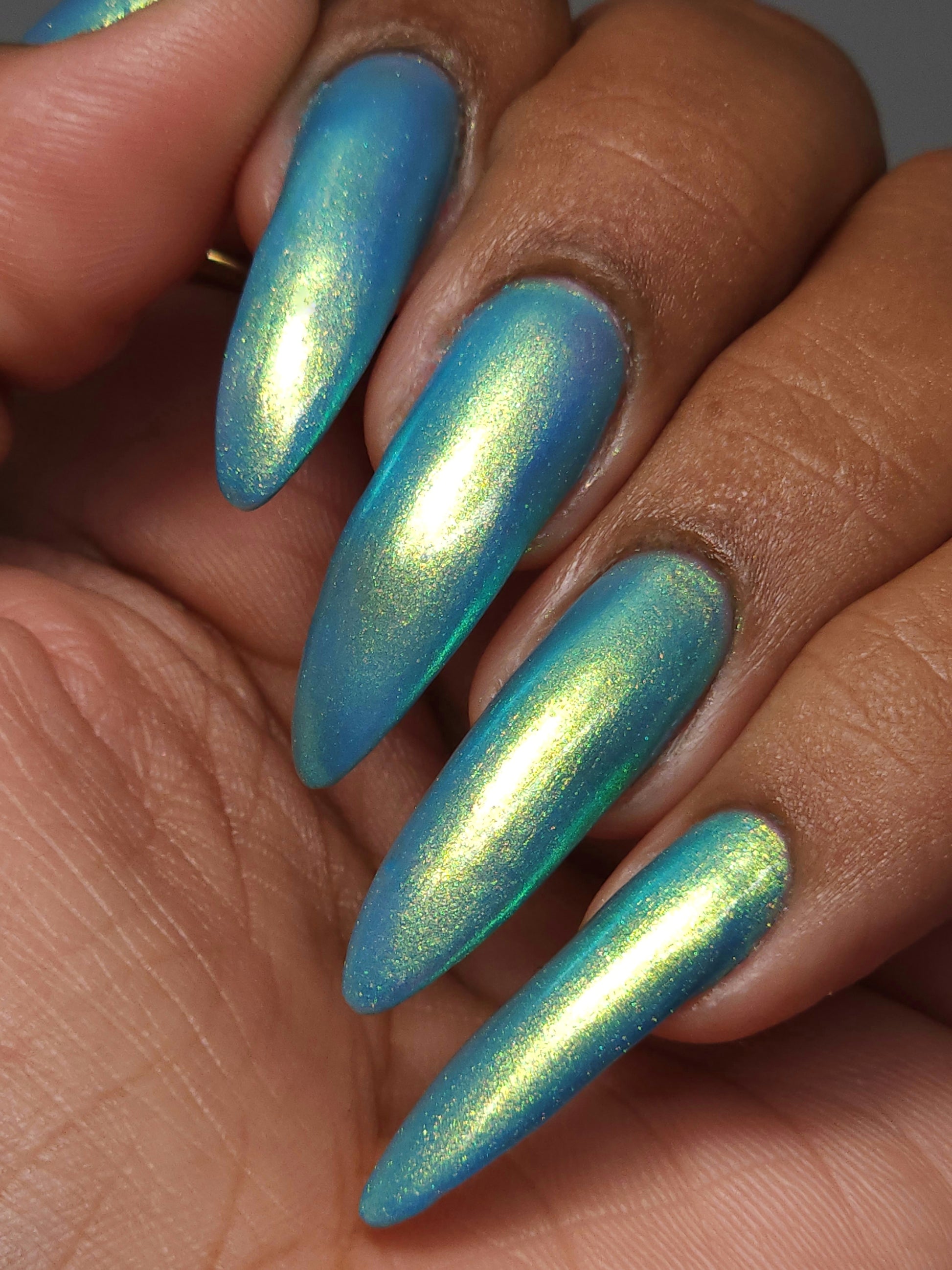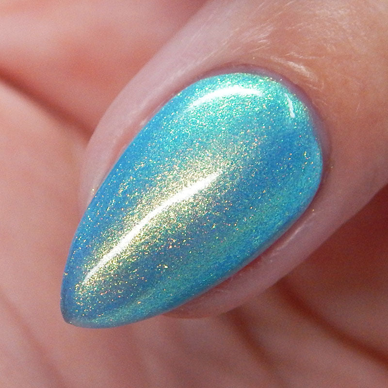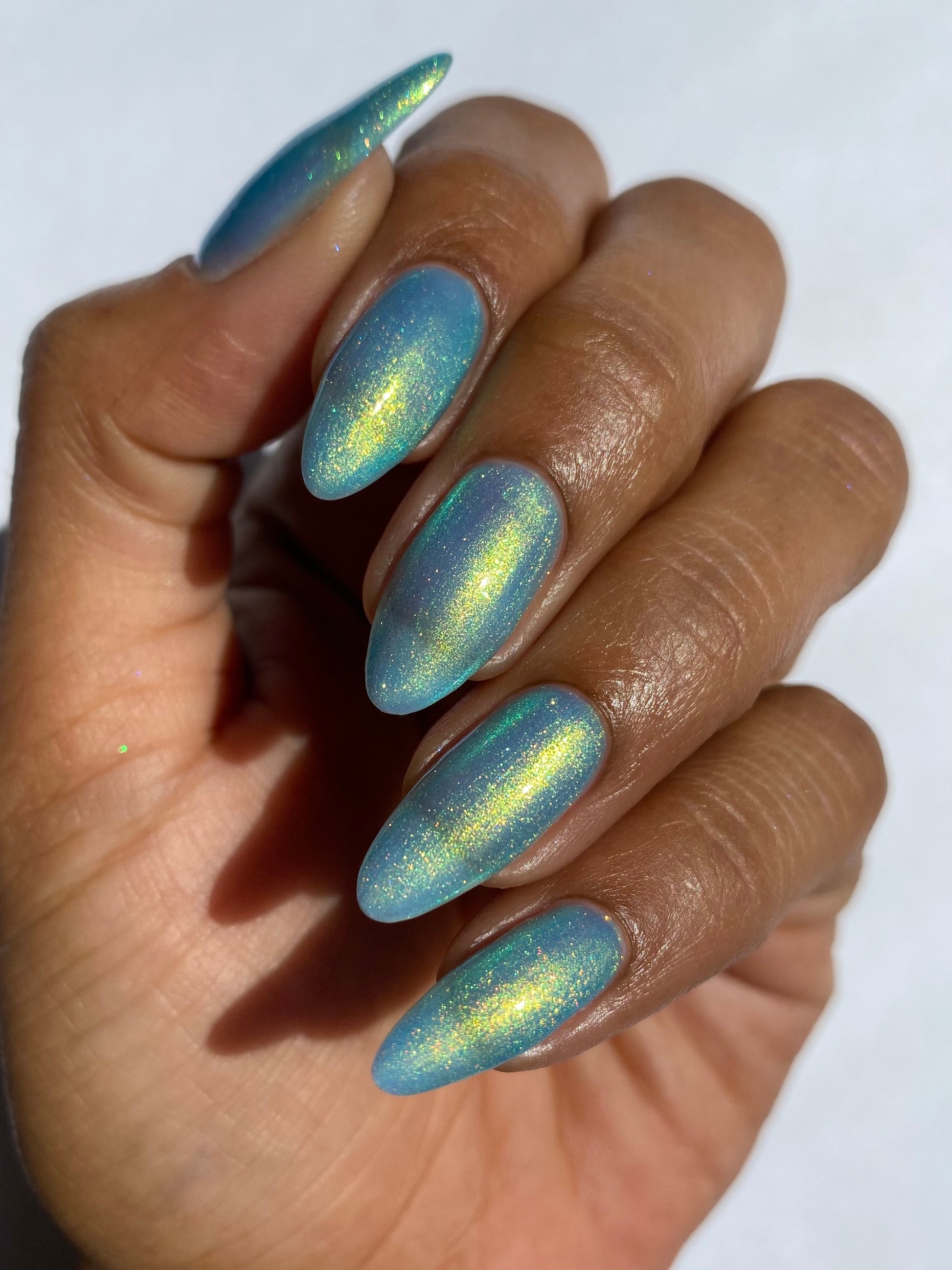 A cerulean crelly base with gold to green aurora shimmer that shifts to blue at extremes