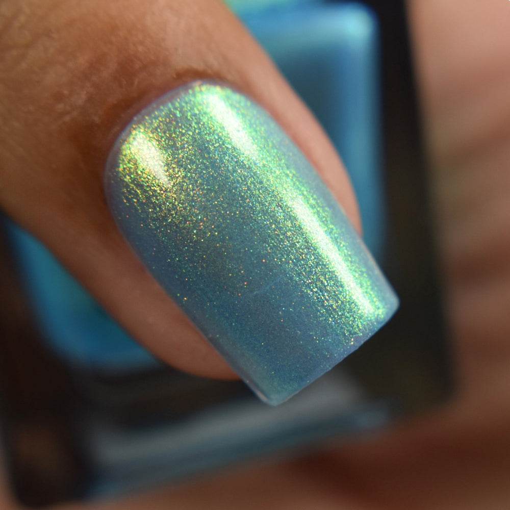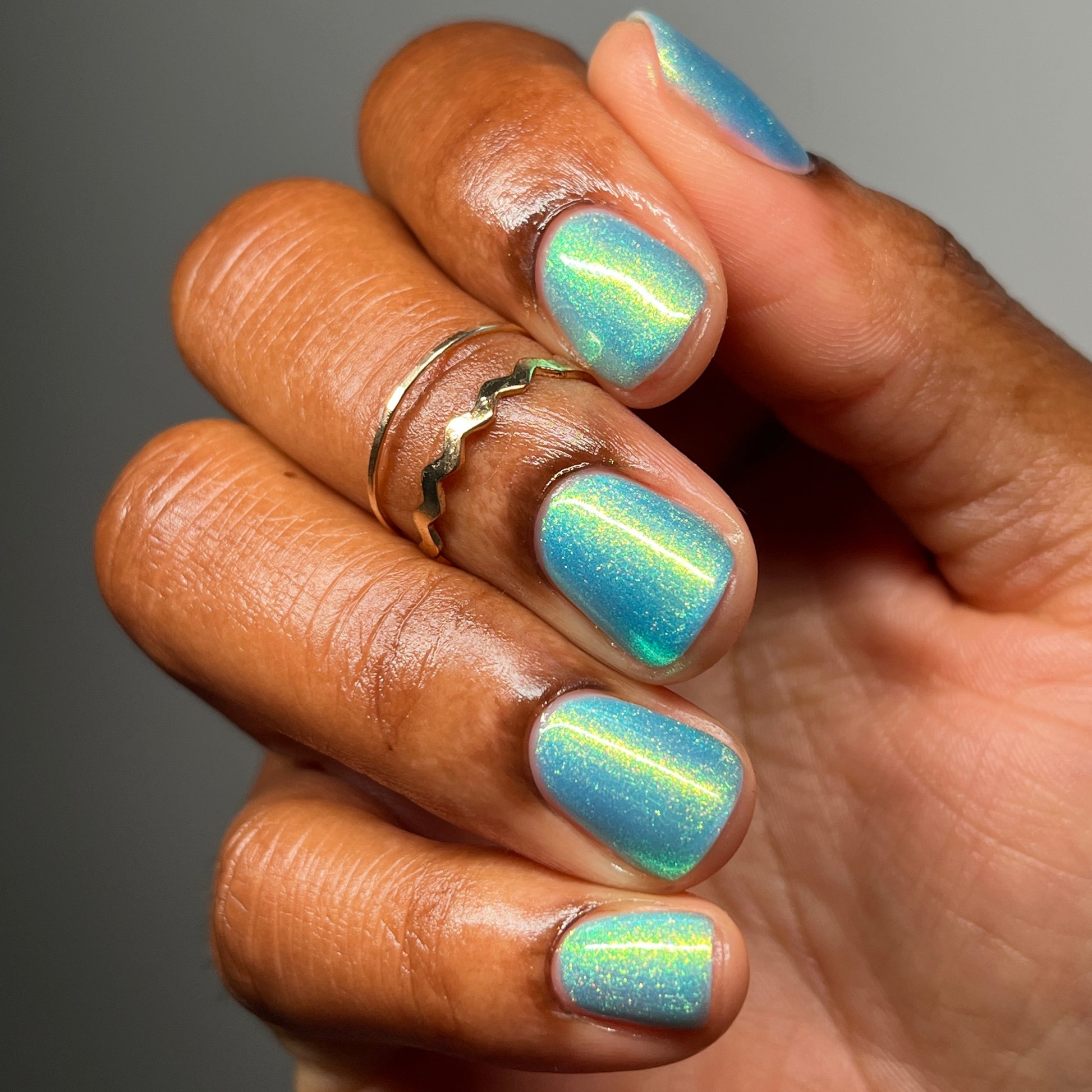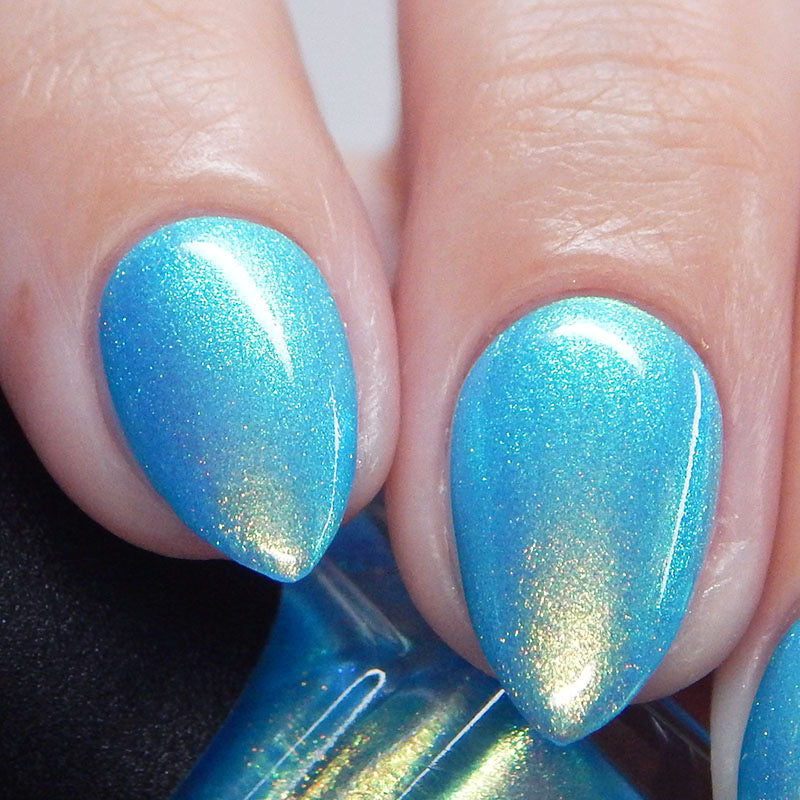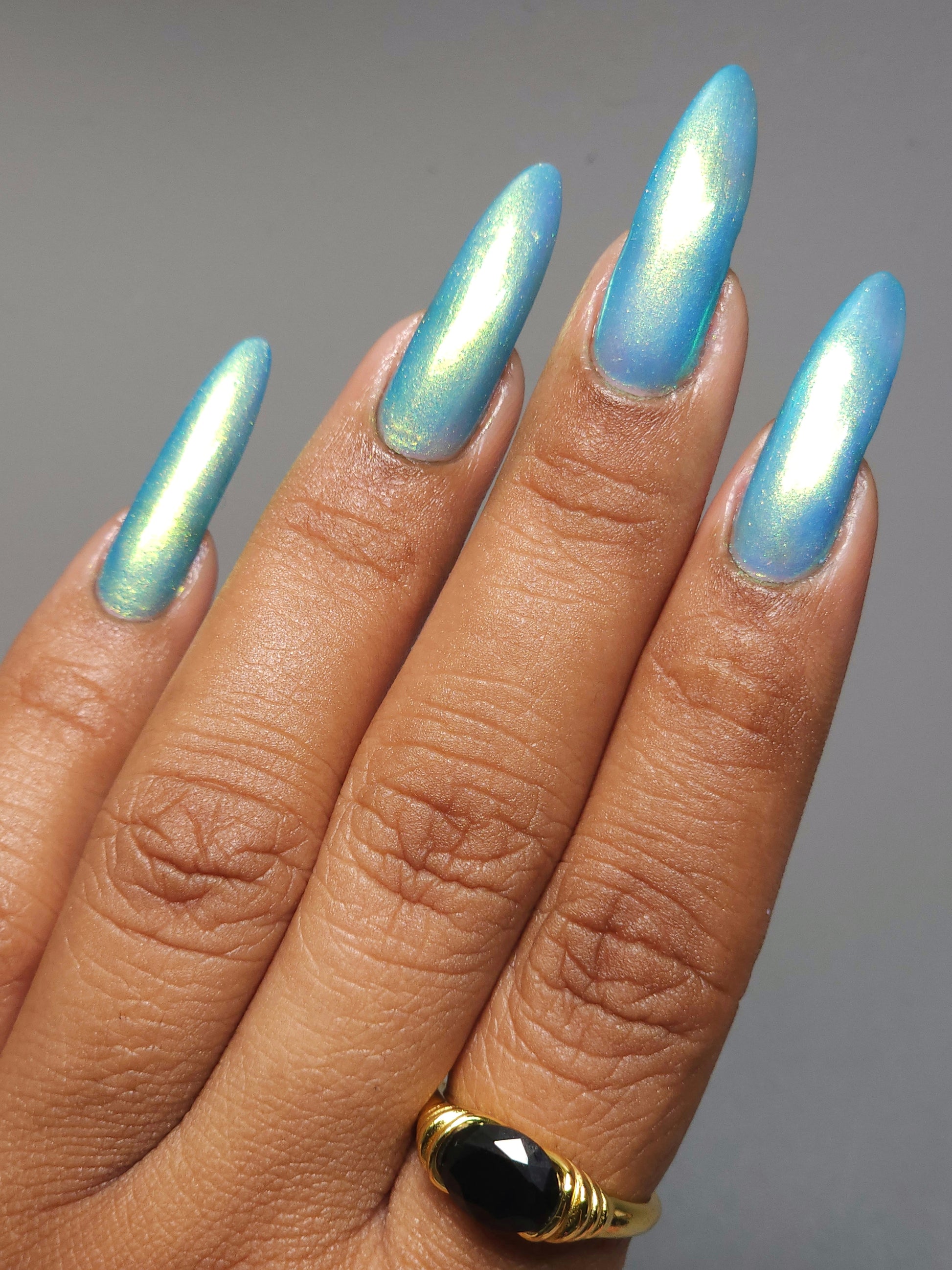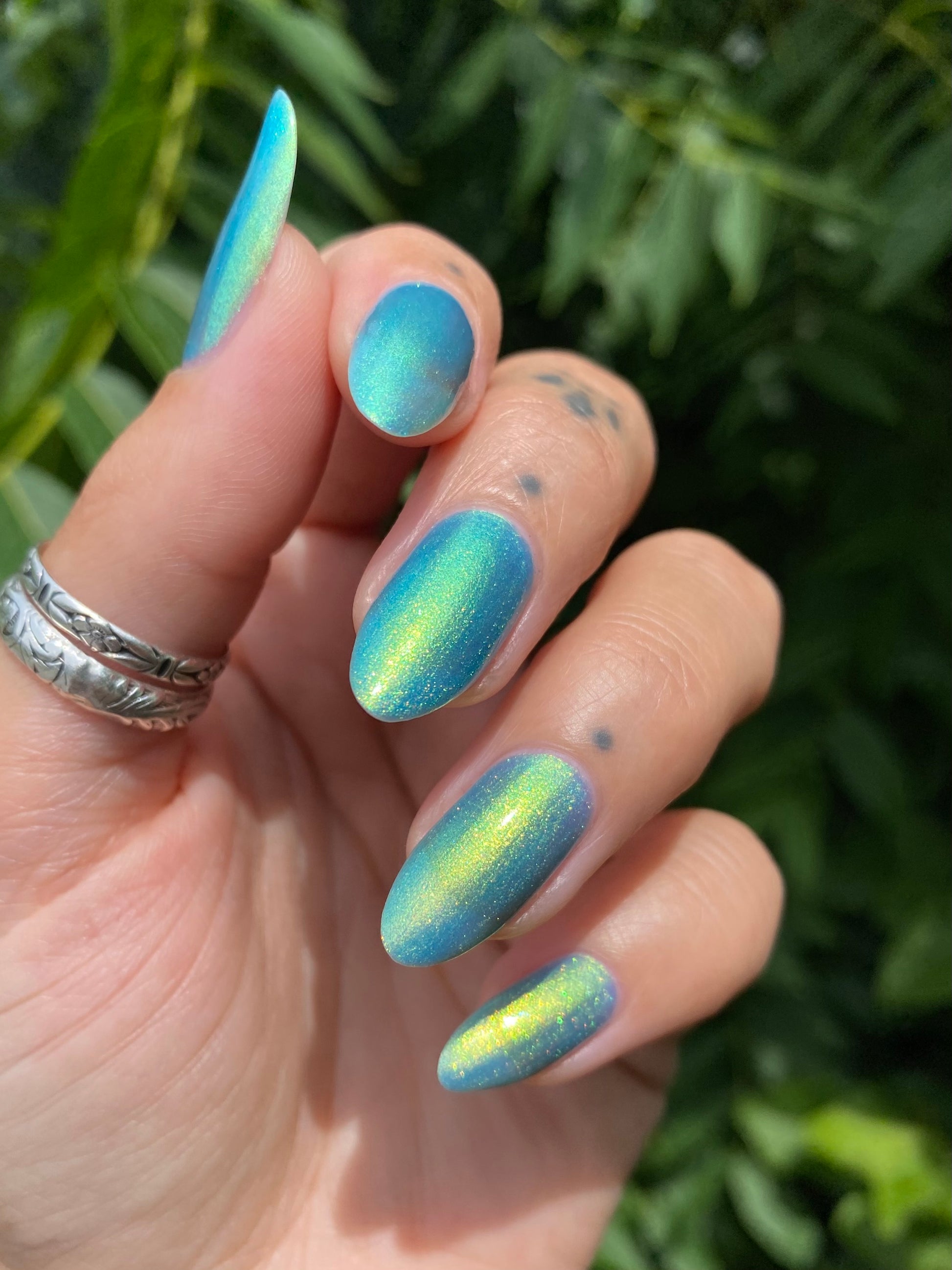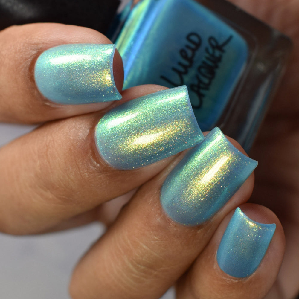 A cerulean crelly base with gold to green aurora shimmer that shifts to blue at extremes