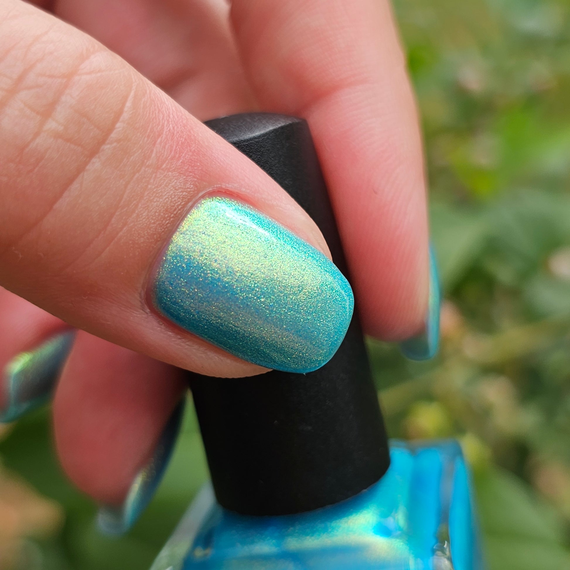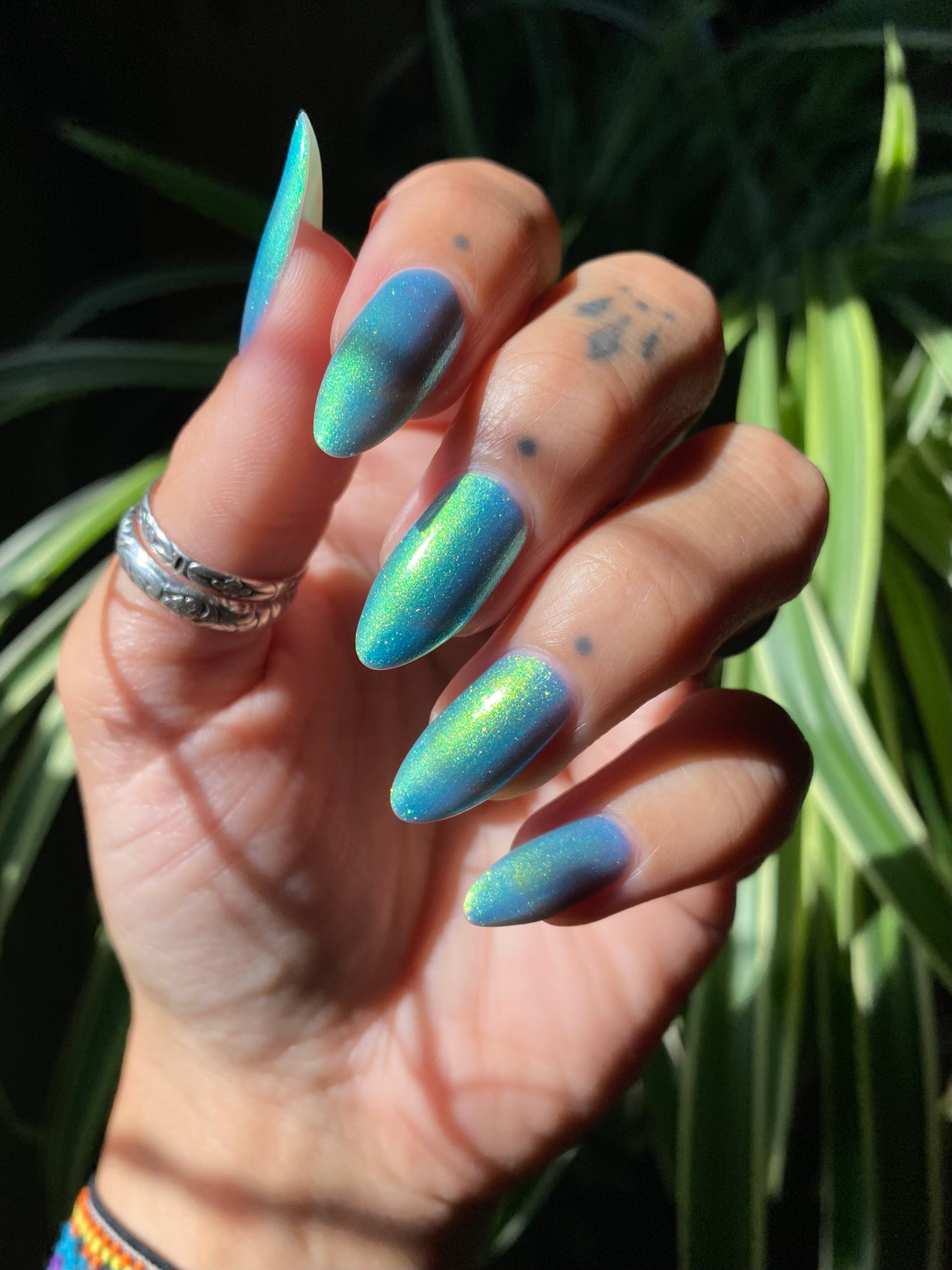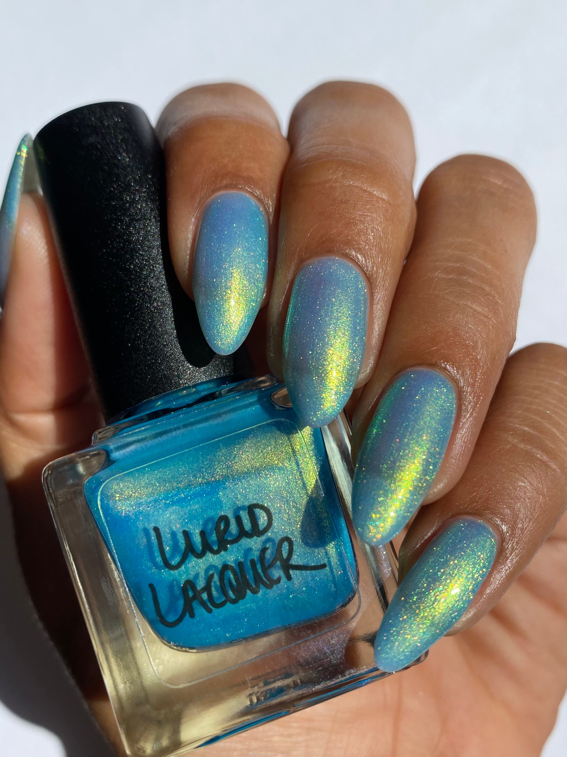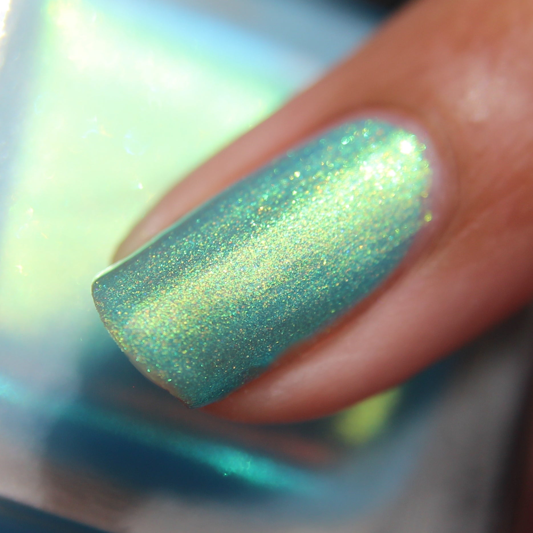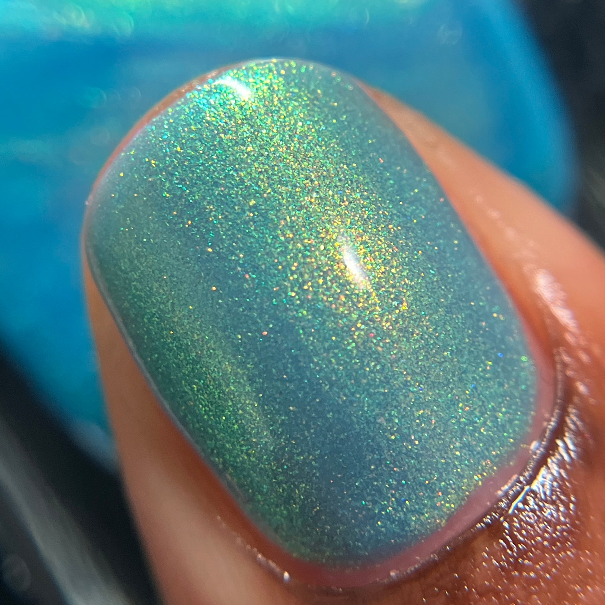 A cerulean crelly base with gold to green aurora shimmer that shifts to blue at extremes