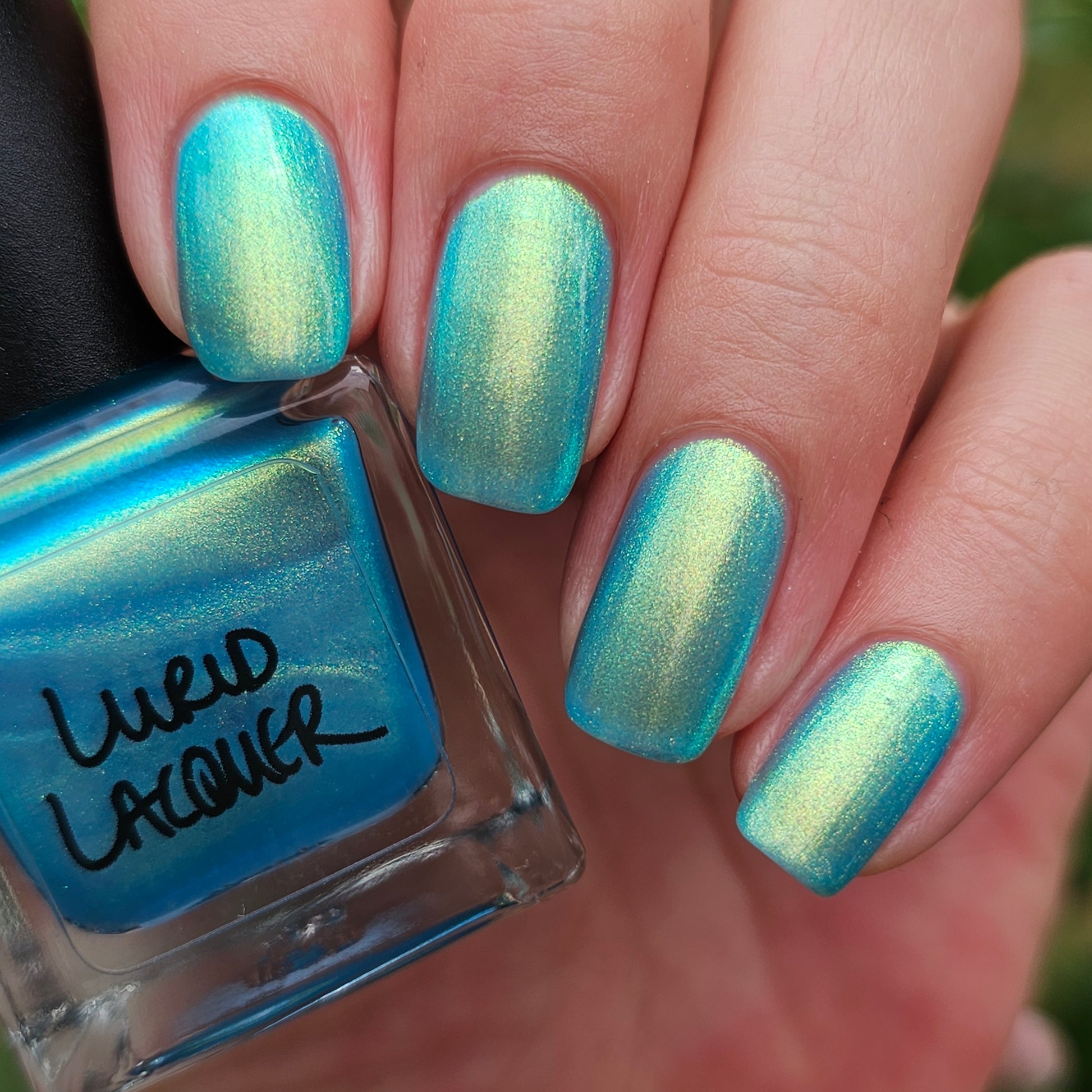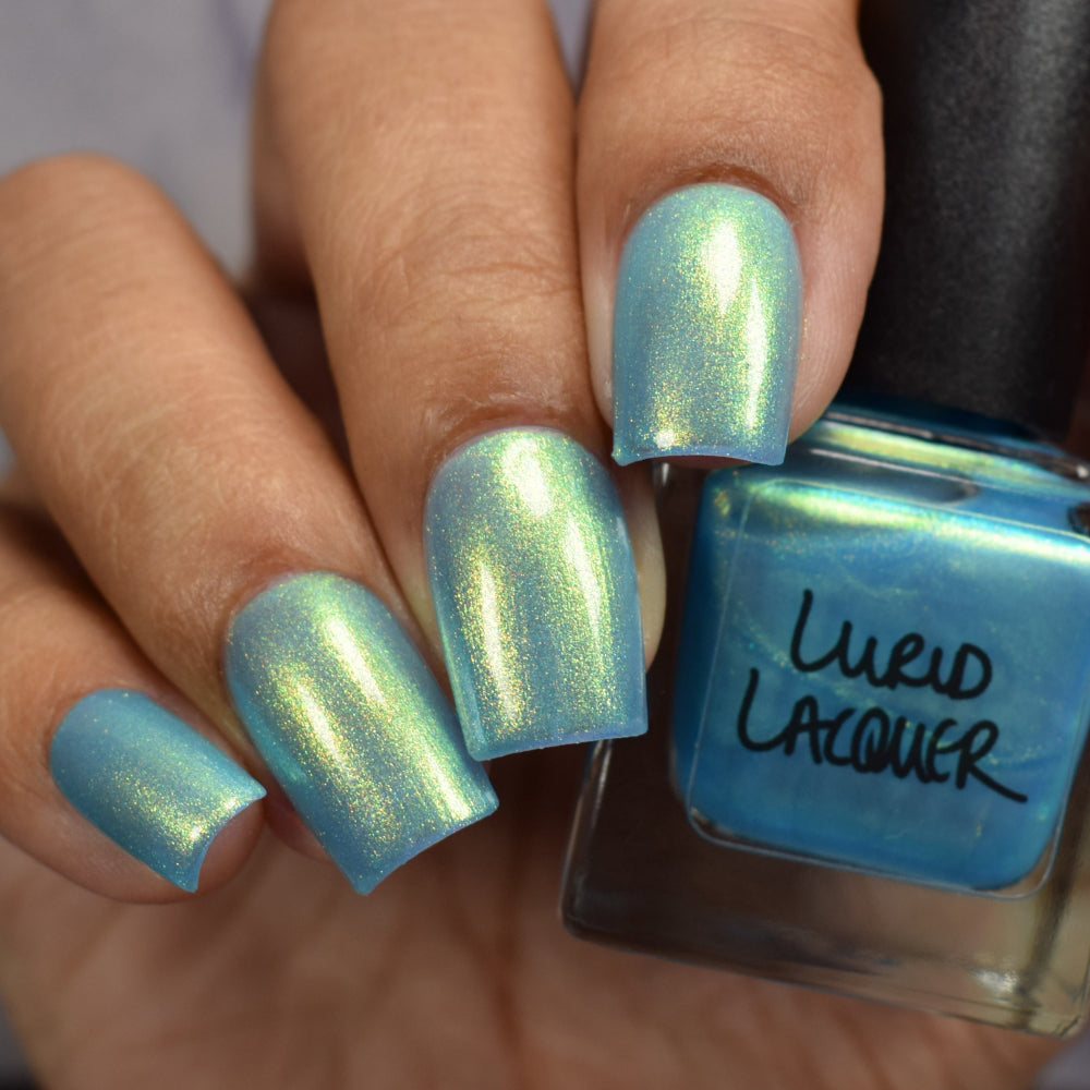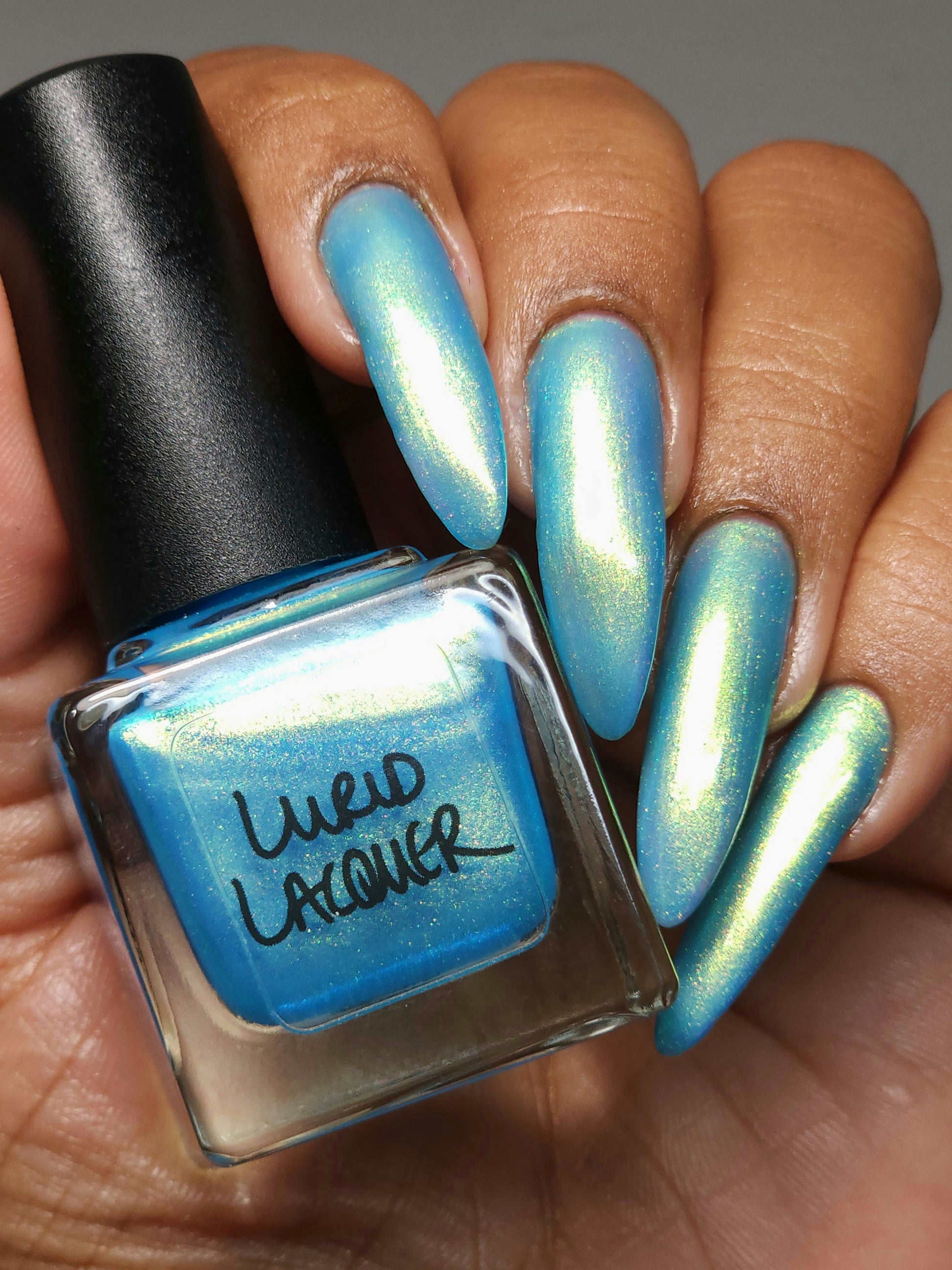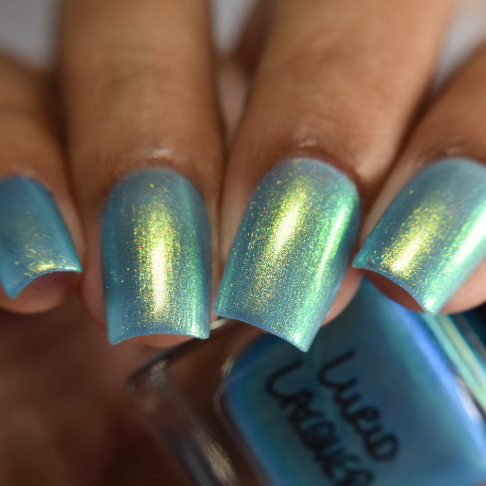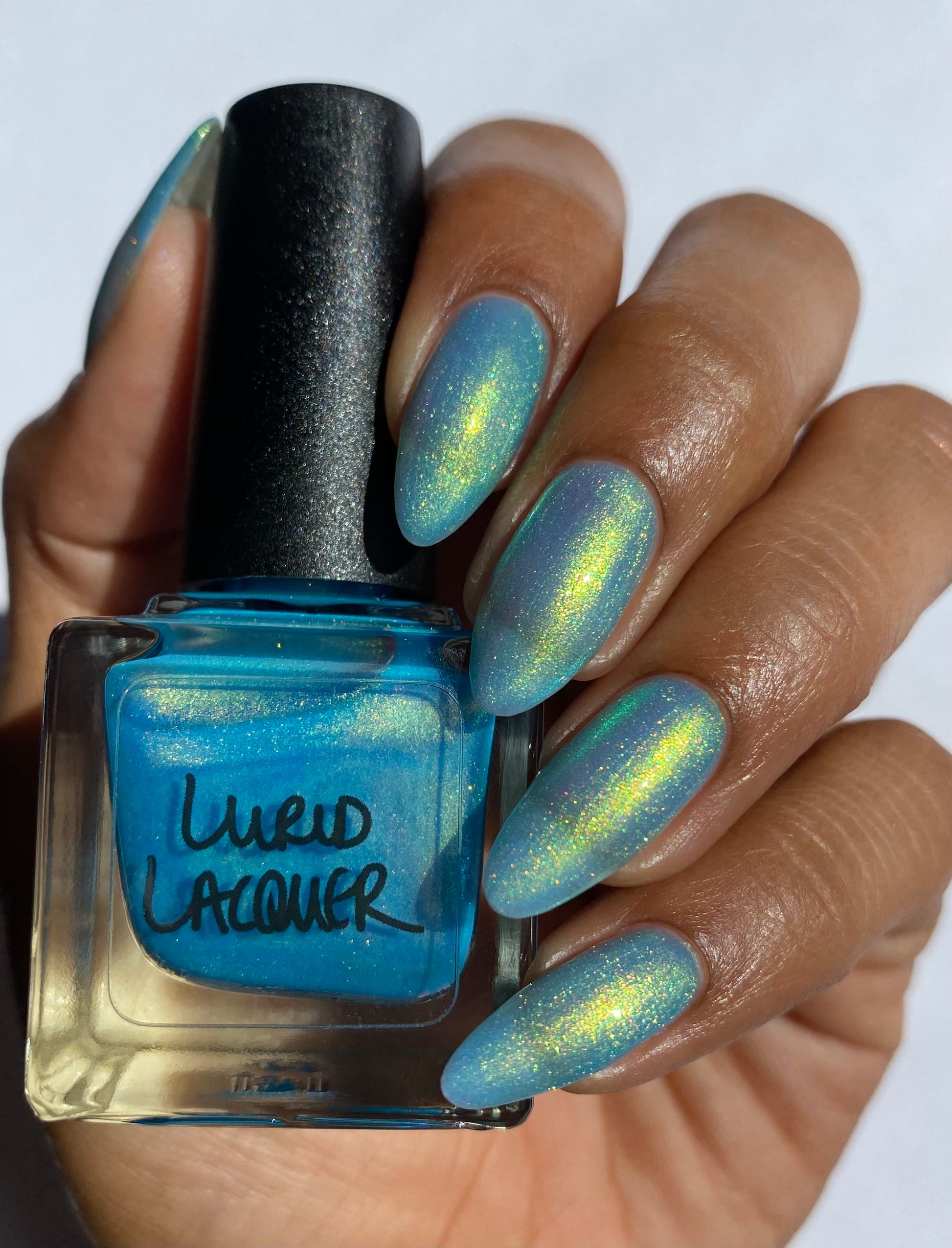 A cerulean crelly base with gold to green aurora shimmer that shifts to blue at extremes
