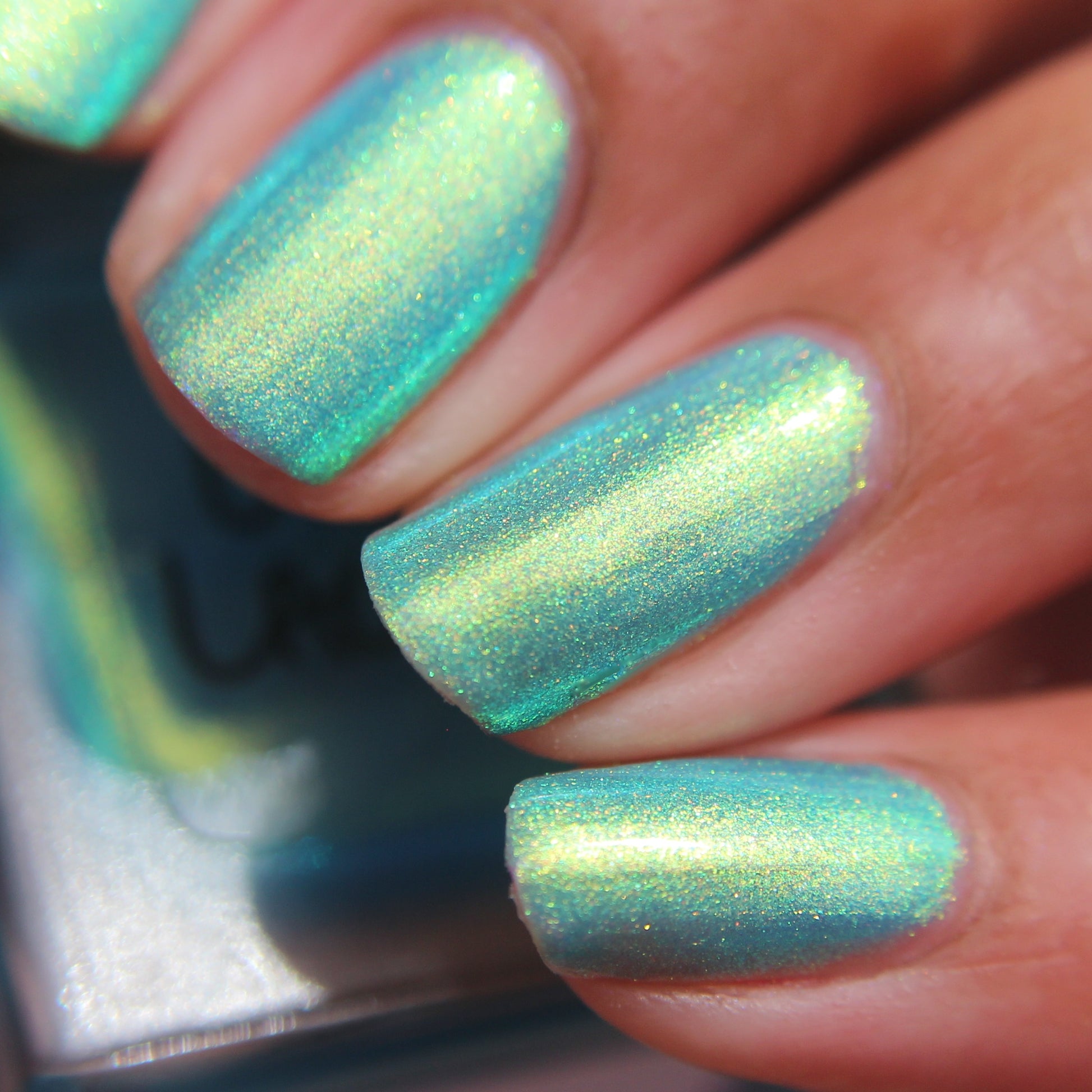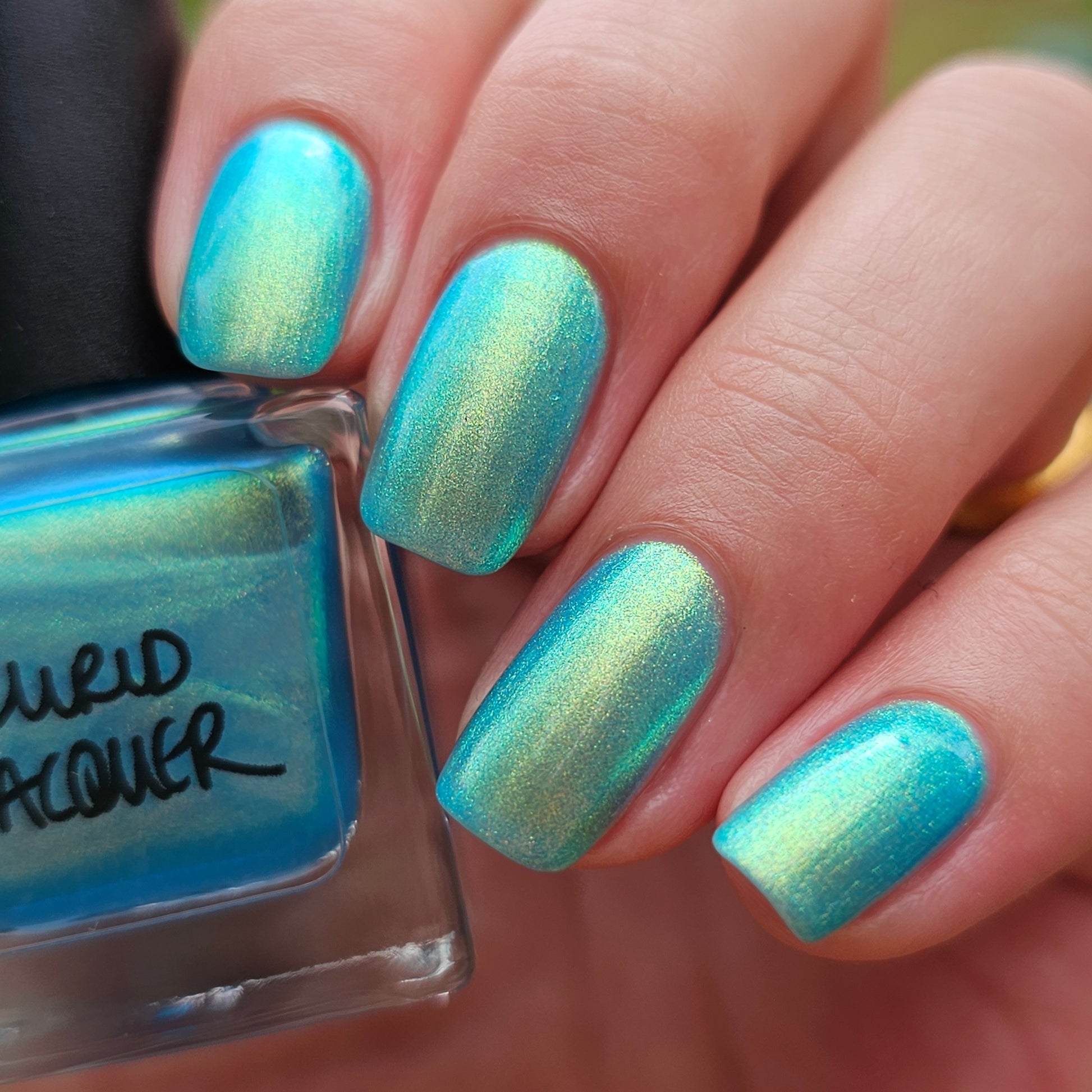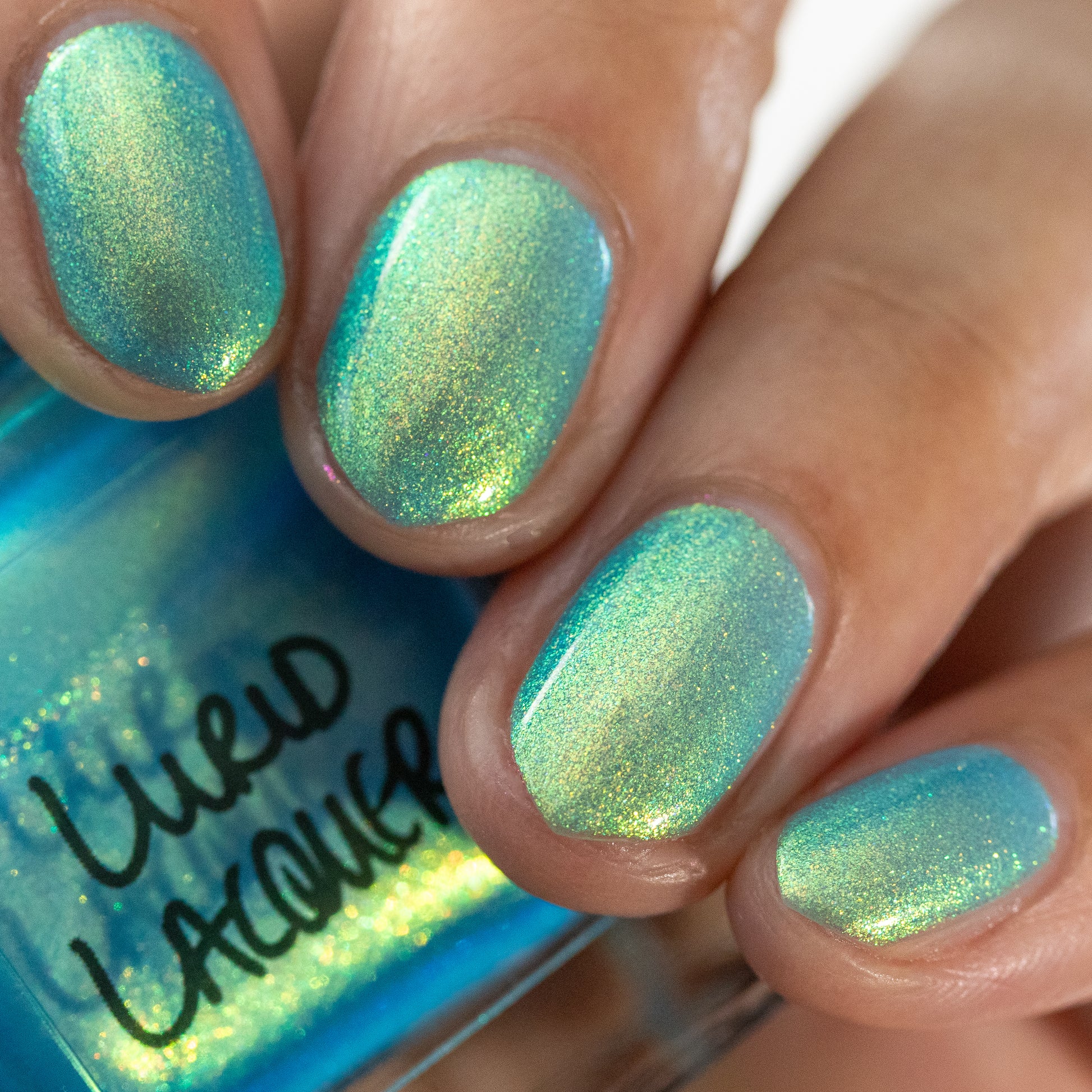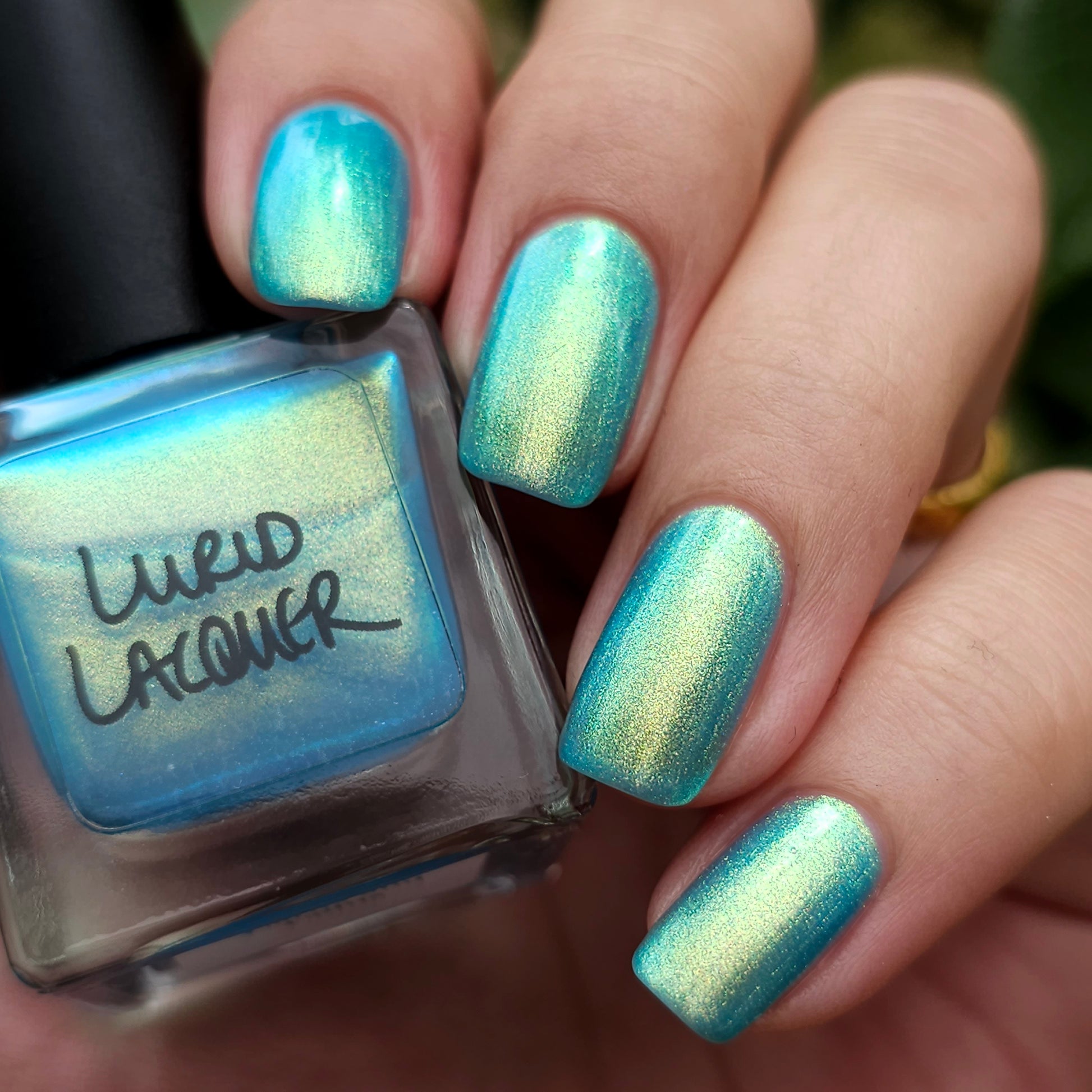 A cerulean crelly base with gold to green aurora shimmer that shifts to blue at extremes