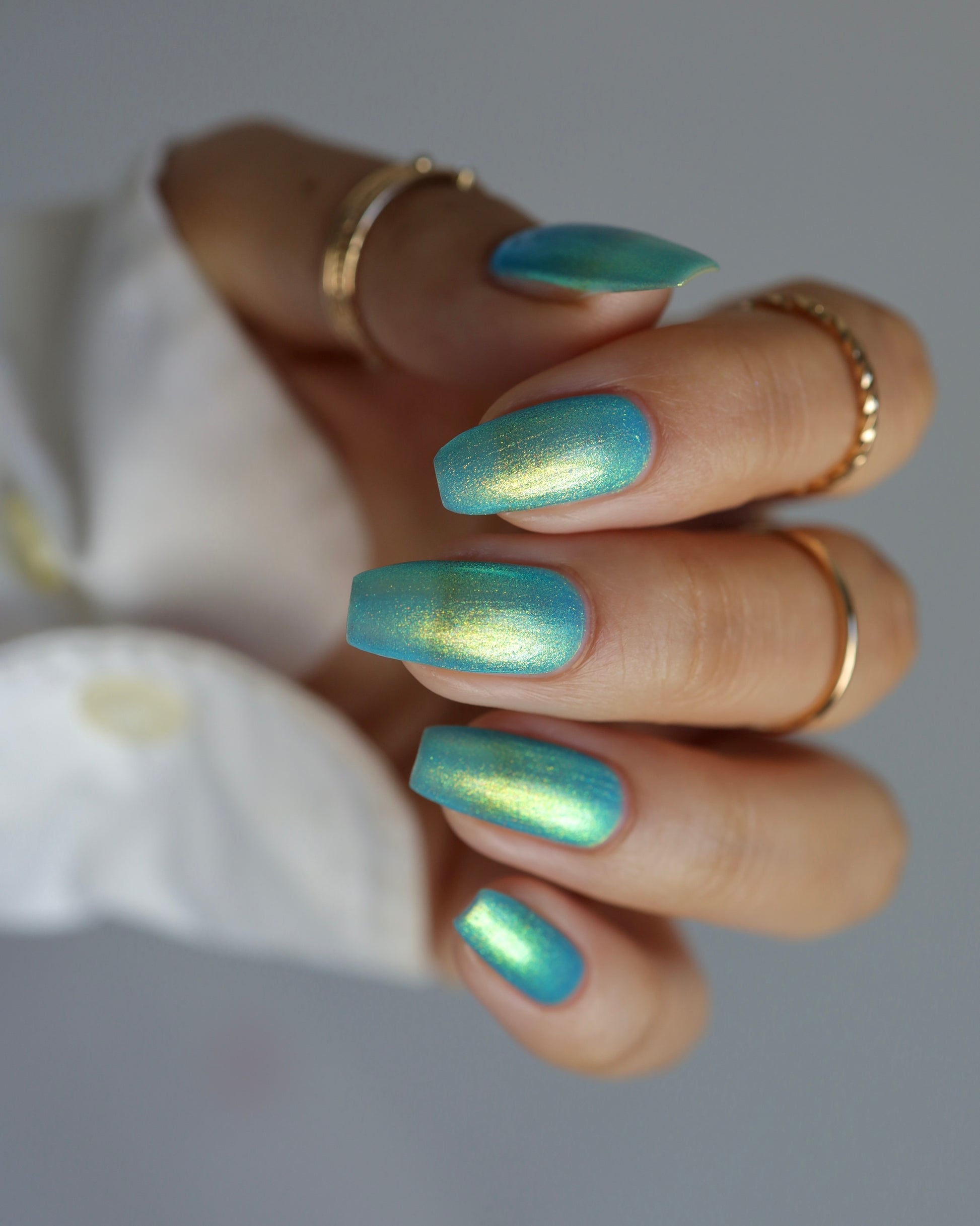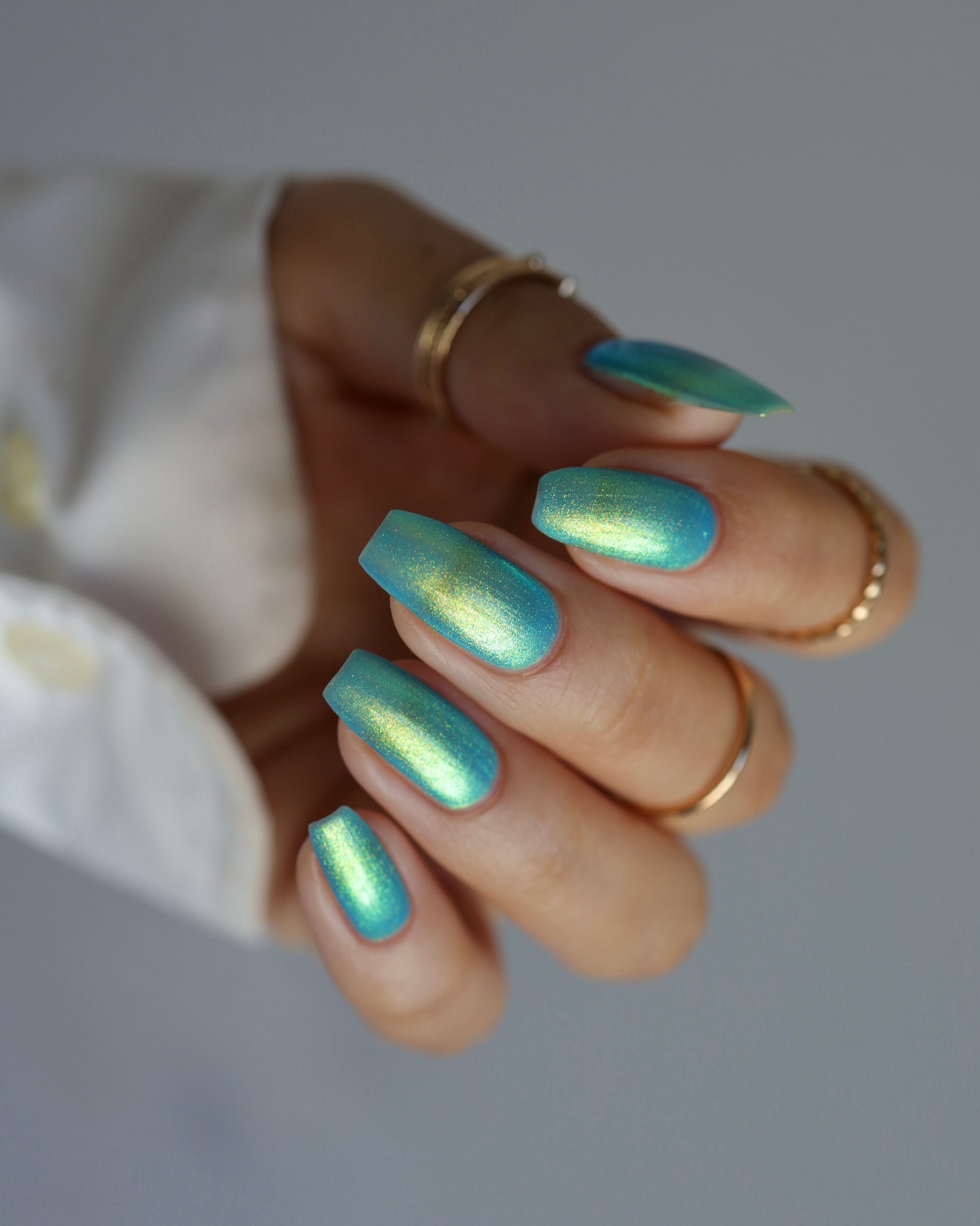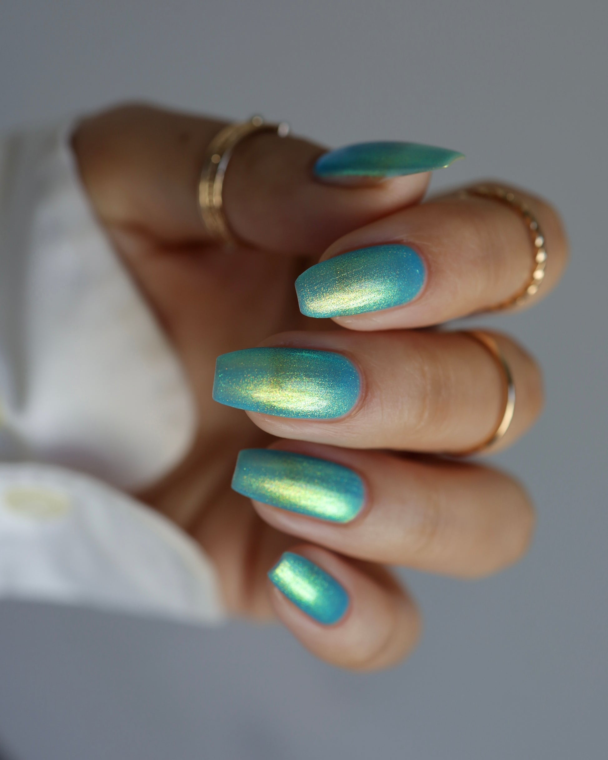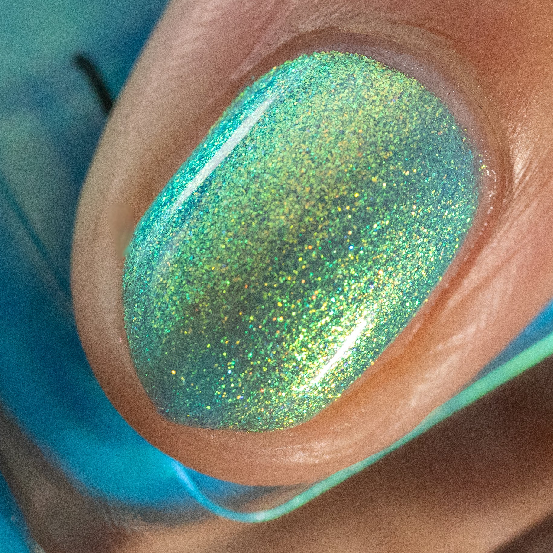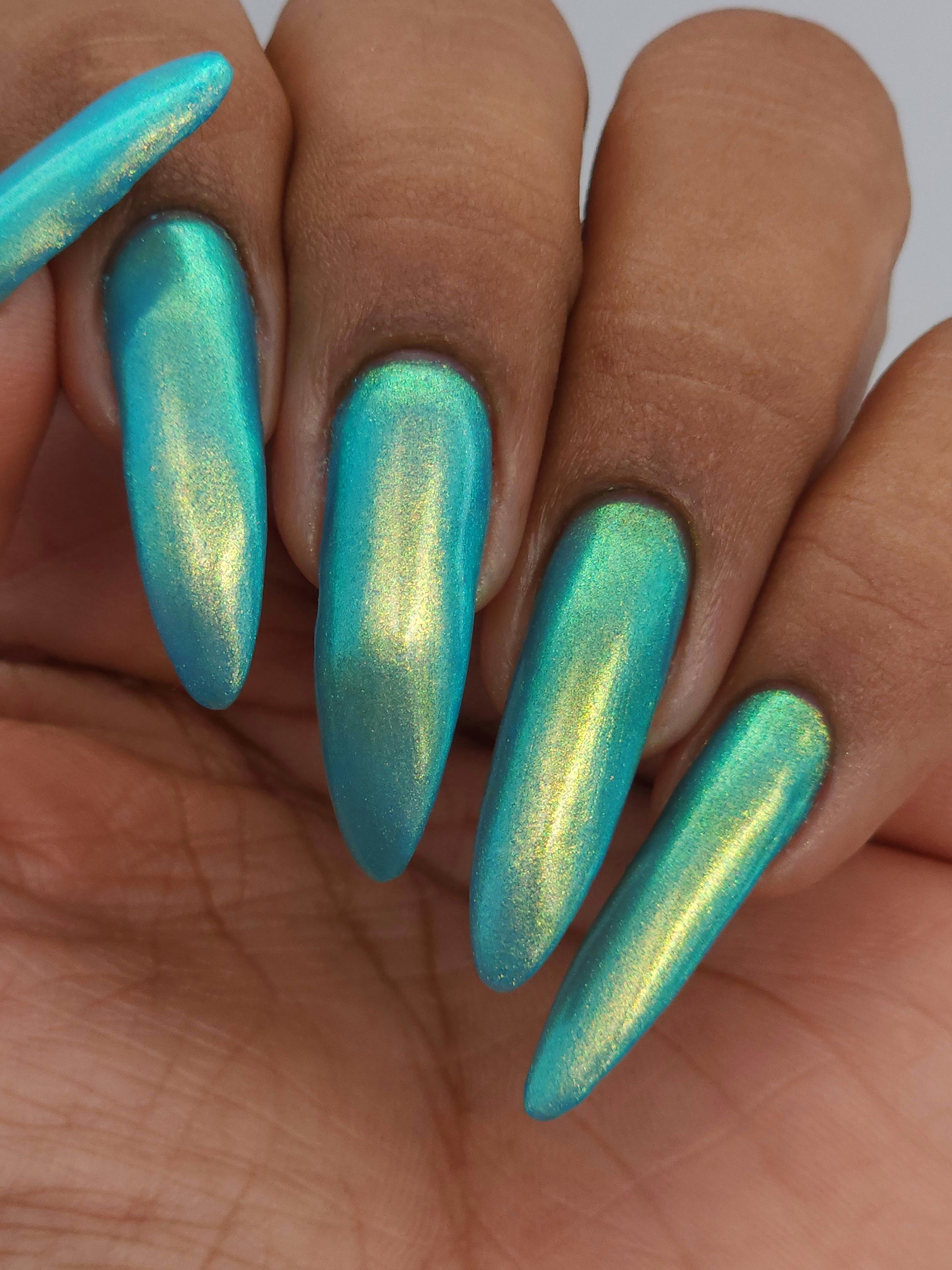 A cerulean crelly base with gold to green aurora shimmer that shifts to blue at extremes