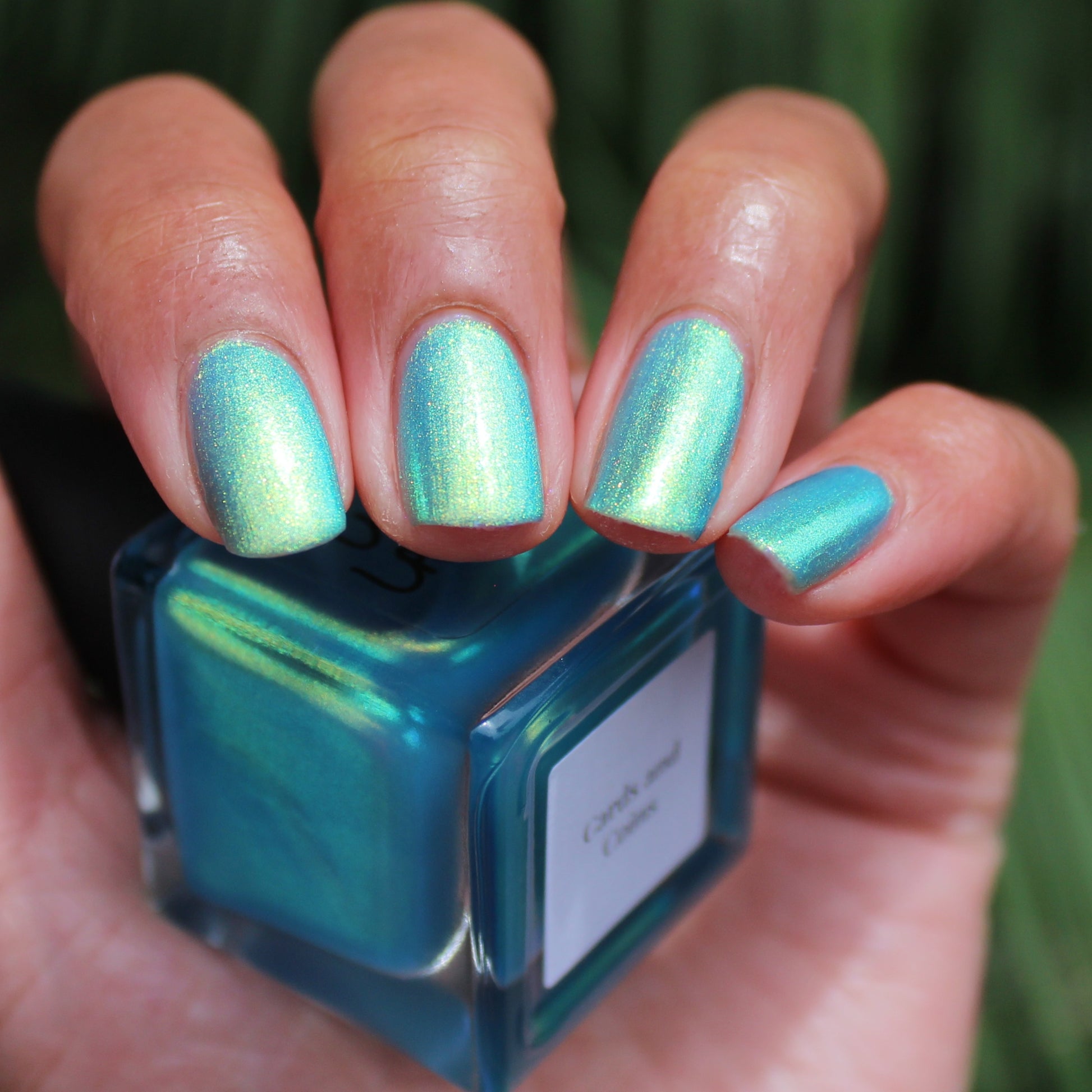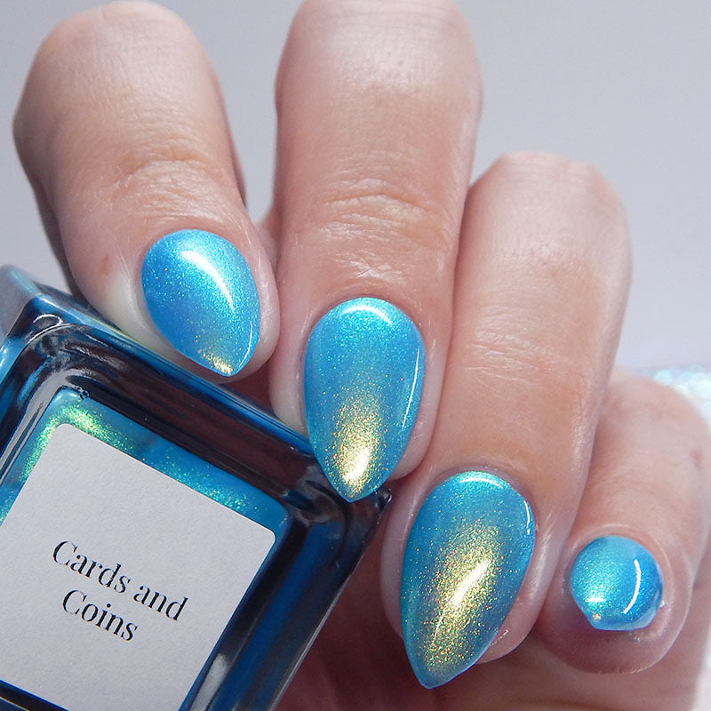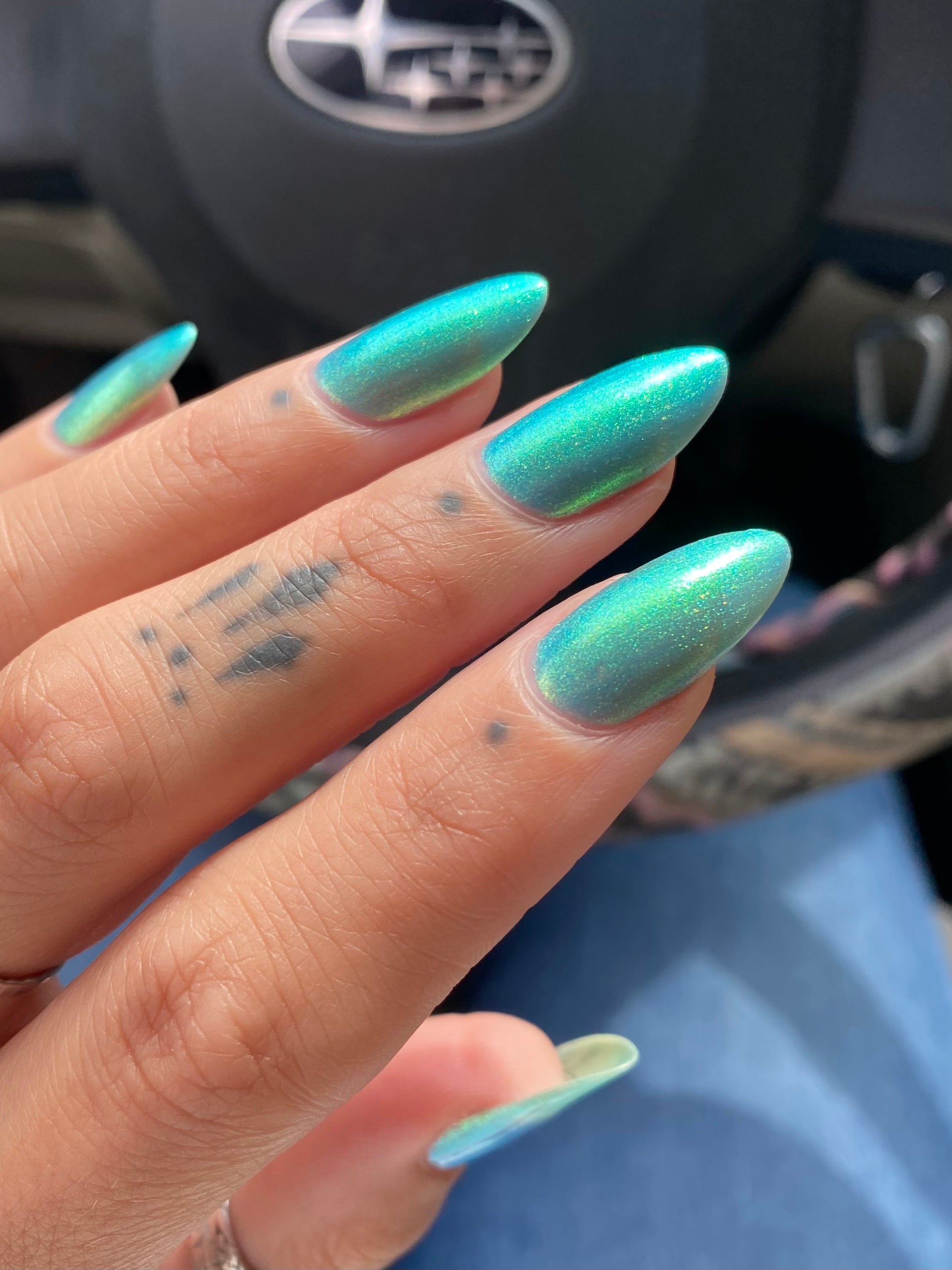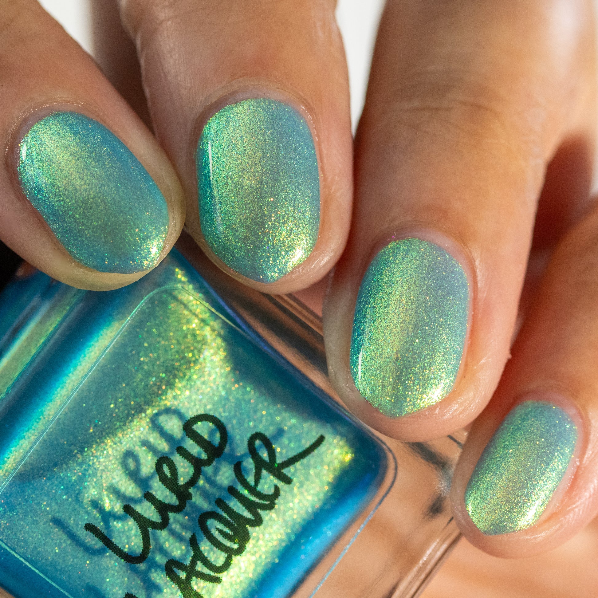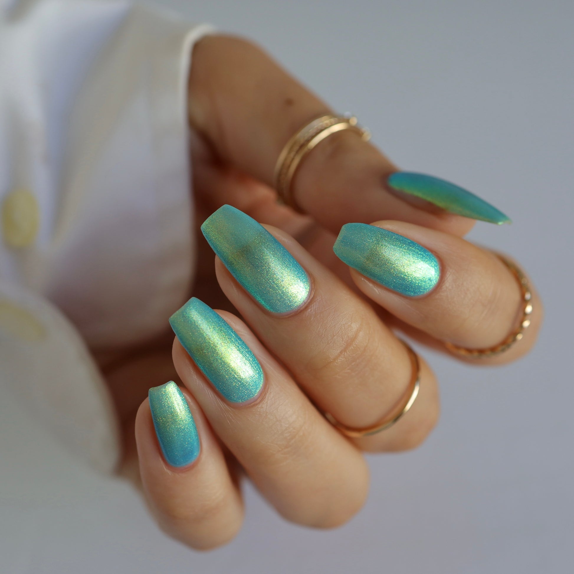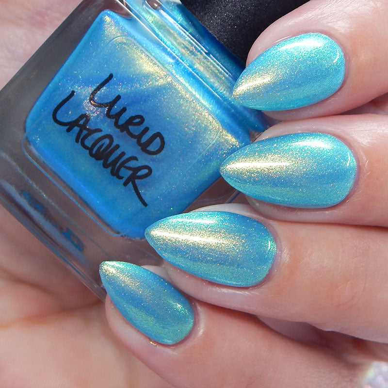 A cerulean crelly base with gold to green aurora shimmer that shifts to blue at extremes