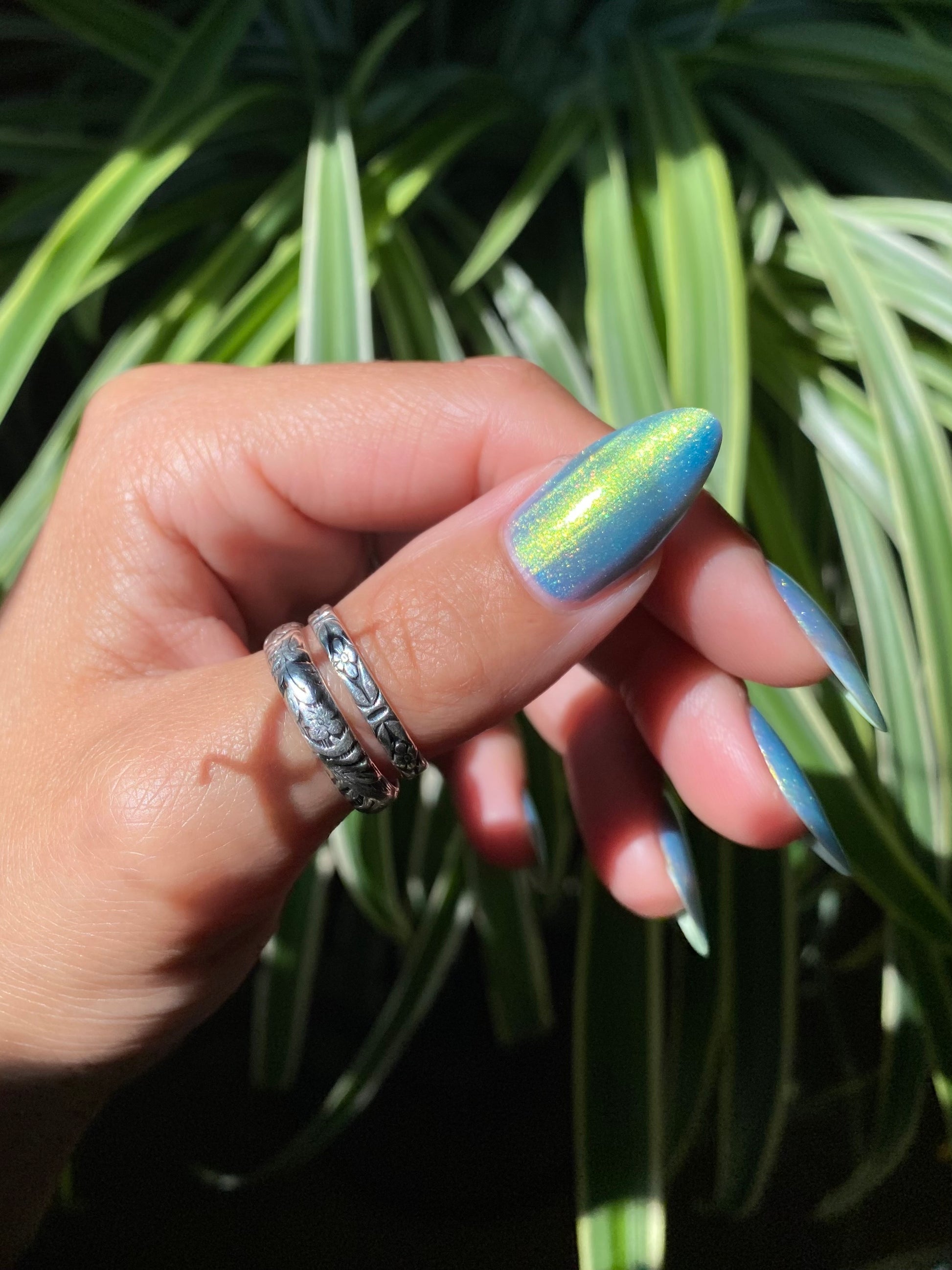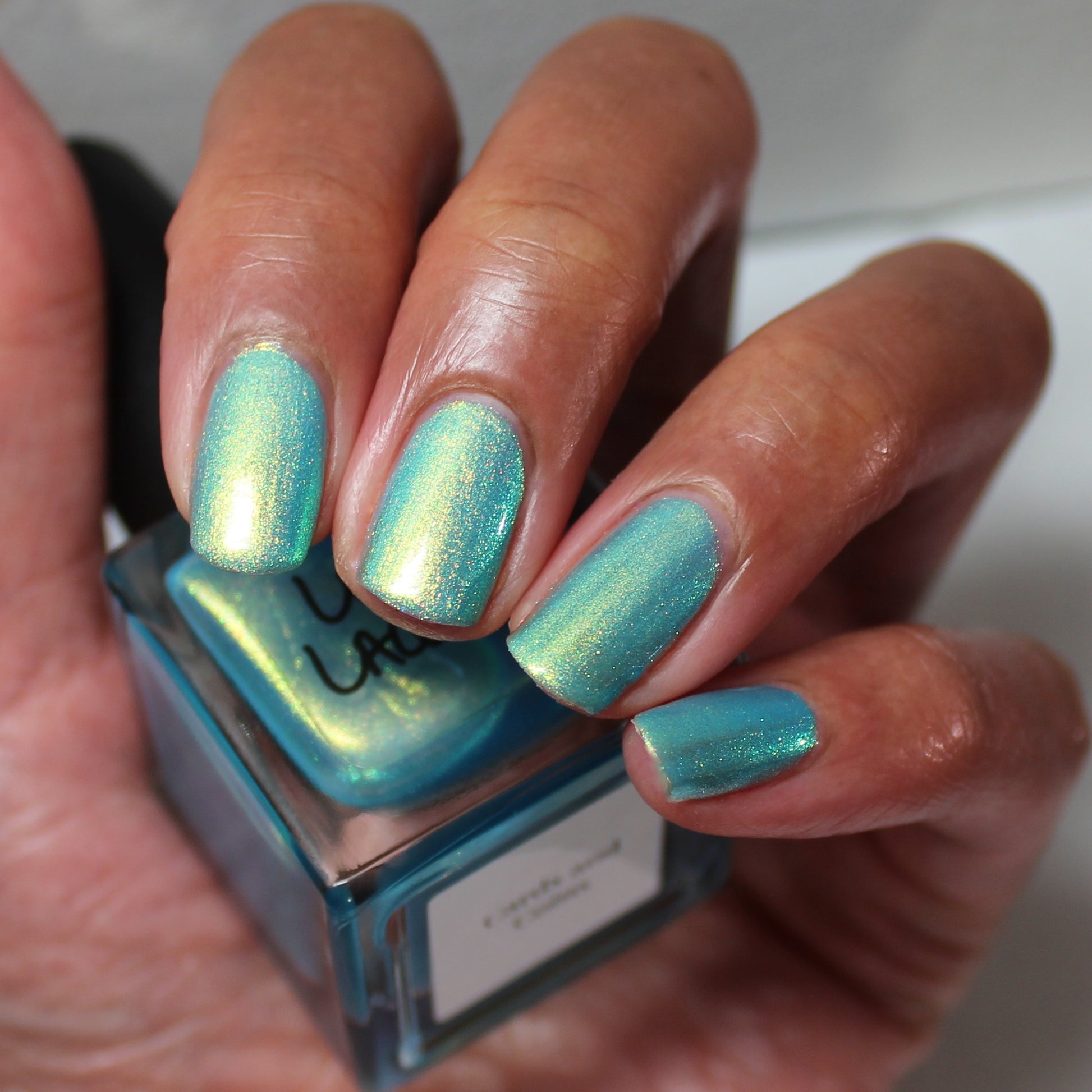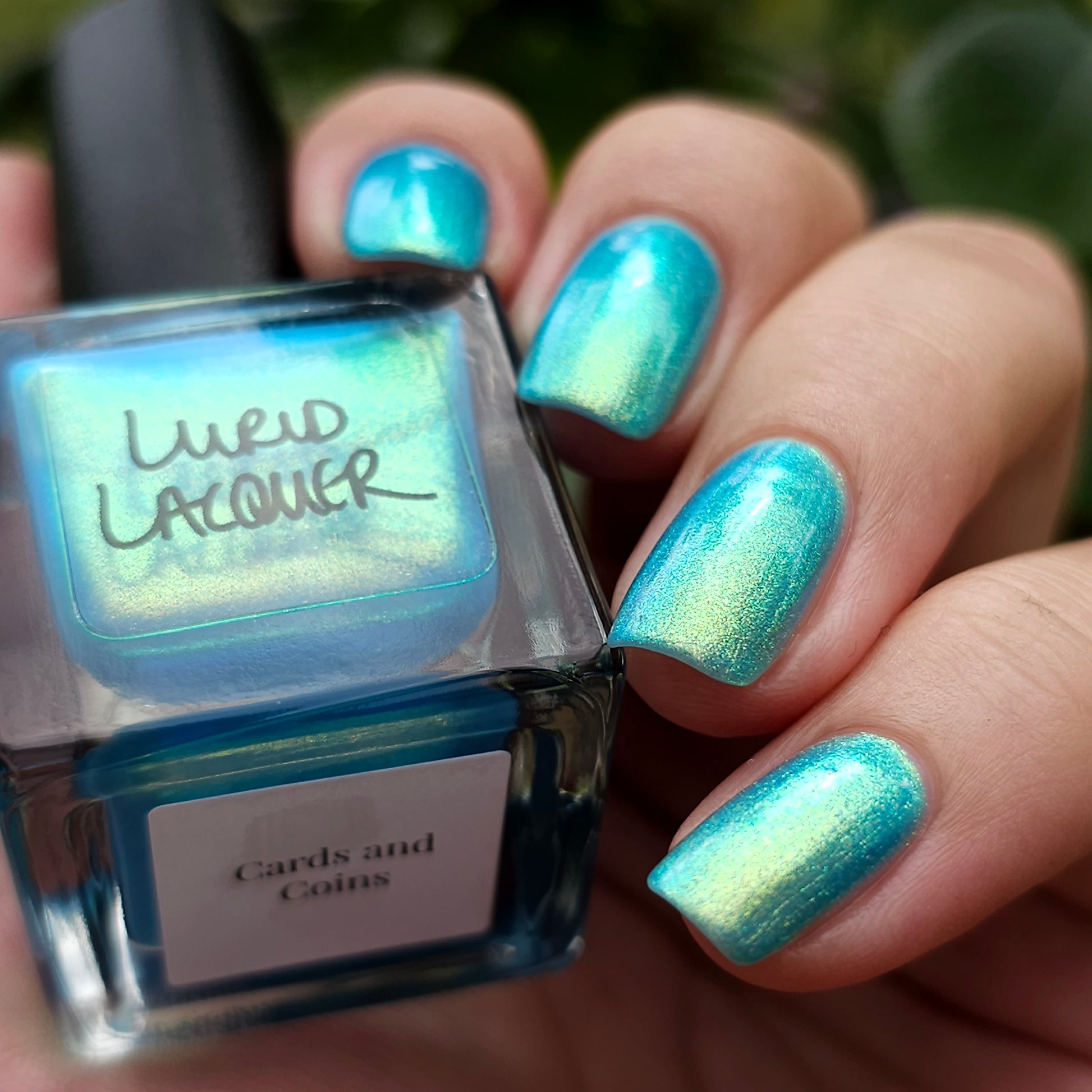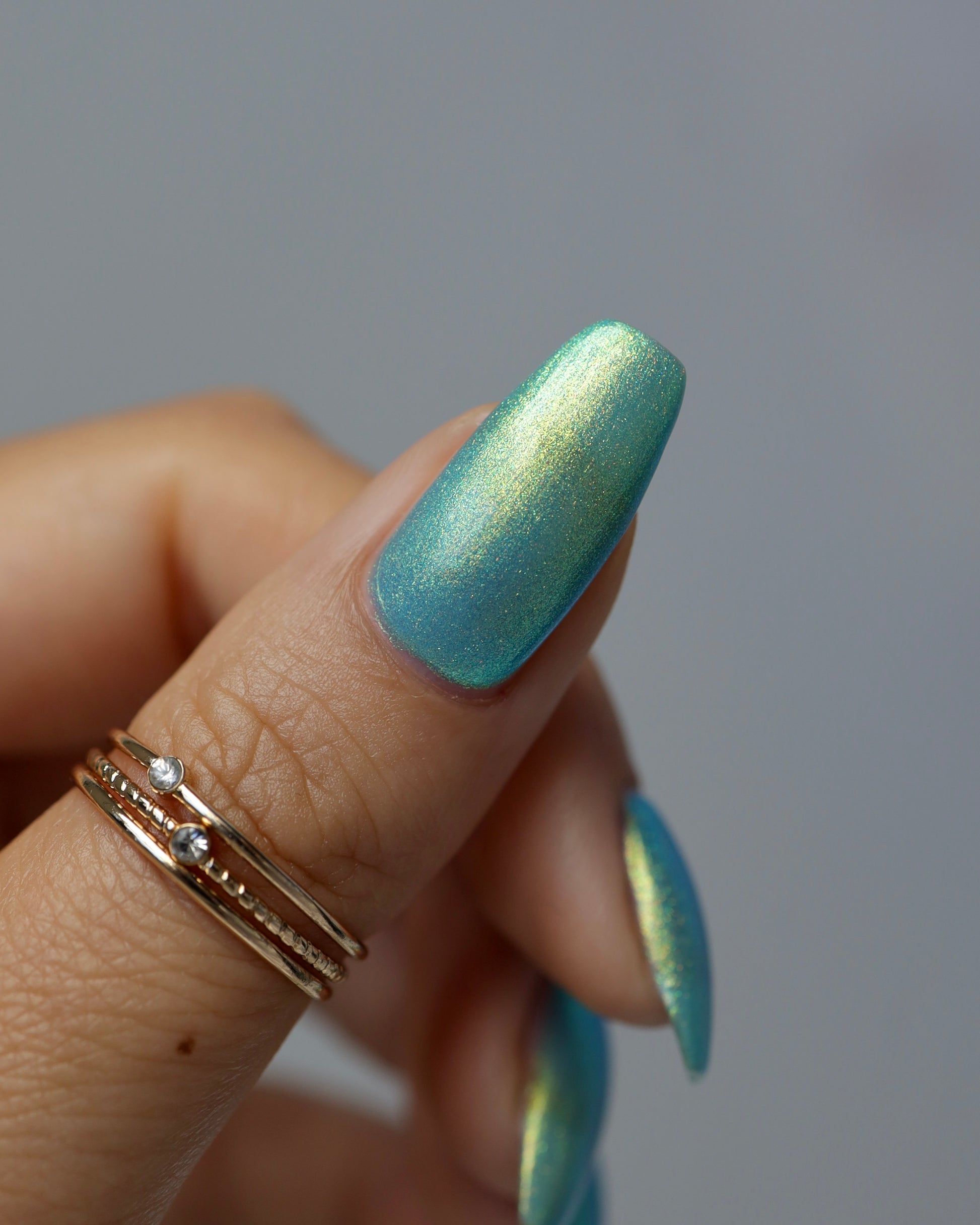 A cerulean crelly base with gold to green aurora shimmer that shifts to blue at extremes