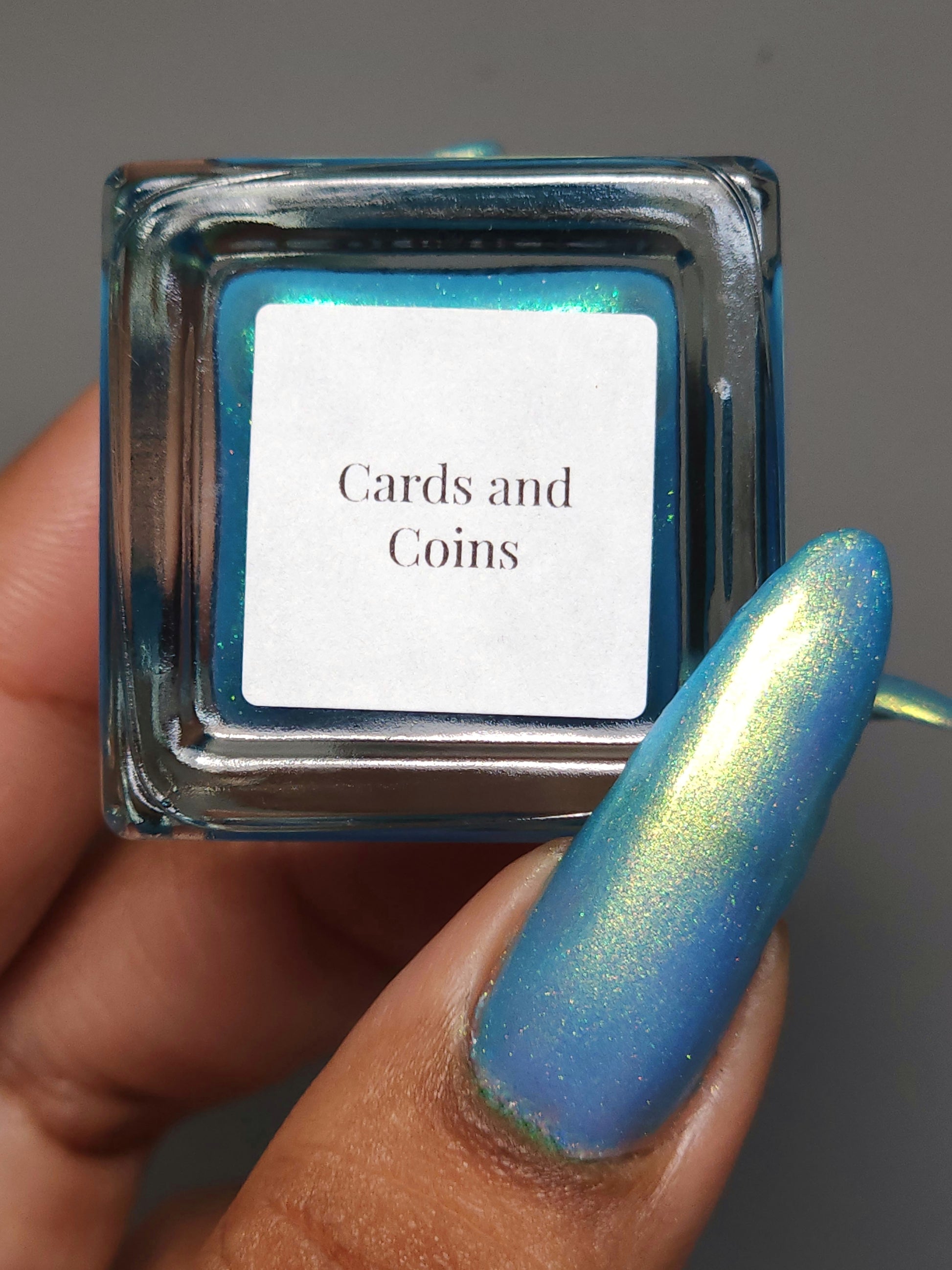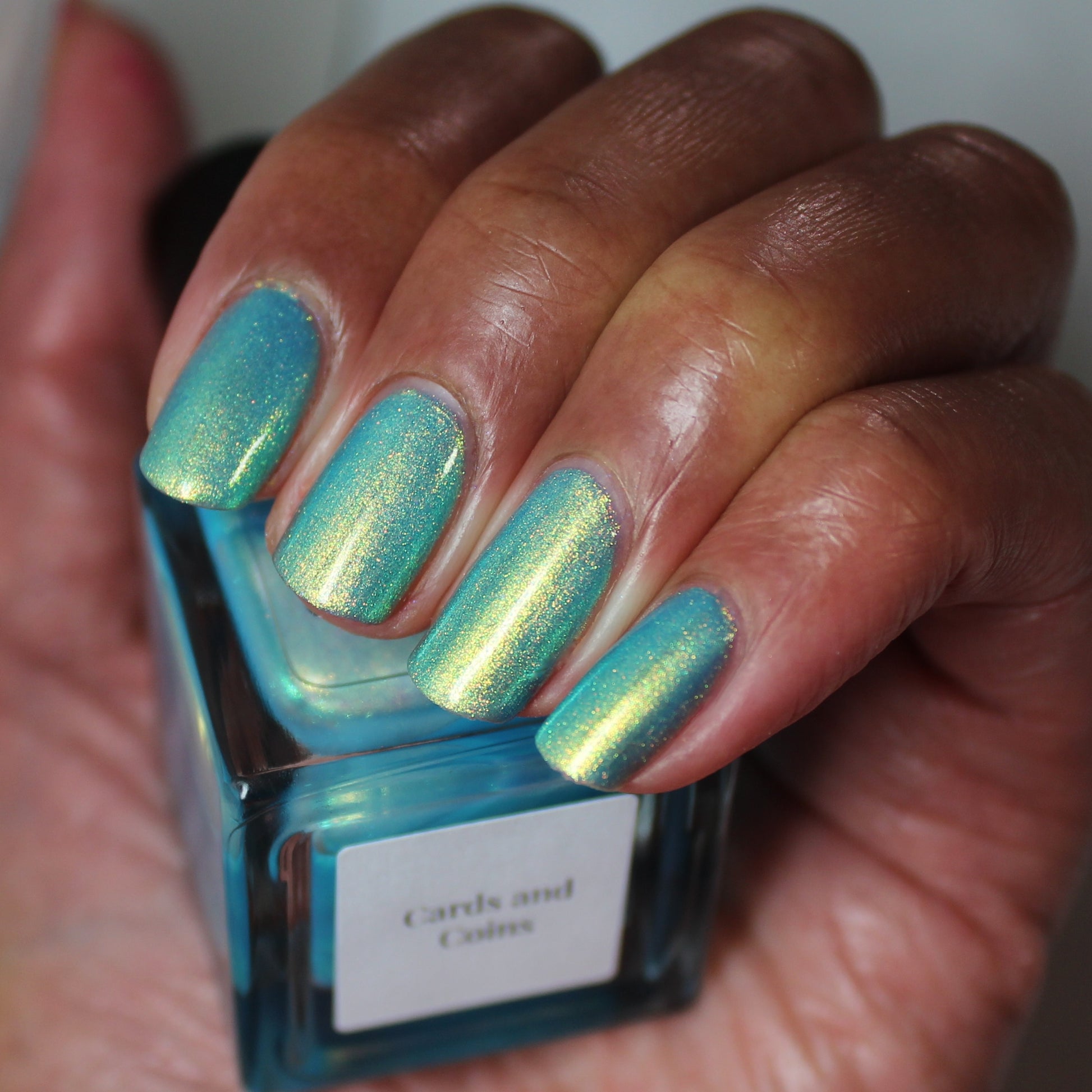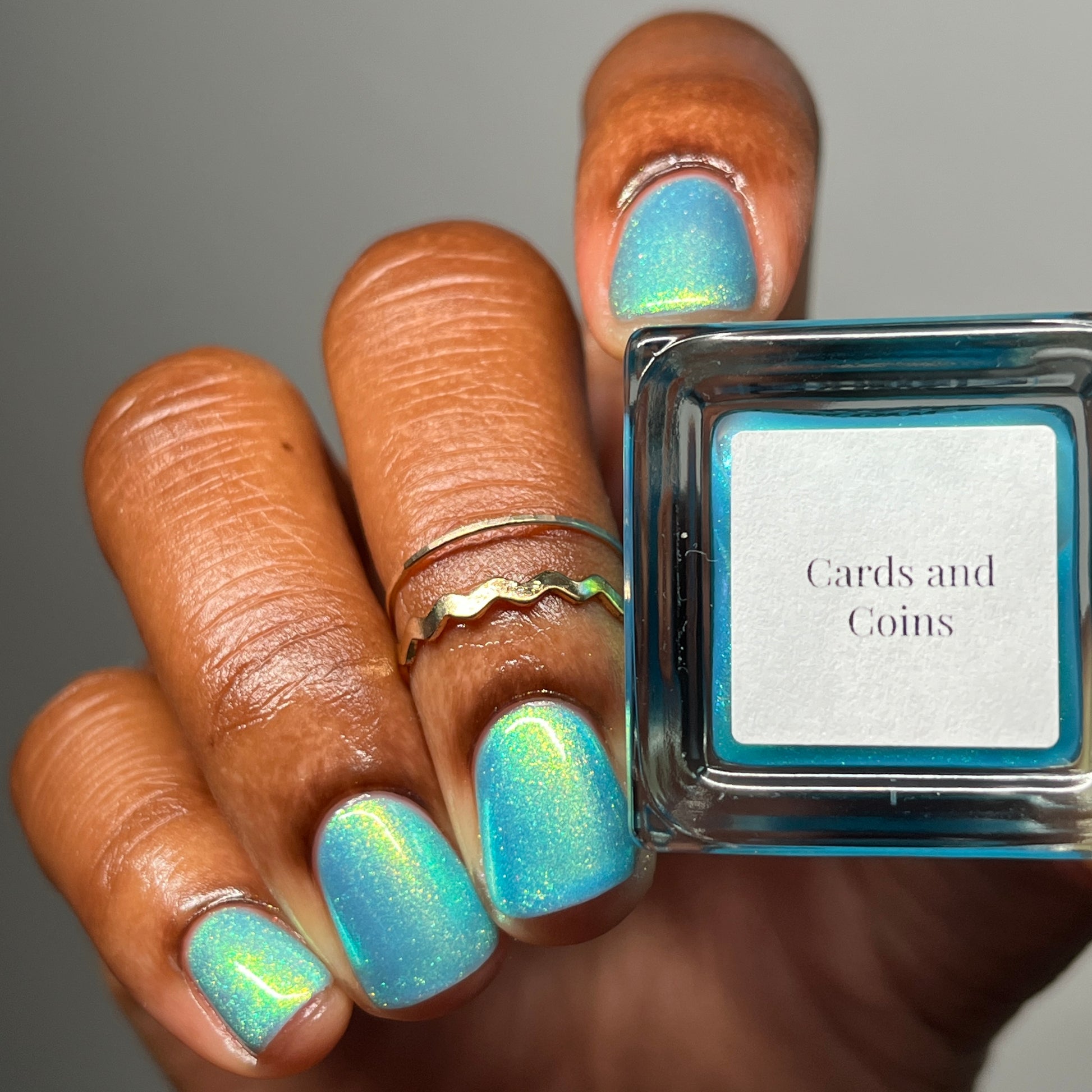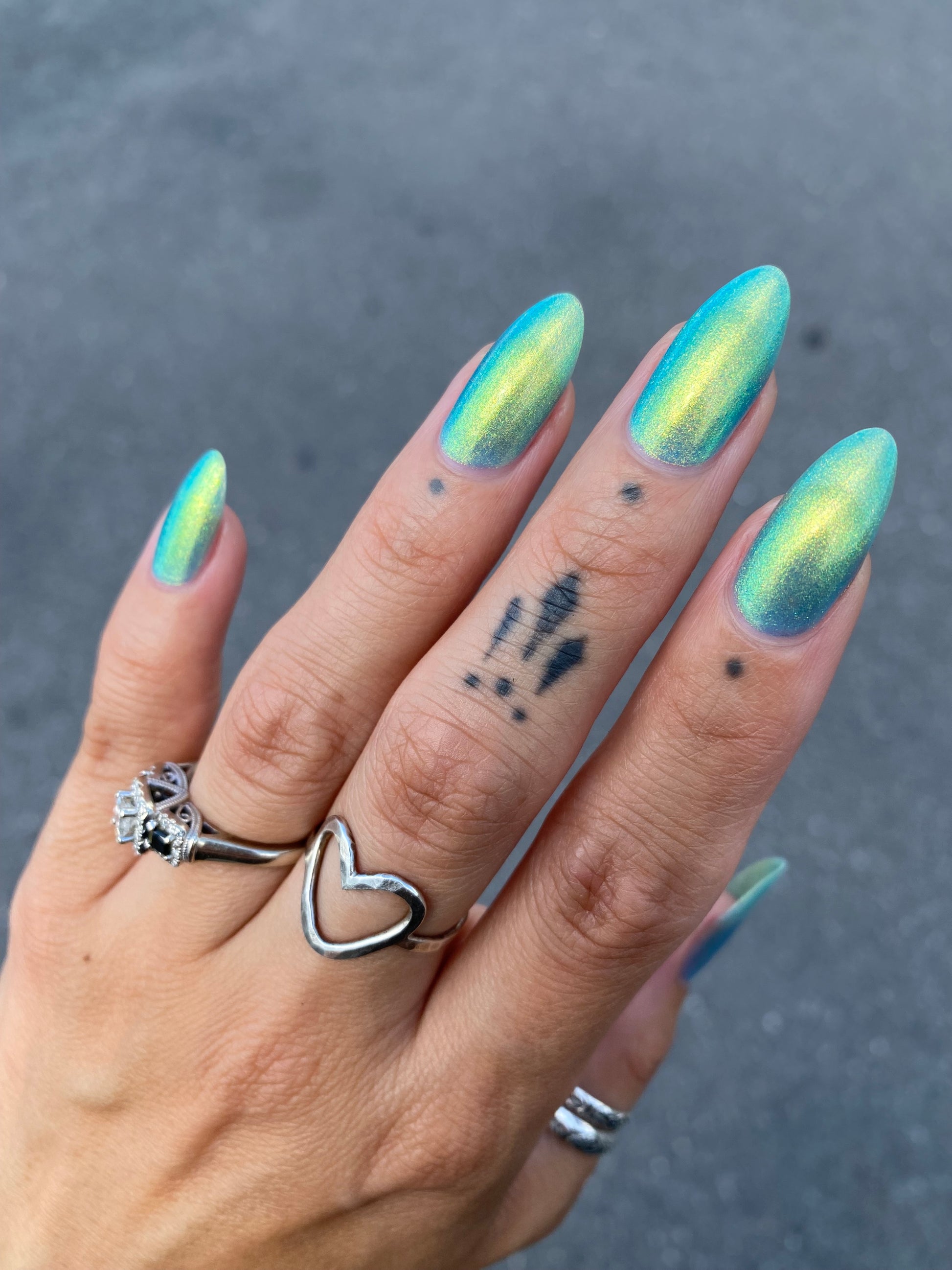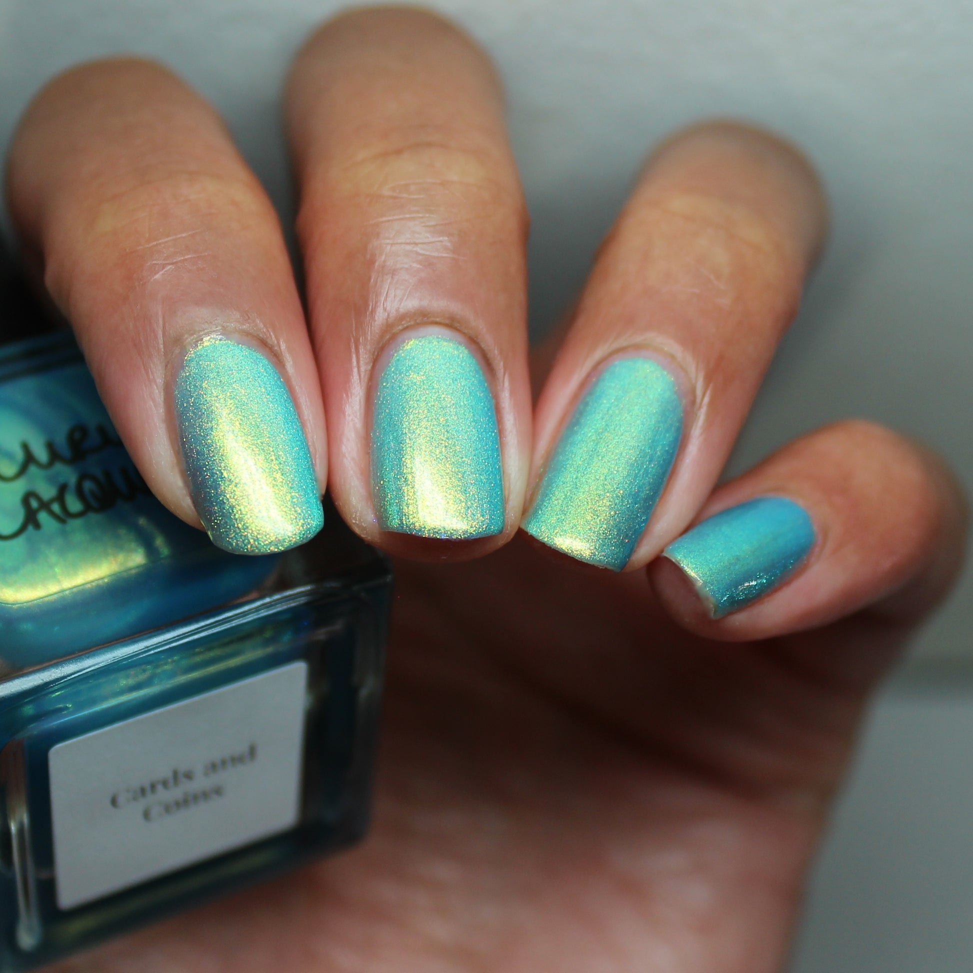 A cerulean crelly base with gold to green aurora shimmer that shifts to blue at extremes