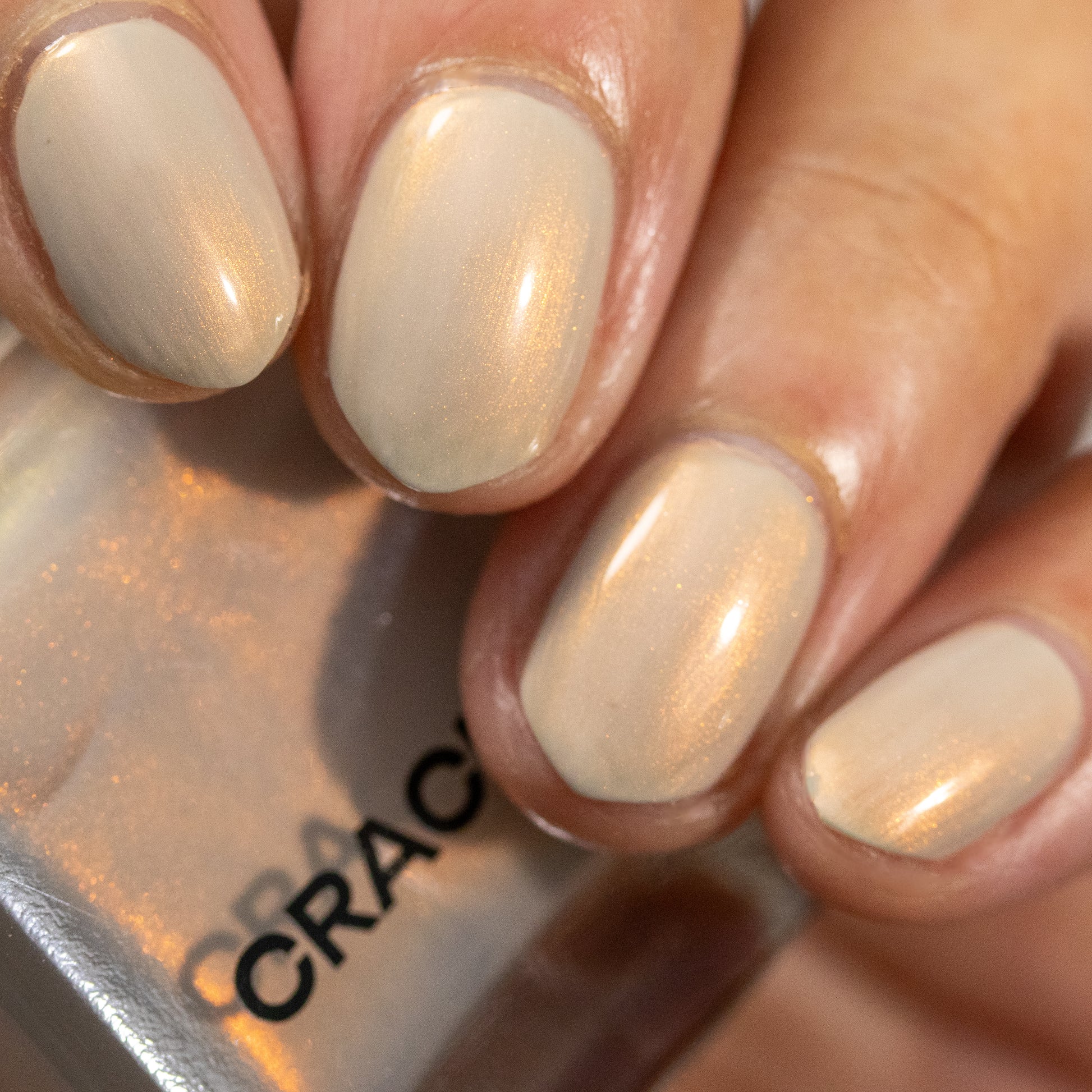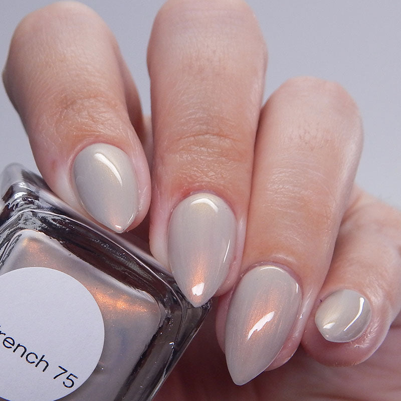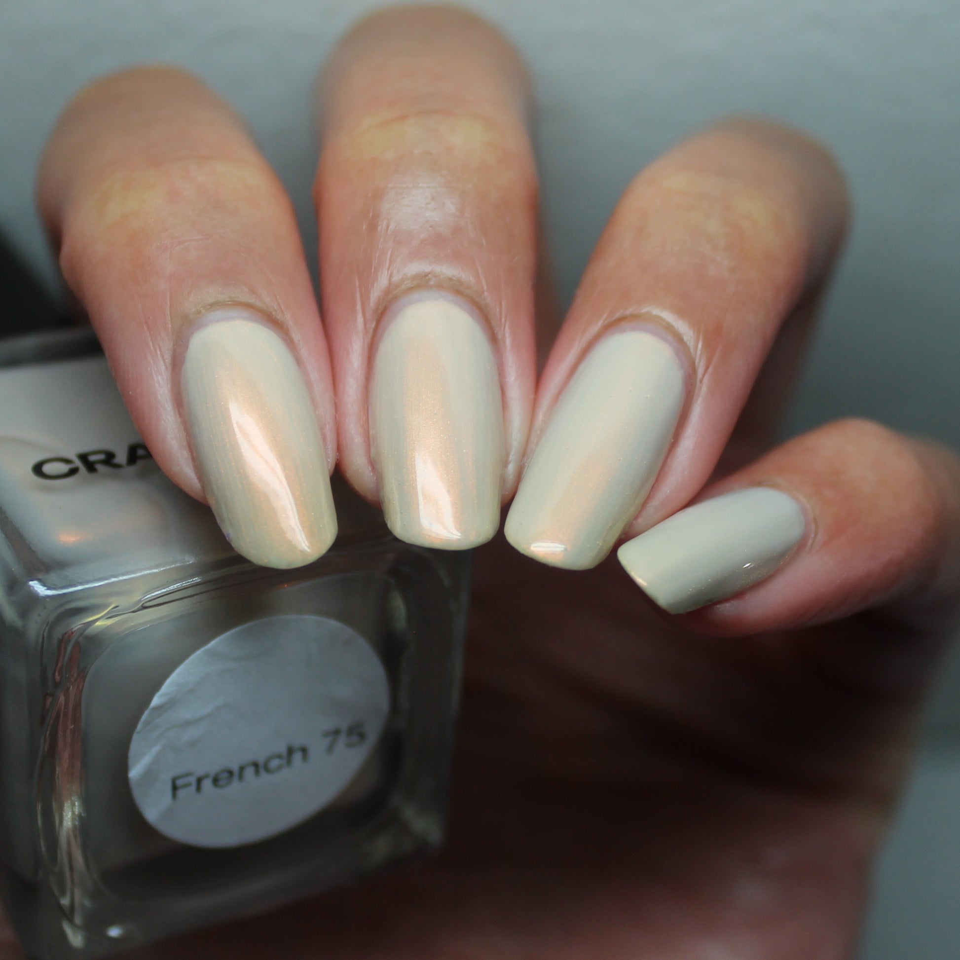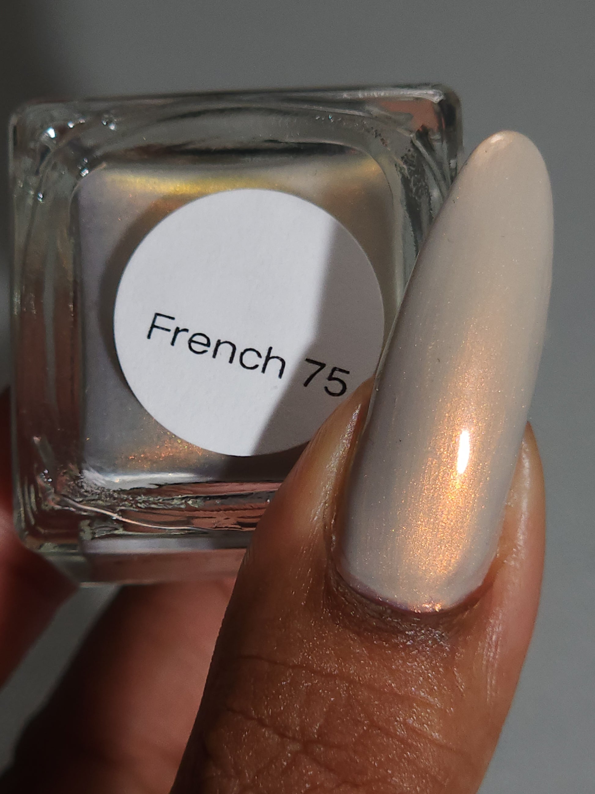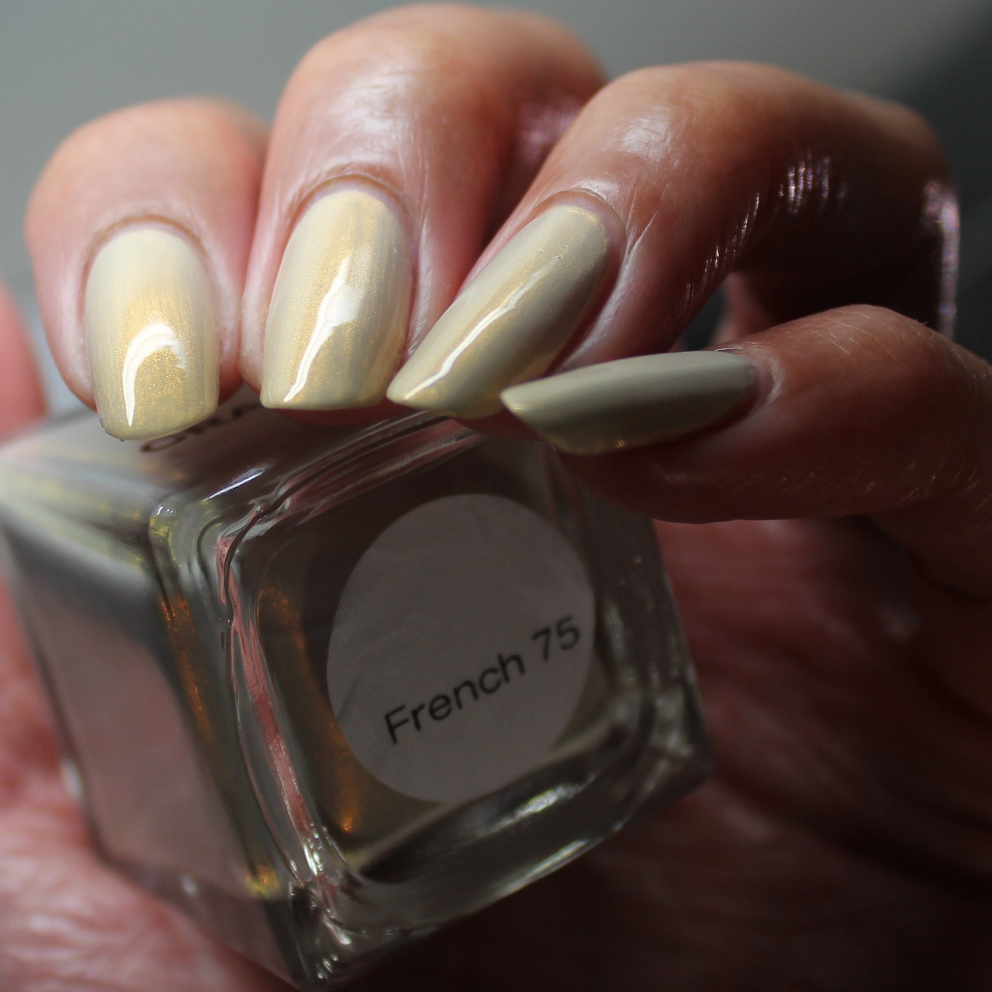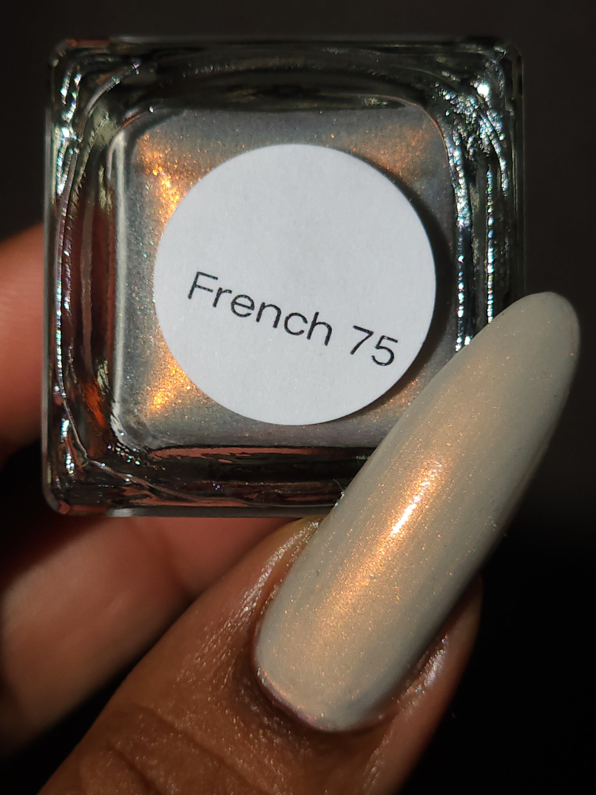 - French 75 (Cracked Polish): a gorgeous gray base with orange and gold shimmers.