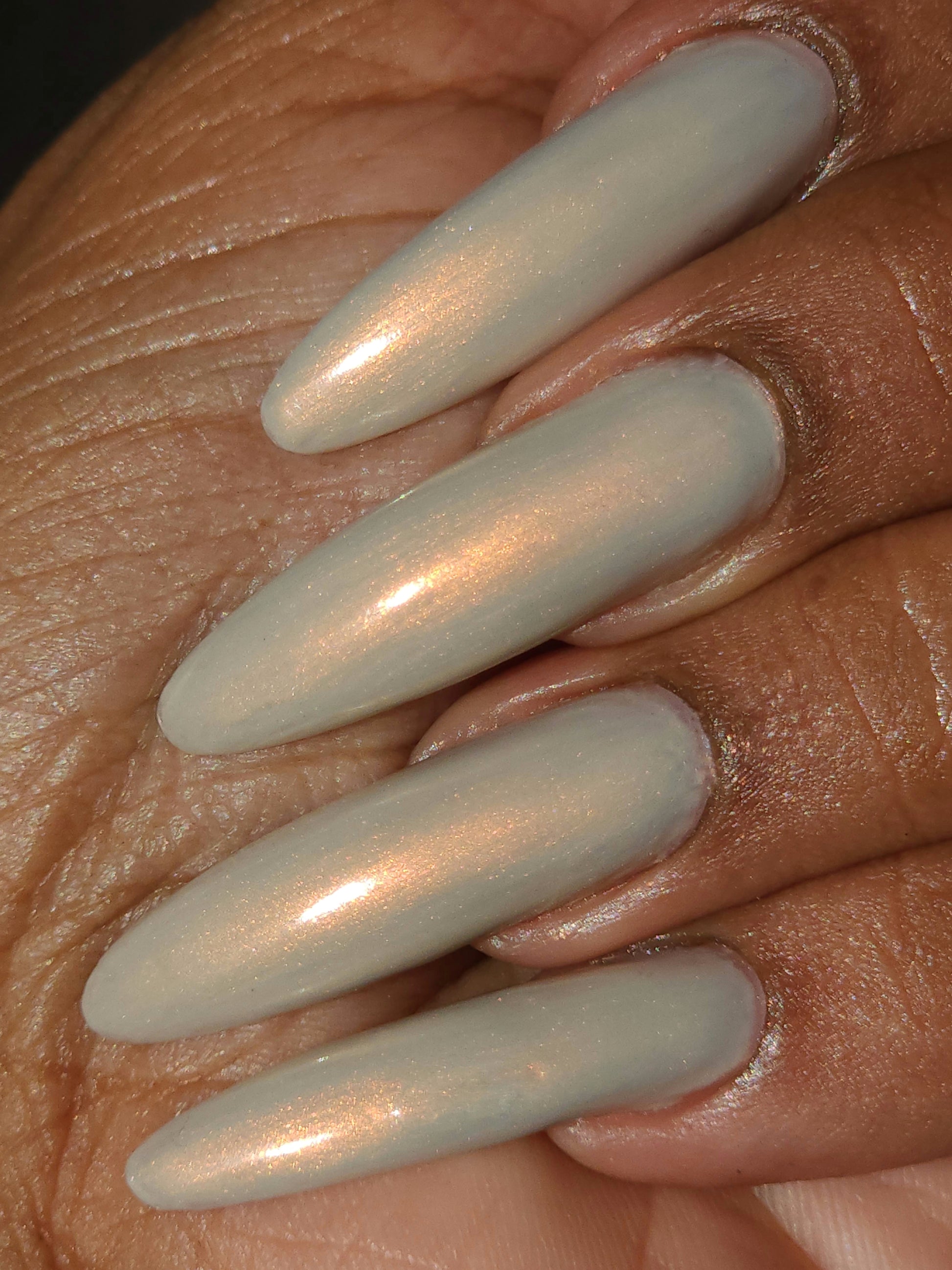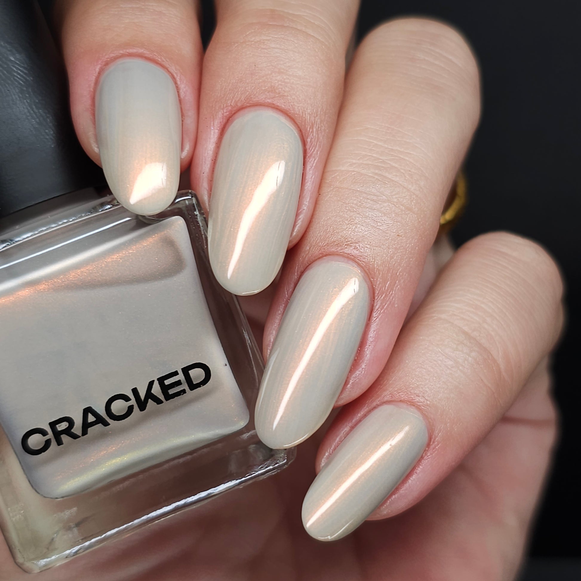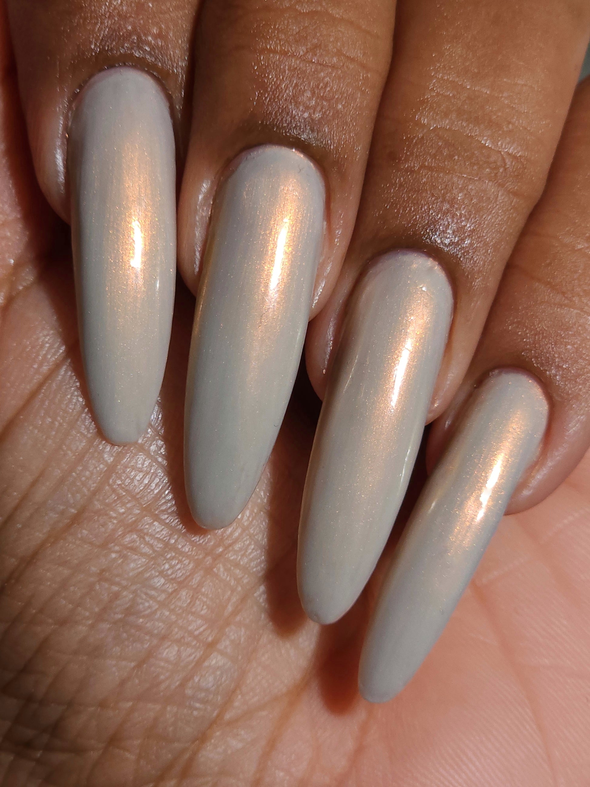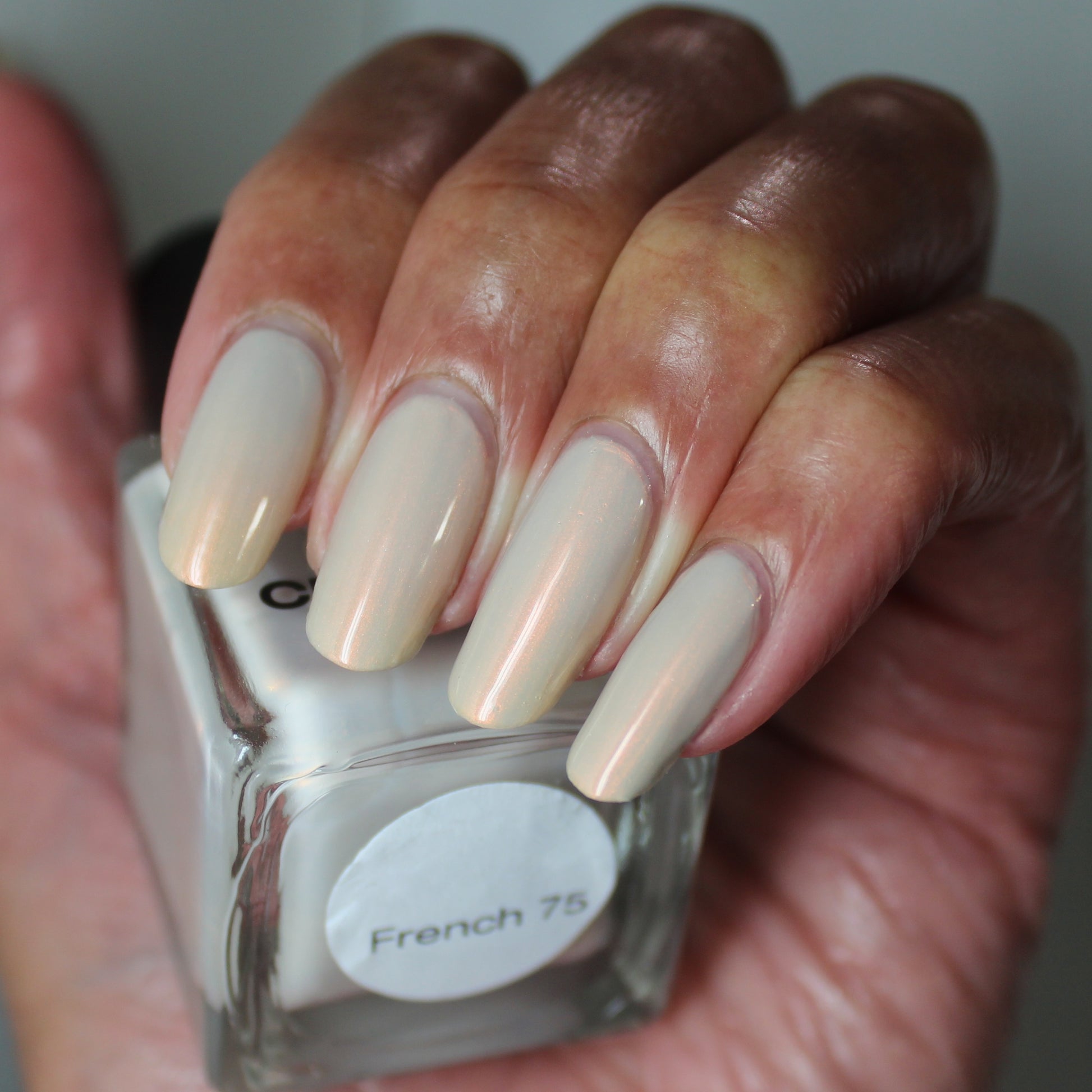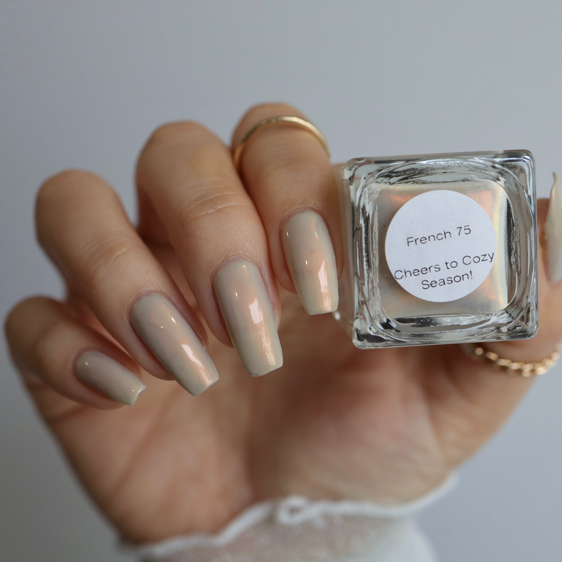 - French 75 (Cracked Polish): a gorgeous gray base with orange and gold shimmers.