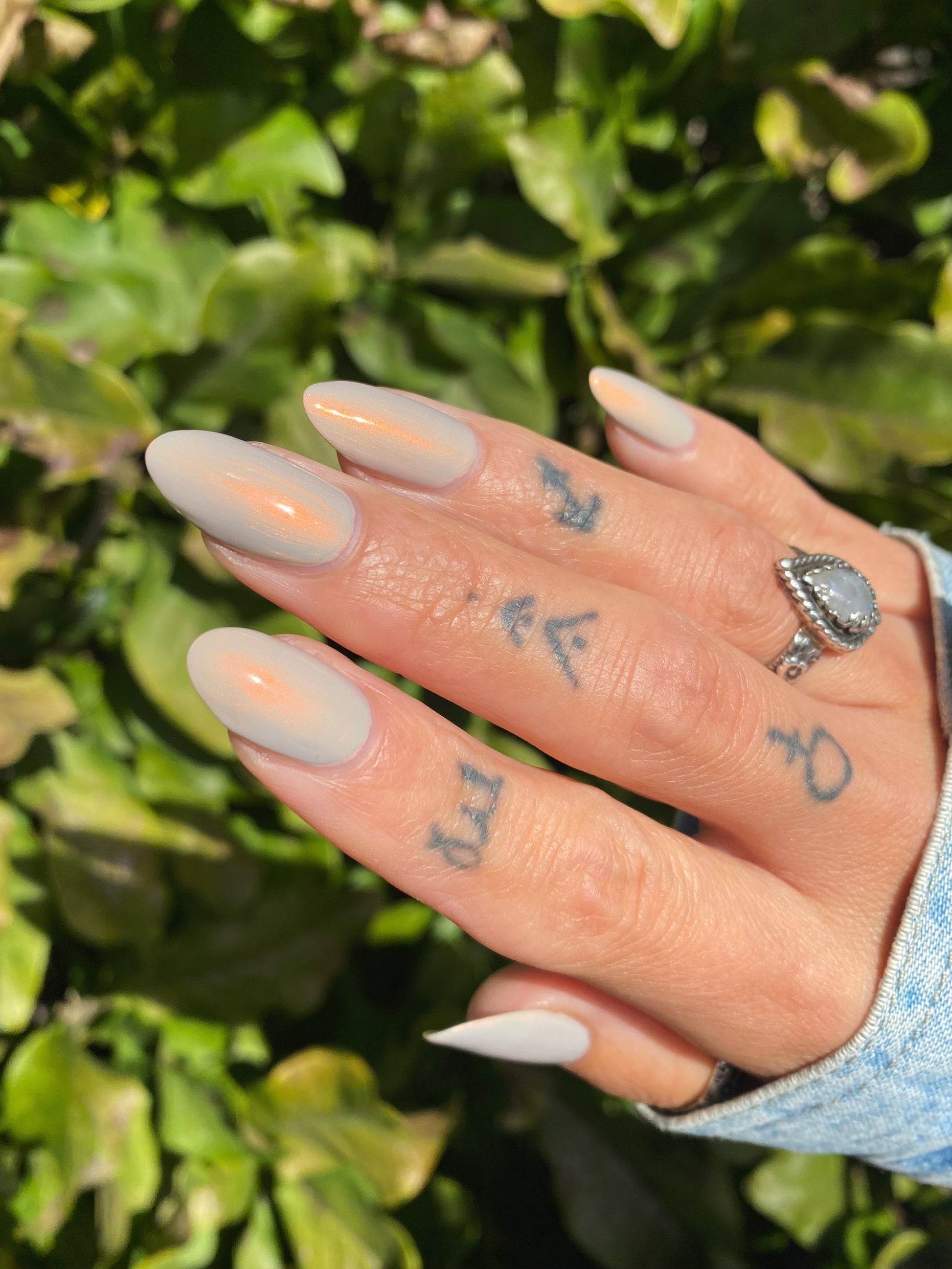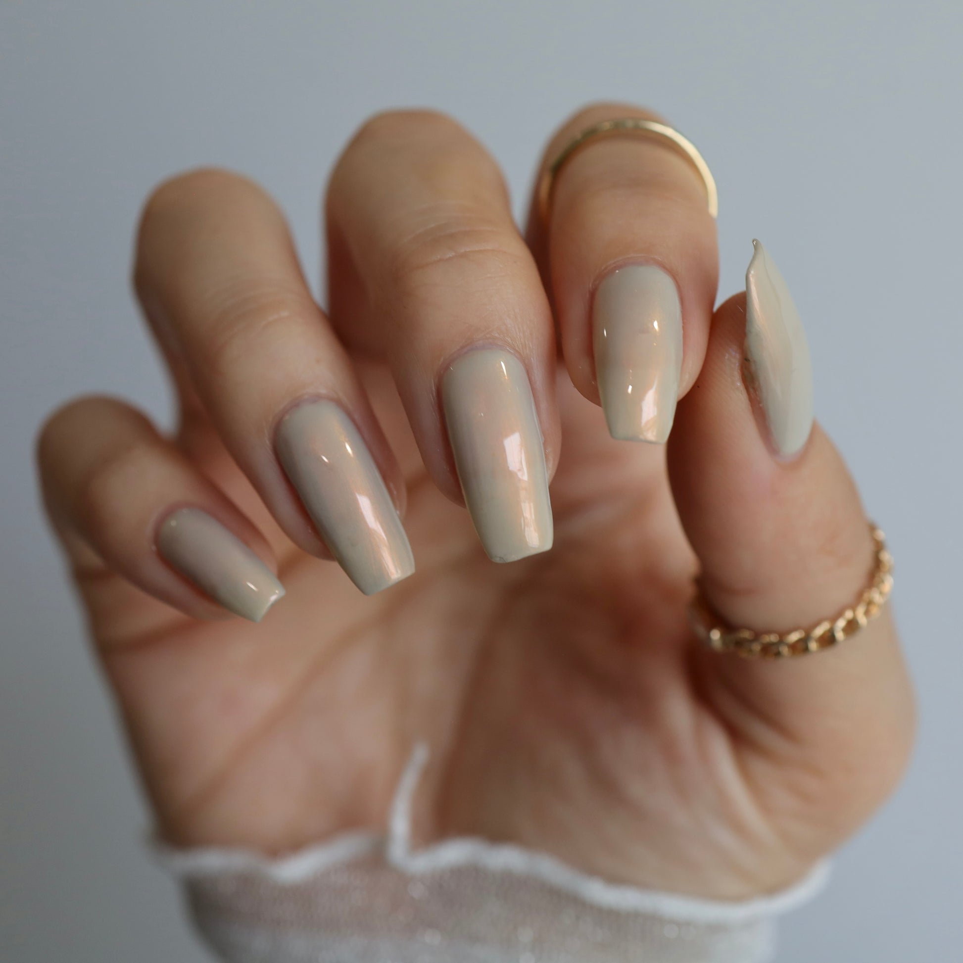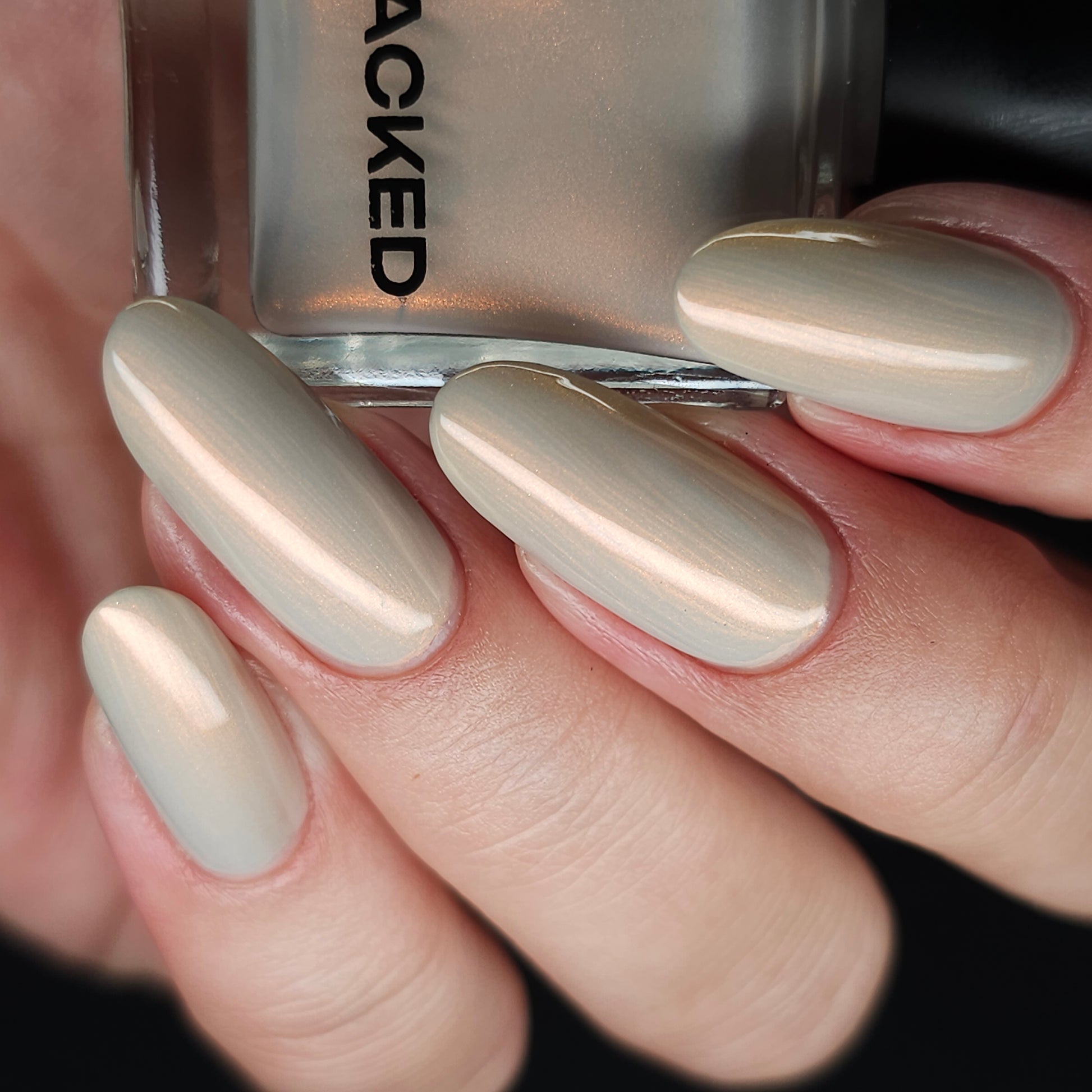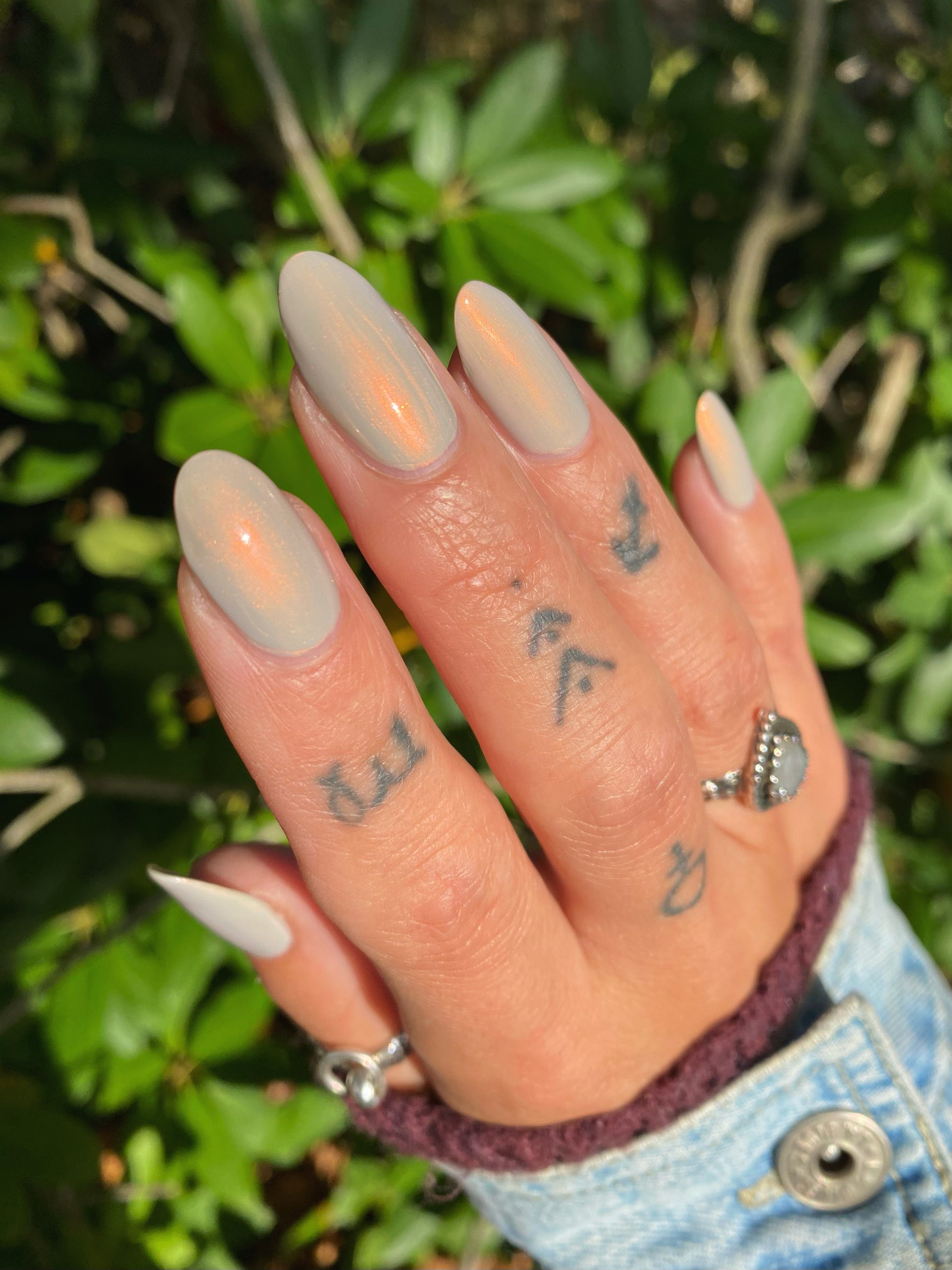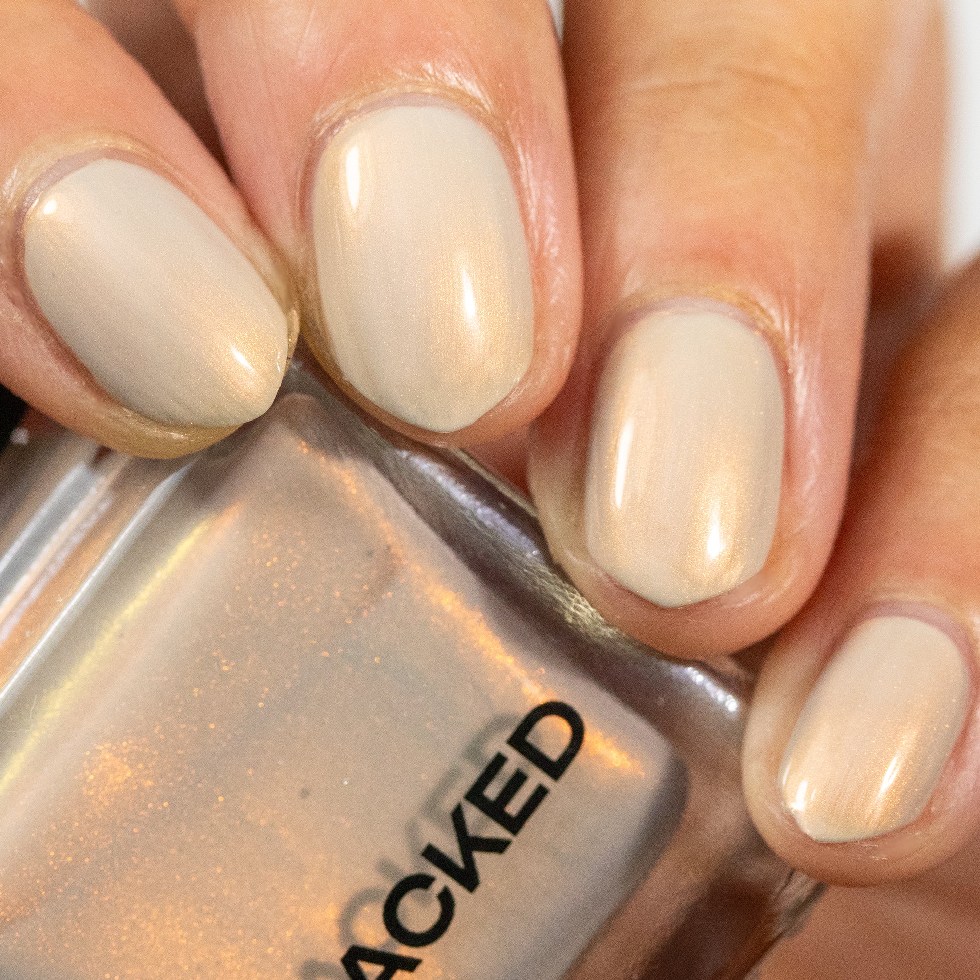 - French 75 (Cracked Polish): a gorgeous gray base with orange and gold shimmers.