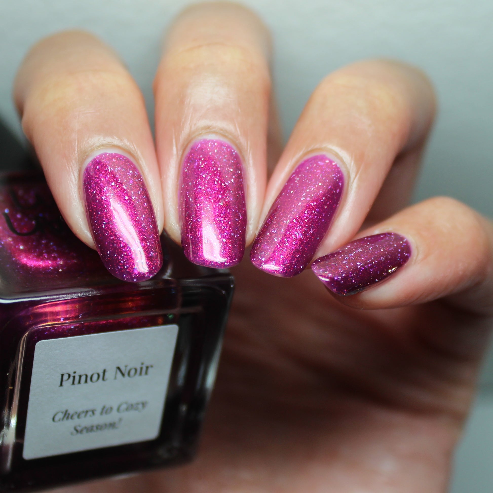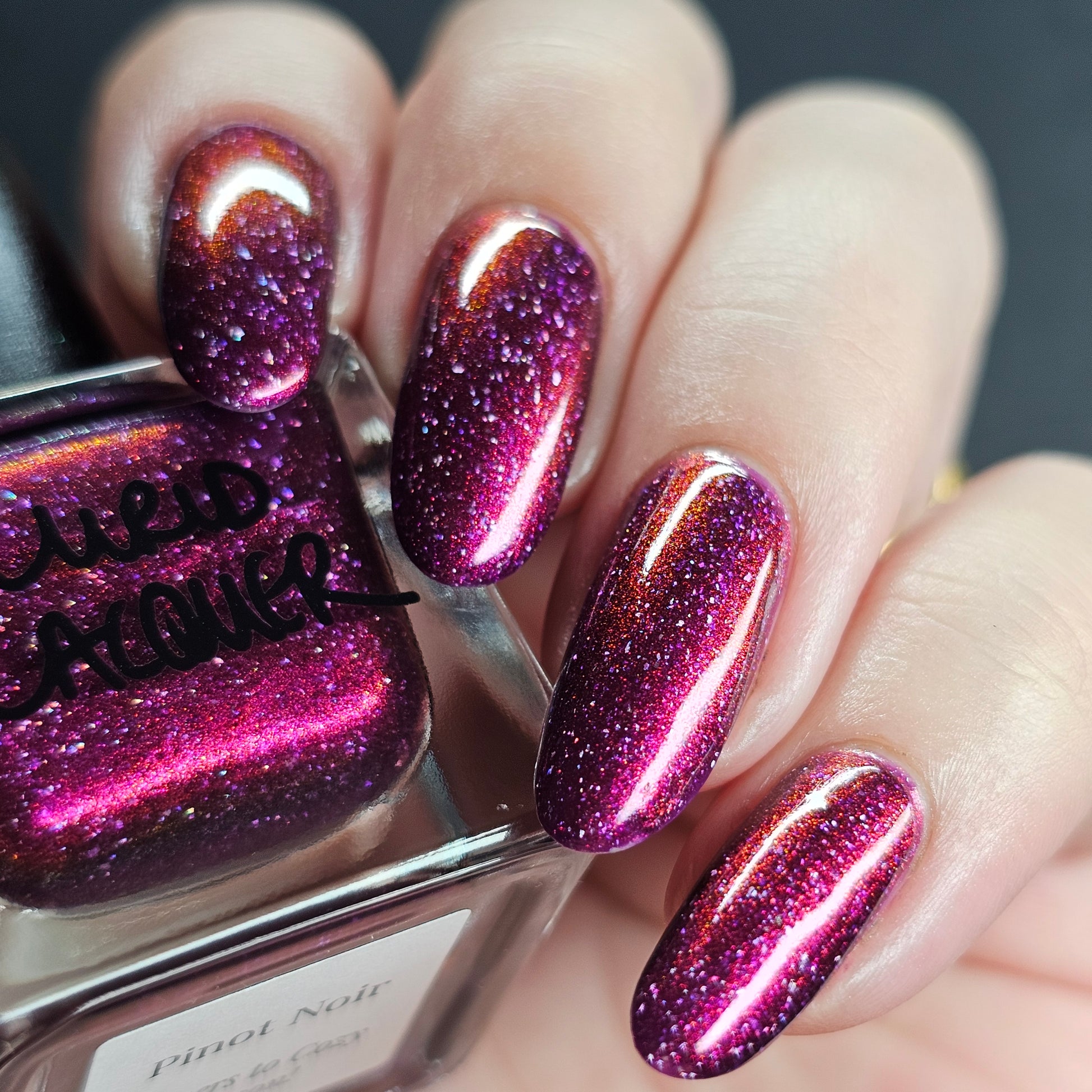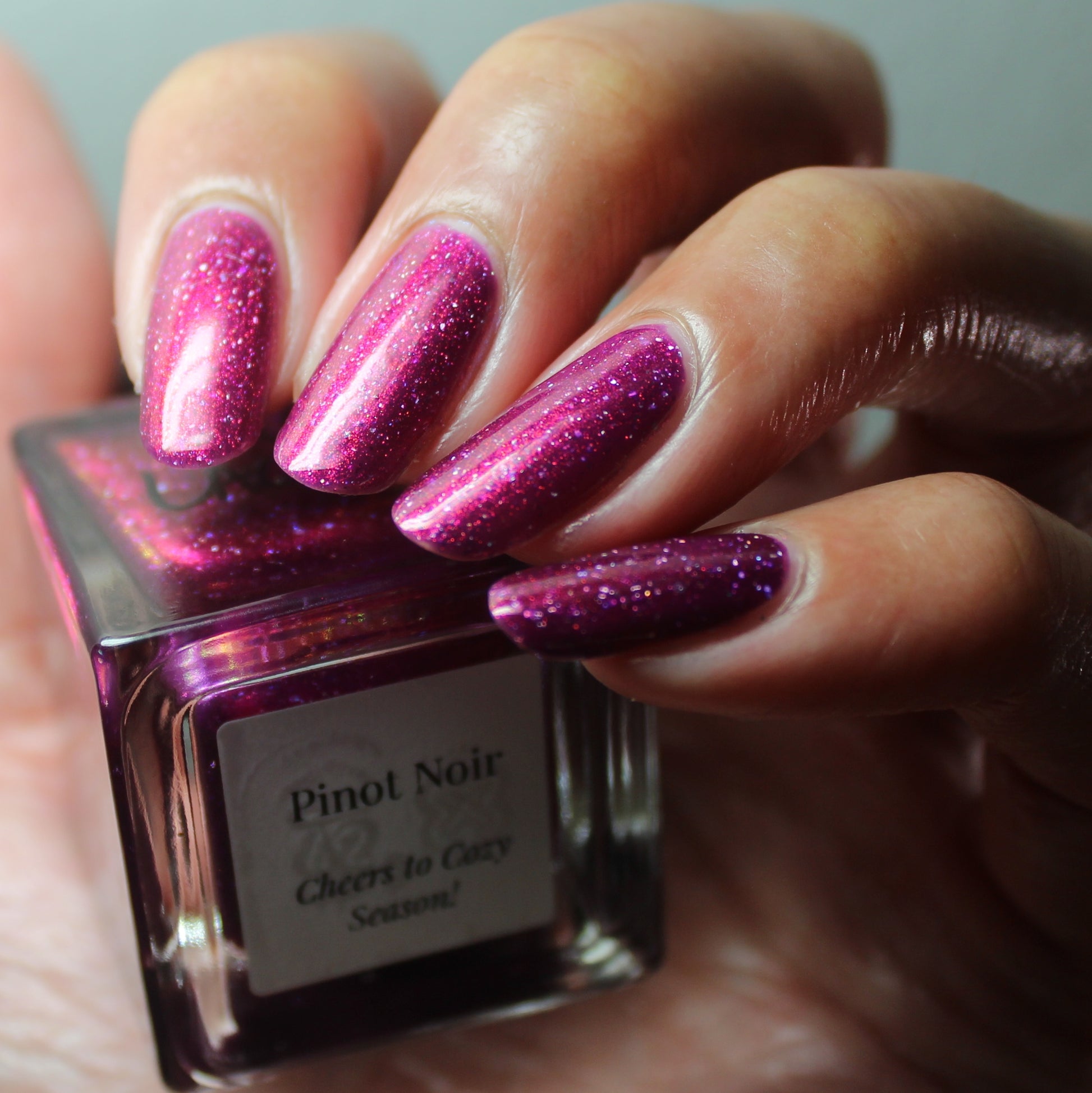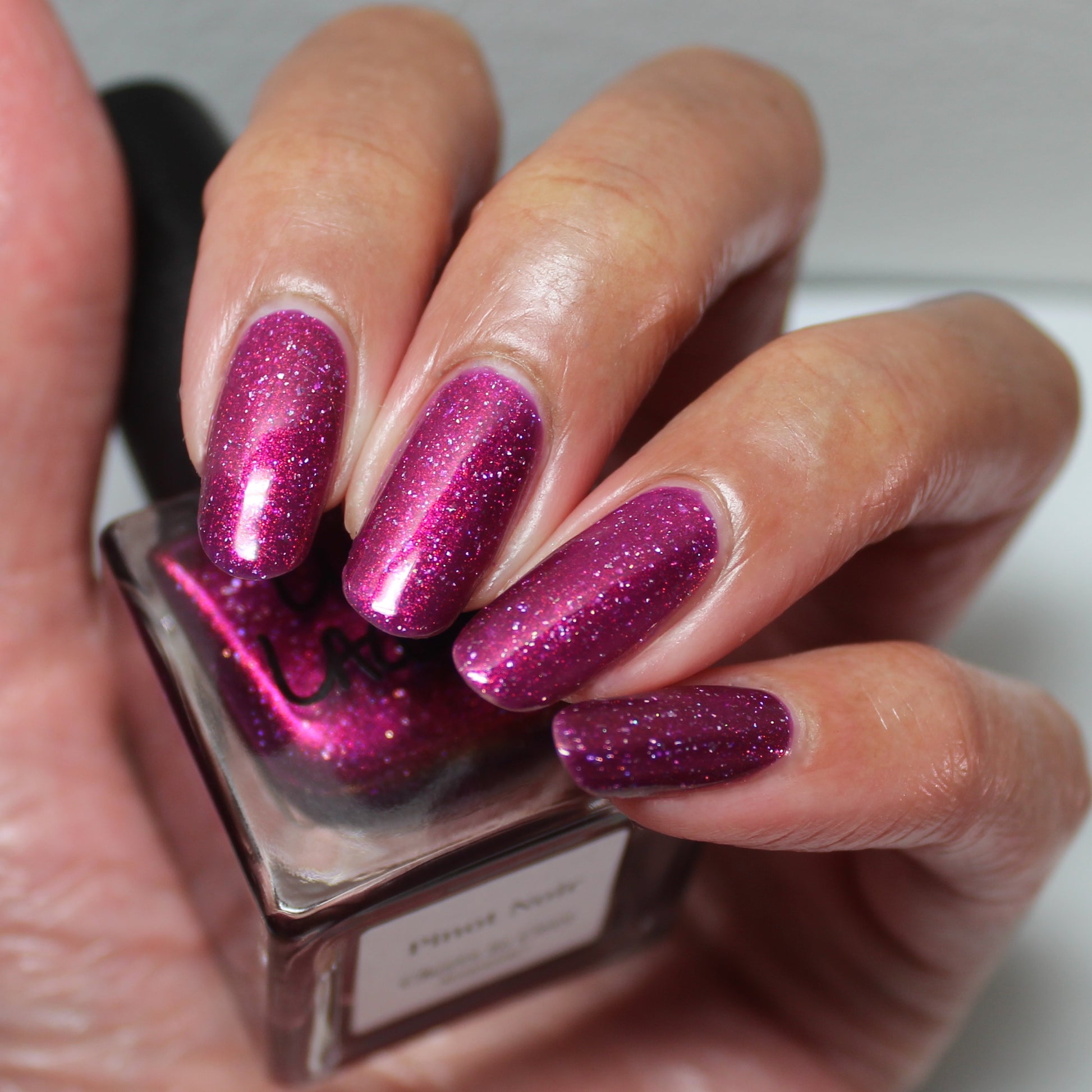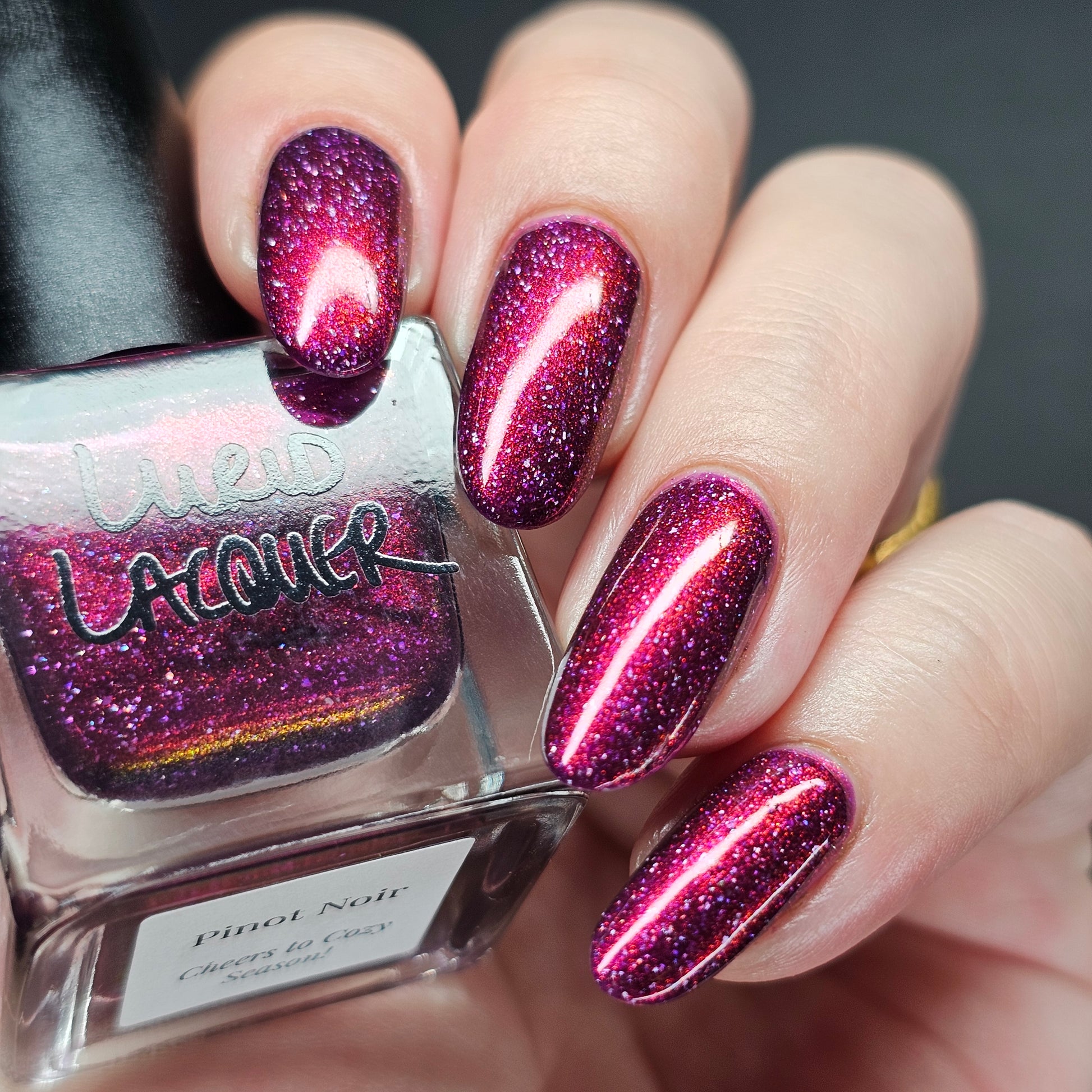 - Pinot Noir (Lurid Lacquer): a reddish plum purple base with red to orange aurora shimmer and micro holographic flakes.