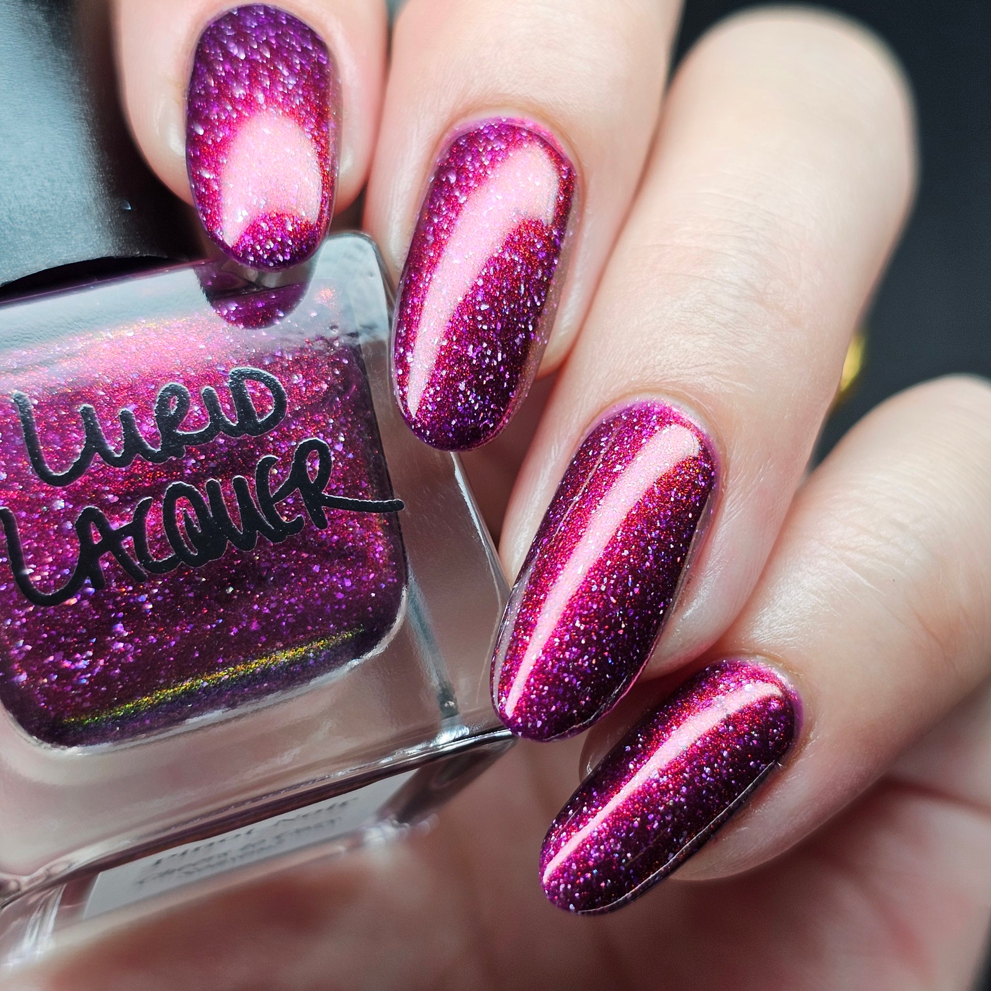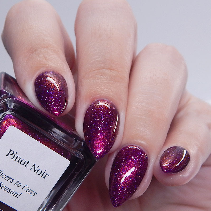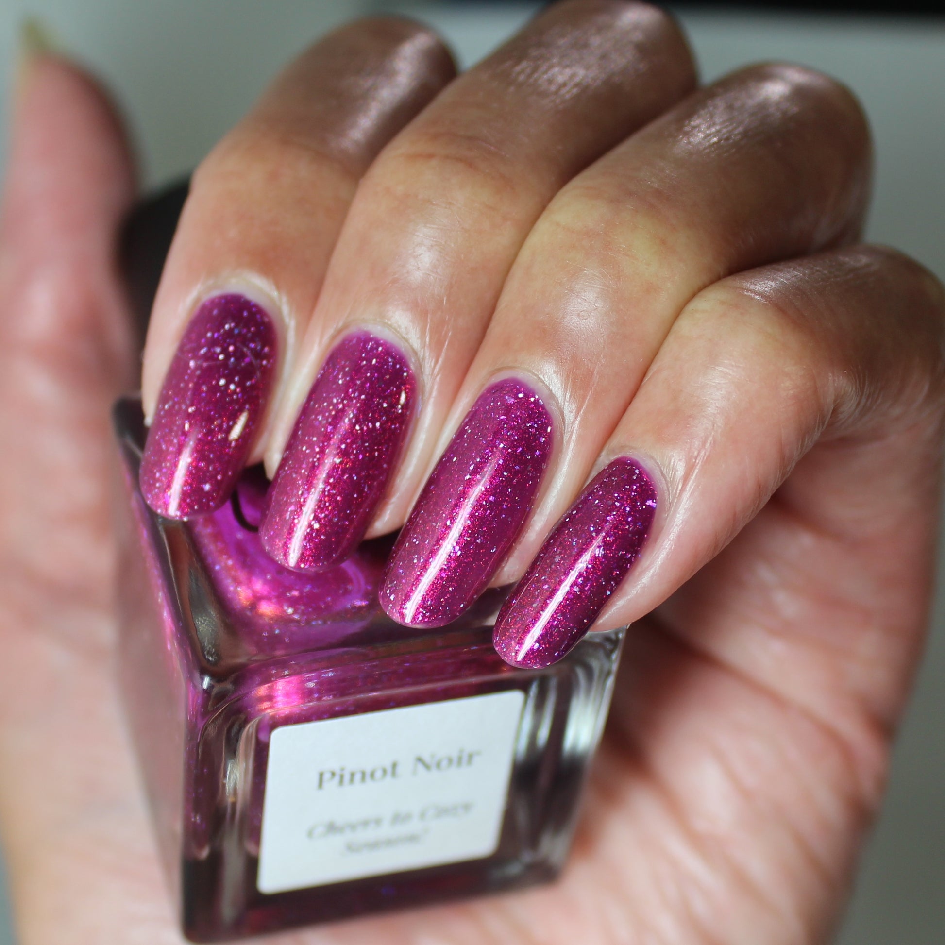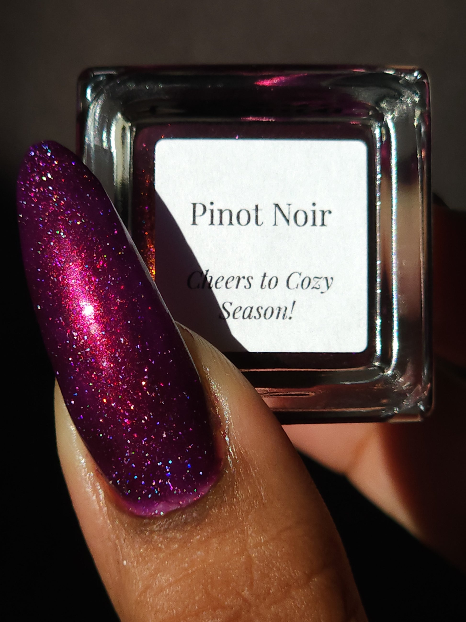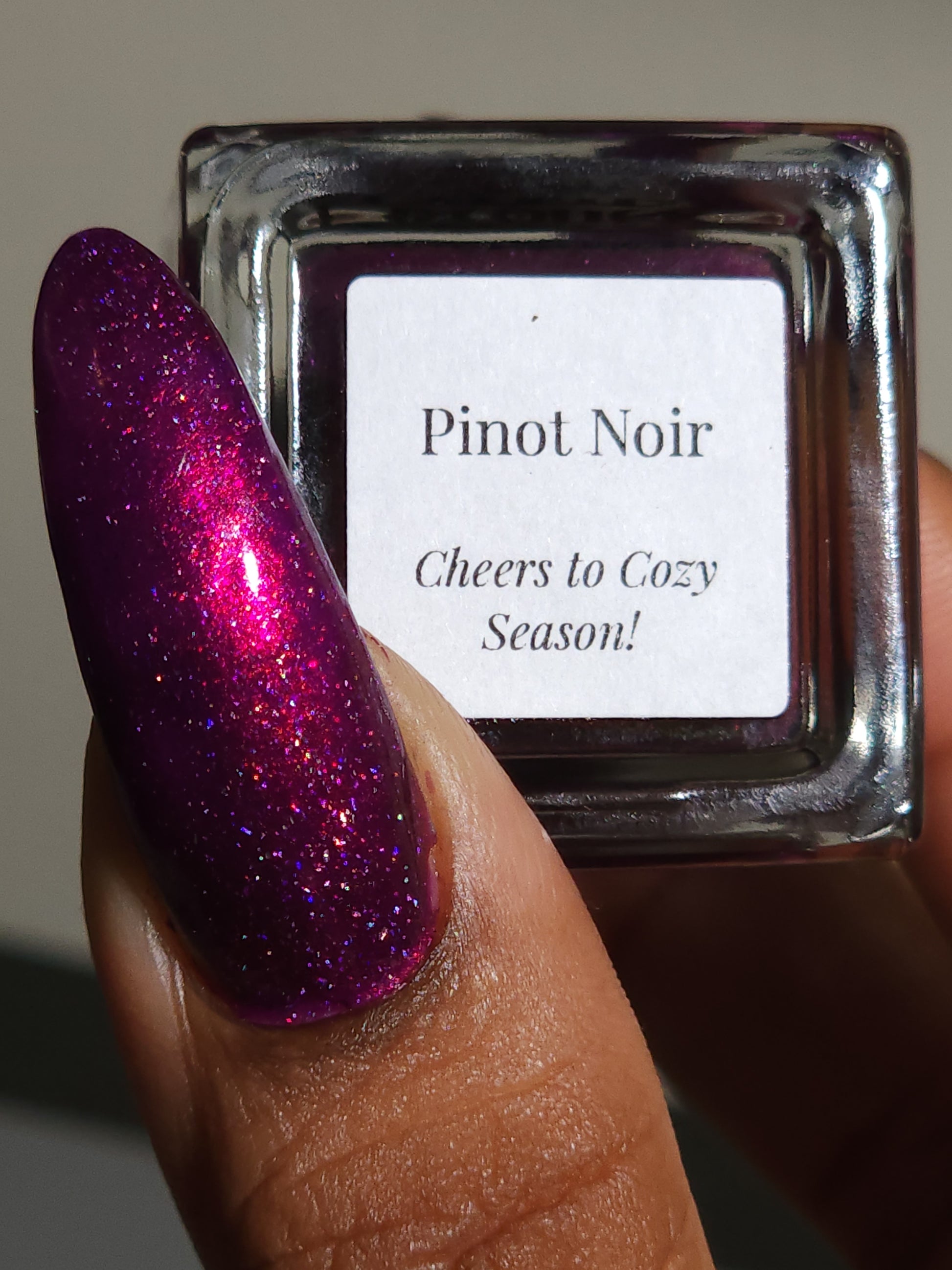 - Pinot Noir (Lurid Lacquer): a reddish plum purple base with red to orange aurora shimmer and micro holographic flakes.