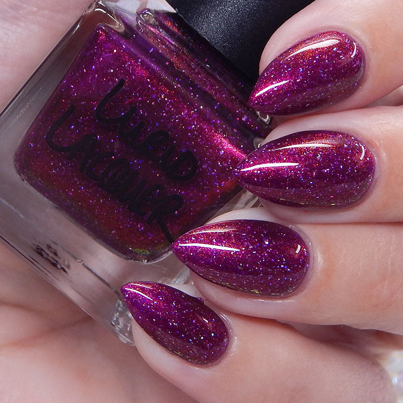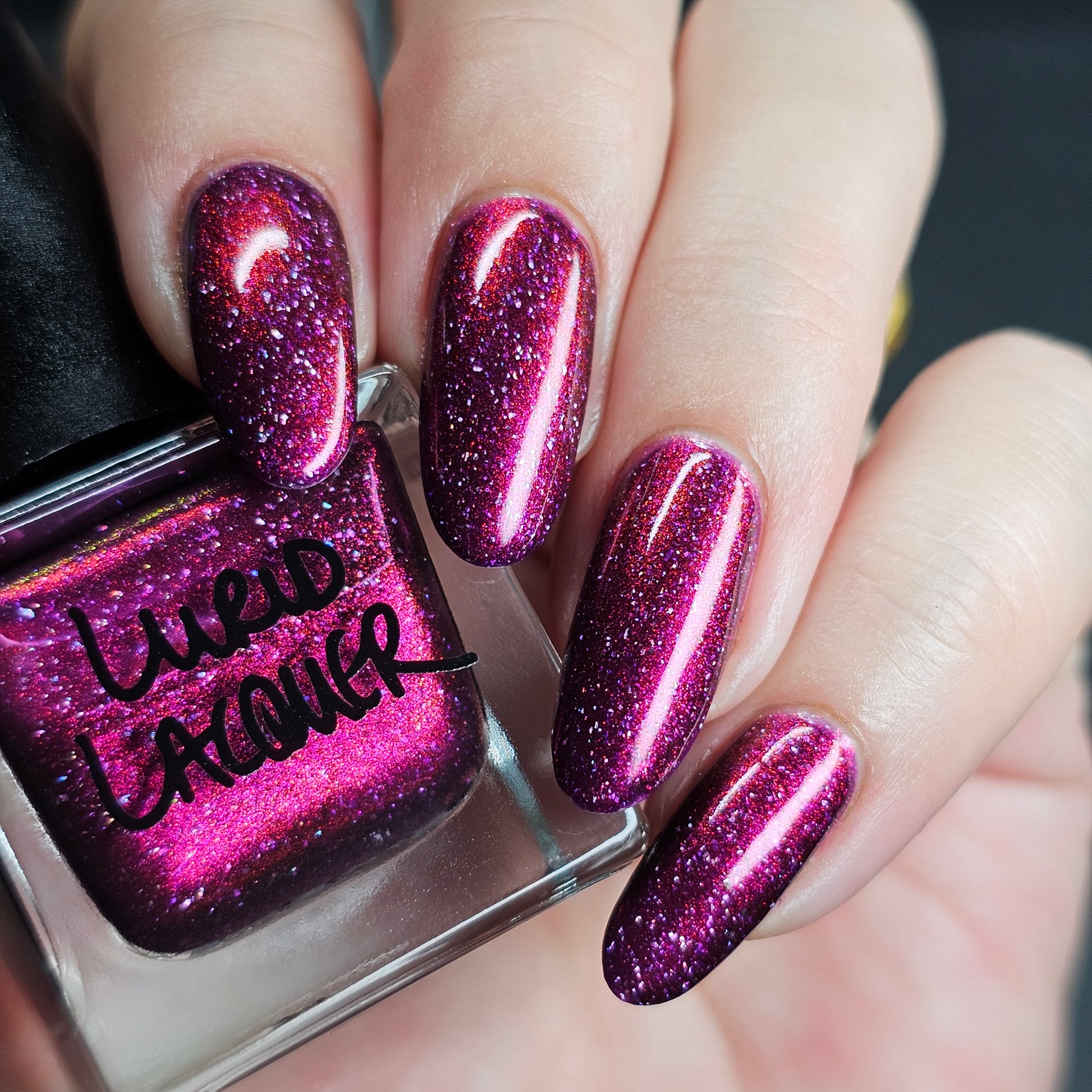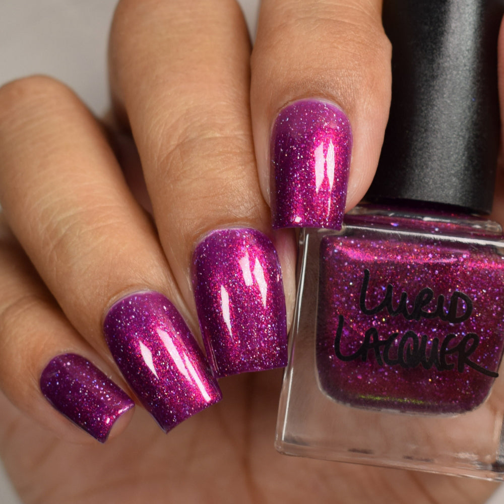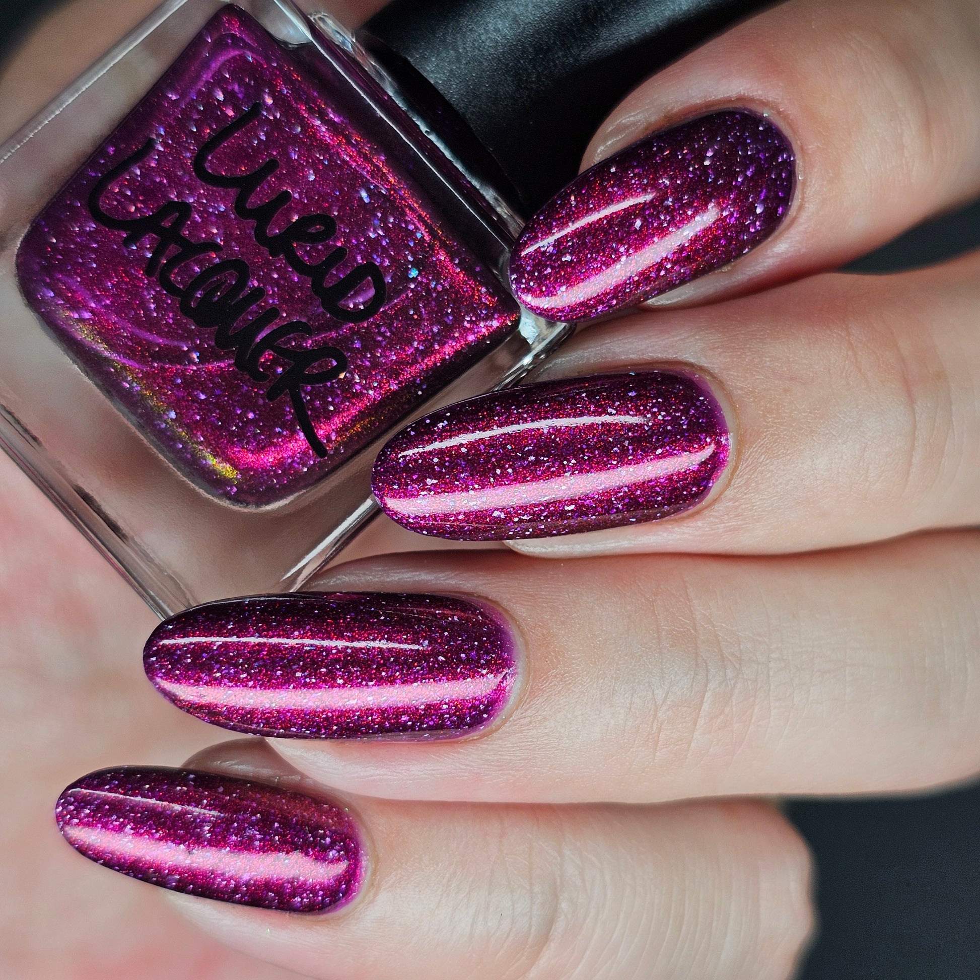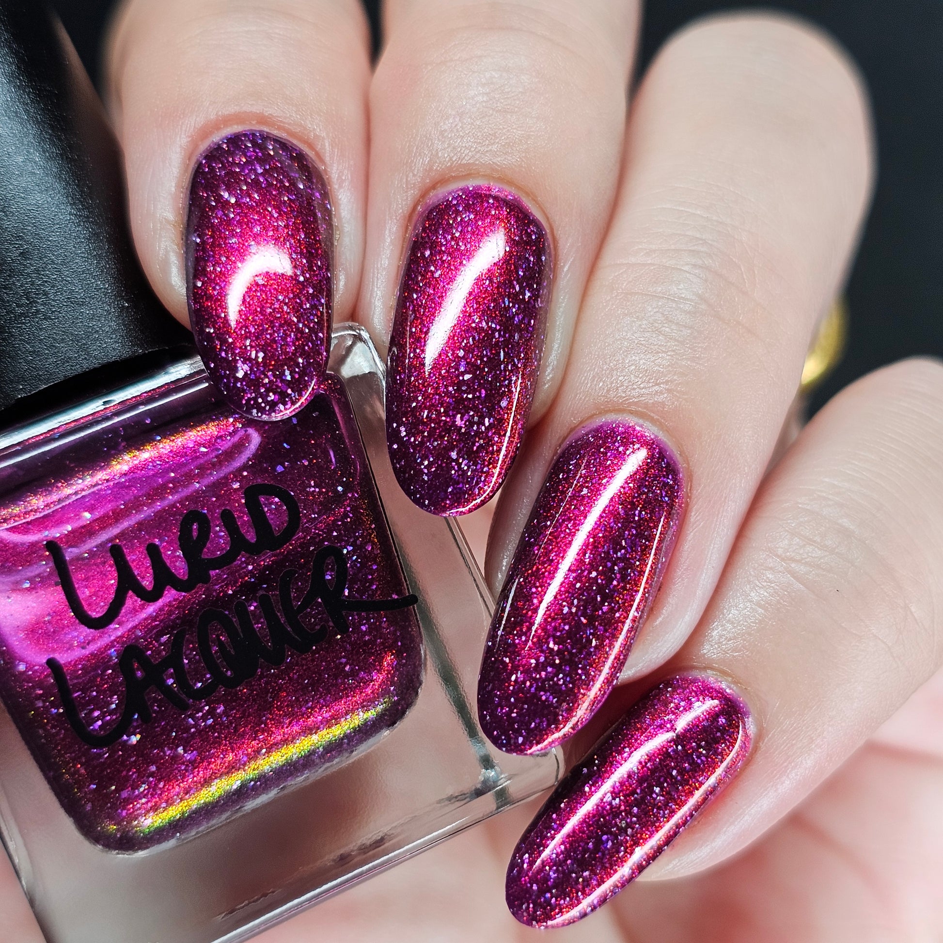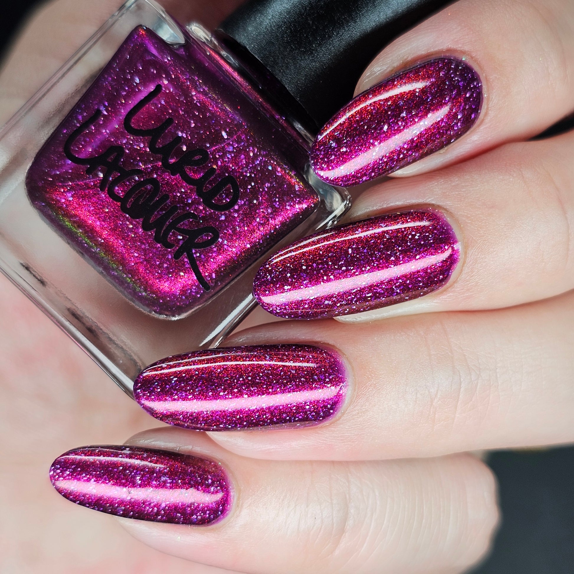 - Pinot Noir (Lurid Lacquer): a reddish plum purple base with red to orange aurora shimmer and micro holographic flakes.