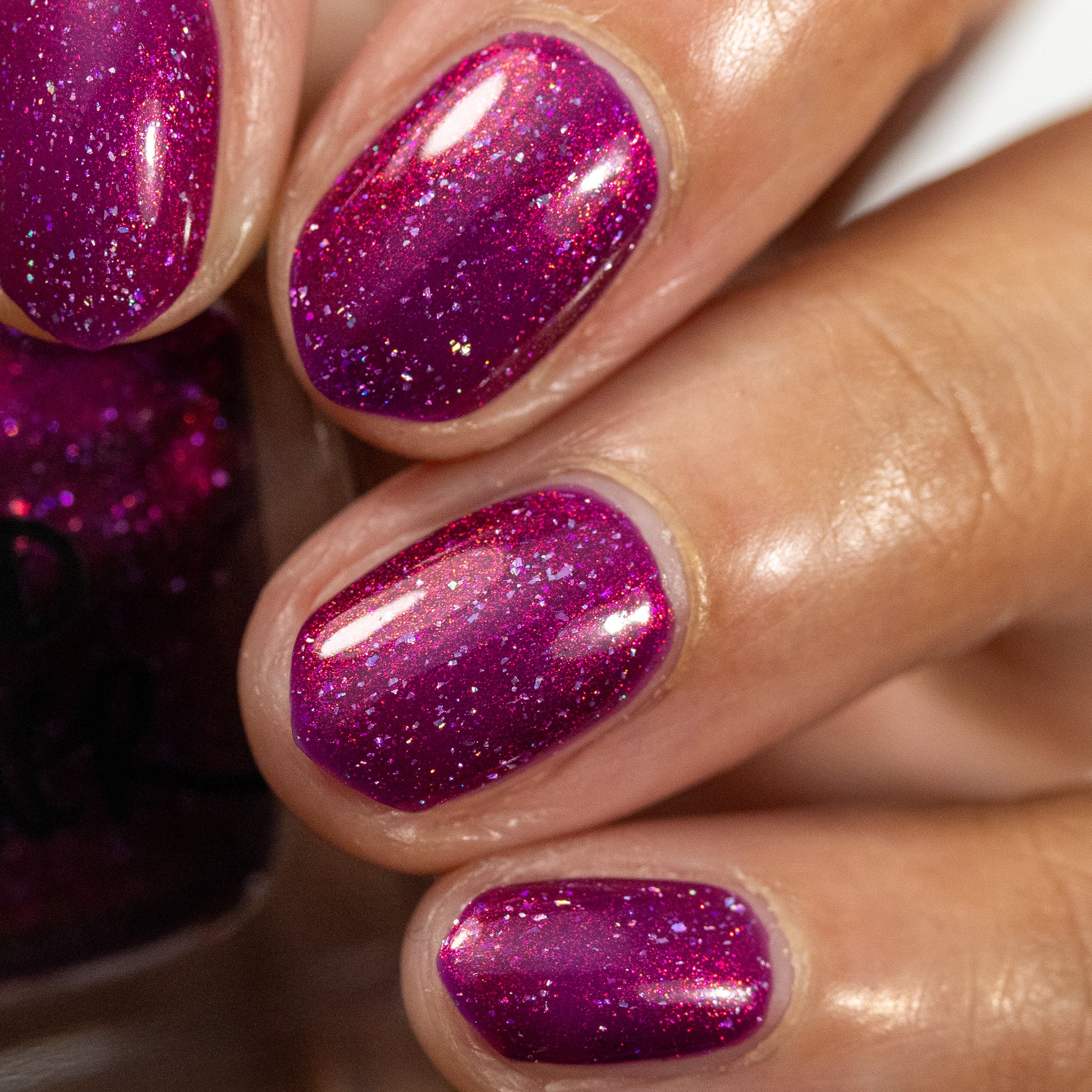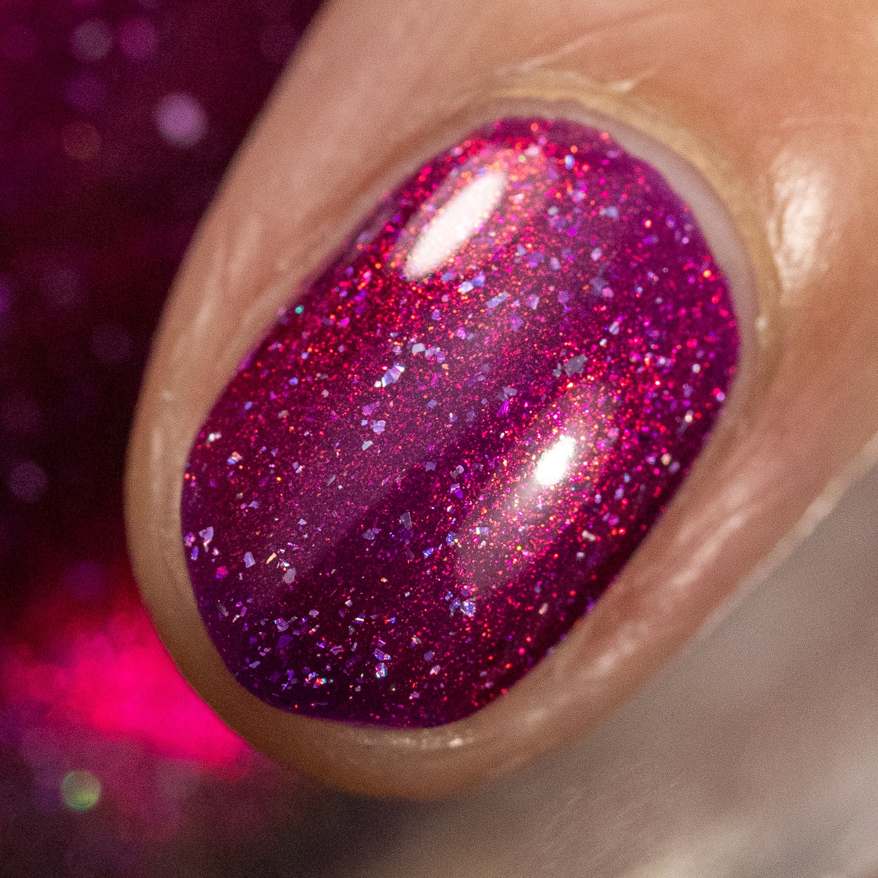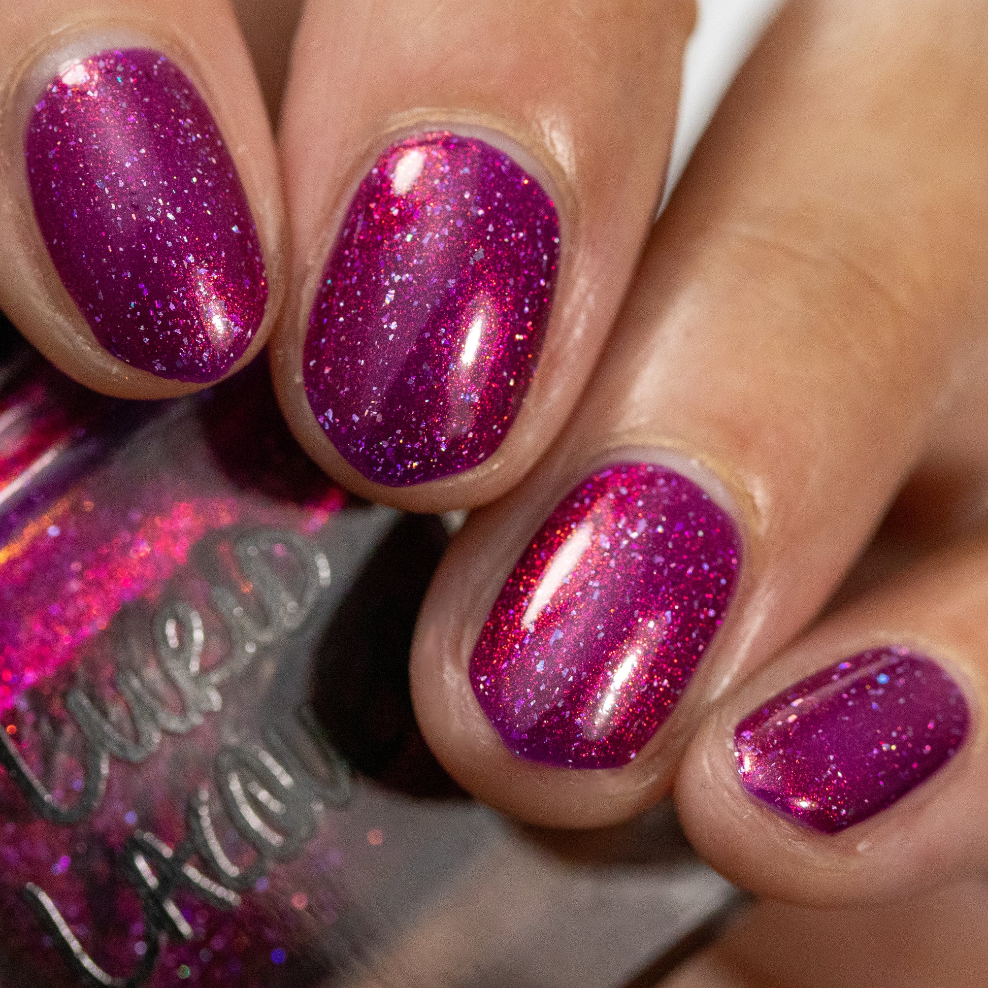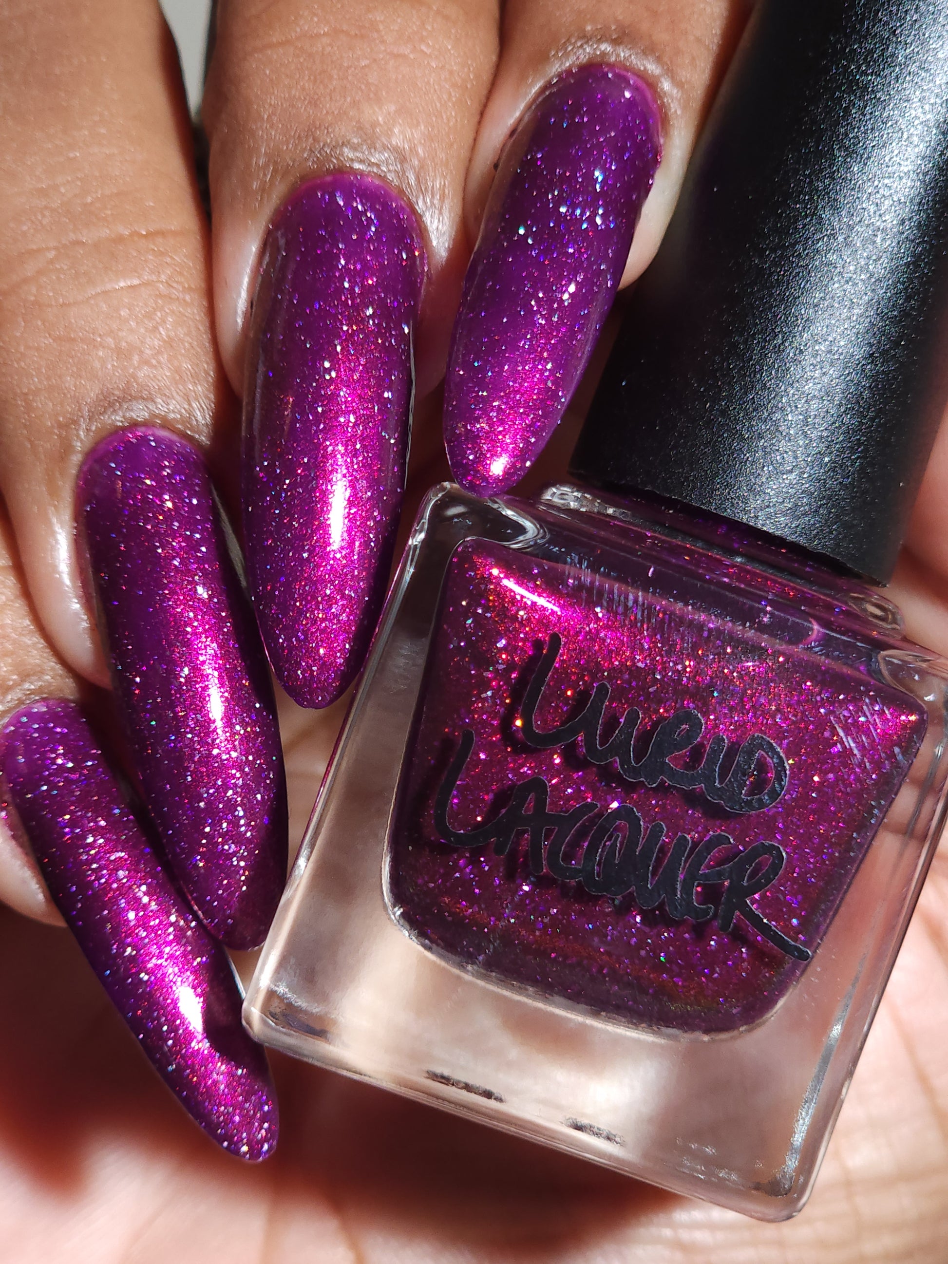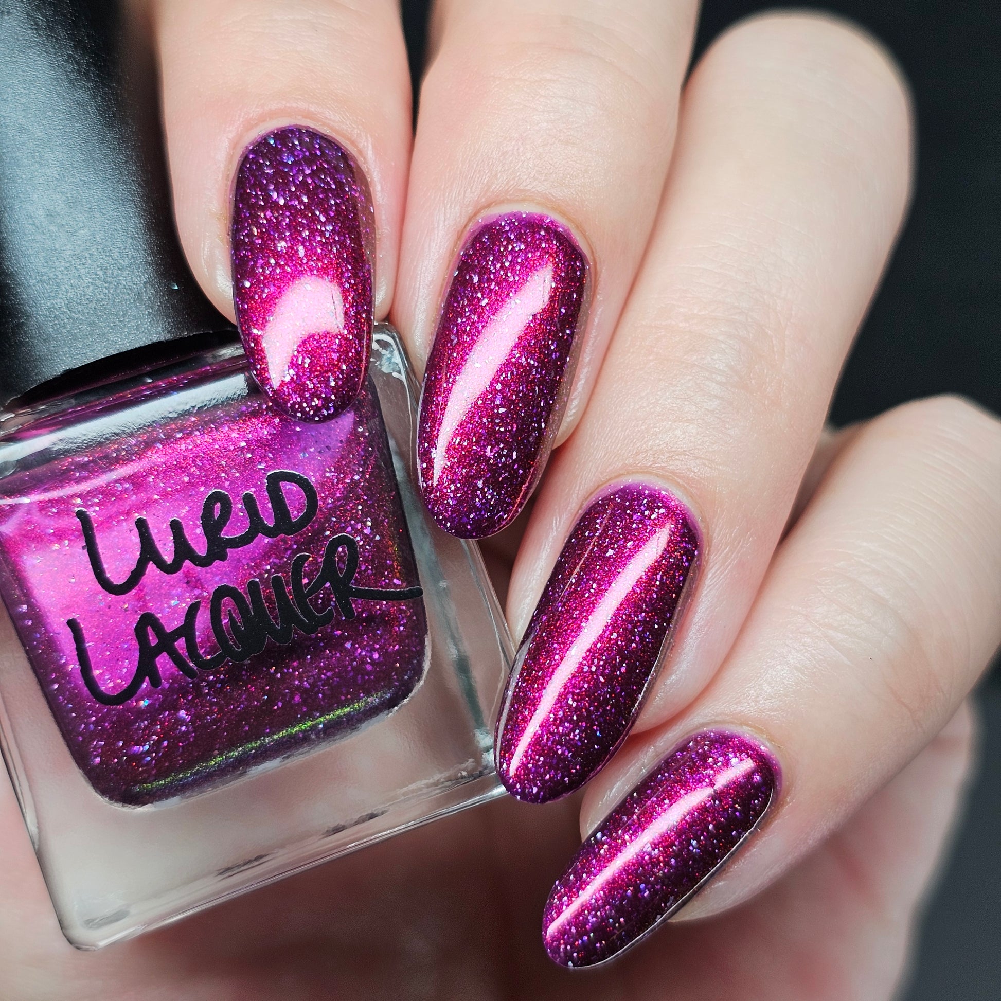 - Pinot Noir (Lurid Lacquer): a reddish plum purple base with red to orange aurora shimmer and micro holographic flakes.