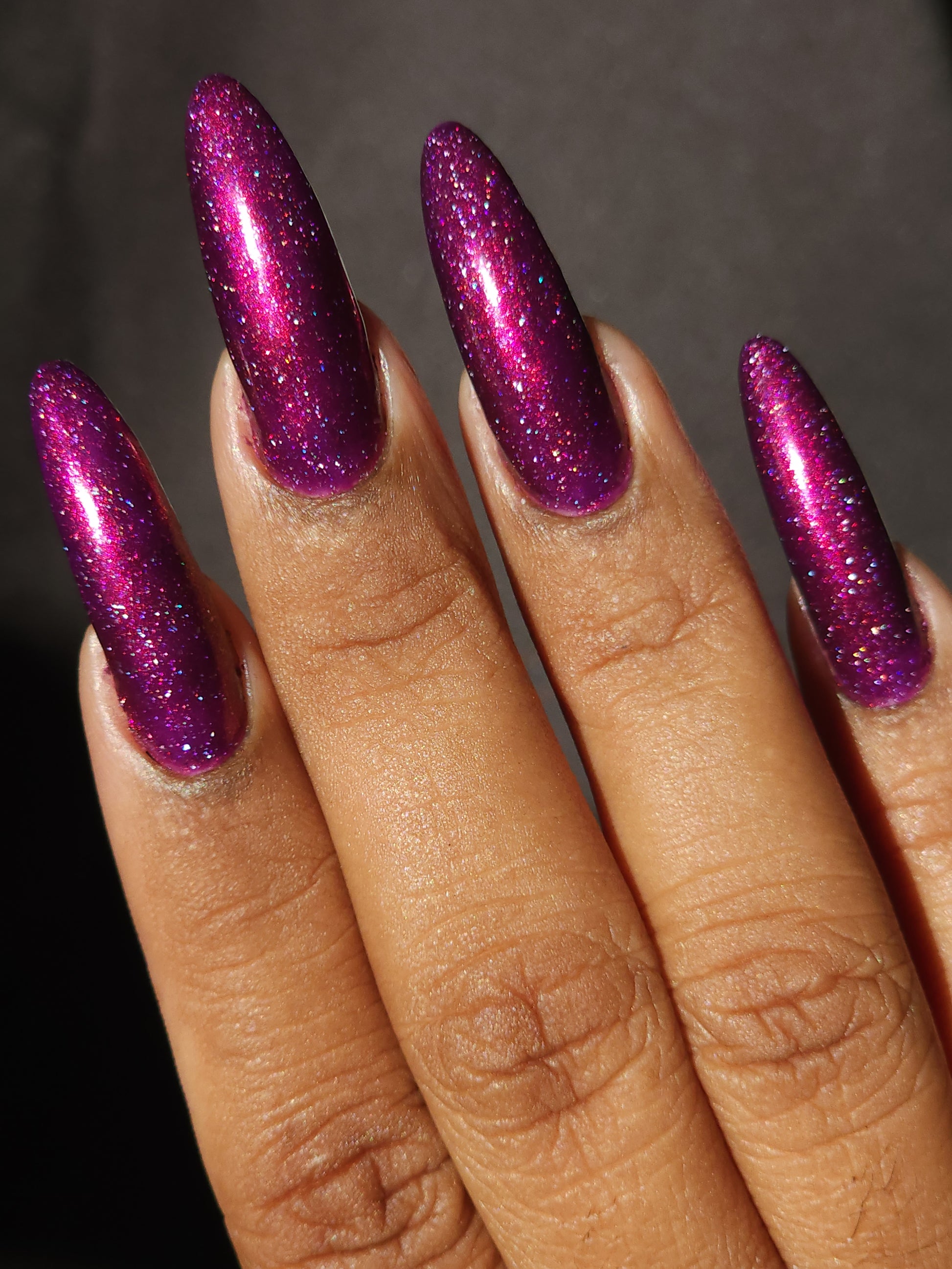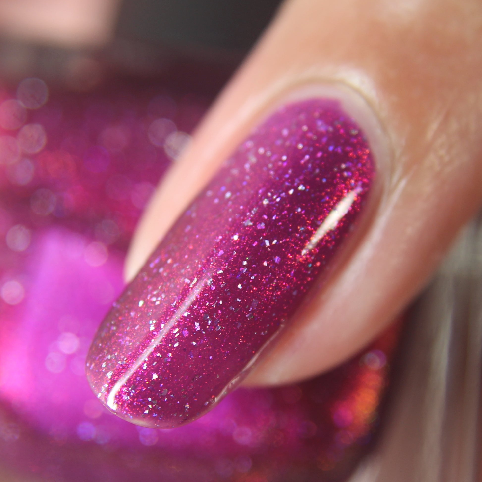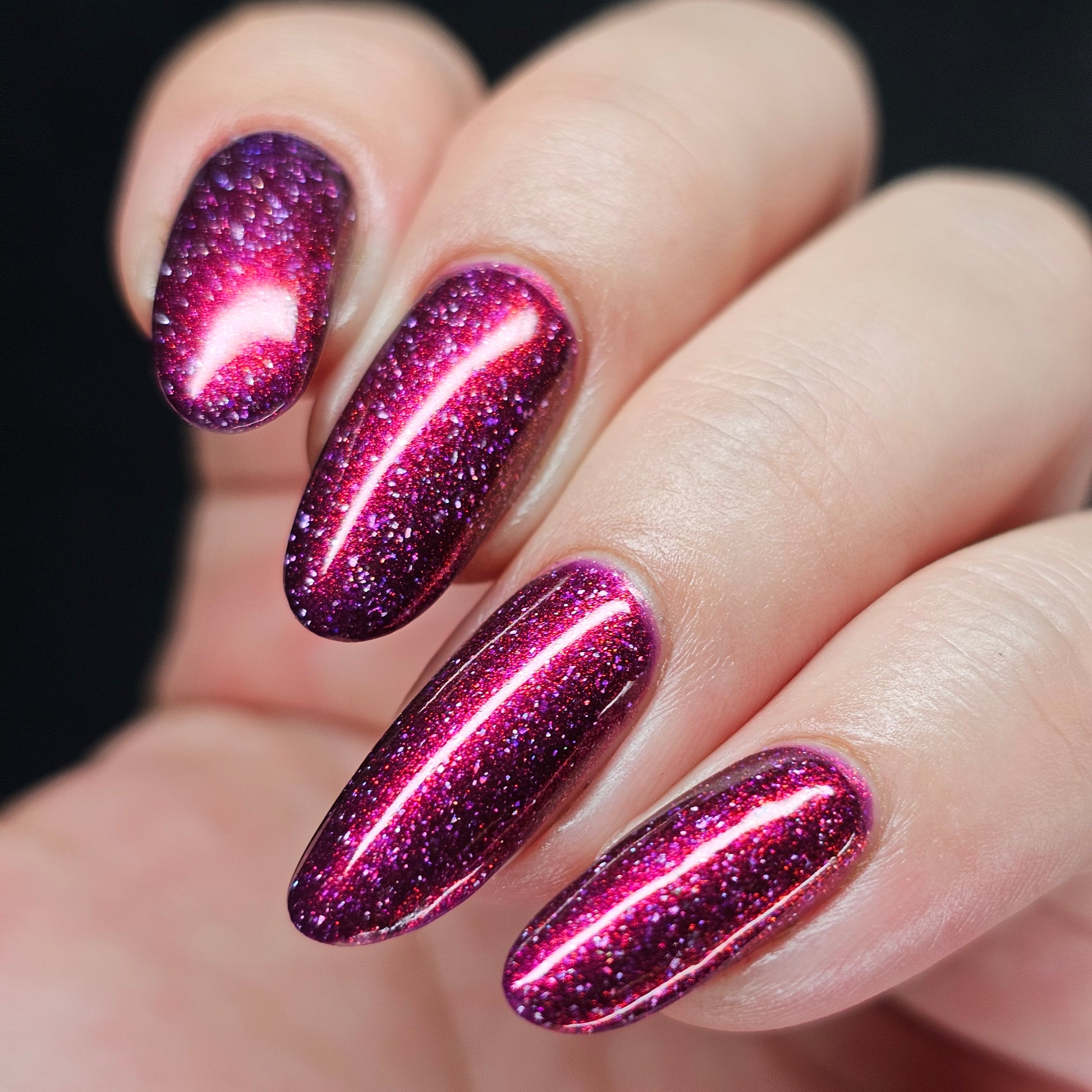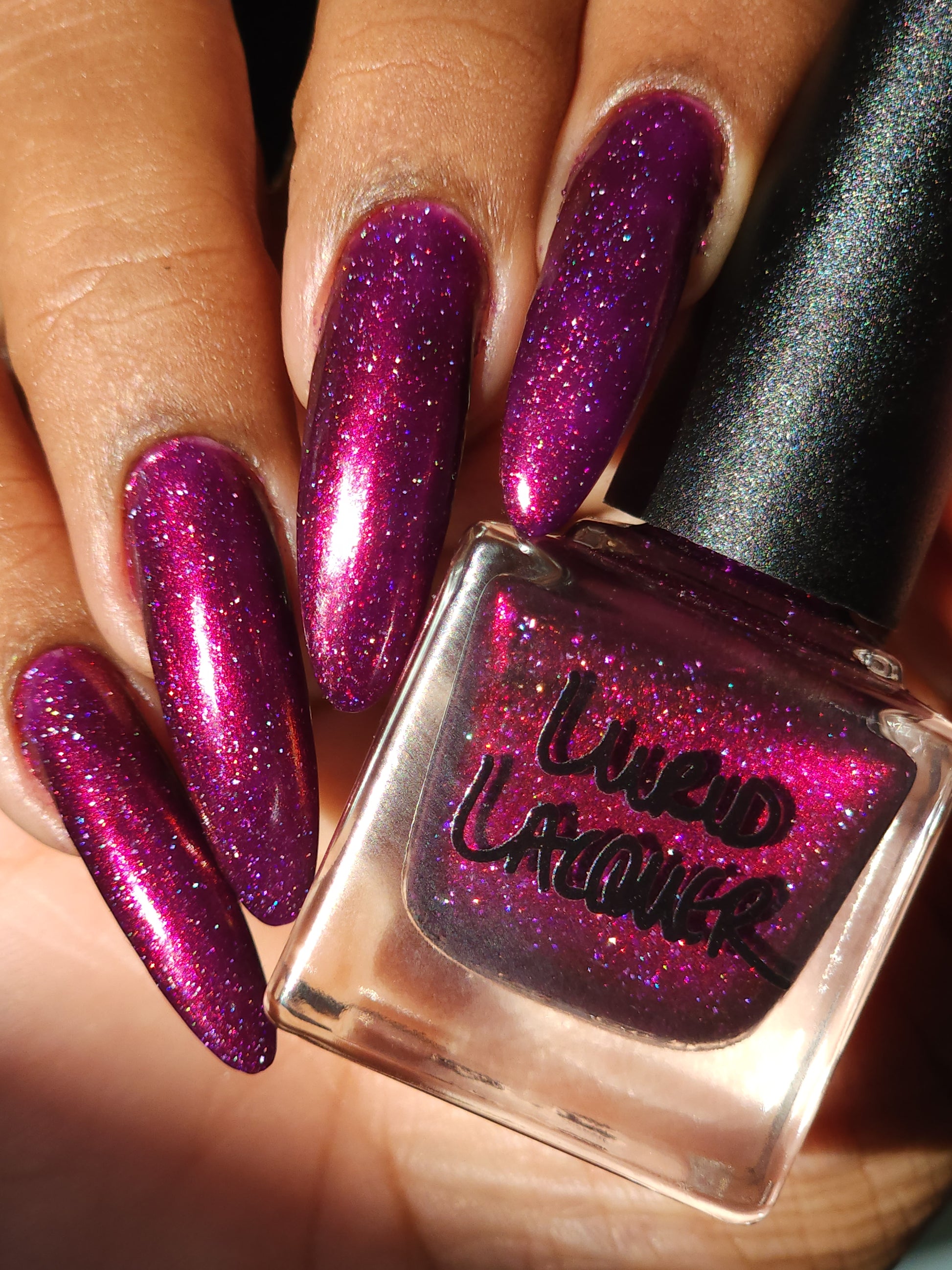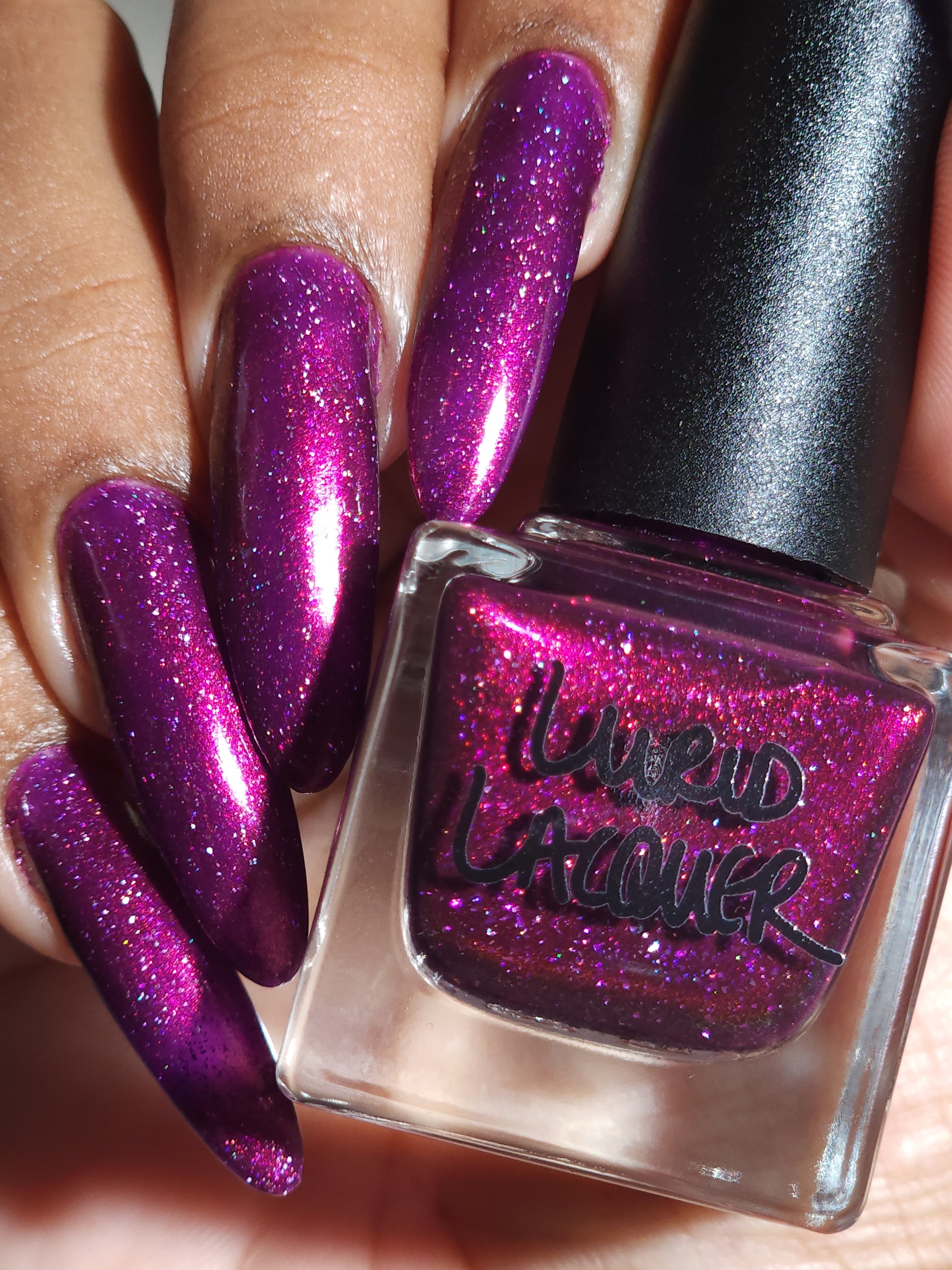 - Pinot Noir (Lurid Lacquer): a reddish plum purple base with red to orange aurora shimmer and micro holographic flakes.