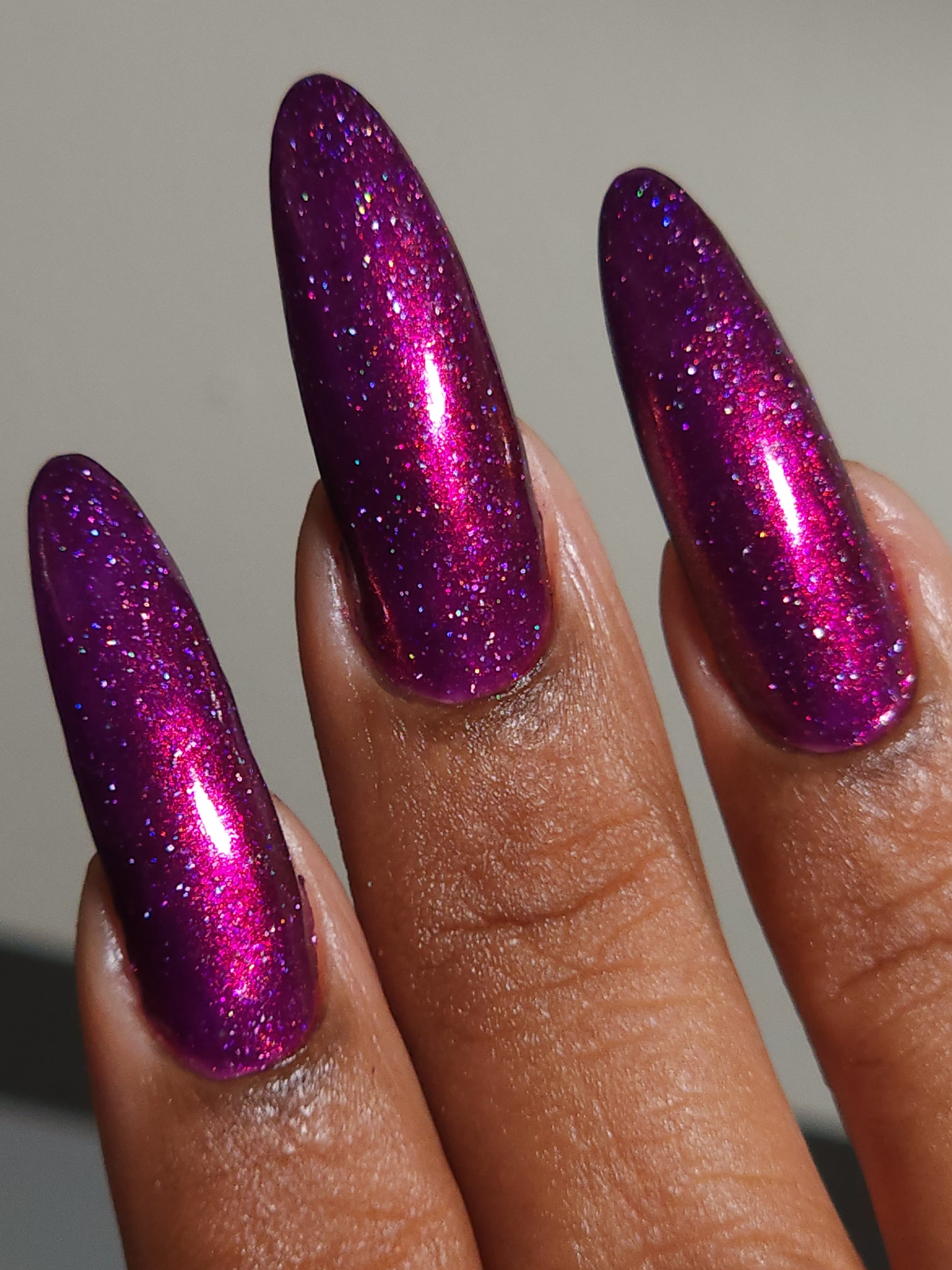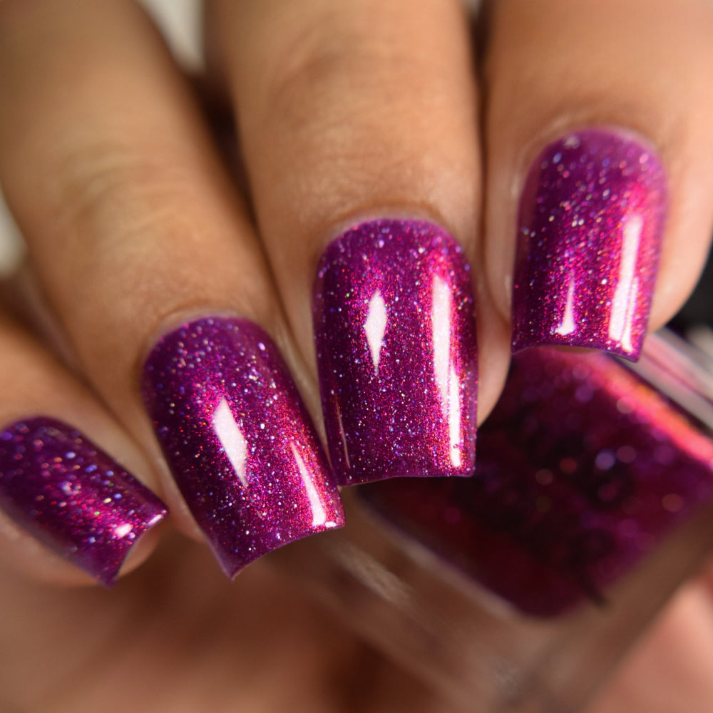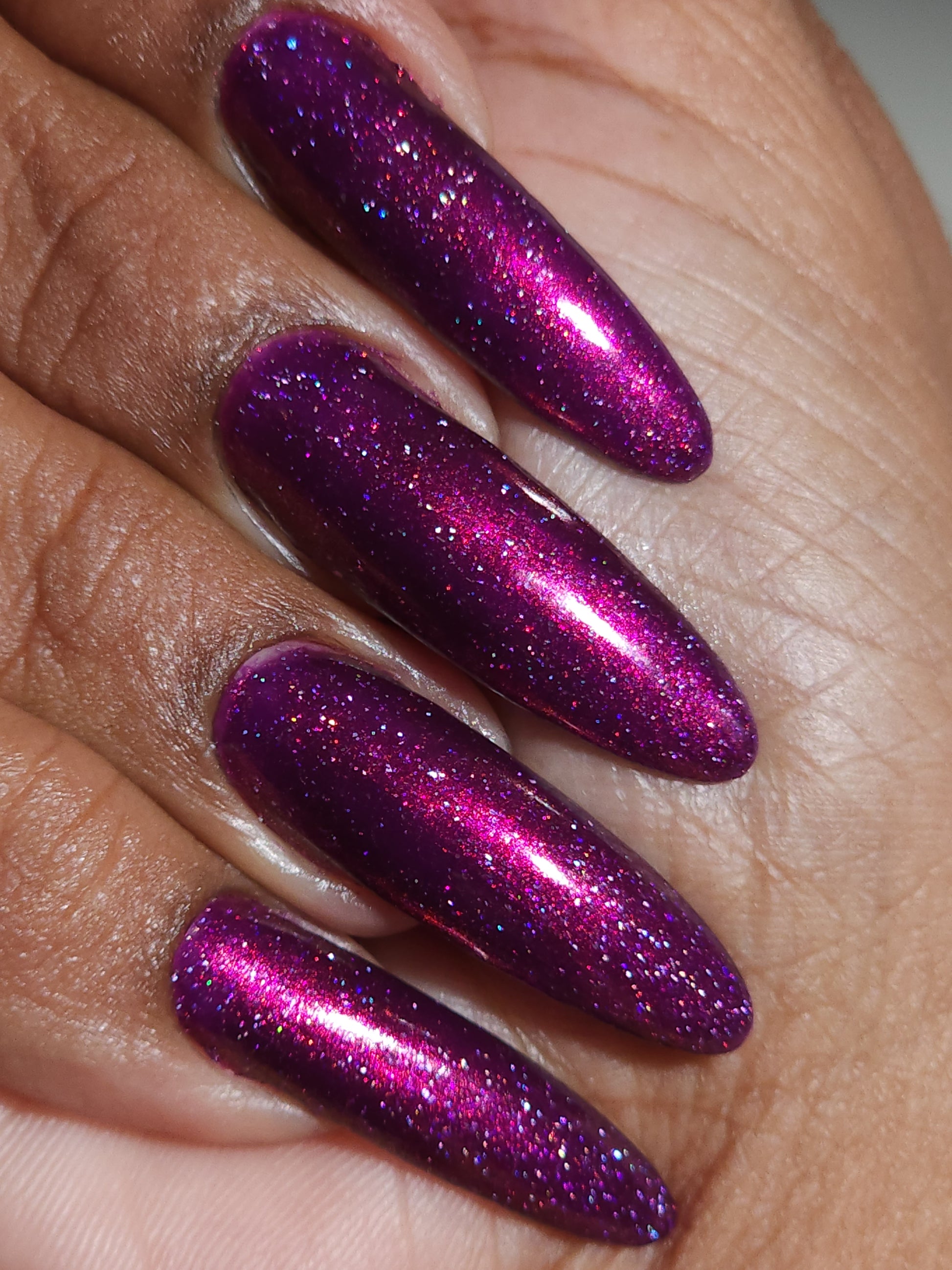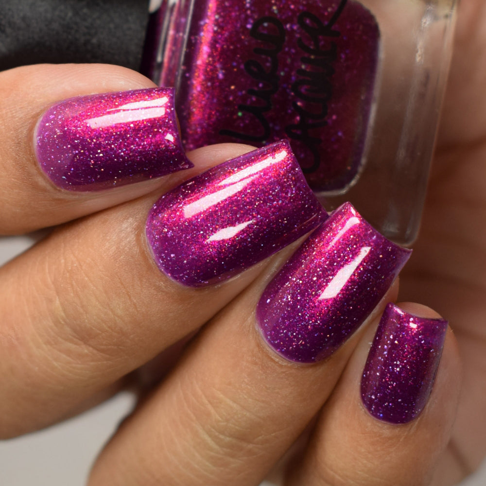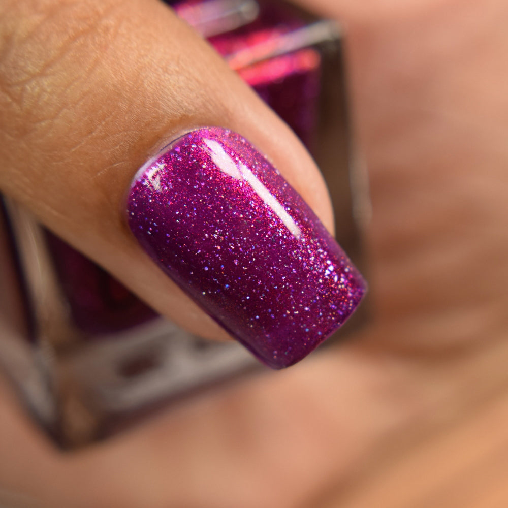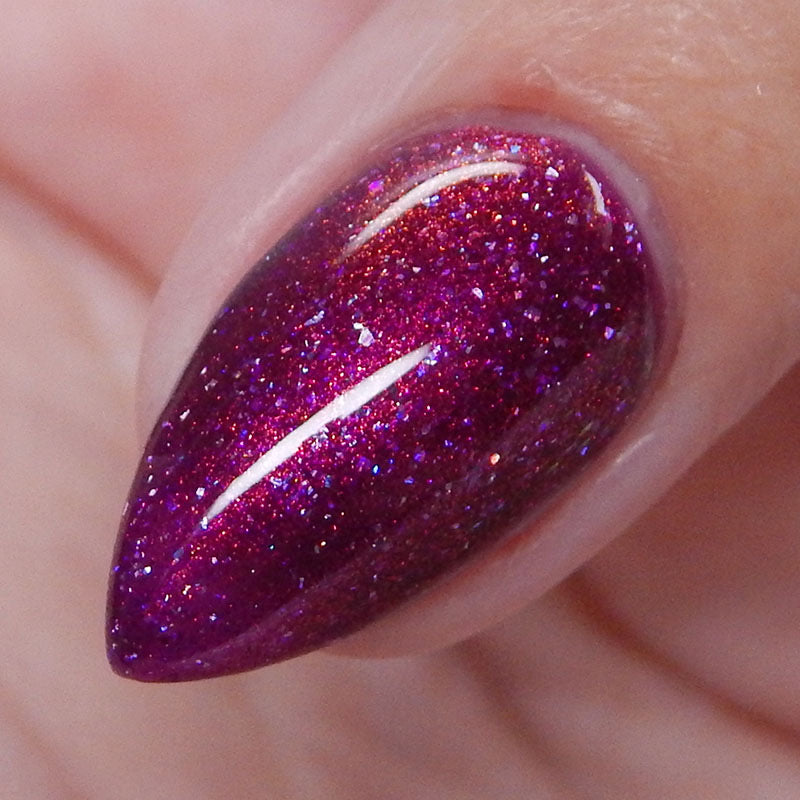 - Pinot Noir (Lurid Lacquer): a reddish plum purple base with red to orange aurora shimmer and micro holographic flakes.