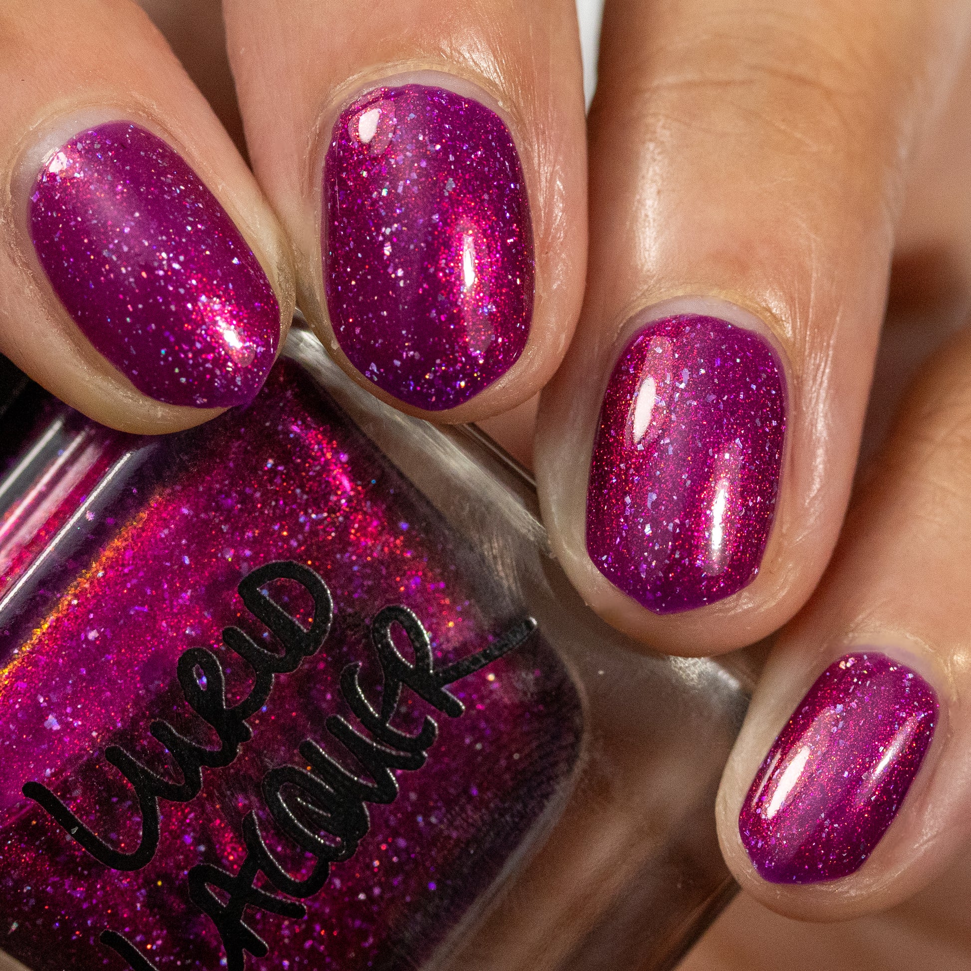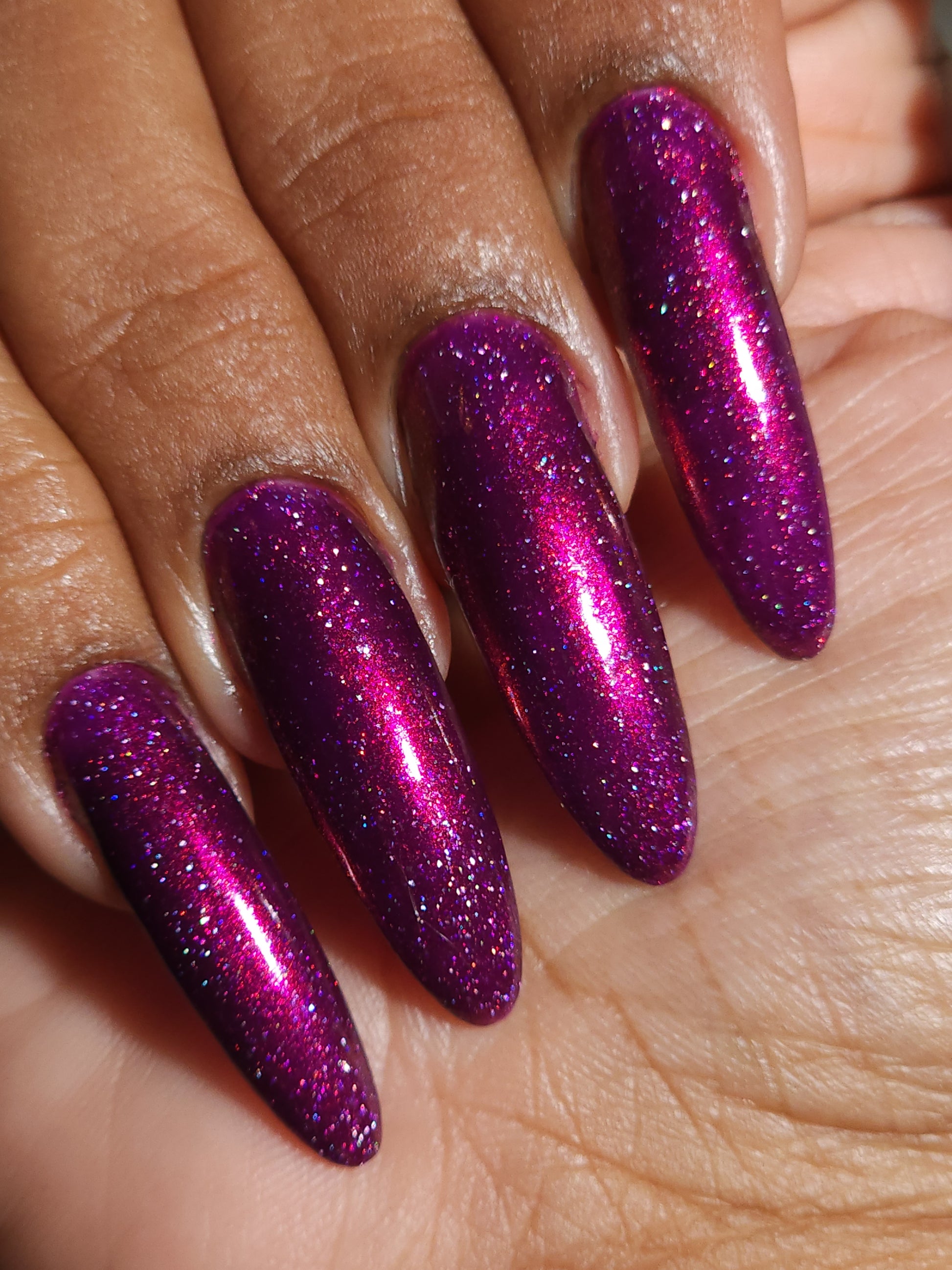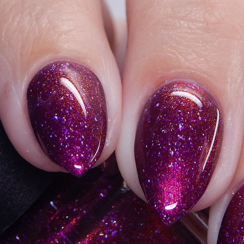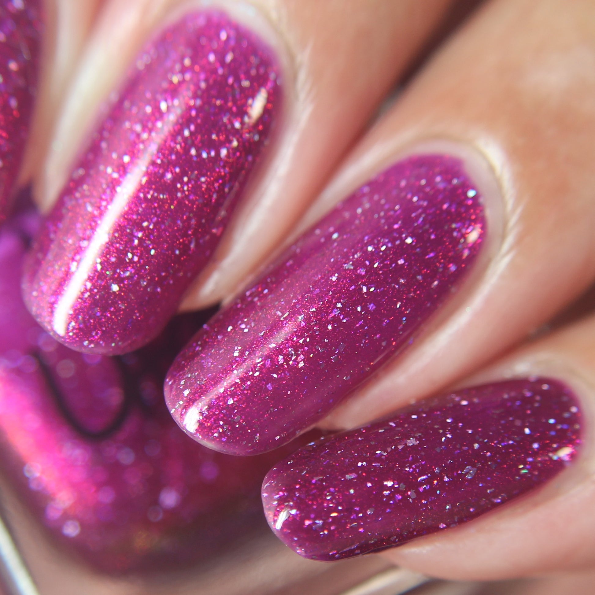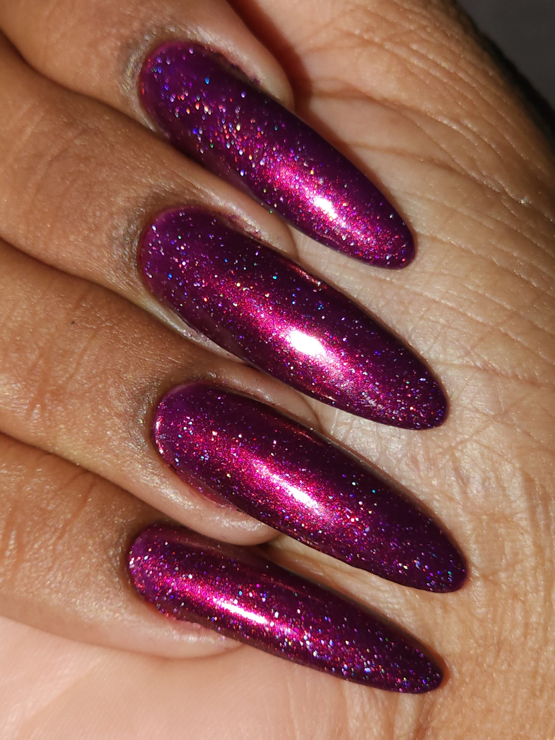 - Pinot Noir (Lurid Lacquer): a reddish plum purple base with red to orange aurora shimmer and micro holographic flakes.