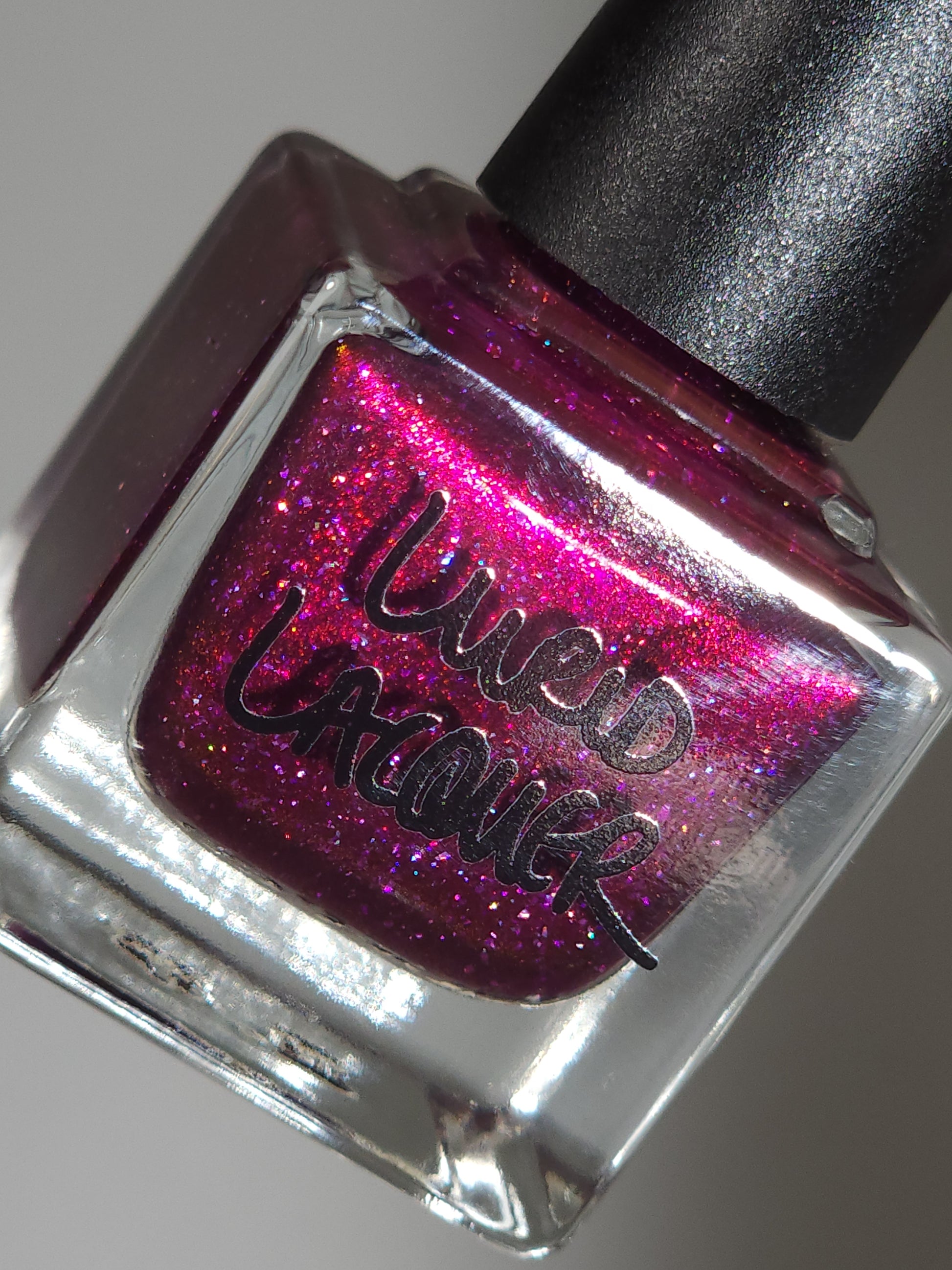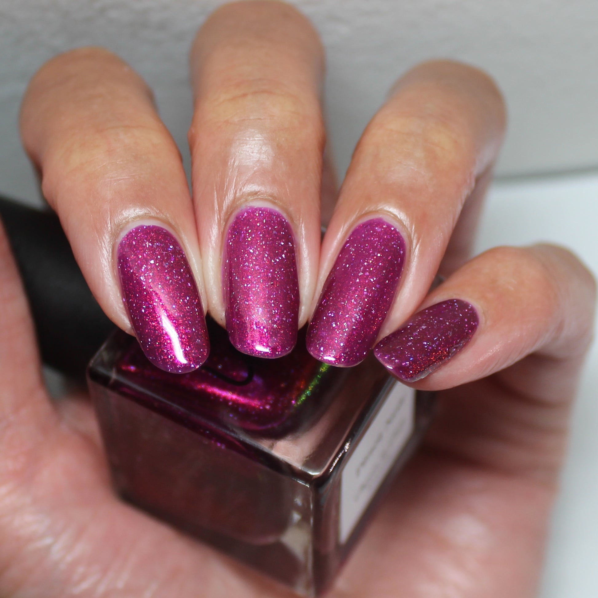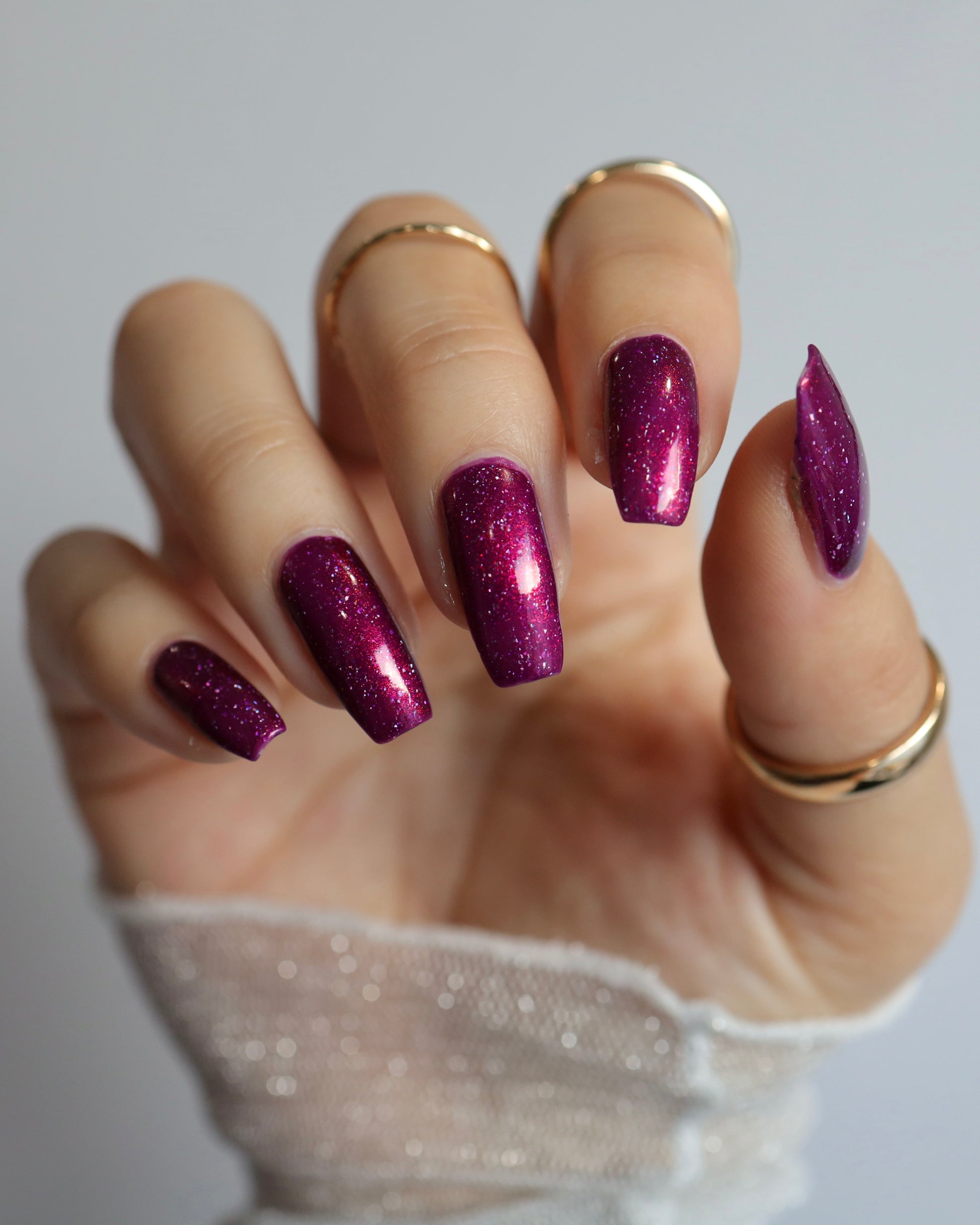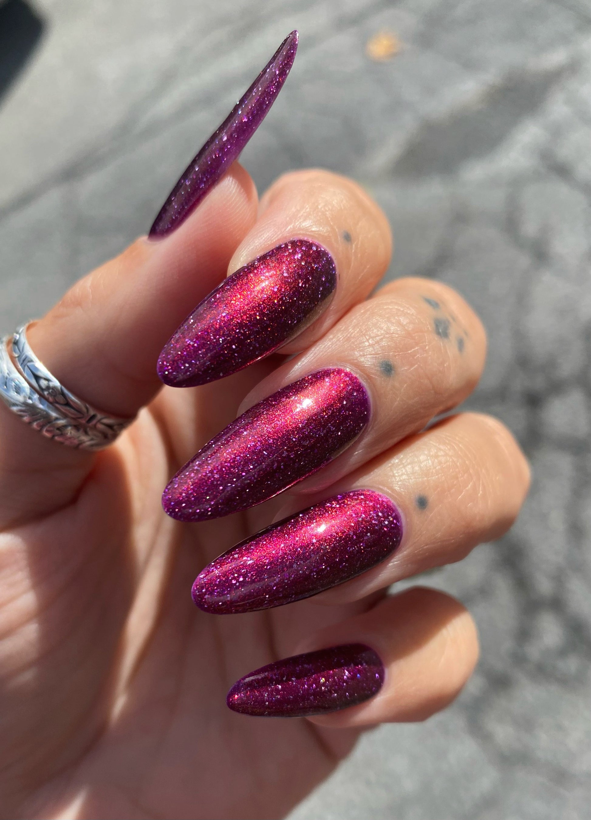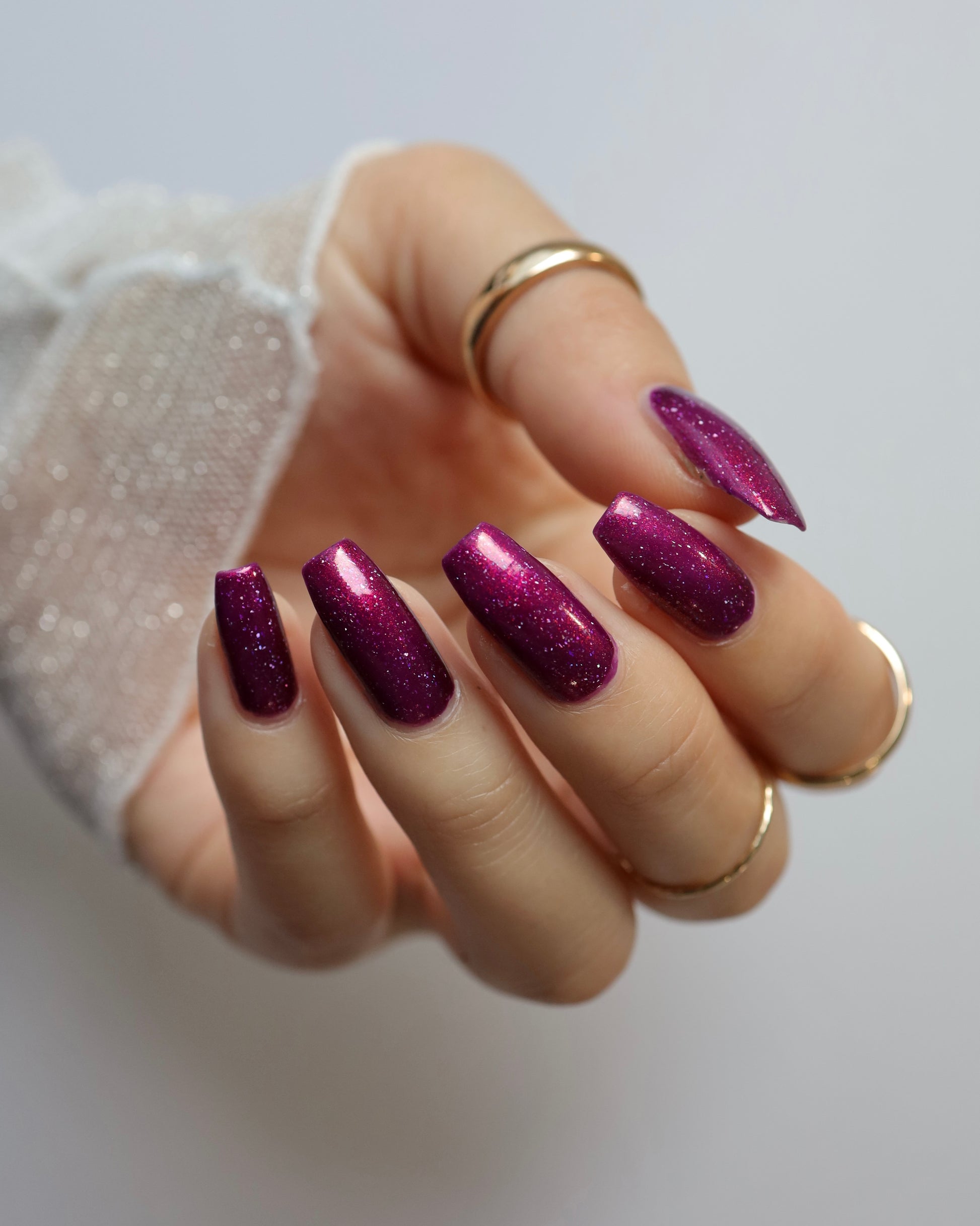 - Pinot Noir (Lurid Lacquer): a reddish plum purple base with red to orange aurora shimmer and micro holographic flakes.