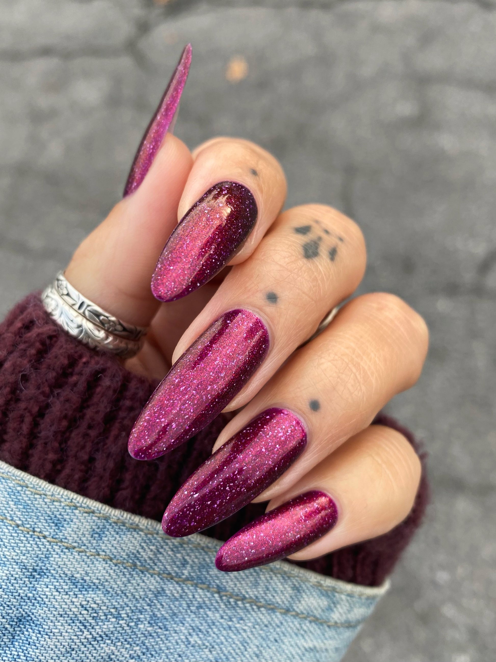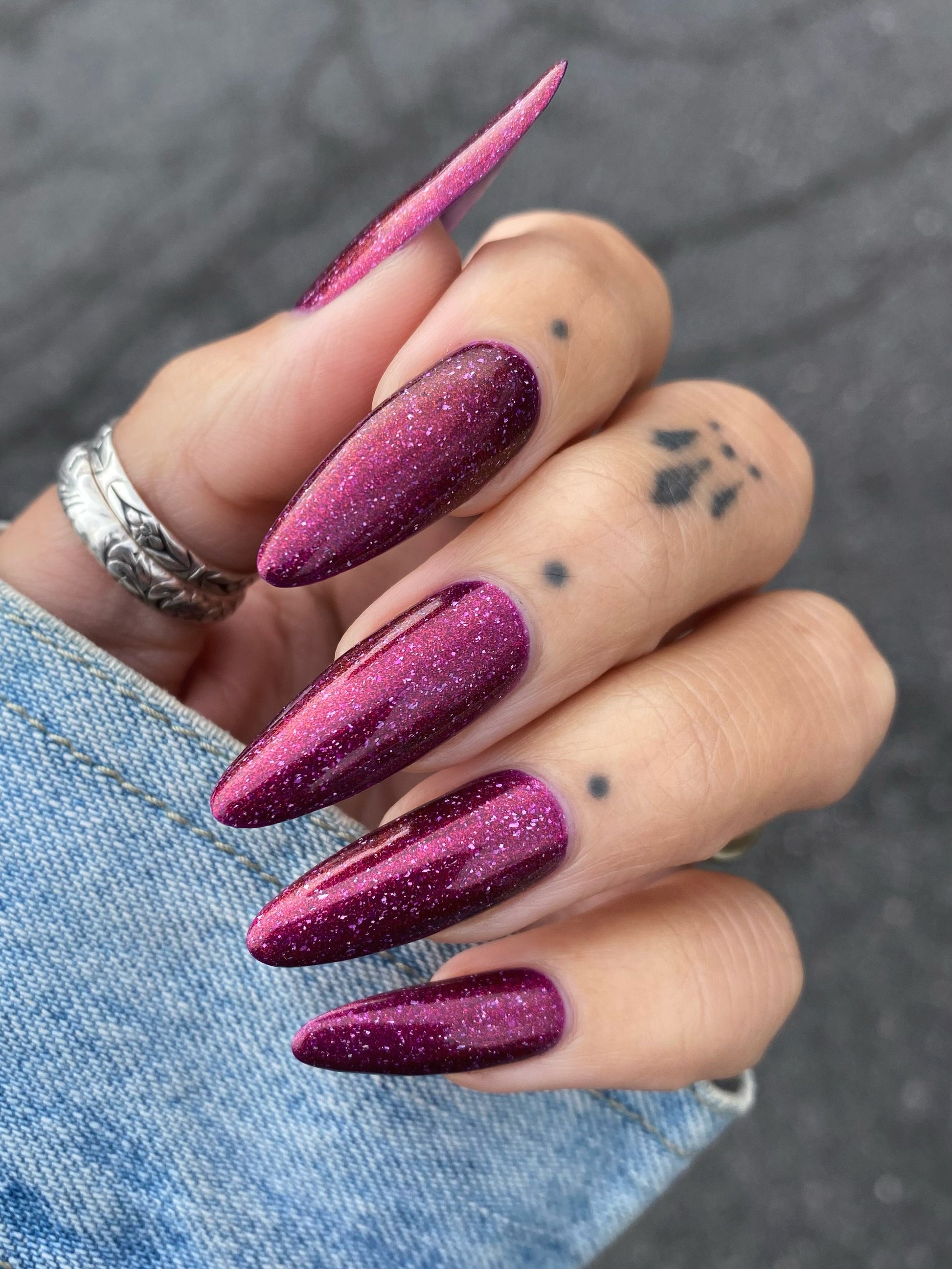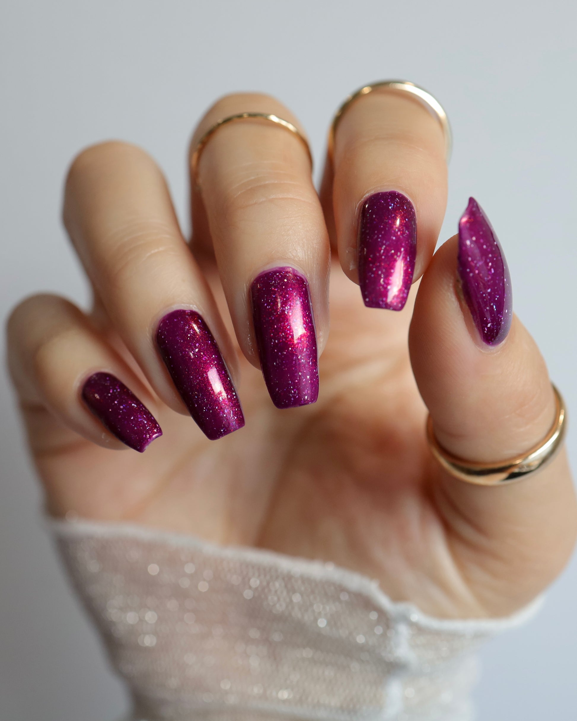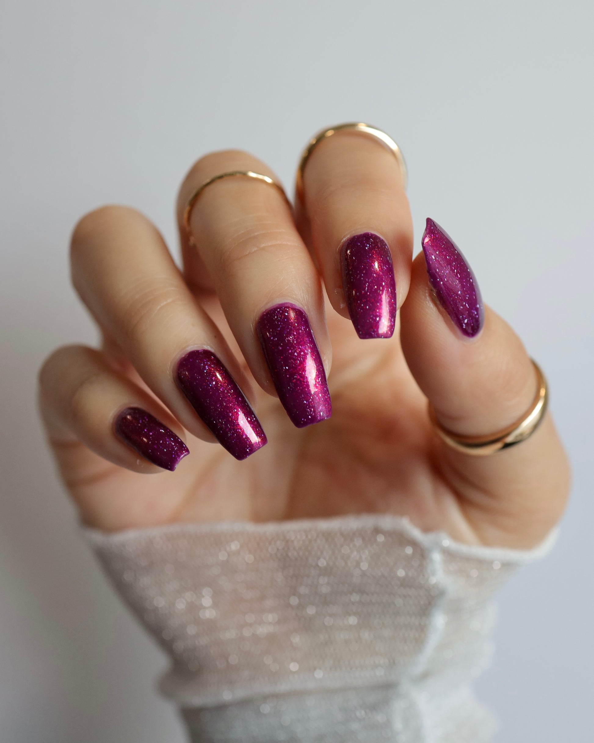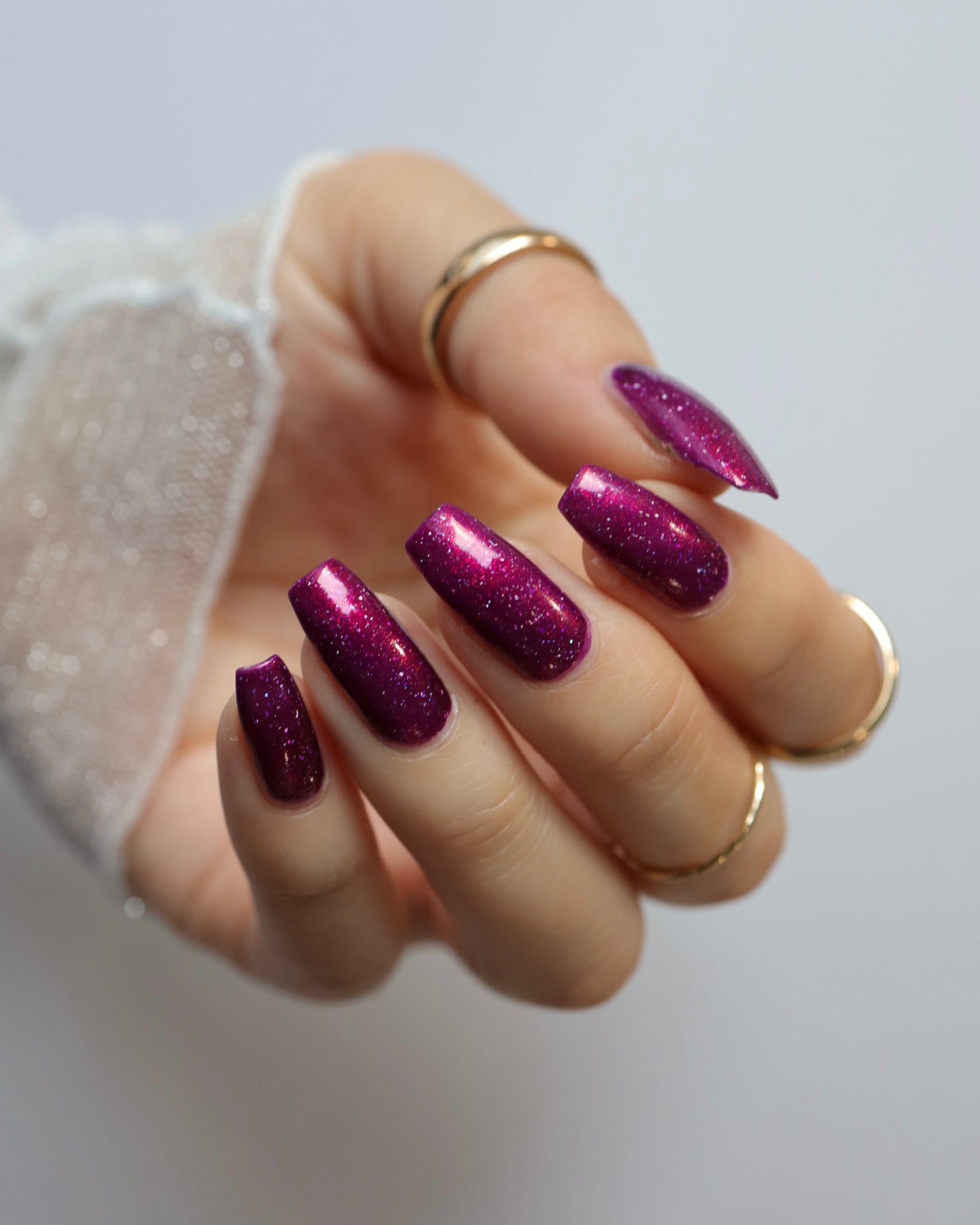 - Pinot Noir (Lurid Lacquer): a reddish plum purple base with red to orange aurora shimmer and micro holographic flakes.