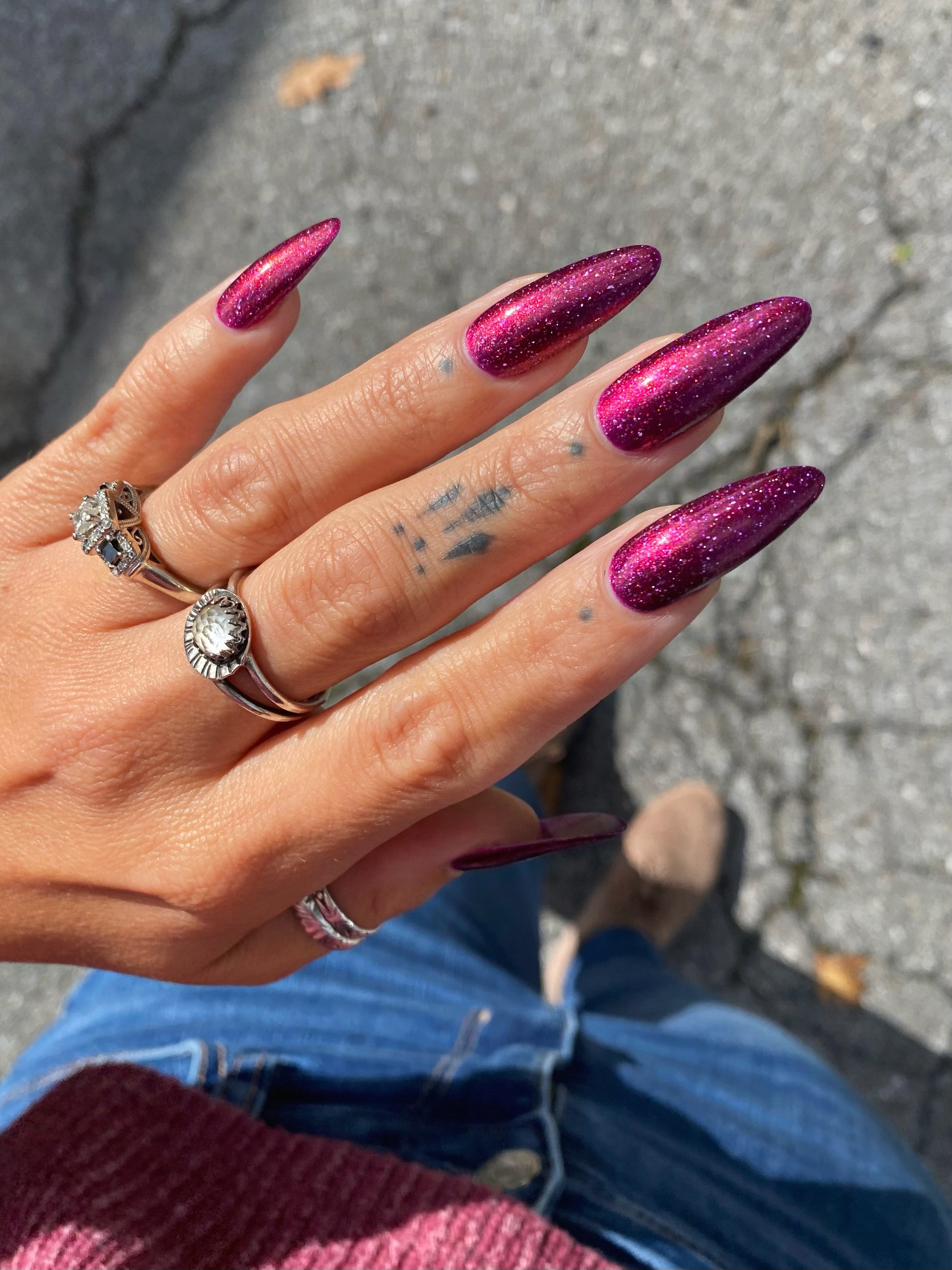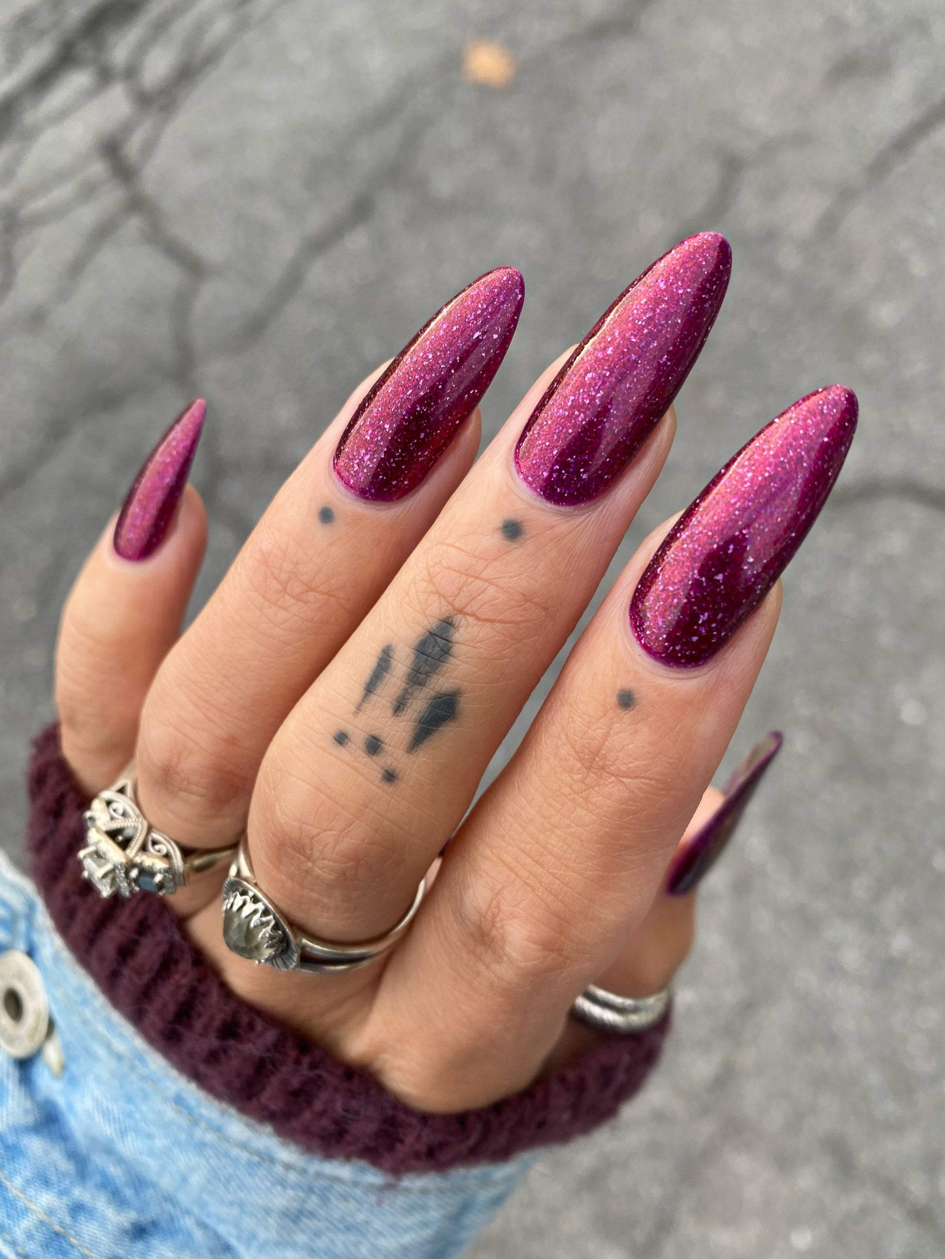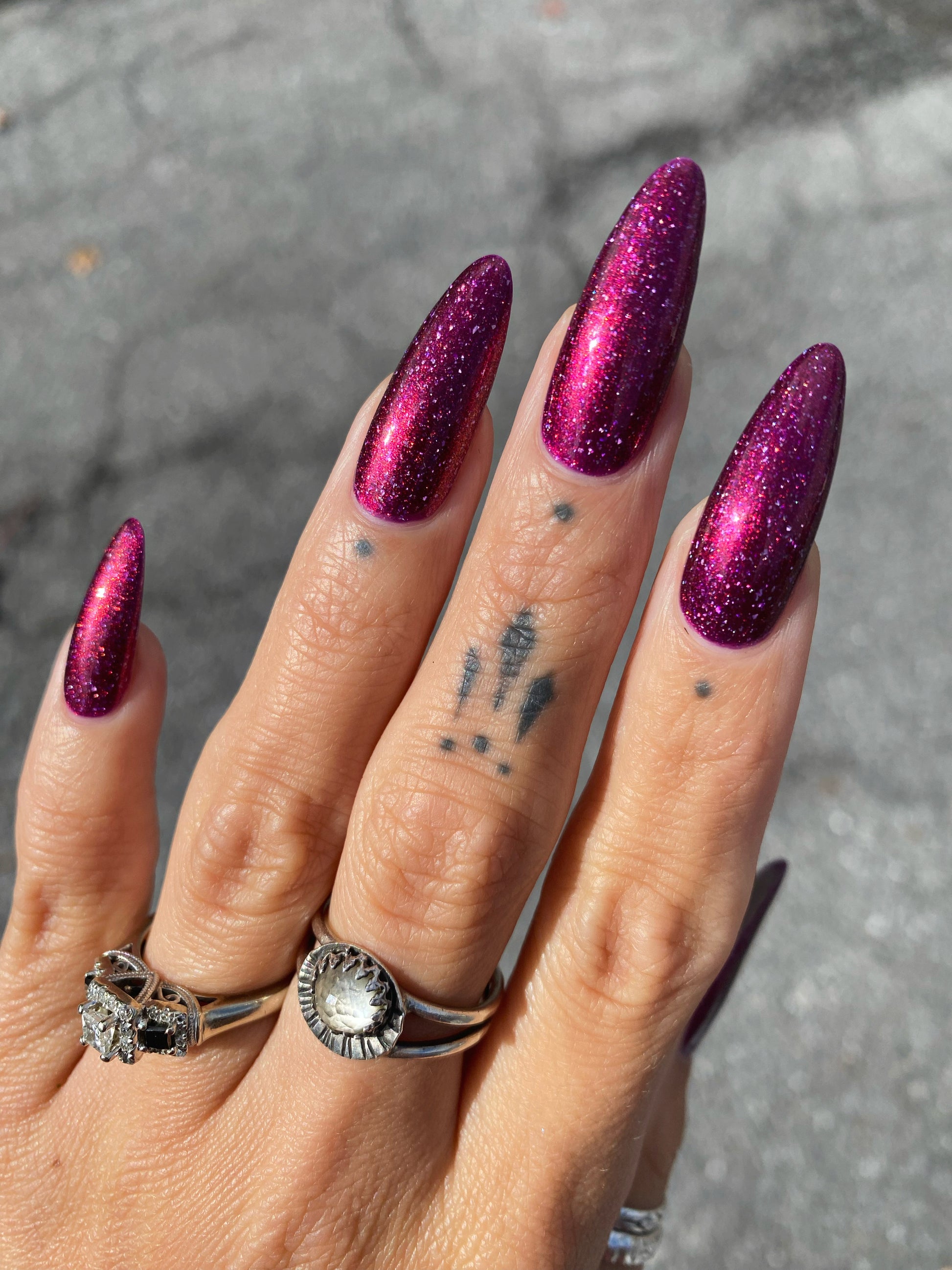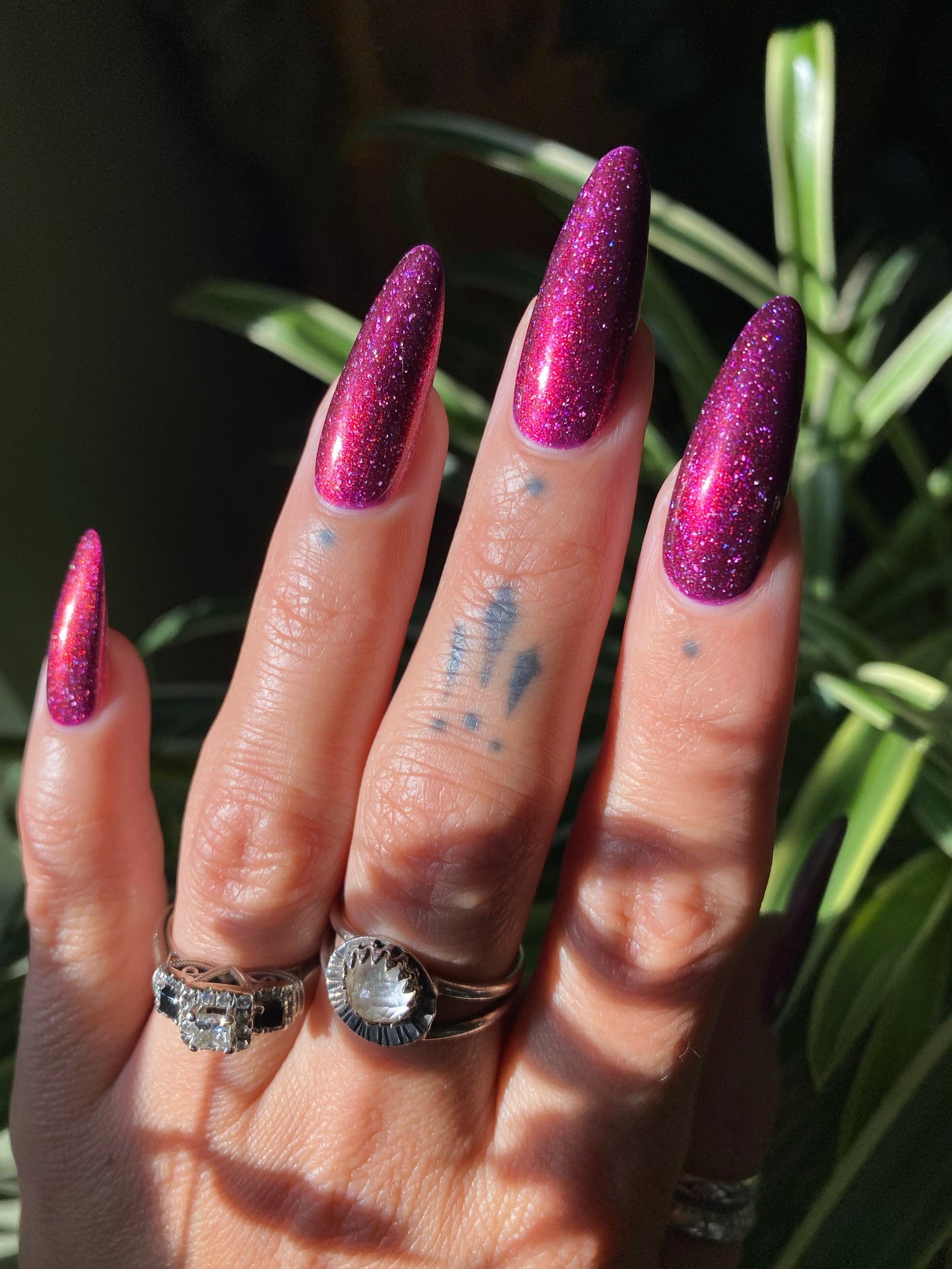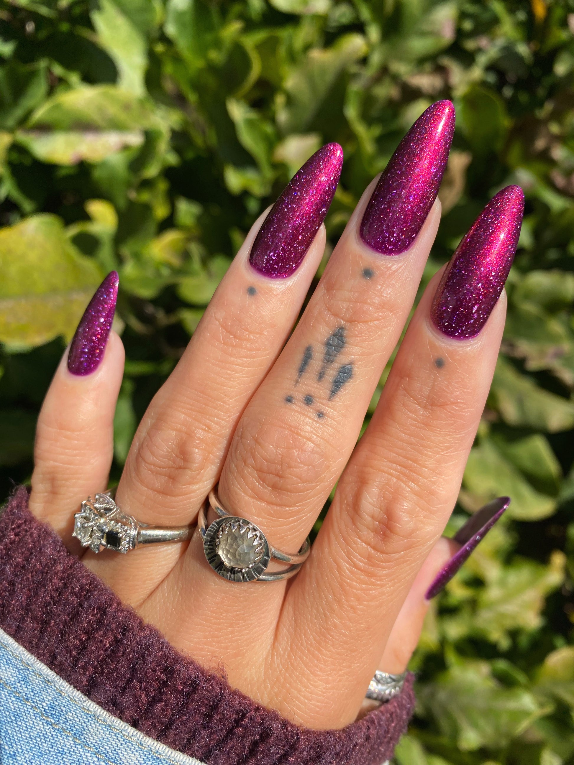 - Pinot Noir (Lurid Lacquer): a reddish plum purple base with red to orange aurora shimmer and micro holographic flakes.