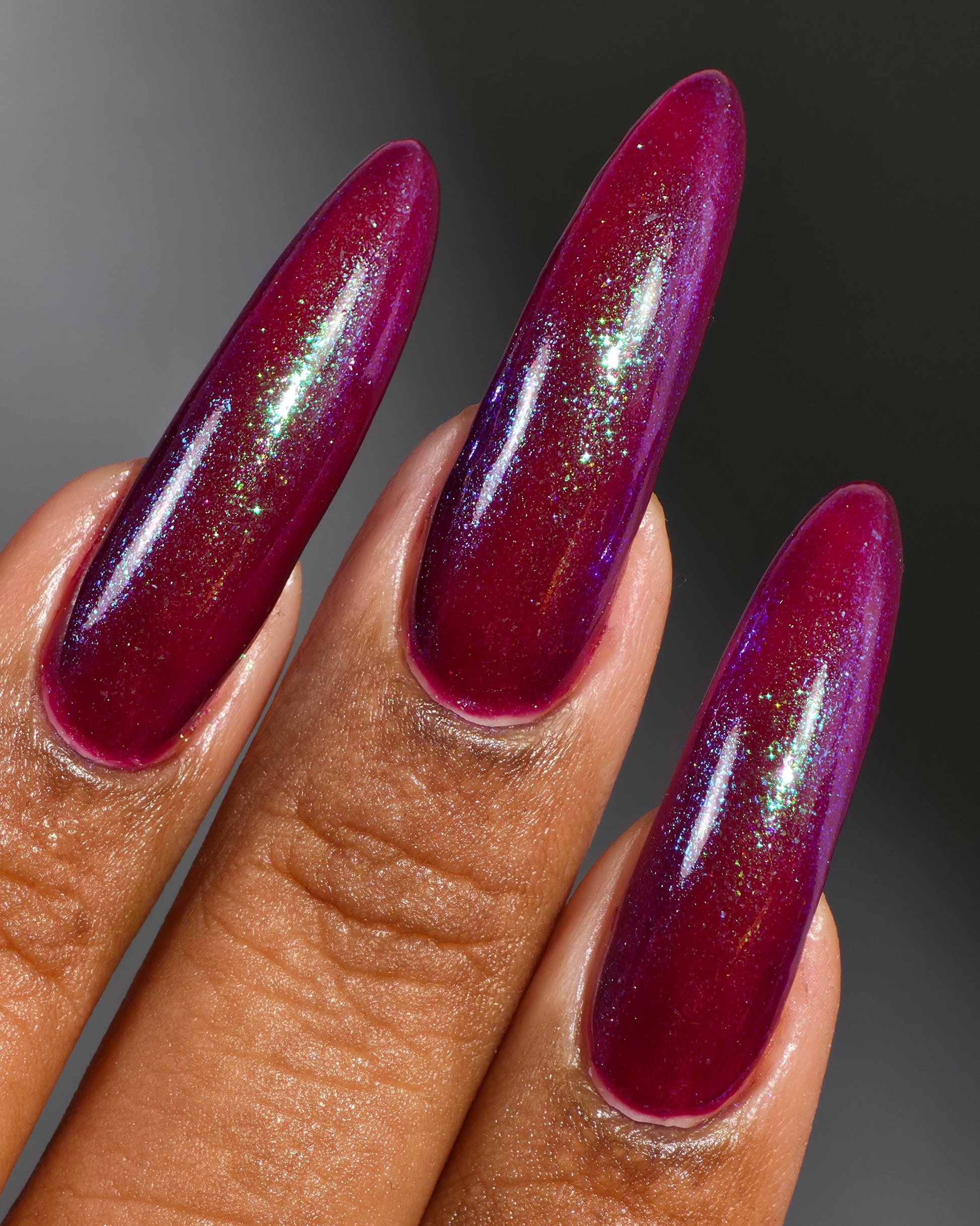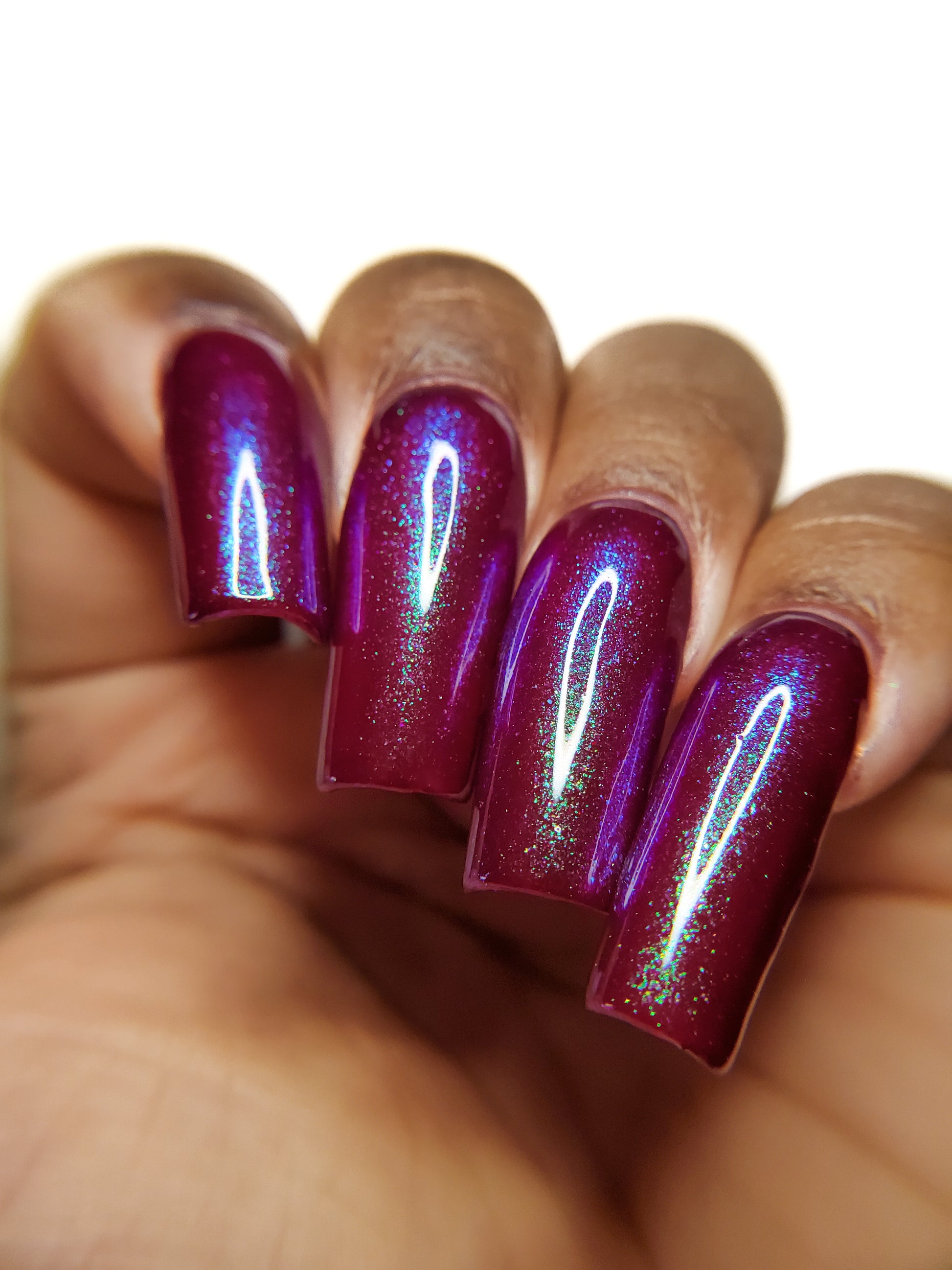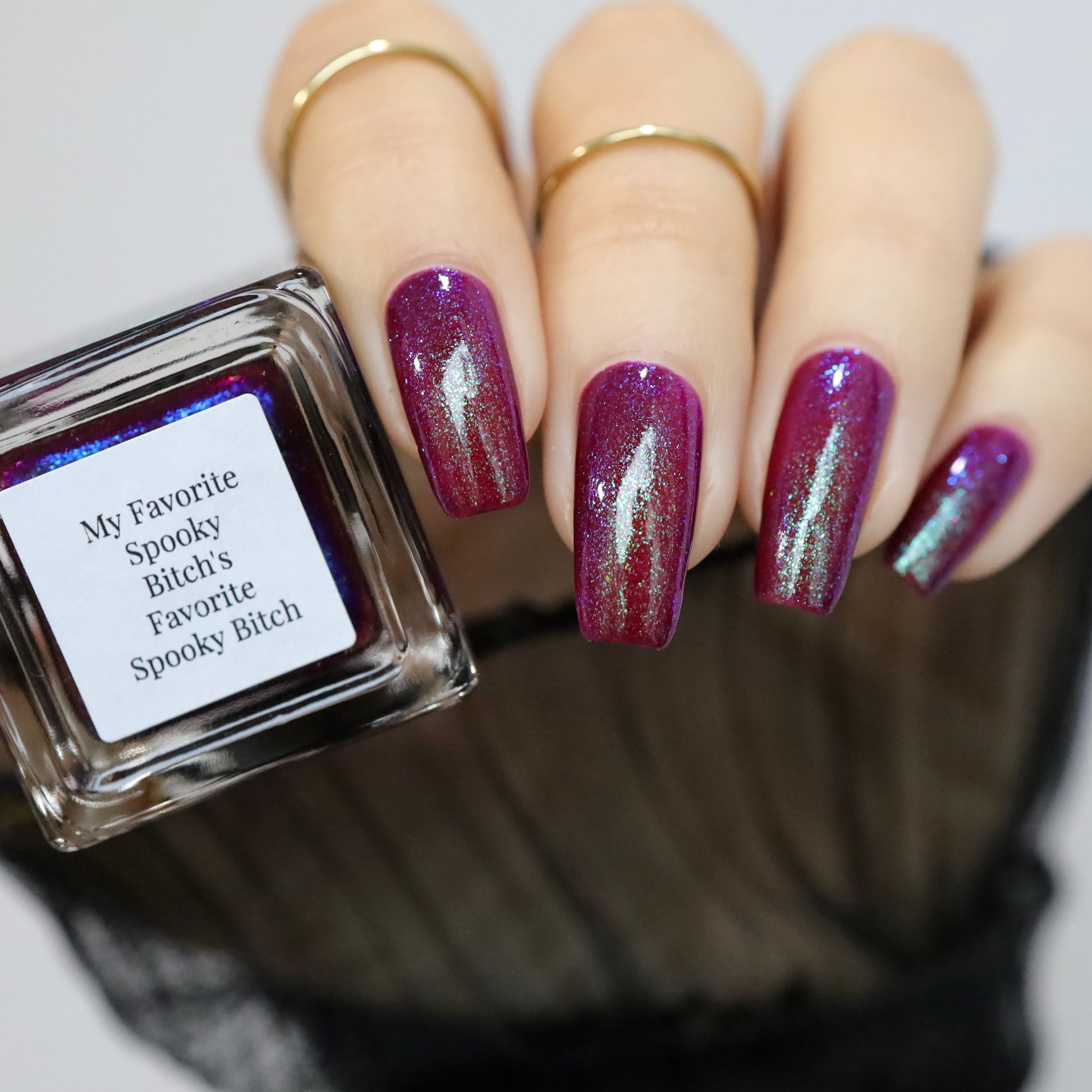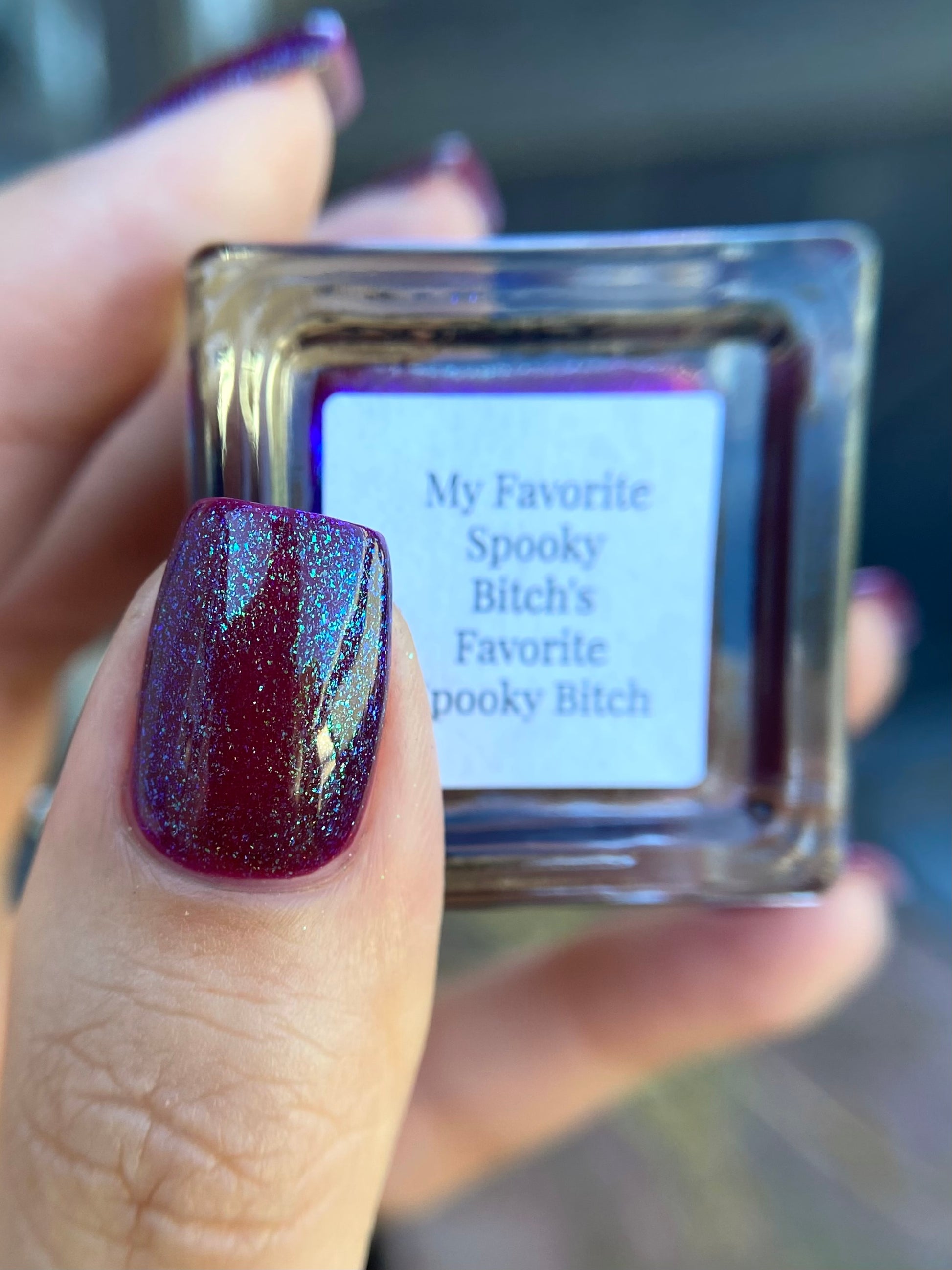 My Favorite Spooky B*tch's Favorite Spooky B*tch features a blackened maroon base with aurora microflake that shifts from green to blue and to purple at extremes