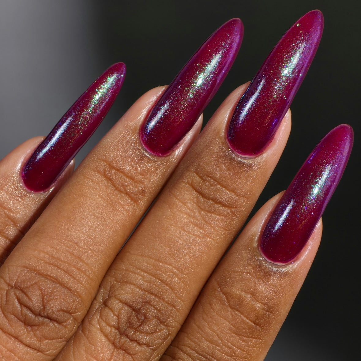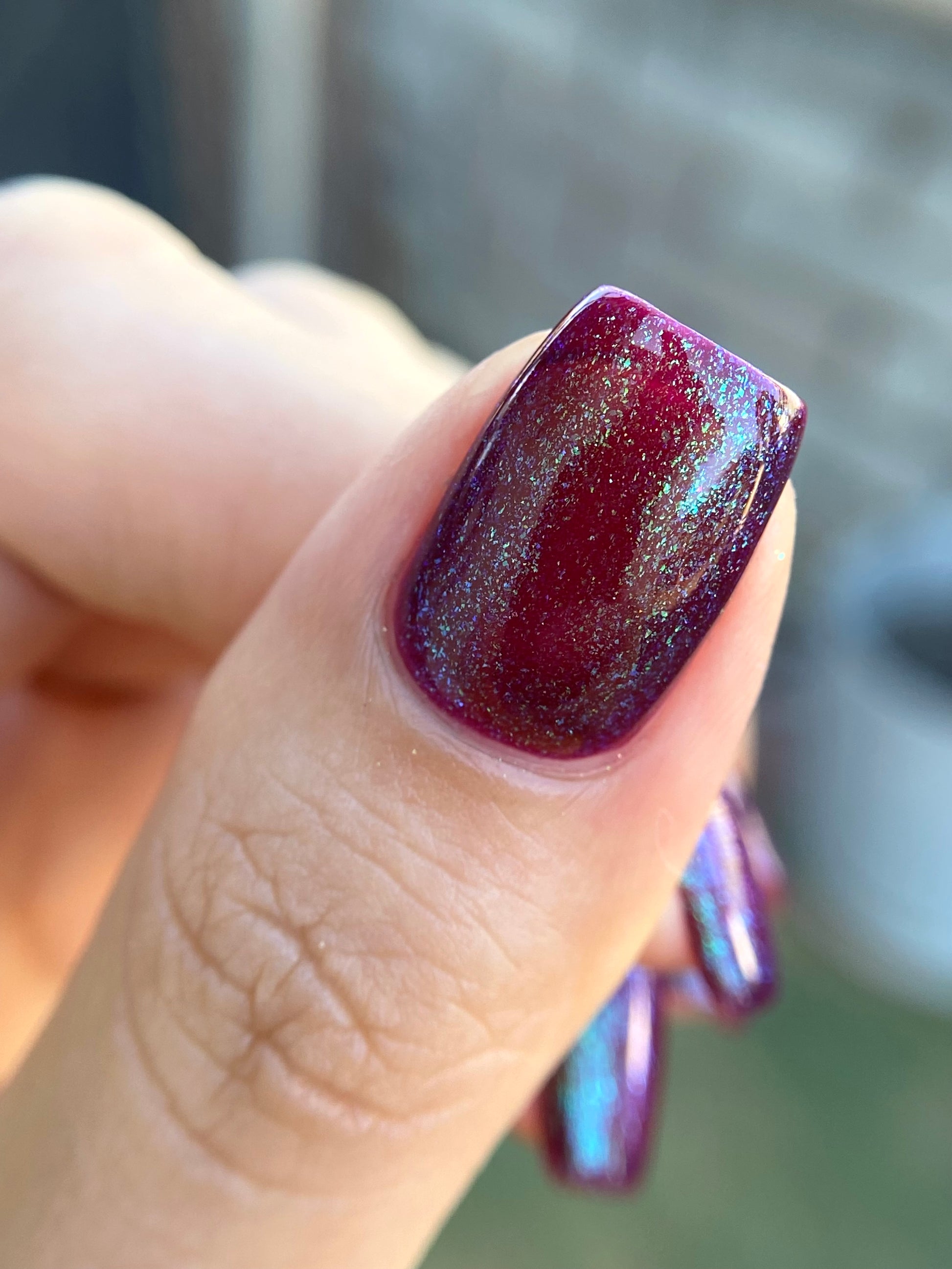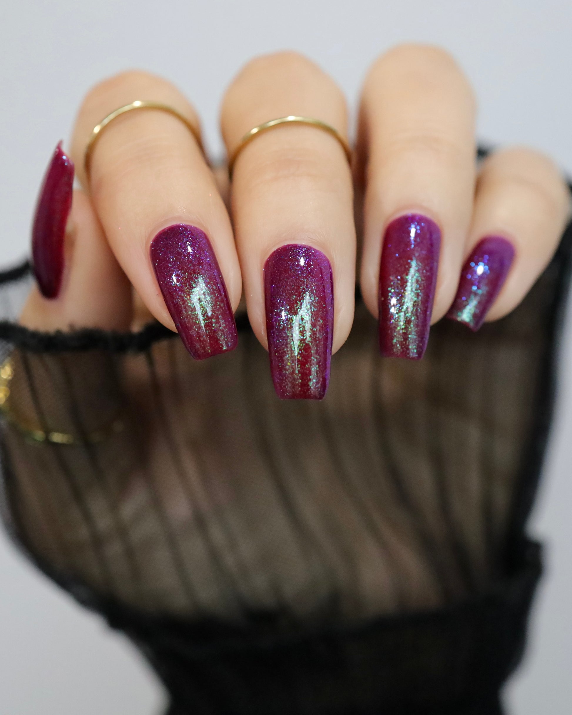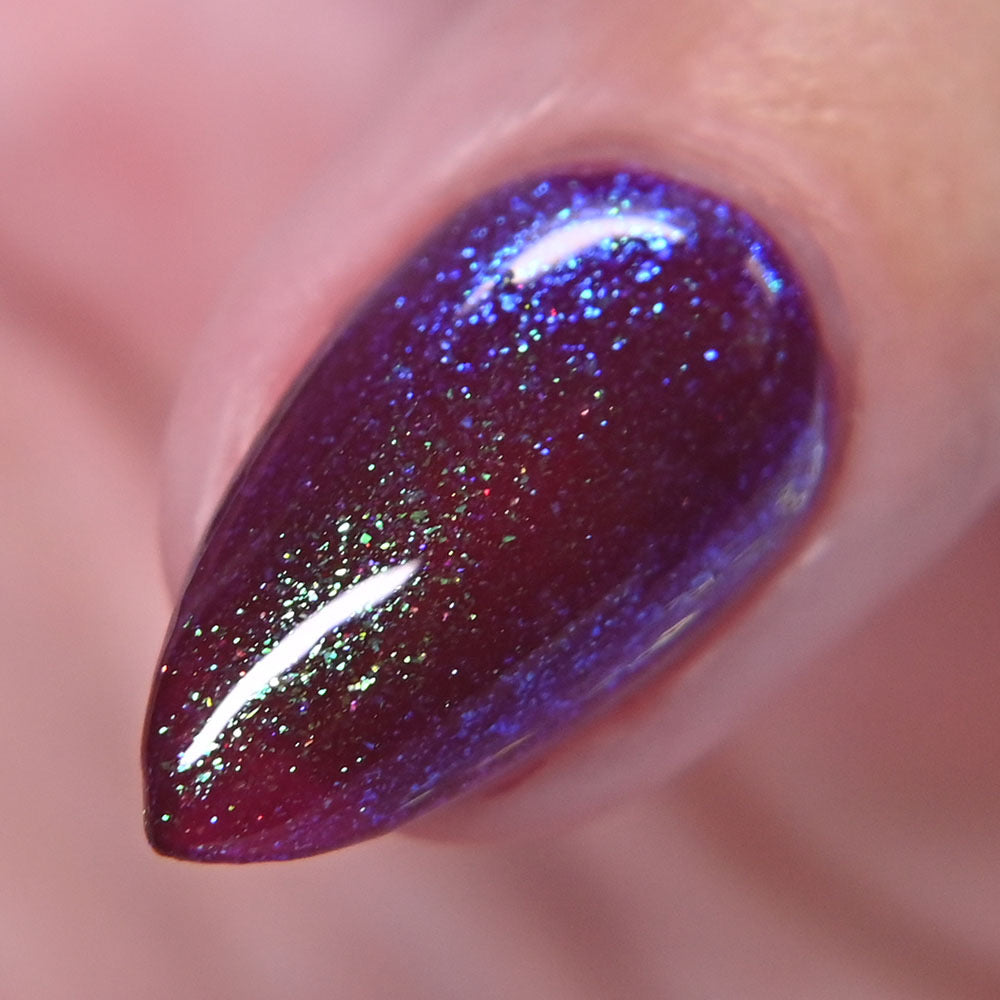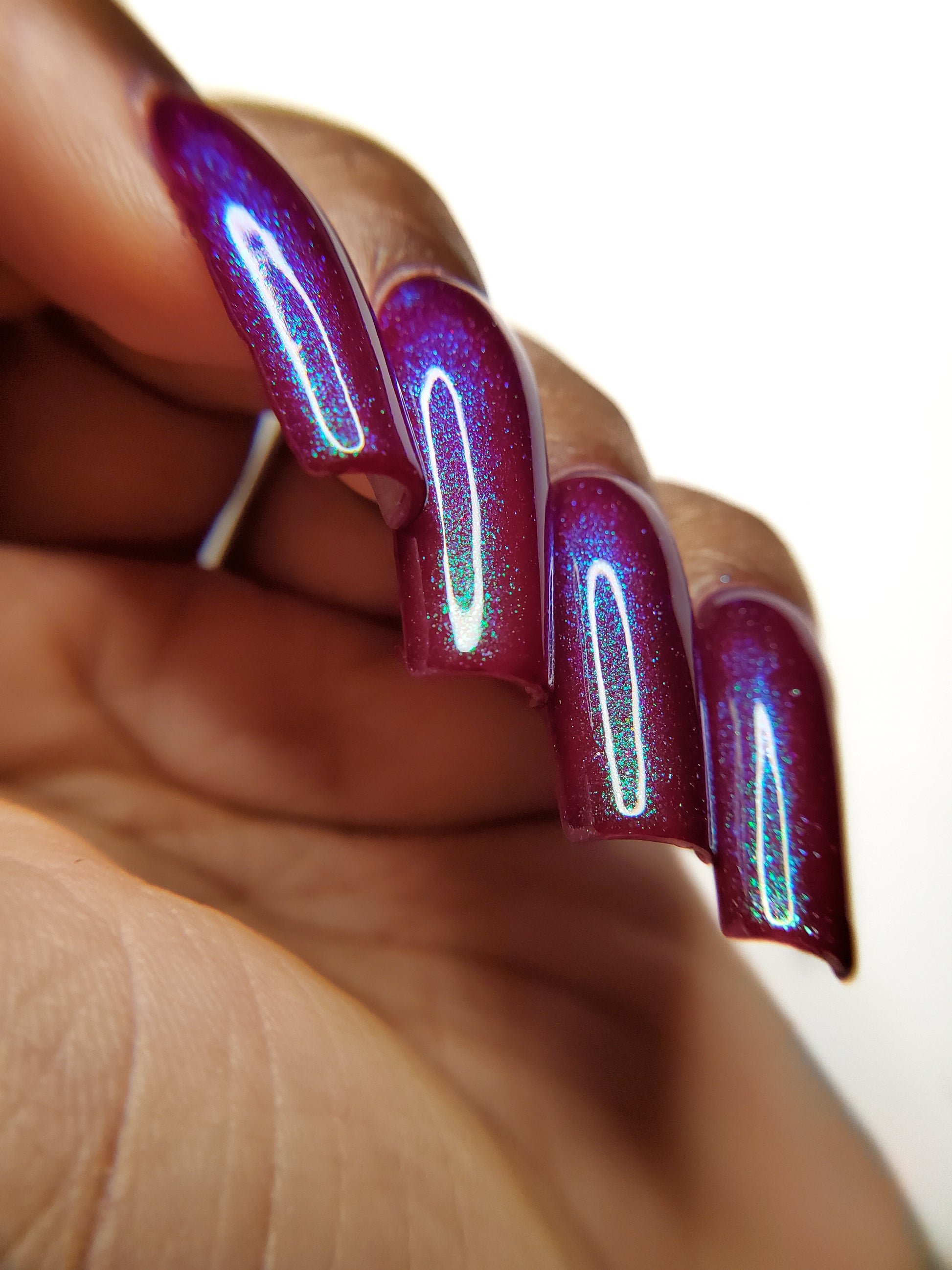 My Favorite Spooky B*tch's Favorite Spooky B*tch features a blackened maroon base with aurora microflake that shifts from green to blue and to purple at extremes