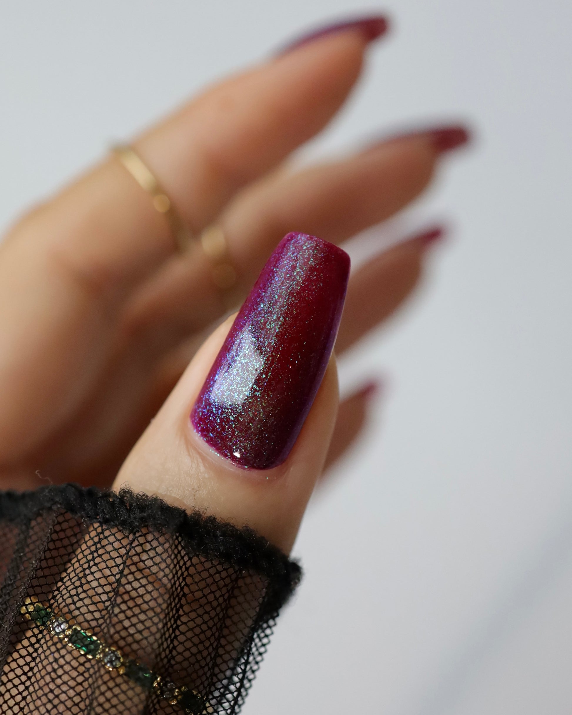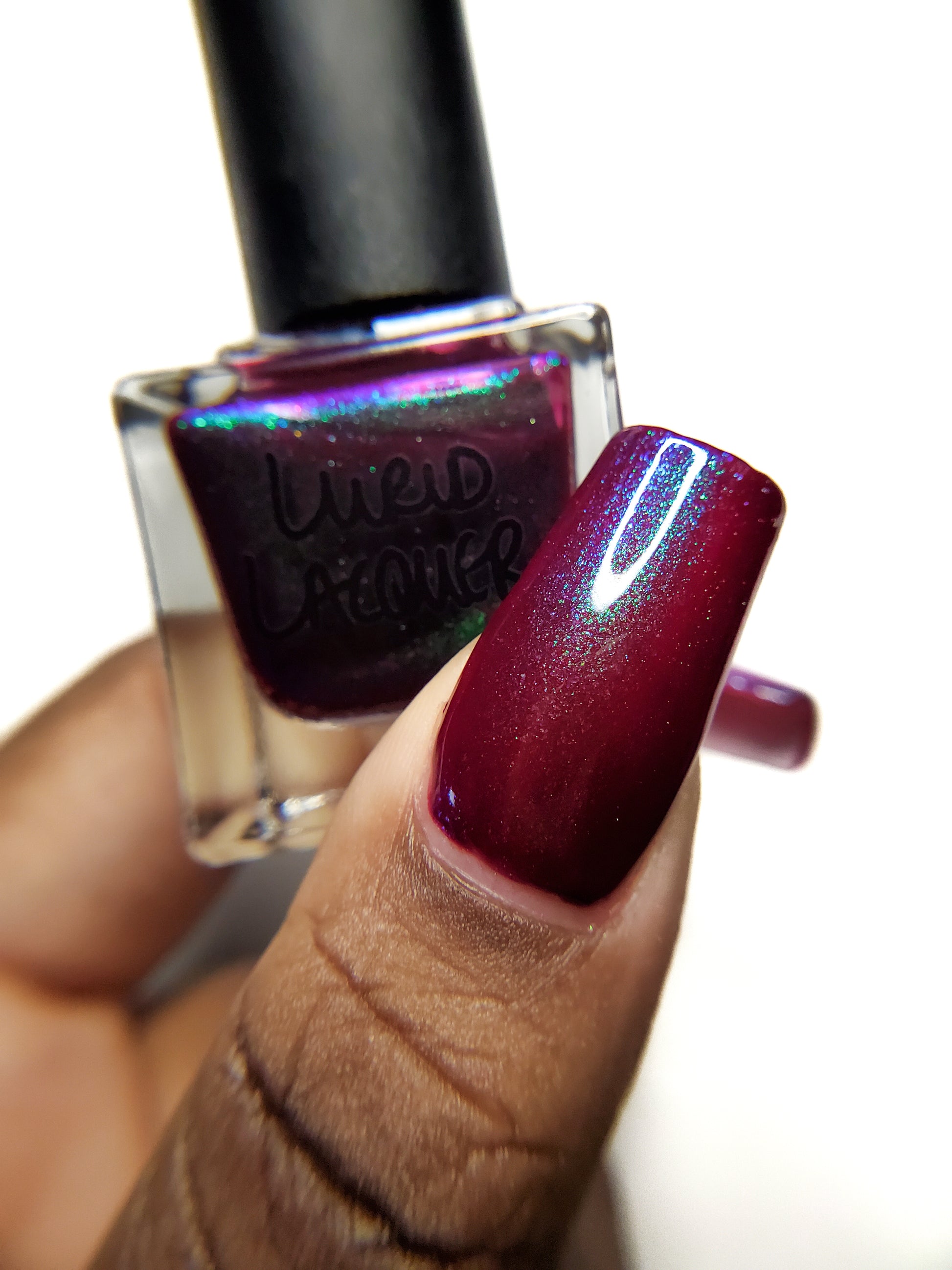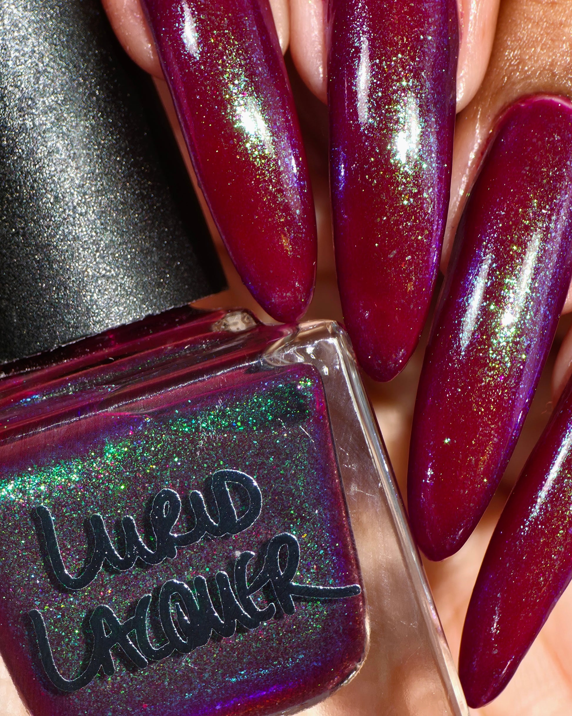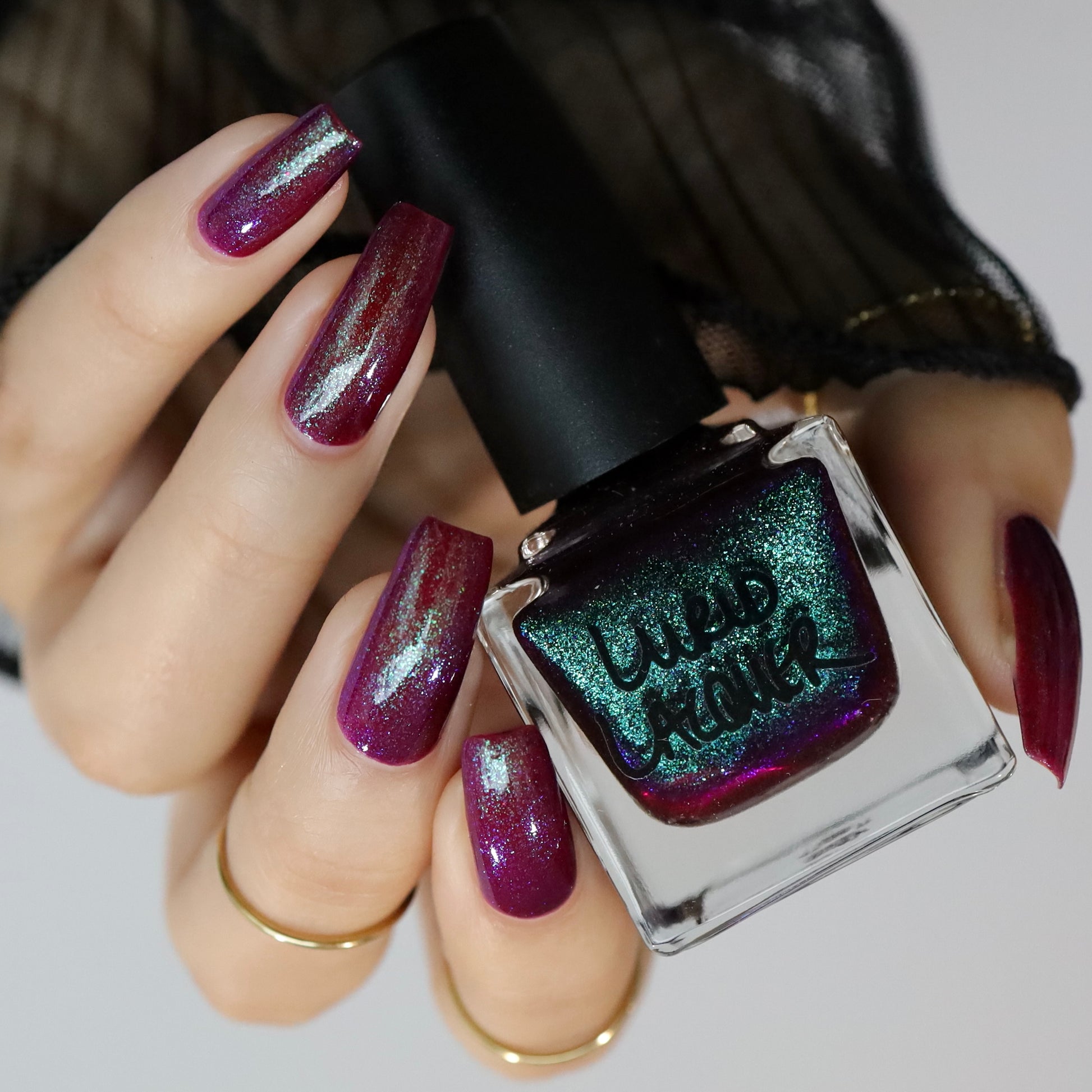 My Favorite Spooky B*tch's Favorite Spooky B*tch features a blackened maroon base with aurora microflake that shifts from green to blue and to purple at extremes