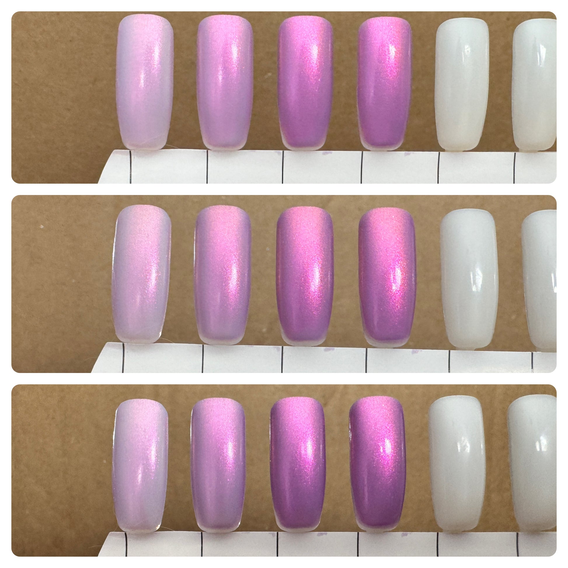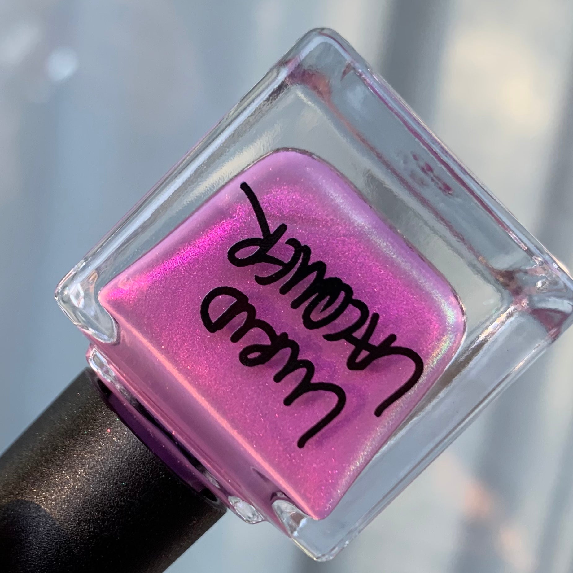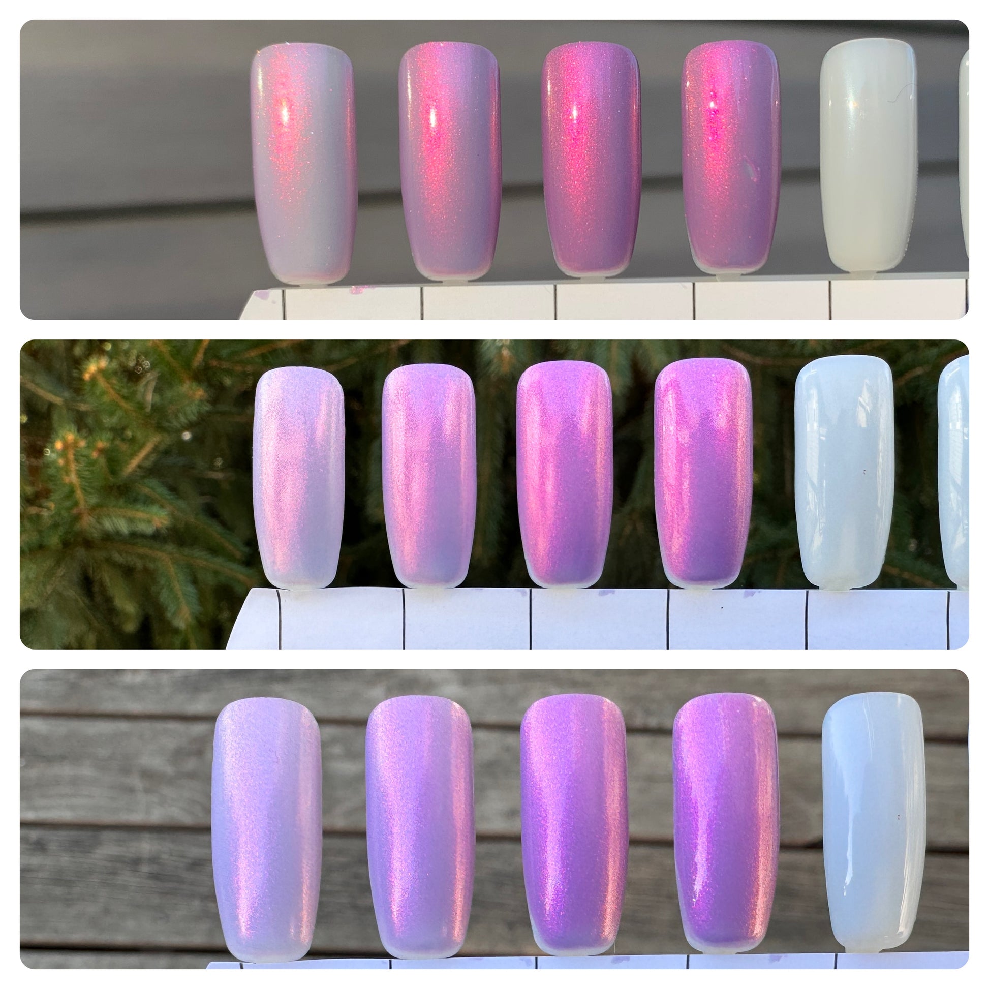 Cuddle Emergency features a dusty lavender base with vibrant pink to orange to gold aurora shimmer.