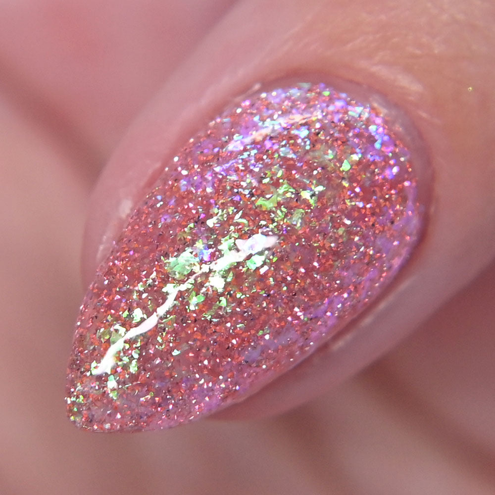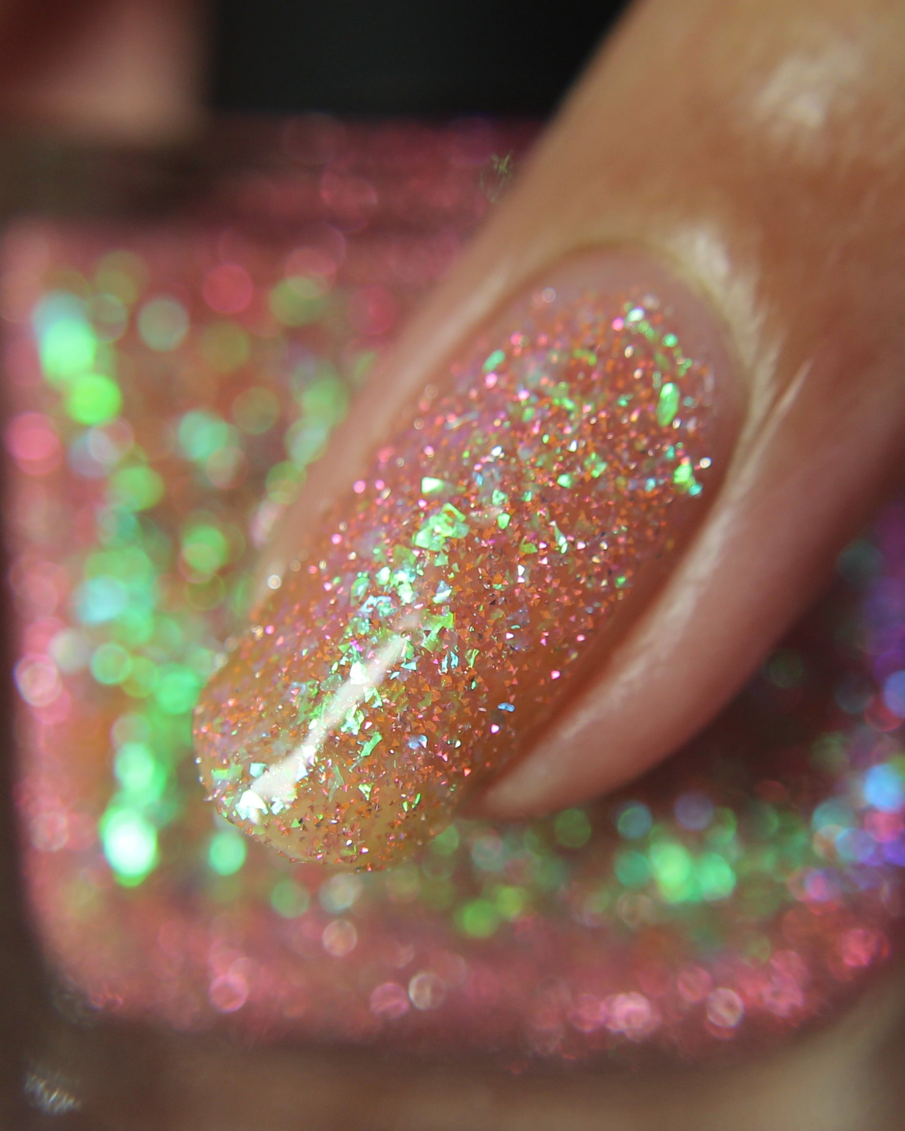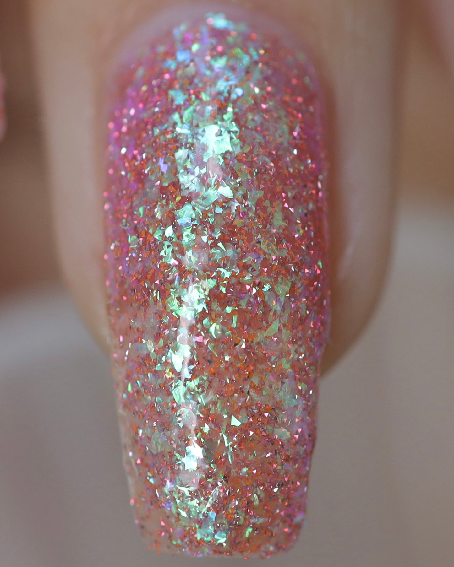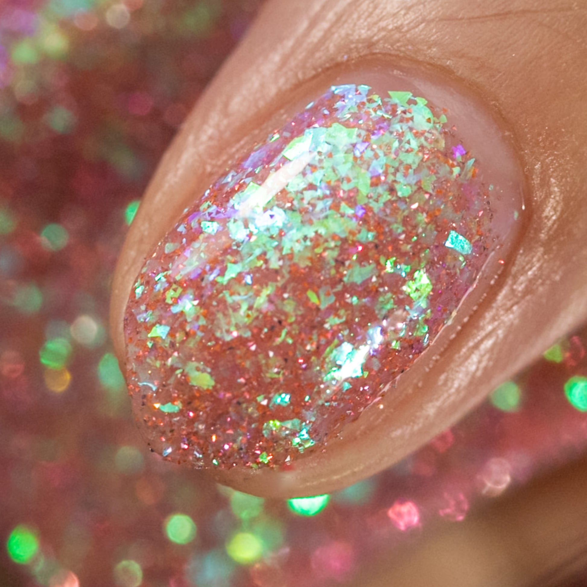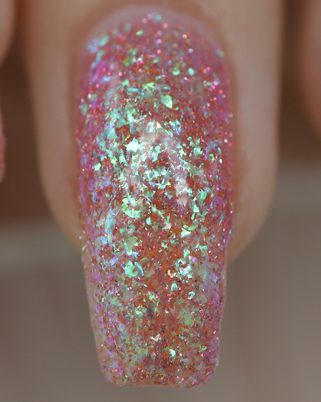 A clear base packed with green to purple to pink iridescent flakies and coral light reflective glitter
