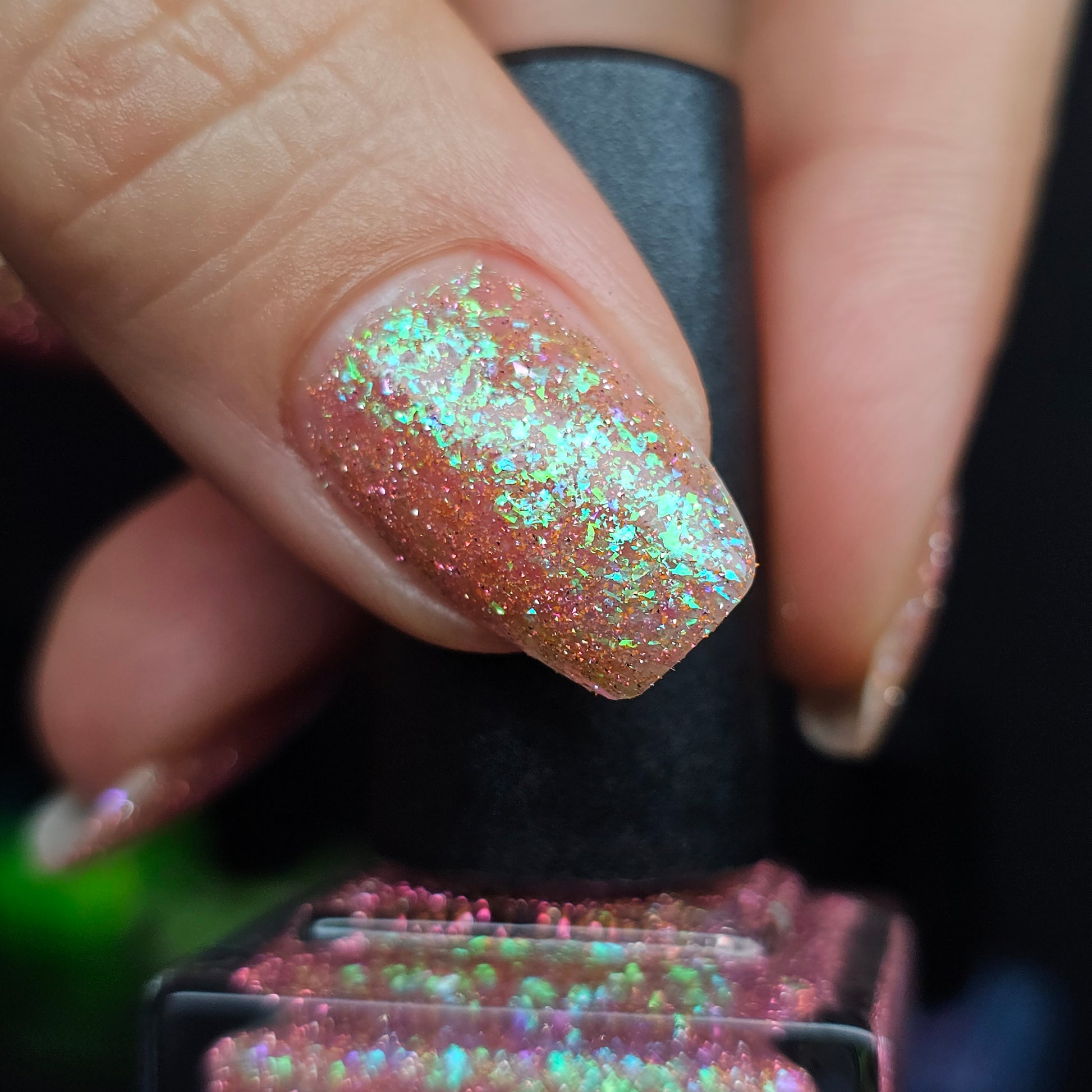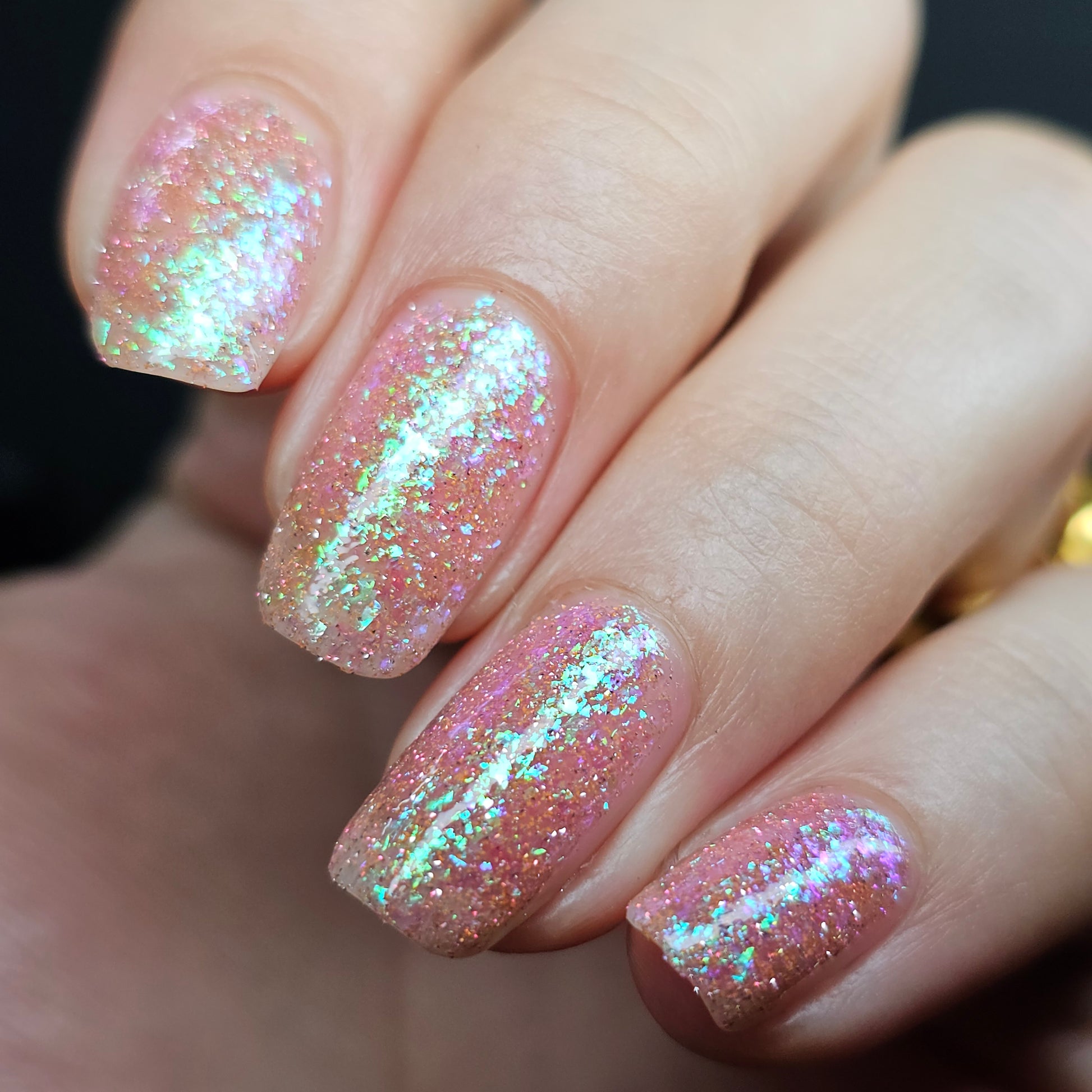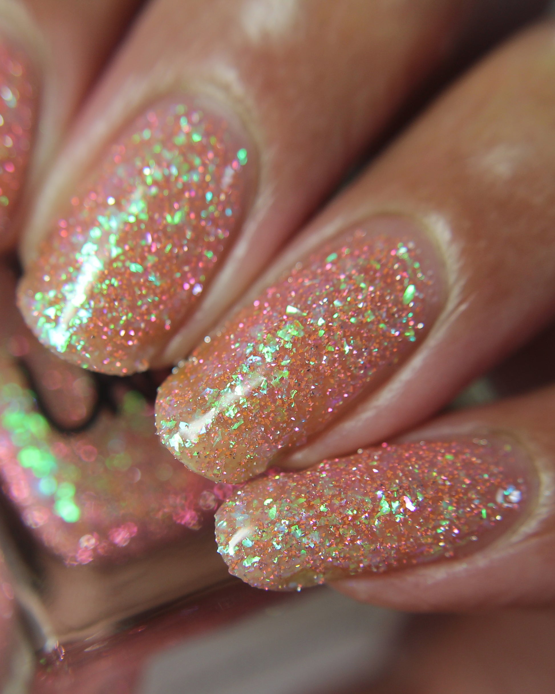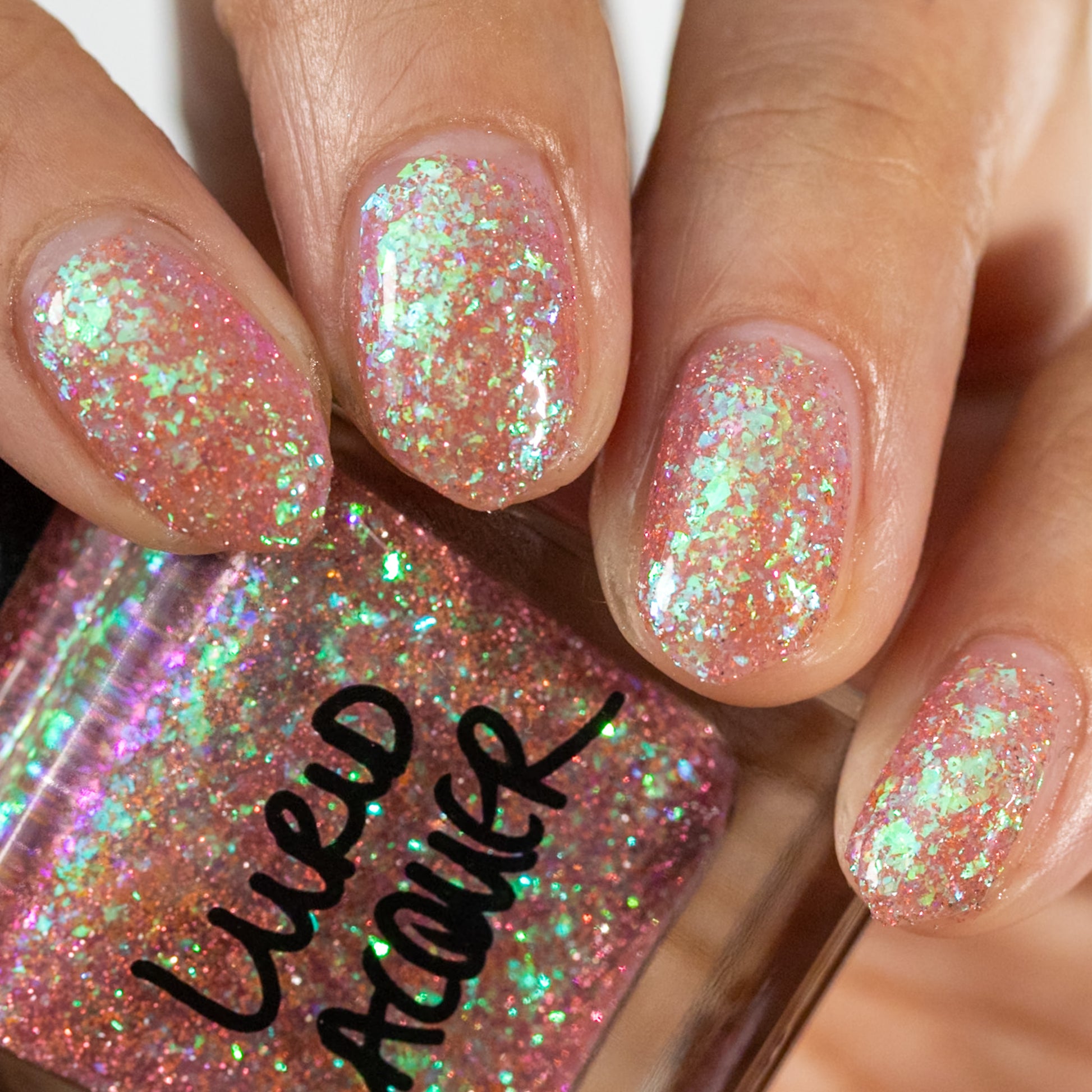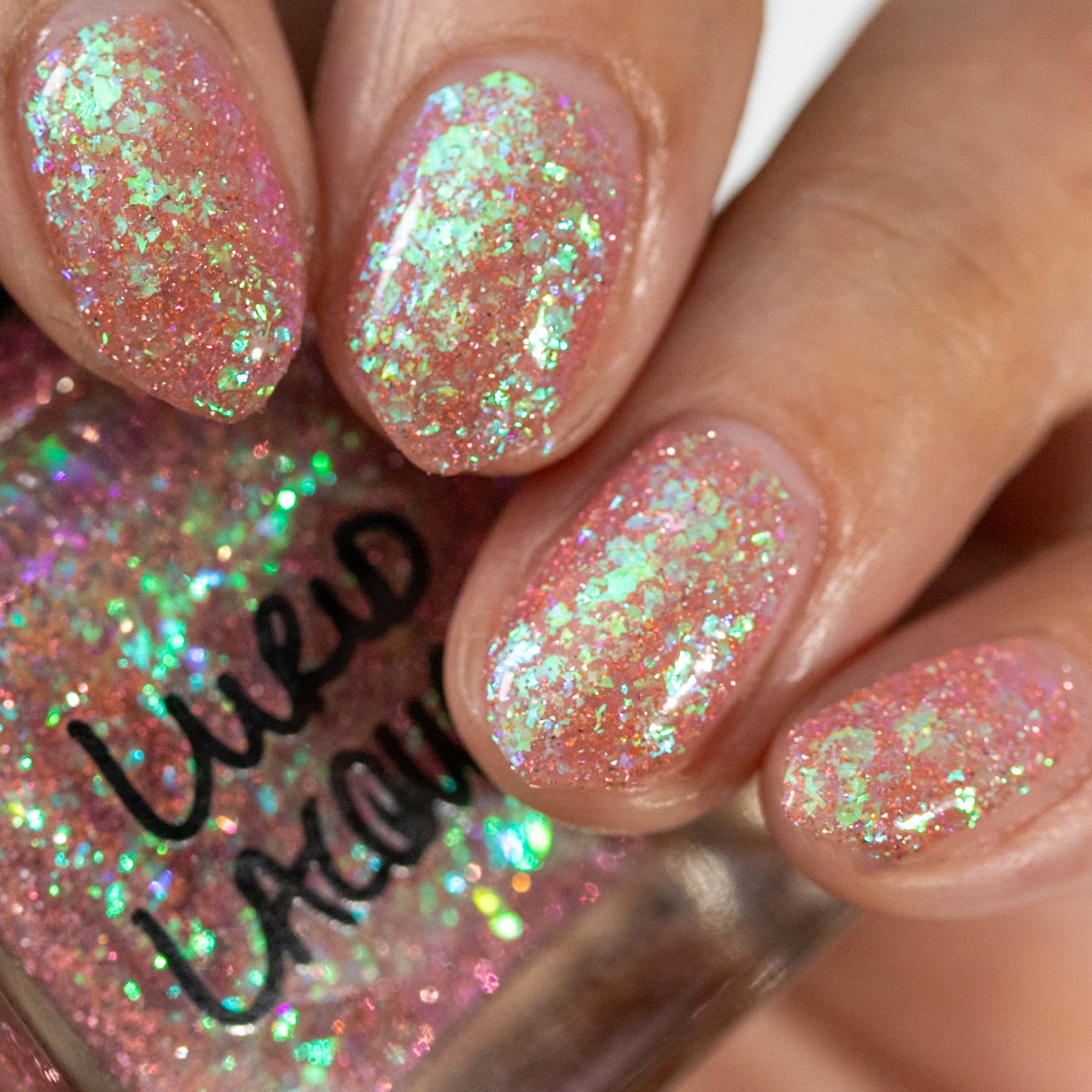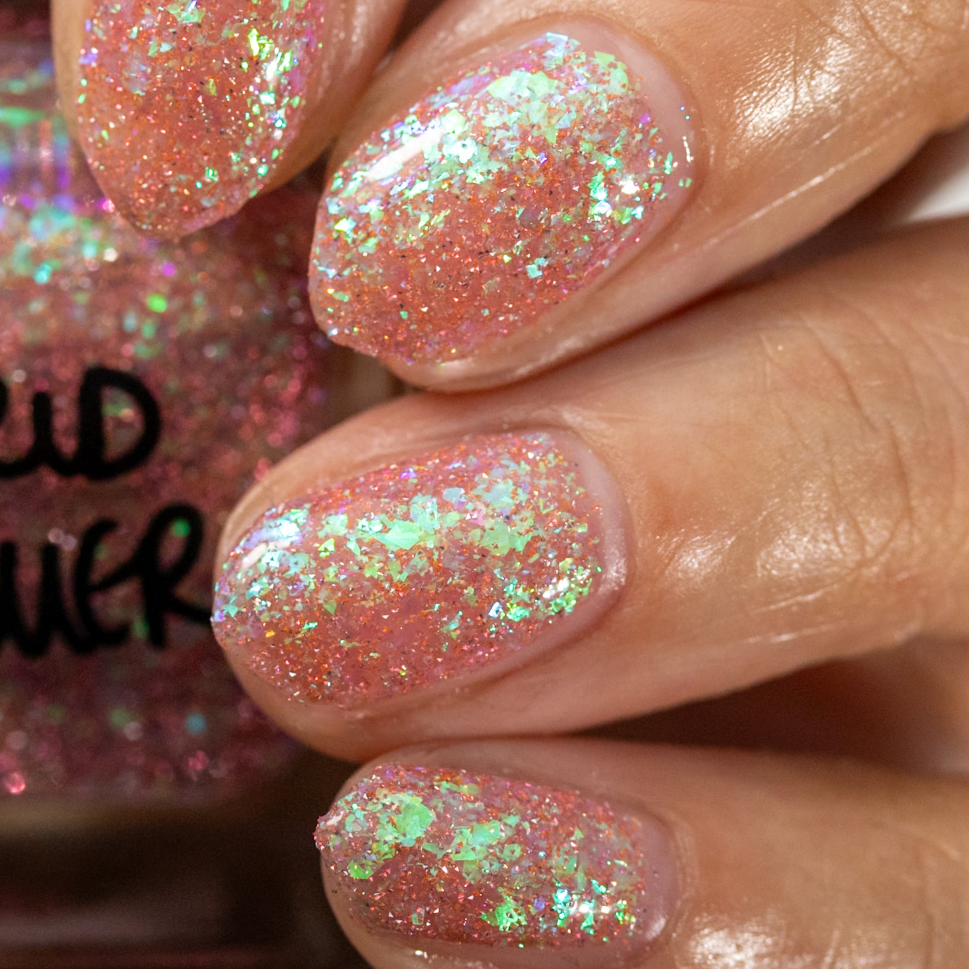 A clear base packed with green to purple to pink iridescent flakies and coral light reflective glitter