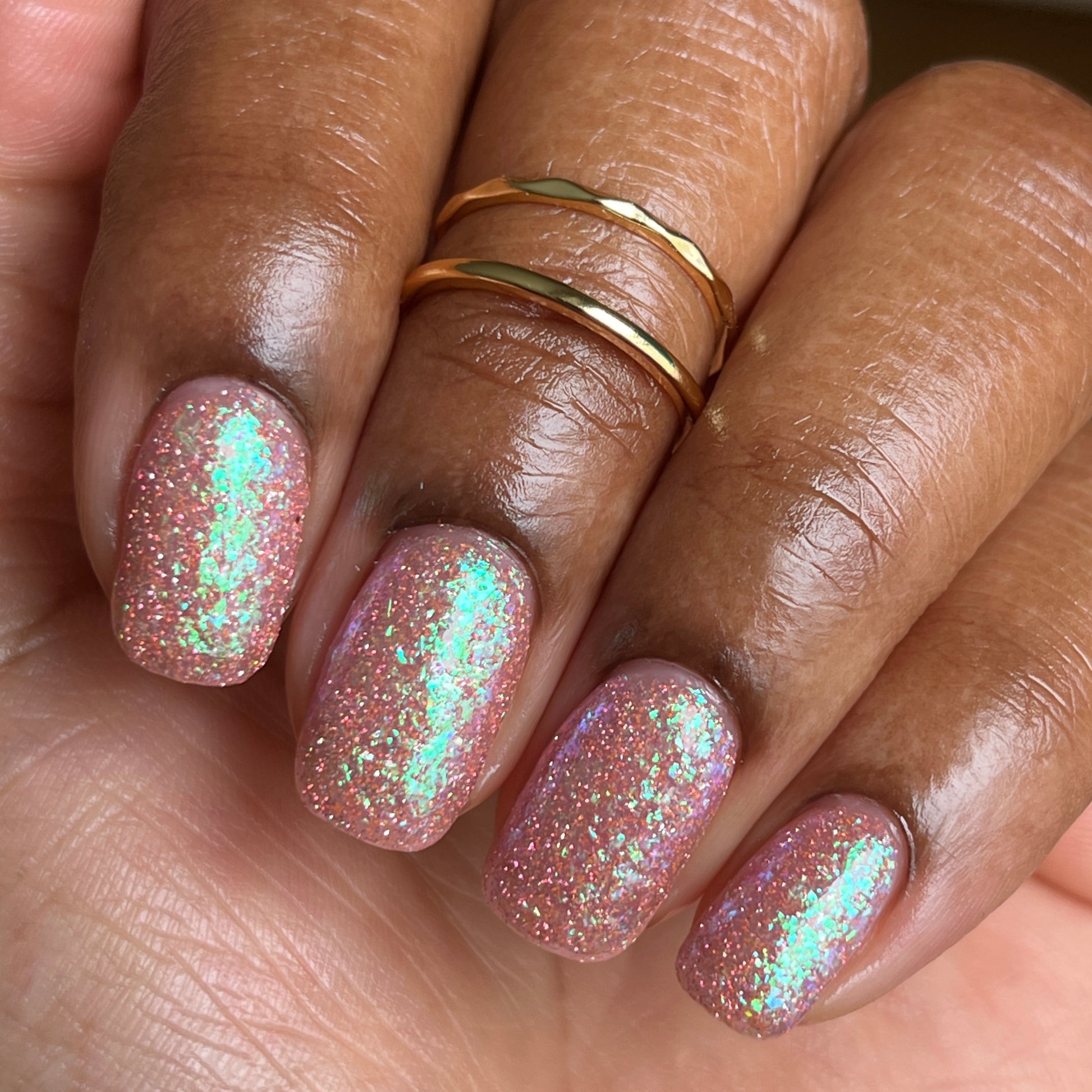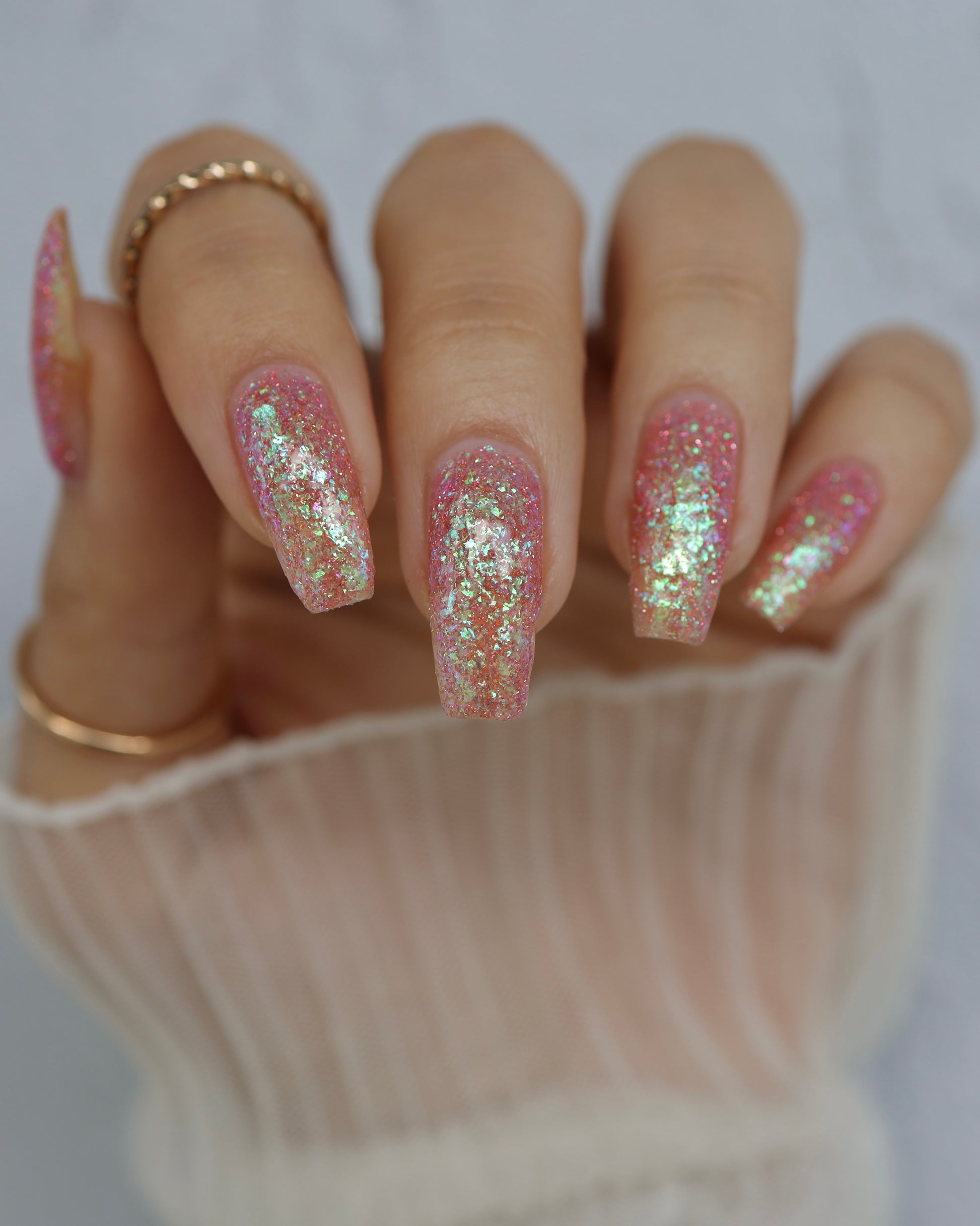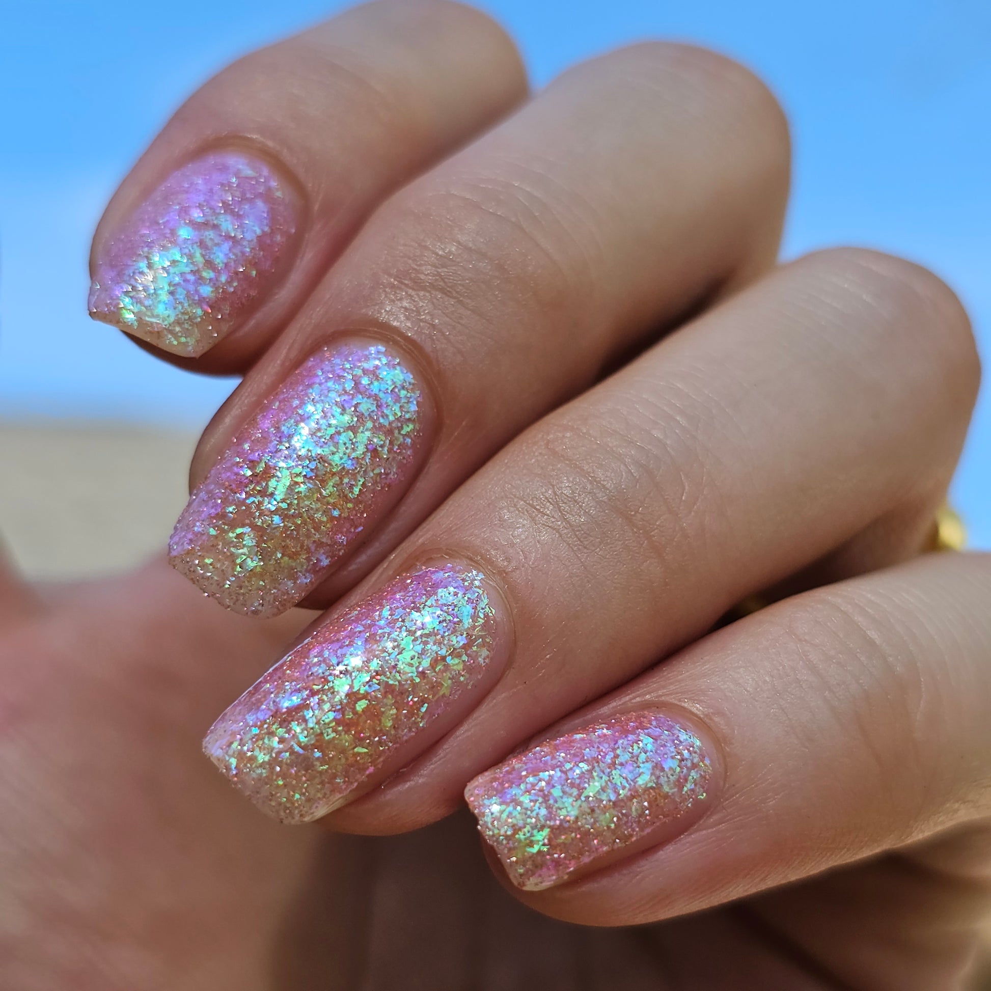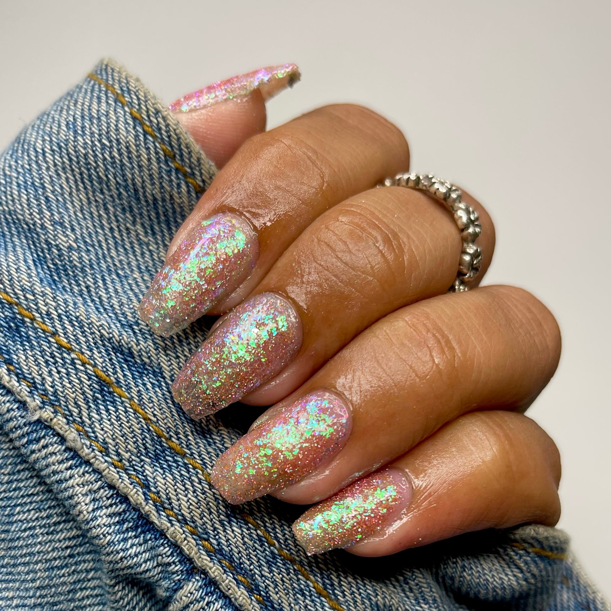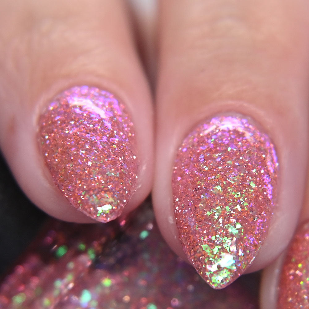 A clear base packed with green to purple to pink iridescent flakies and coral light reflective glitter