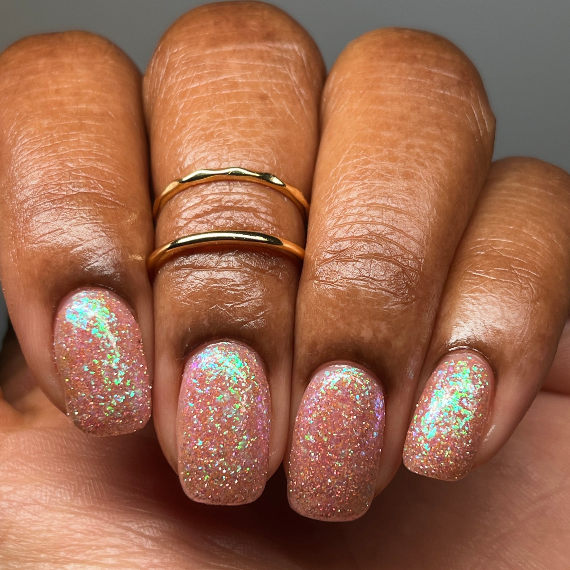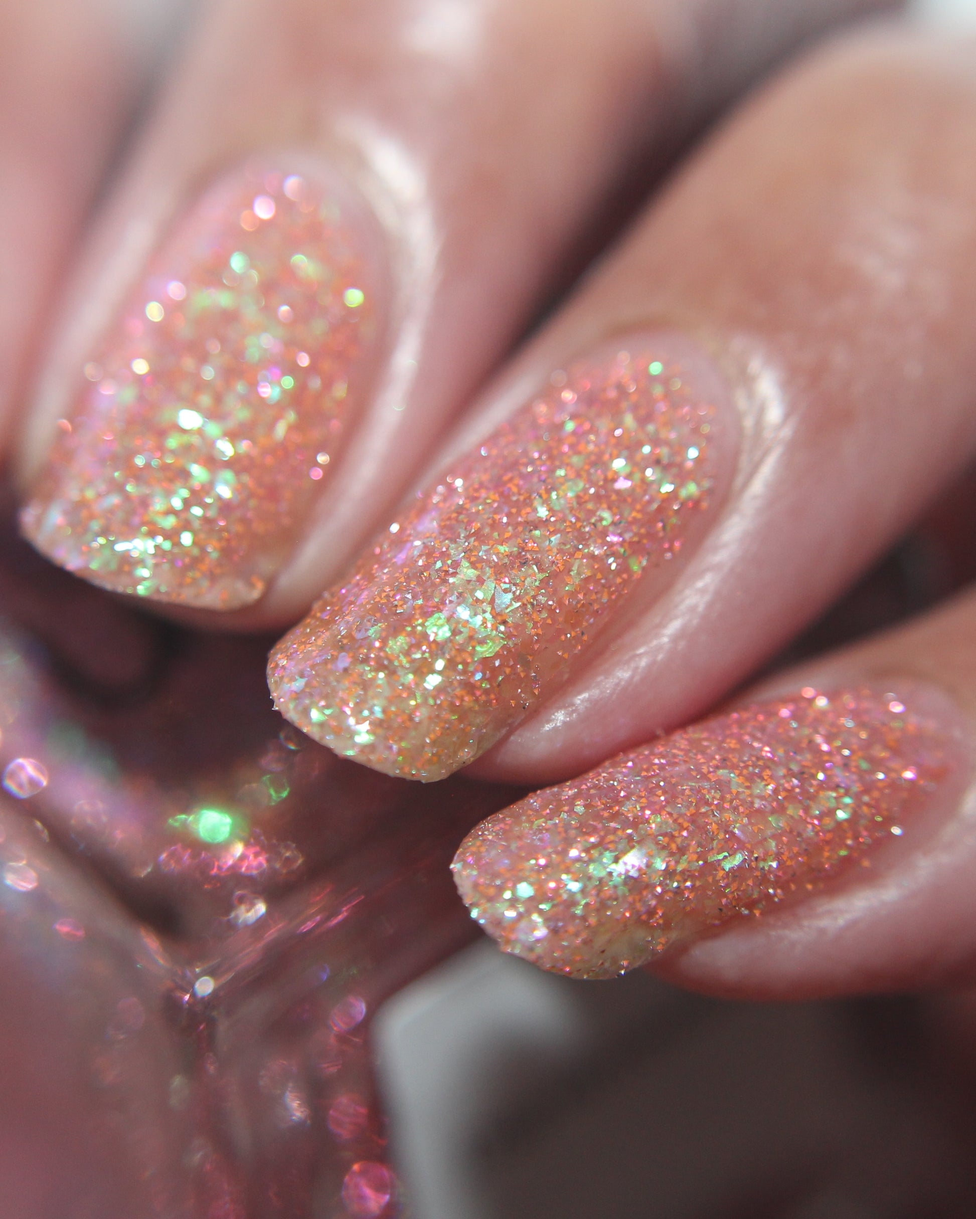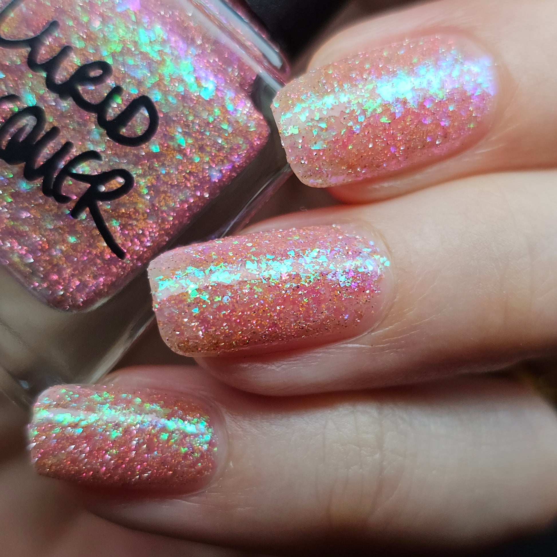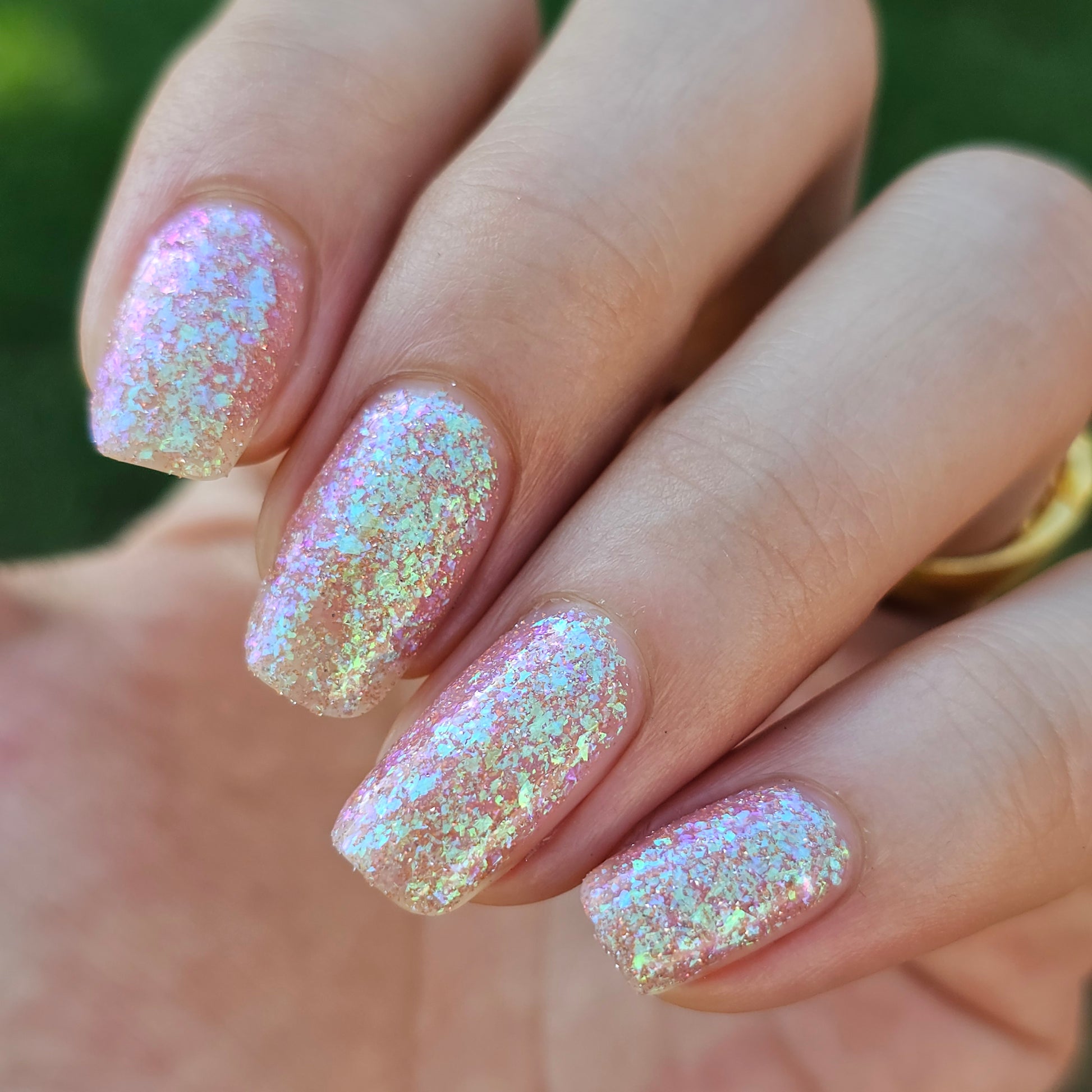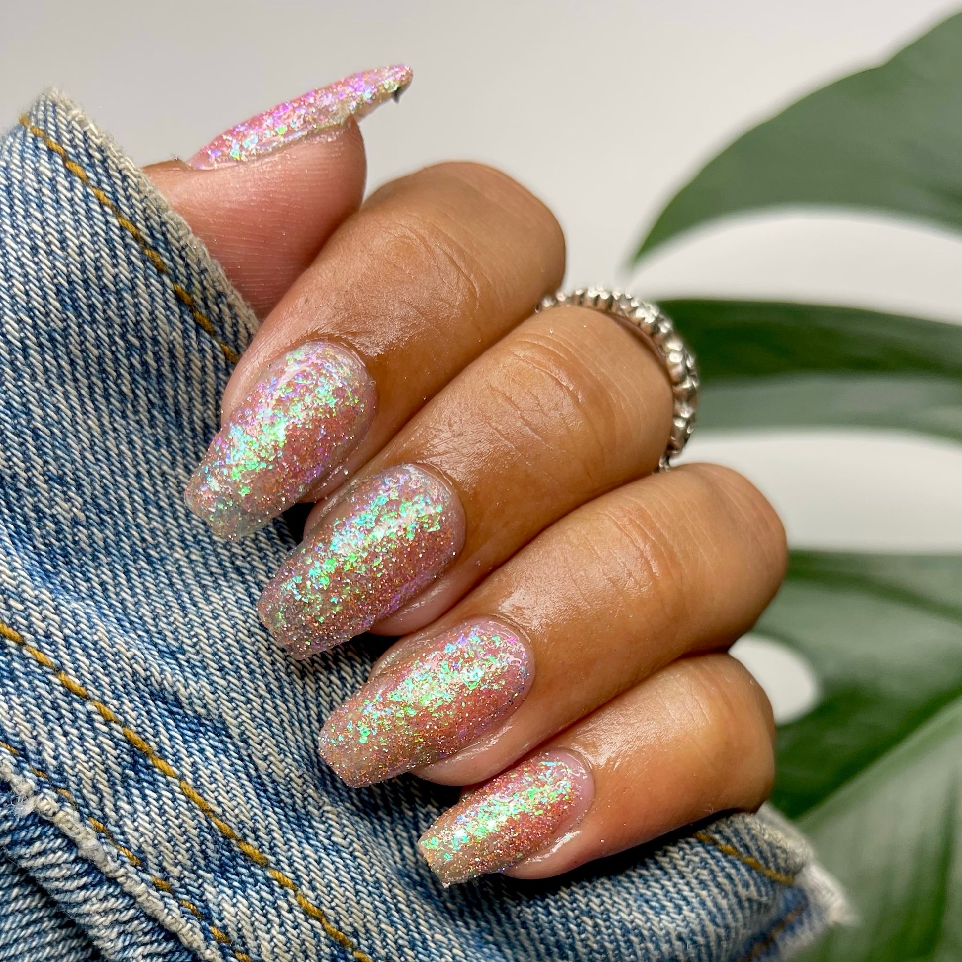 A clear base packed with green to purple to pink iridescent flakies and coral light reflective glitter