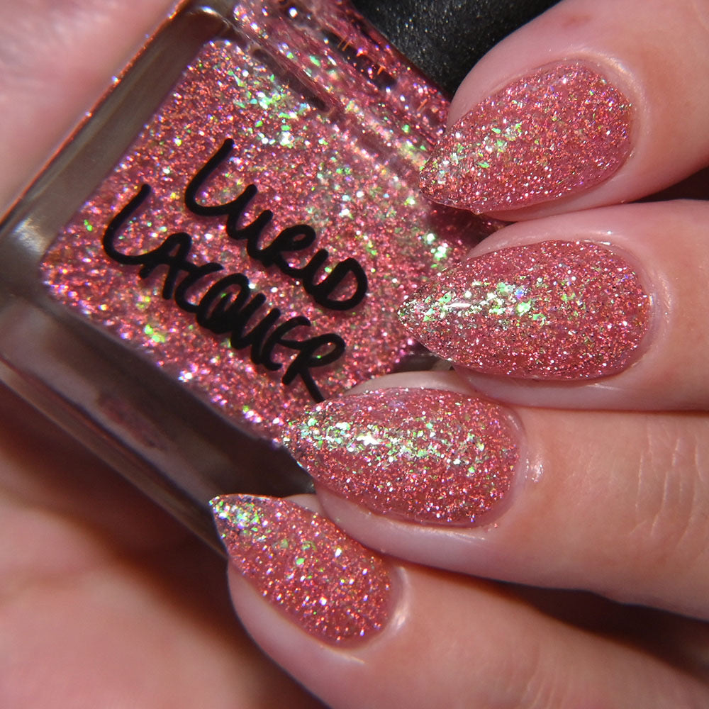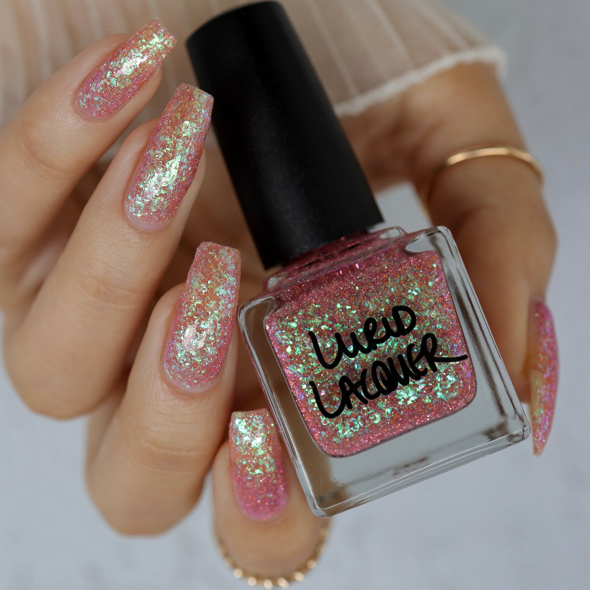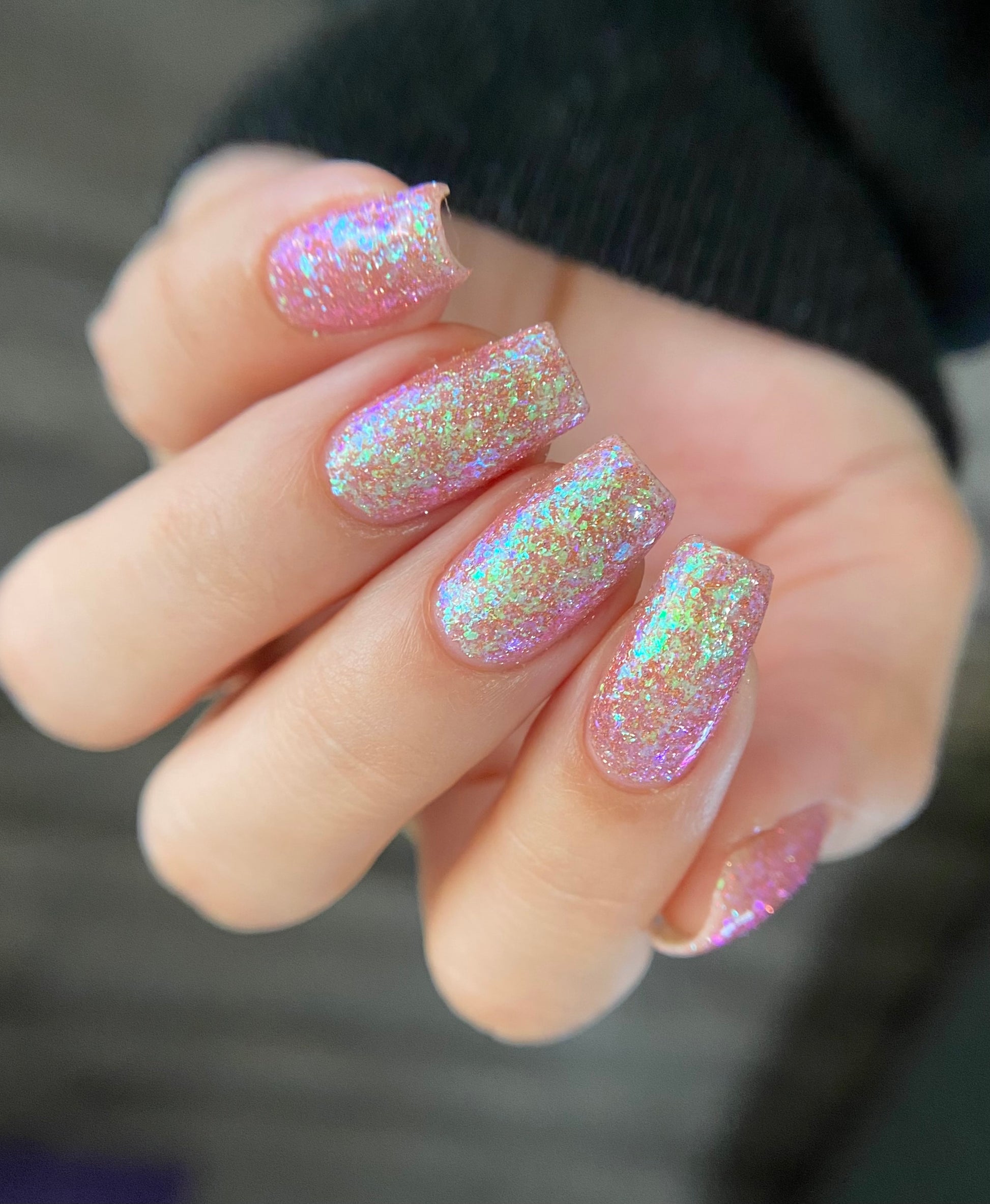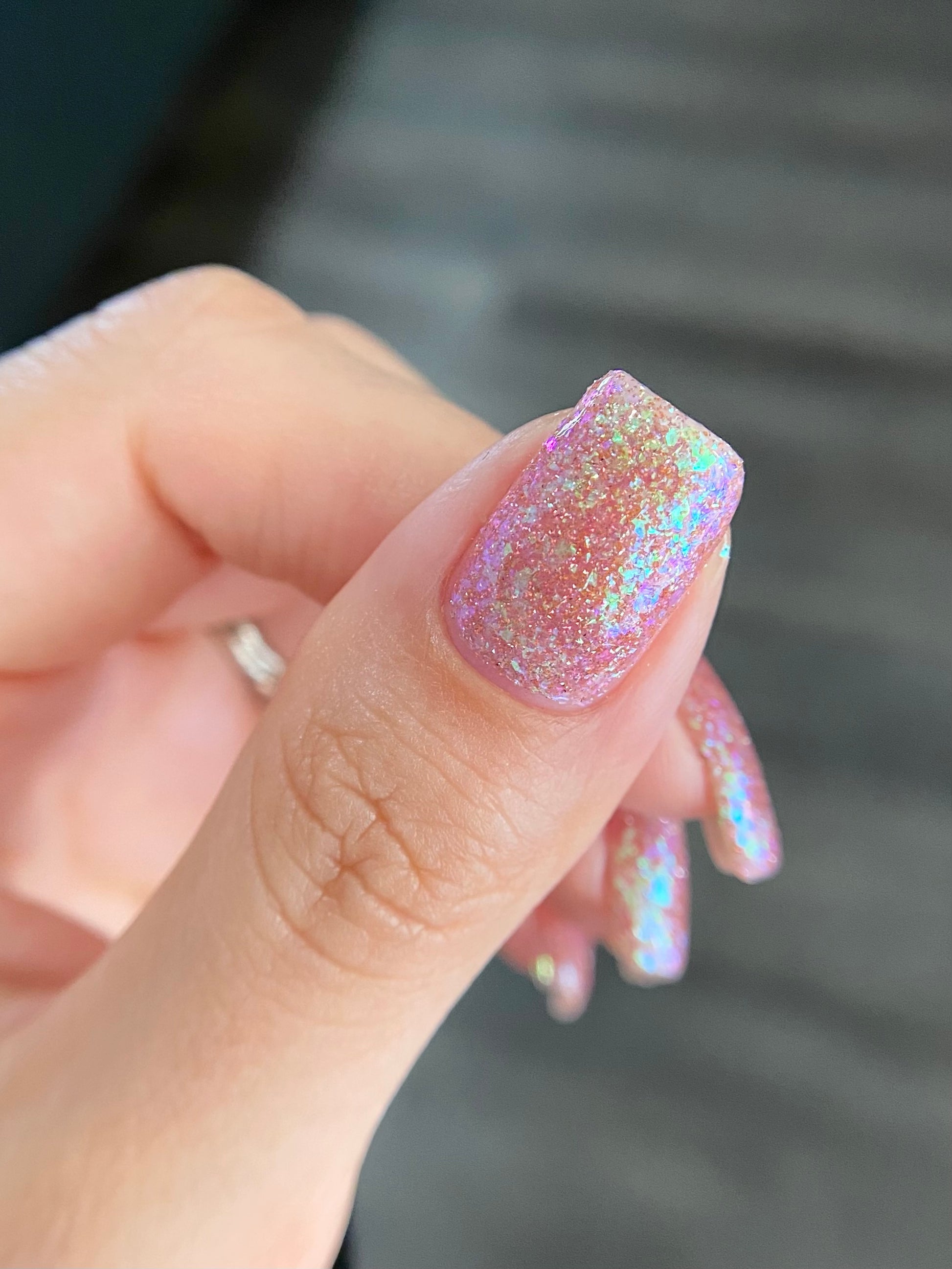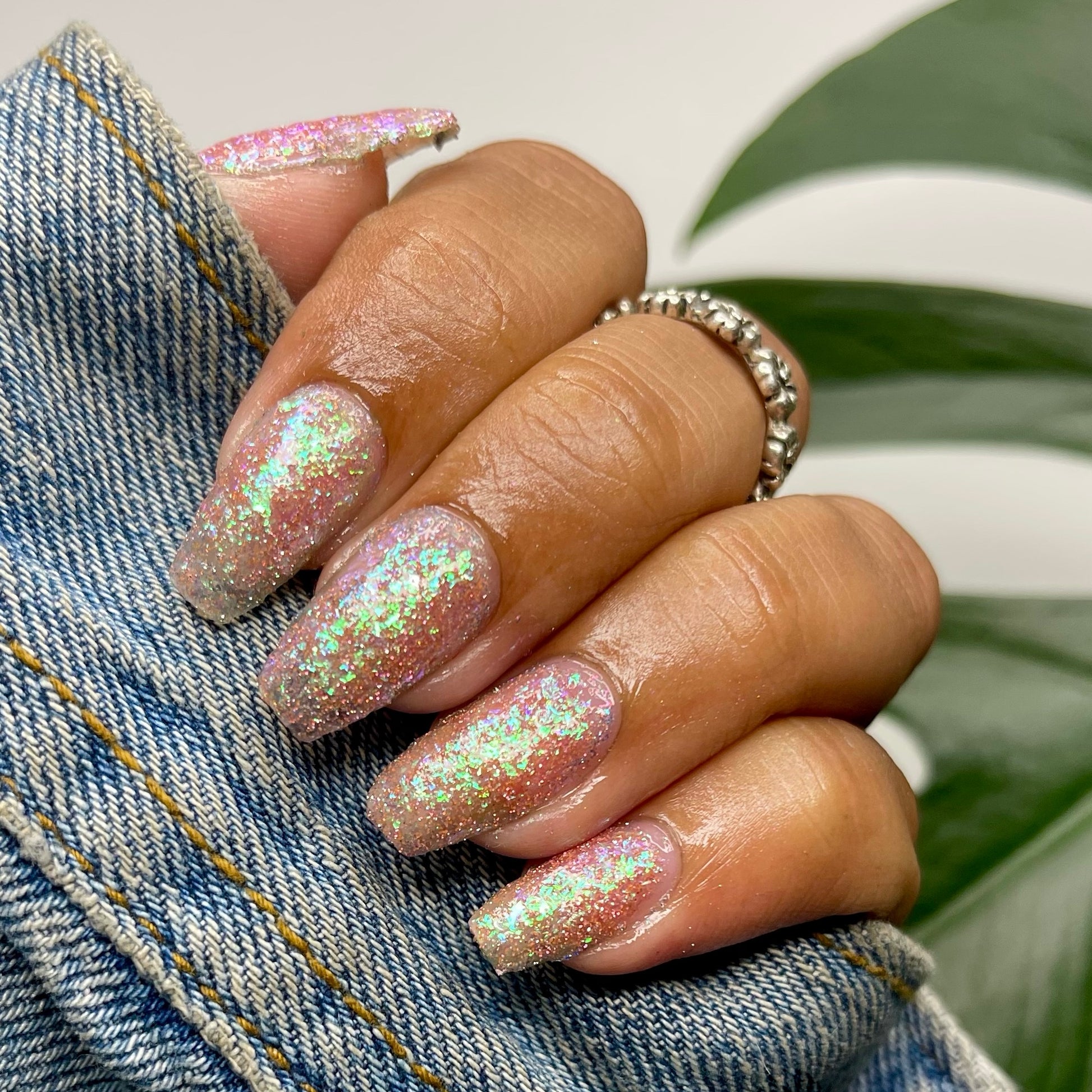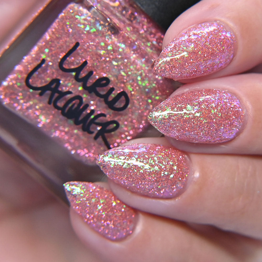 A clear base packed with green to purple to pink iridescent flakies and coral light reflective glitter