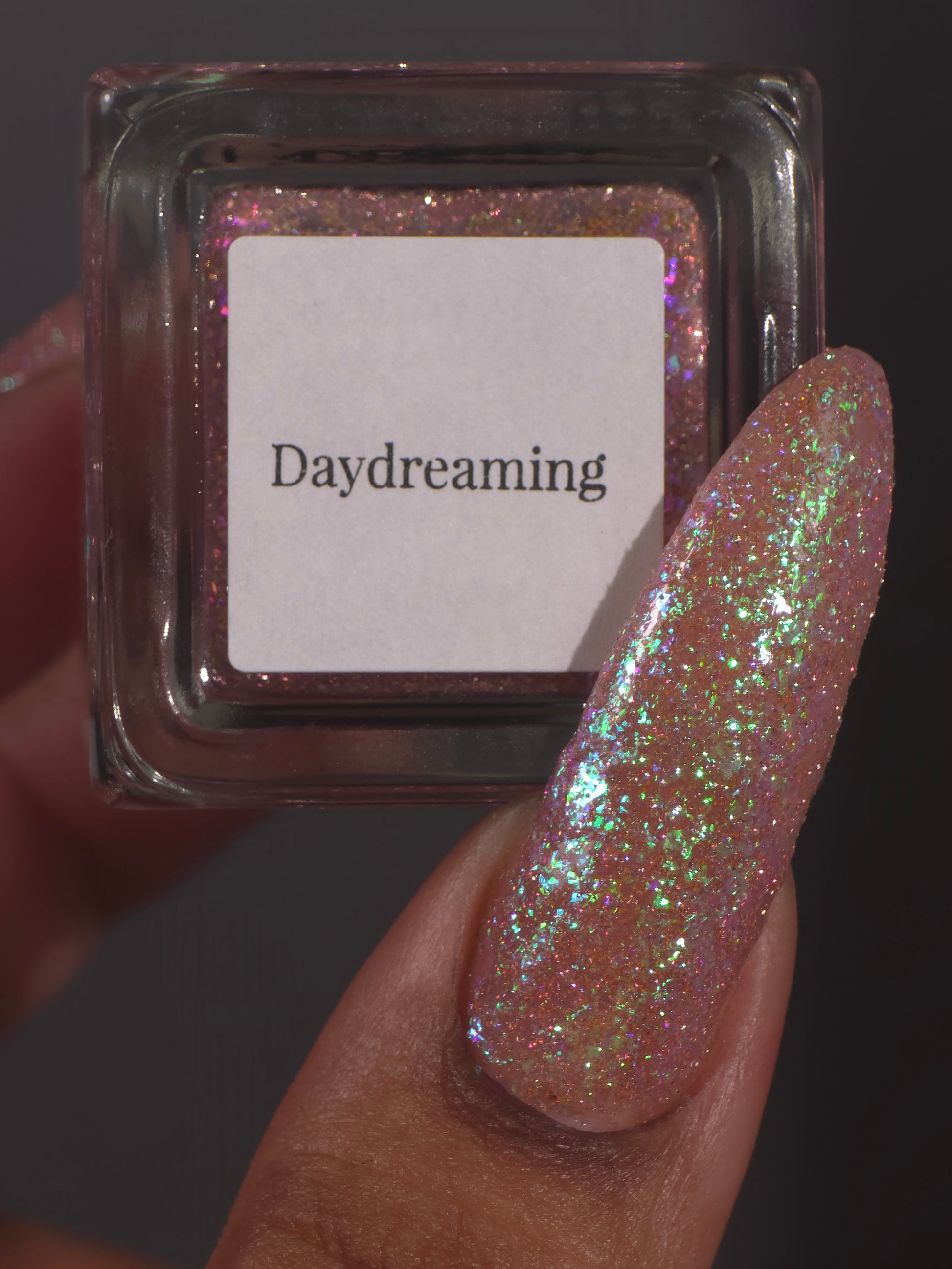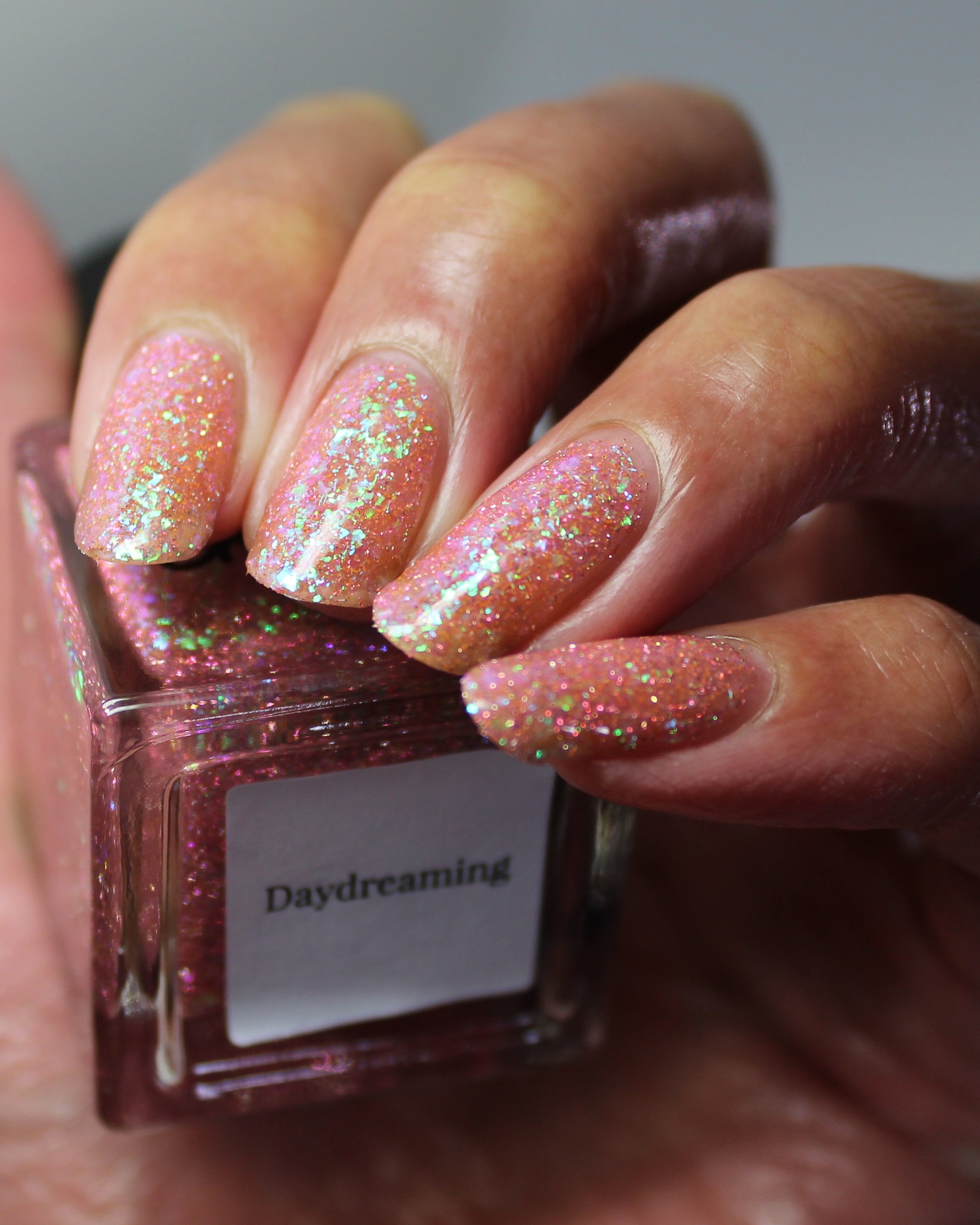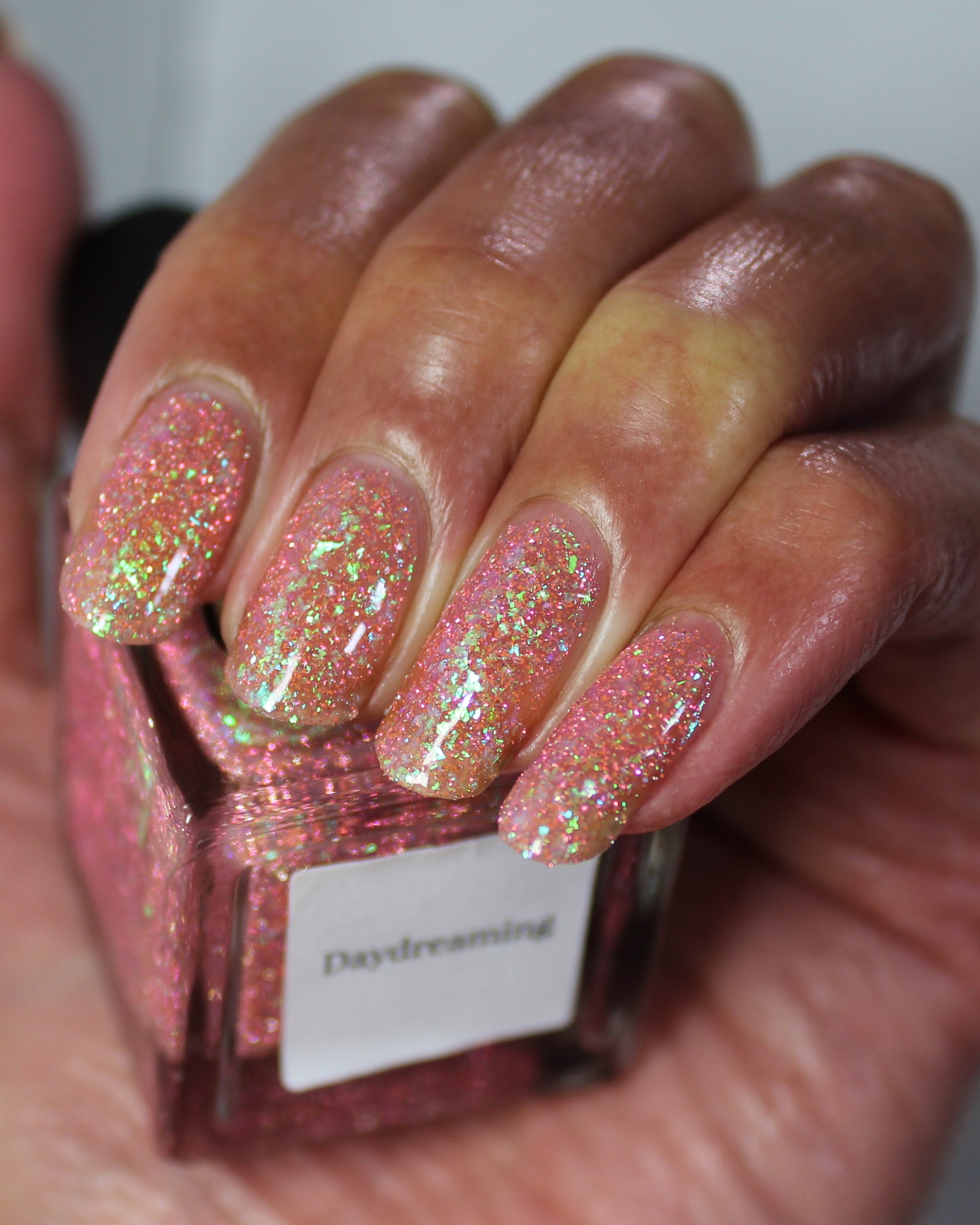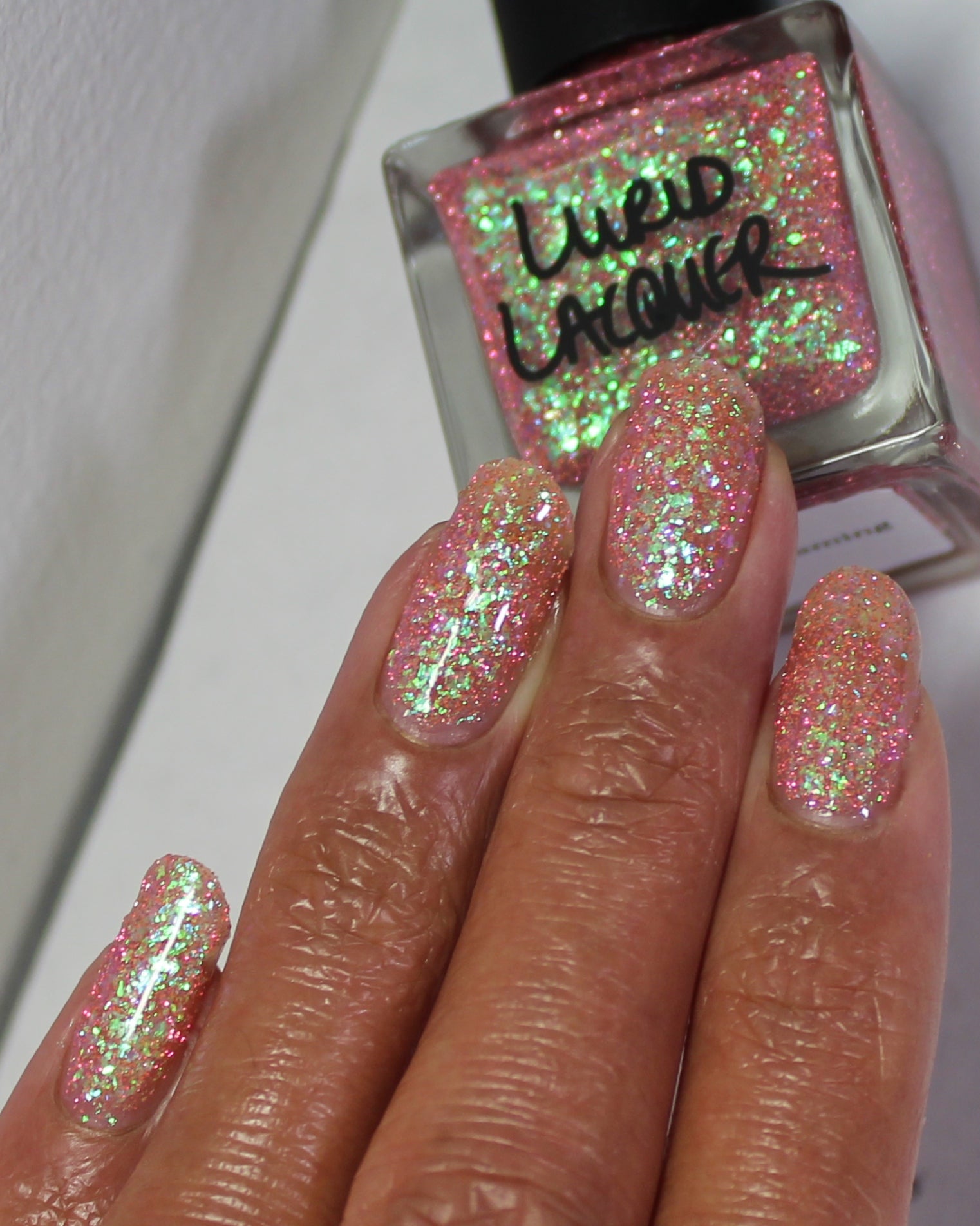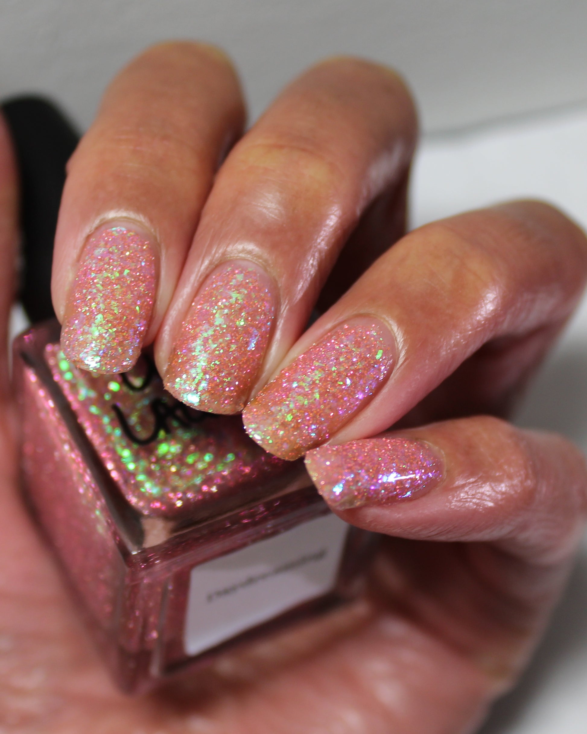 A clear base packed with green to purple to pink iridescent flakies and coral light reflective glitter