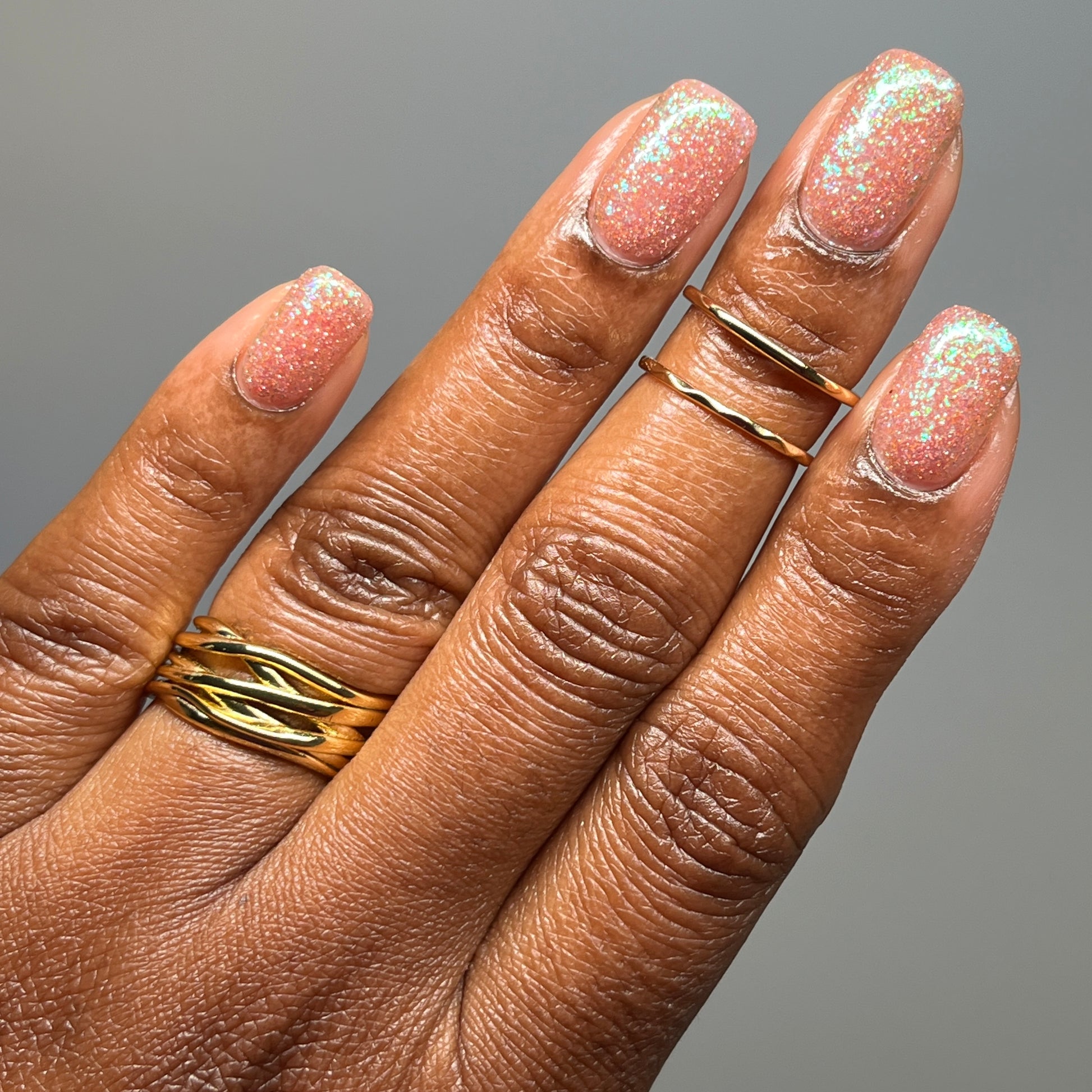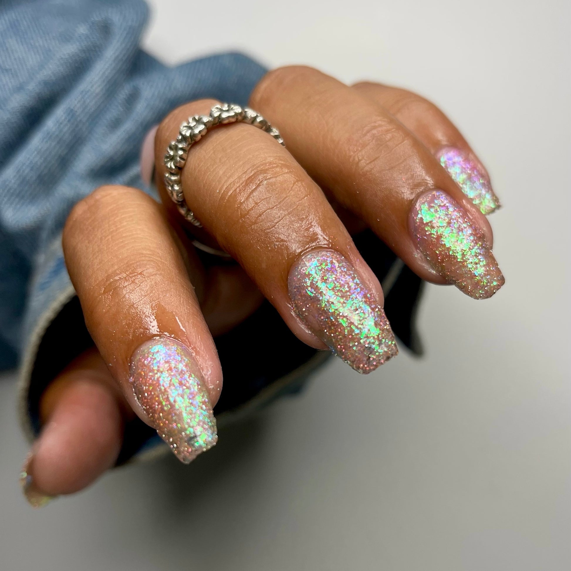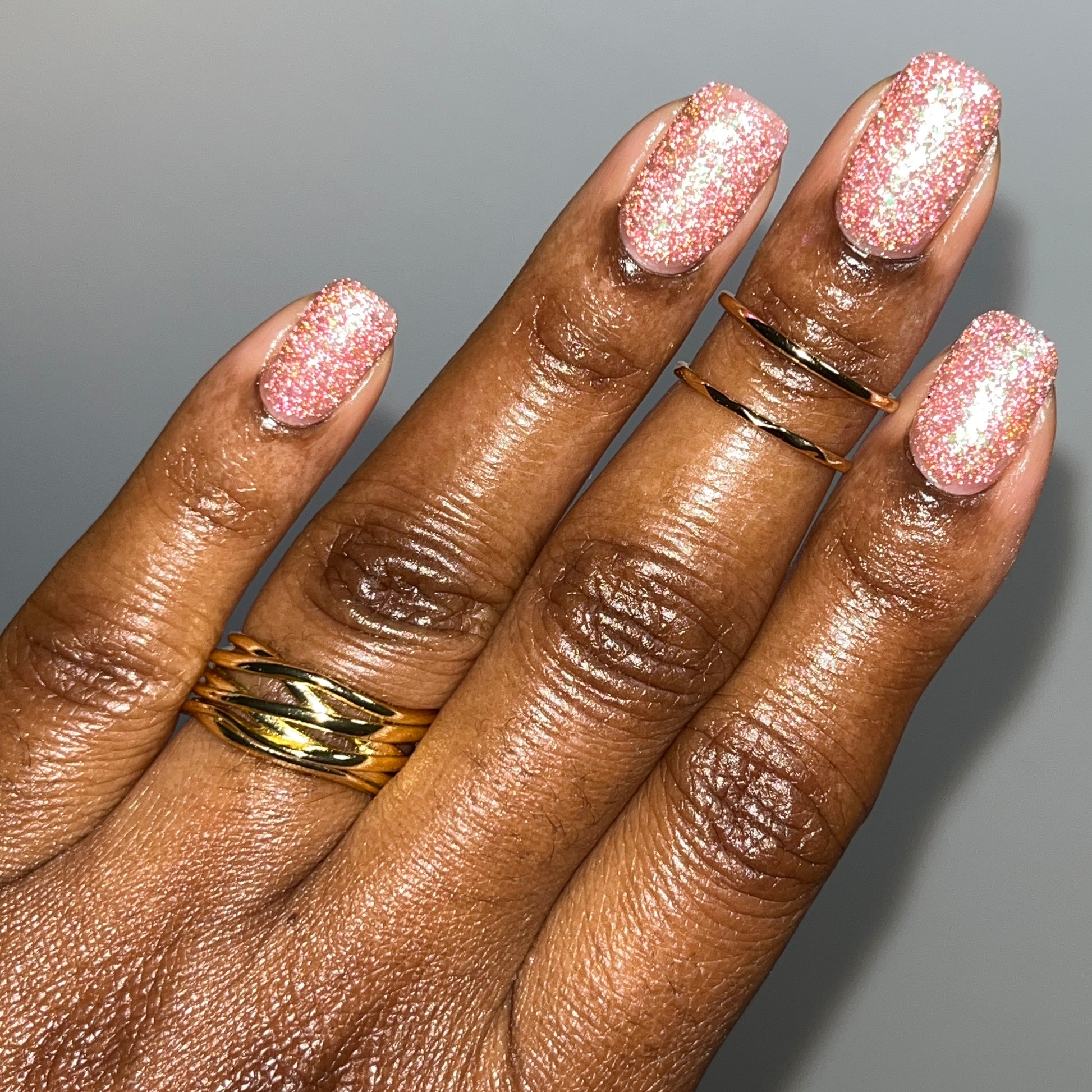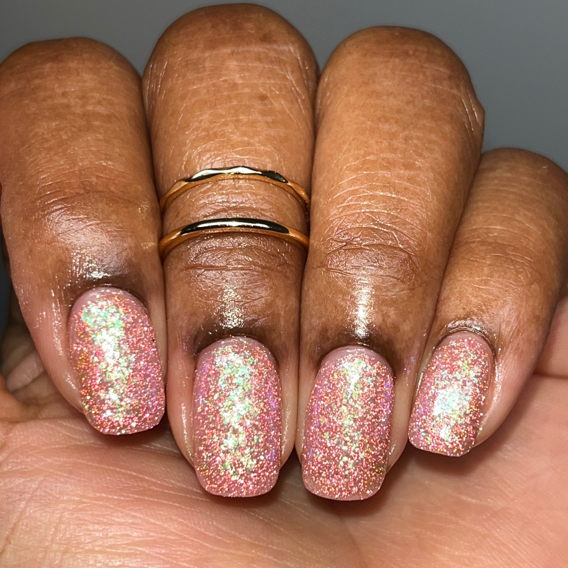 Please note: Reflective glitter polishes are textured and dry down with a gritty, sandpaper feeling. To make them look smooth and glossy, I recommend applying 2-3 coats of the polish, then applying one coat of a glitter smoother, followed by one coat of top coat.