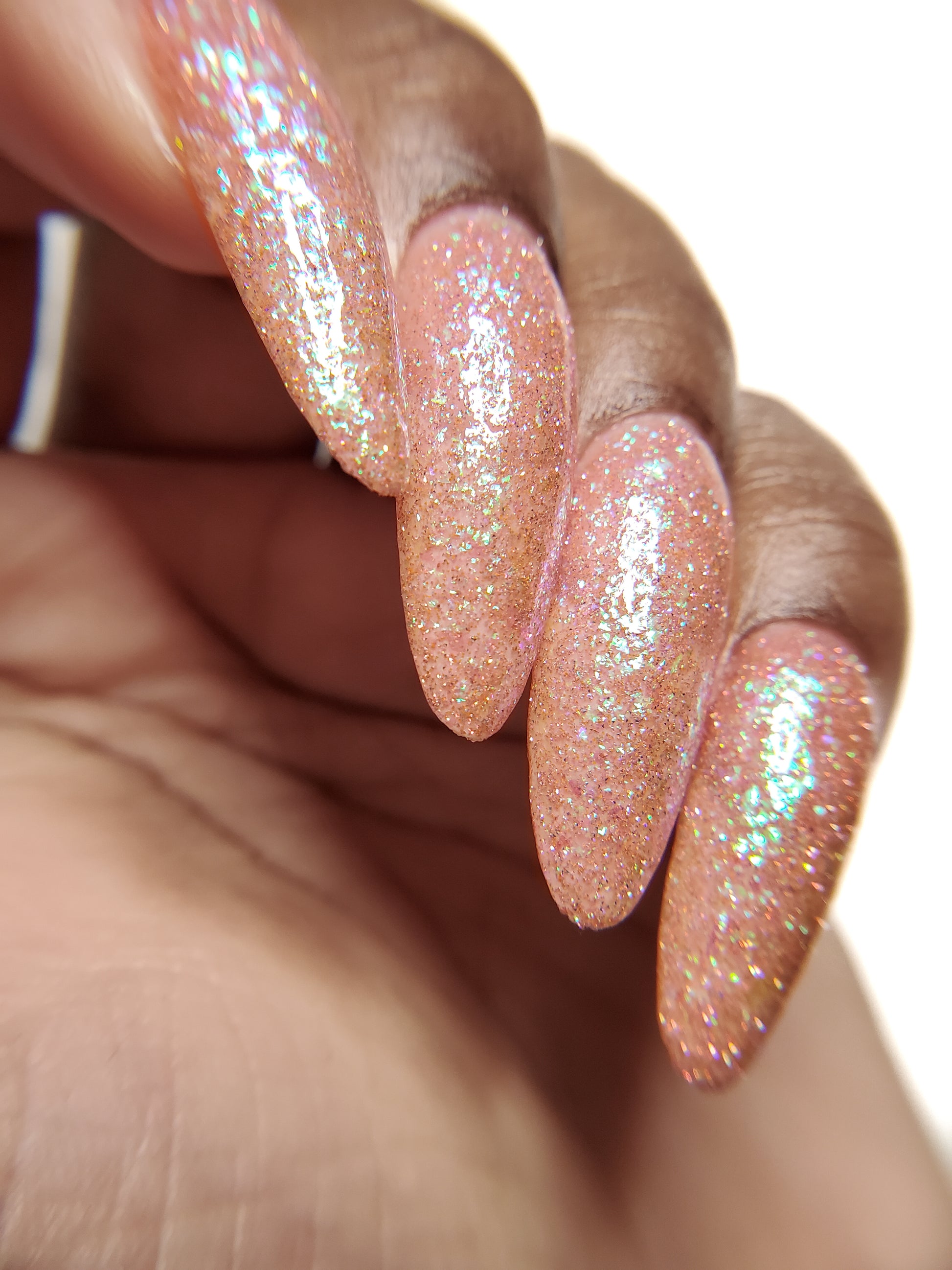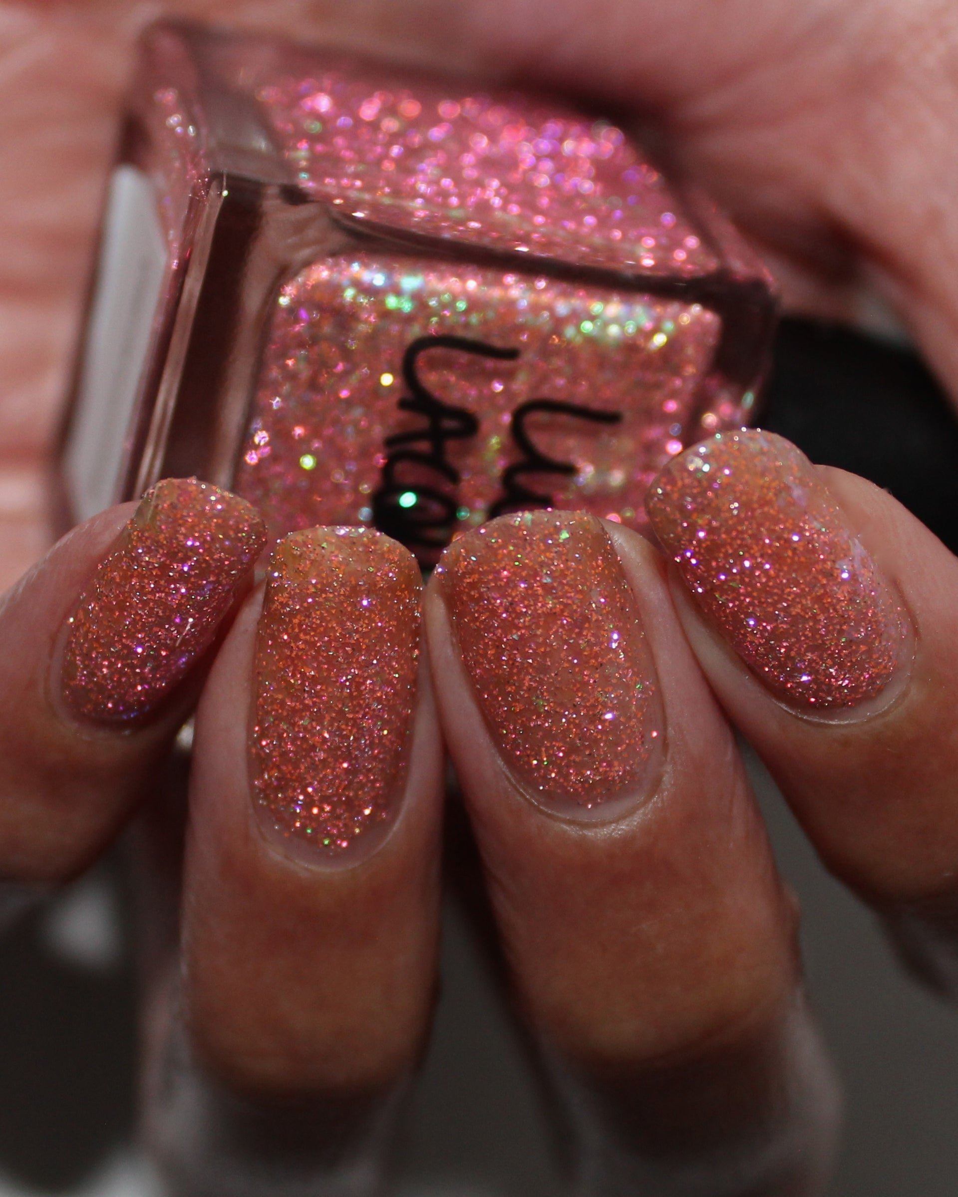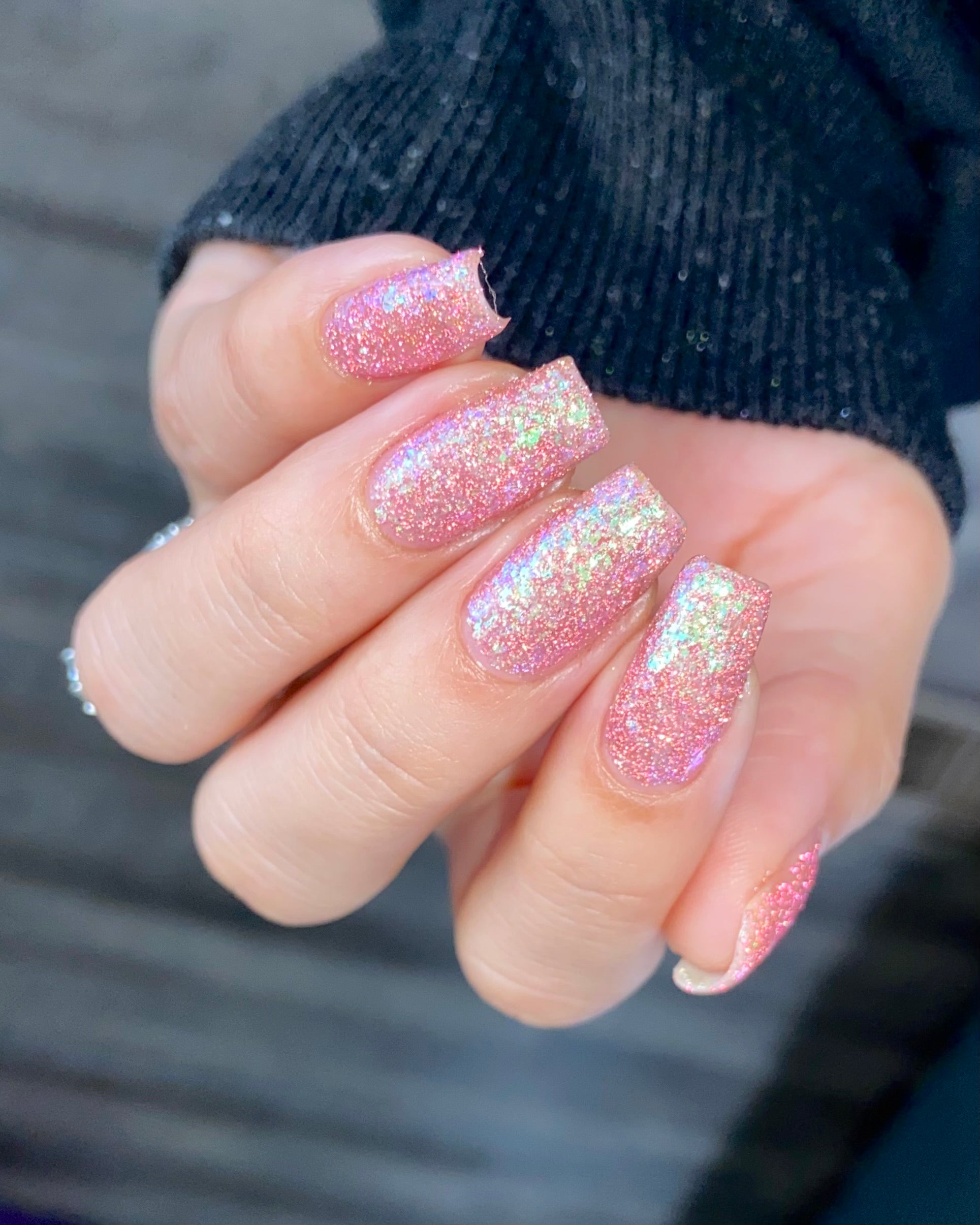 Please note: Reflective glitter polishes are textured and dry down with a gritty, sandpaper feeling. To make them look smooth and glossy, I recommend applying 2-3 coats of the polish, then applying one coat of a glitter smoother, followed by one coat of top coat.
