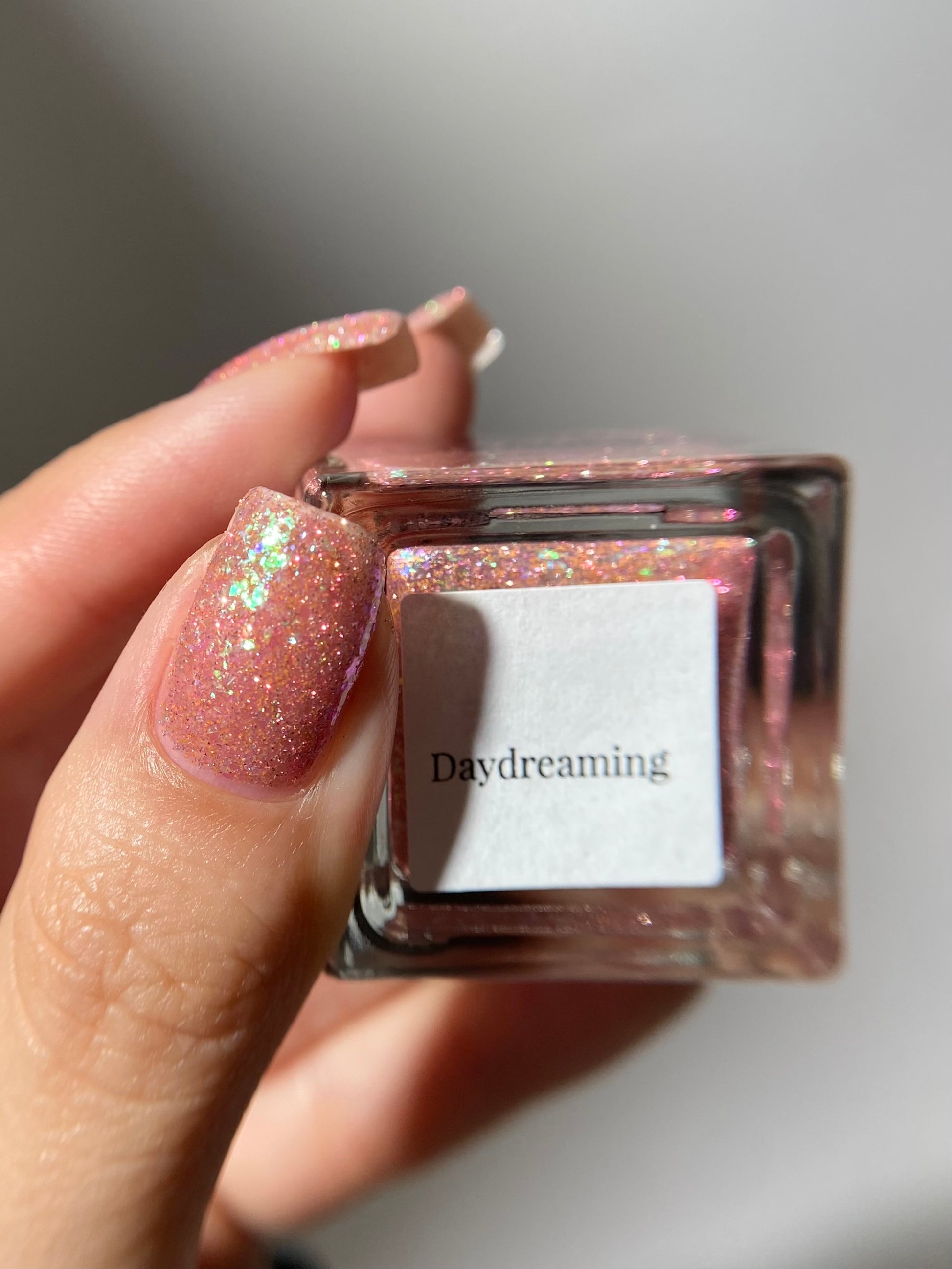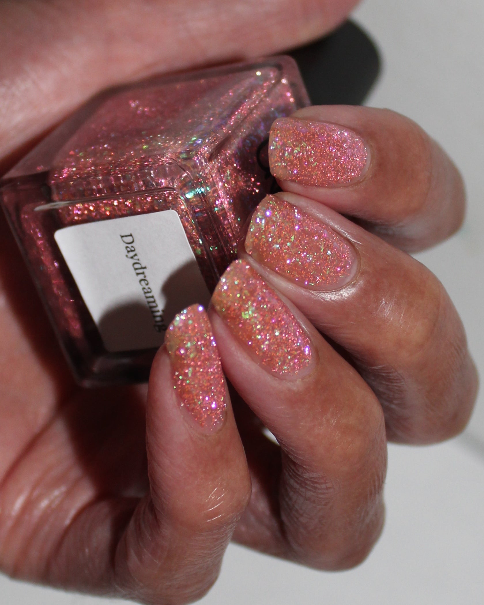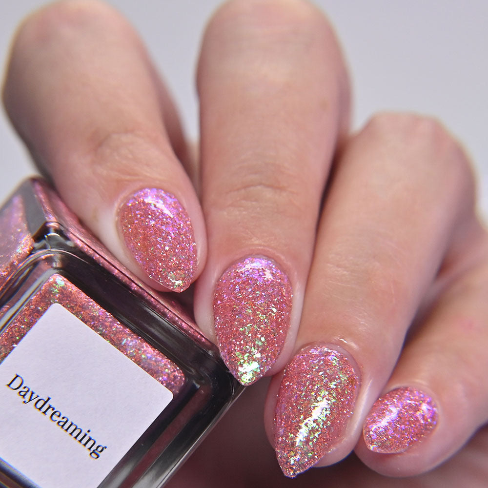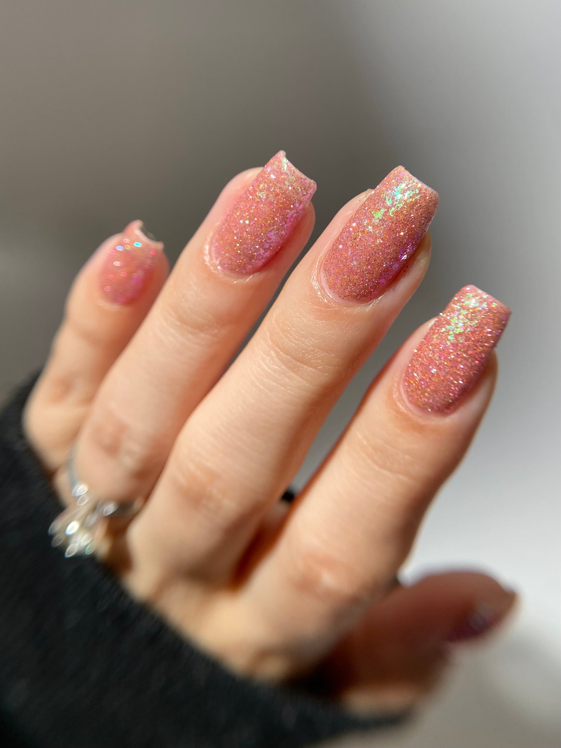 Please note: Reflective glitter polishes are textured and dry down with a gritty, sandpaper feeling. To make them look smooth and glossy, I recommend applying 2-3 coats of the polish, then applying one coat of a glitter smoother, followed by one coat of top coat.