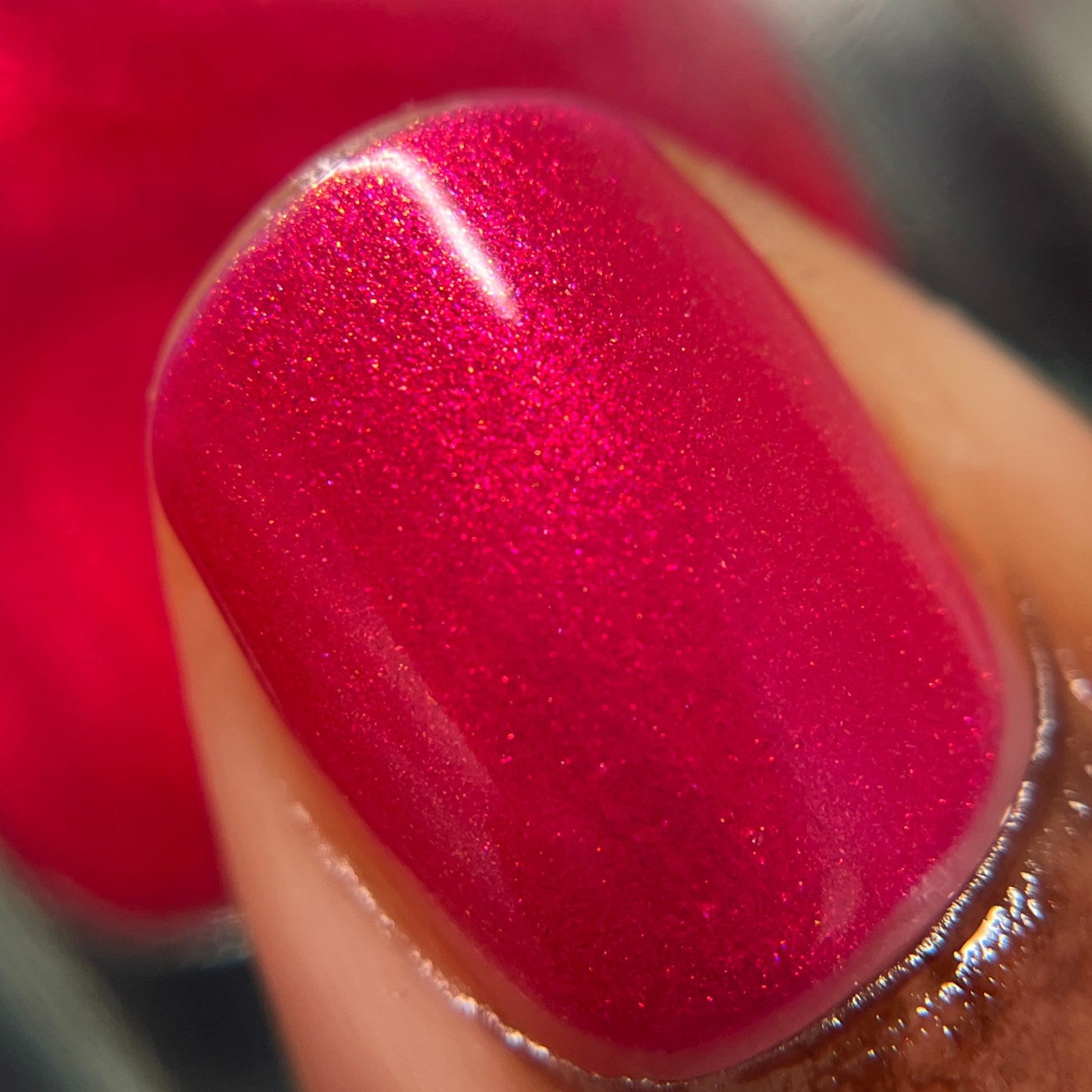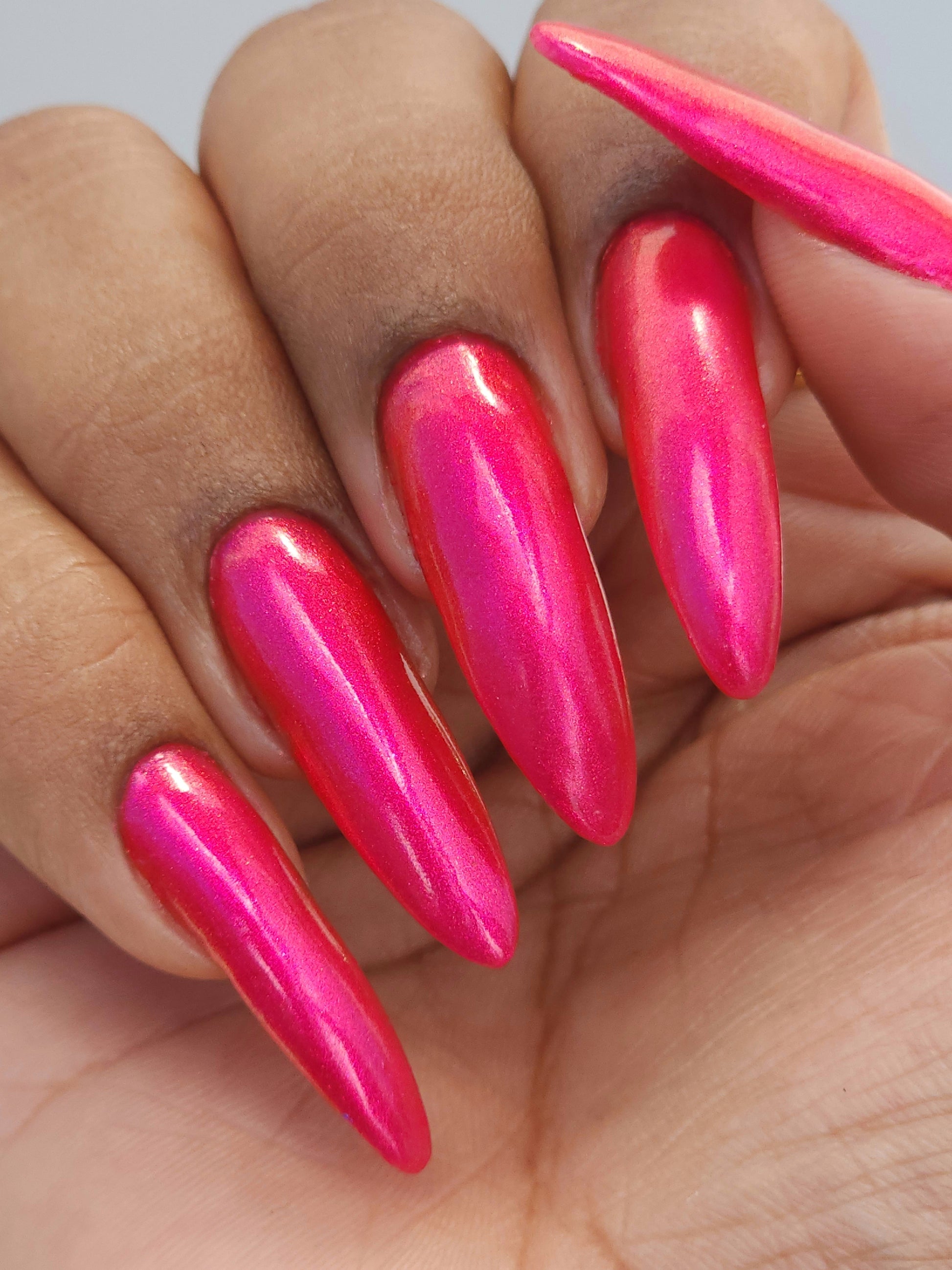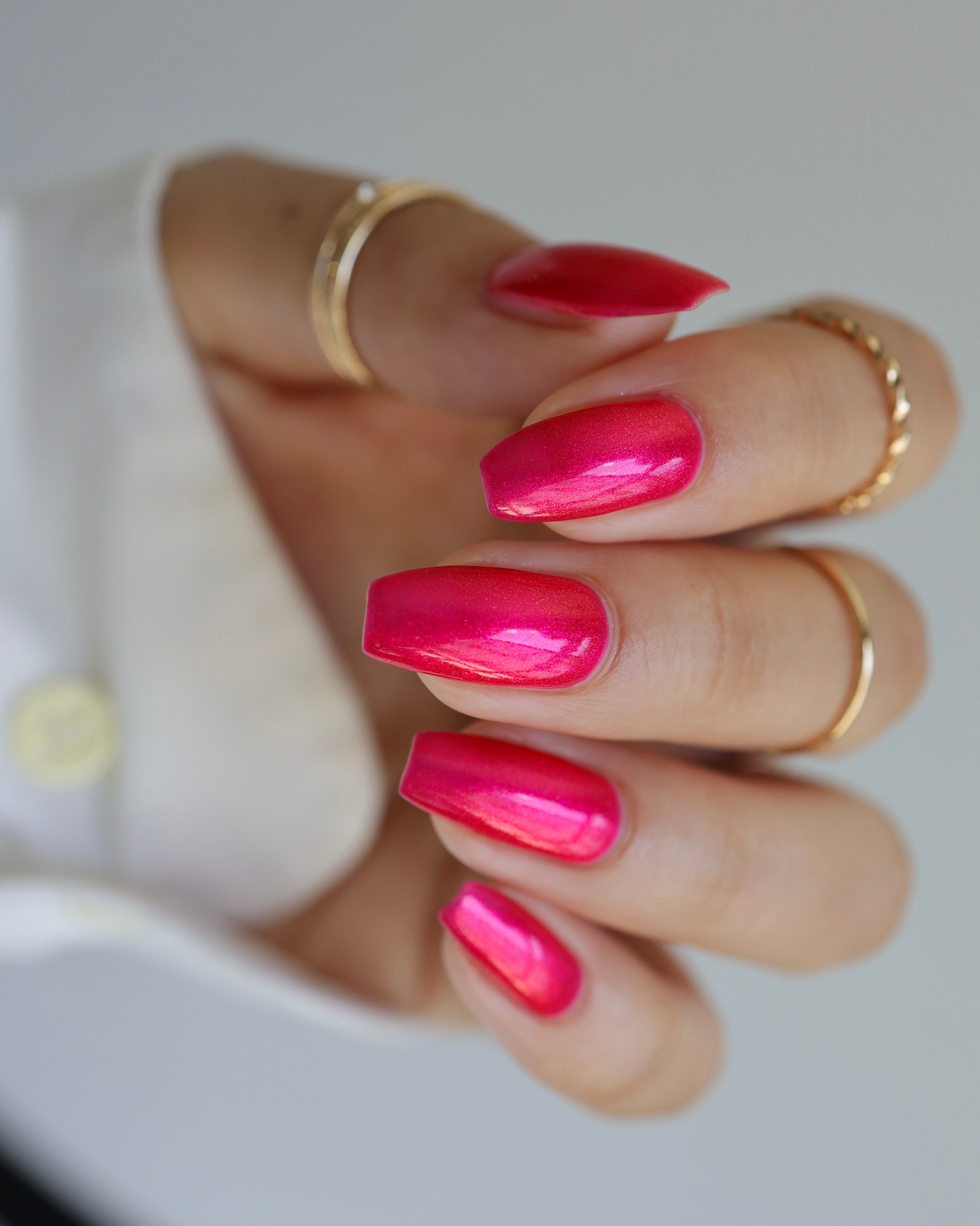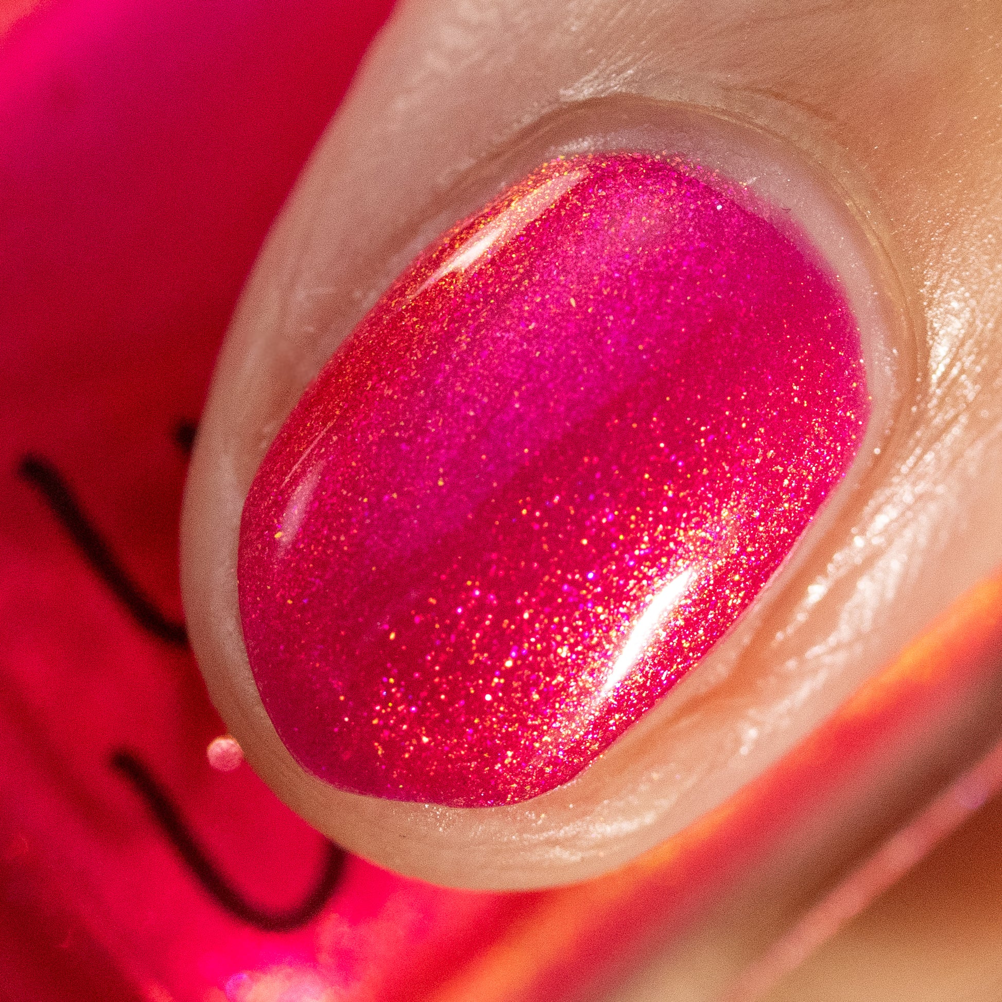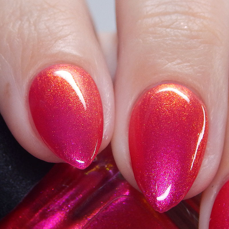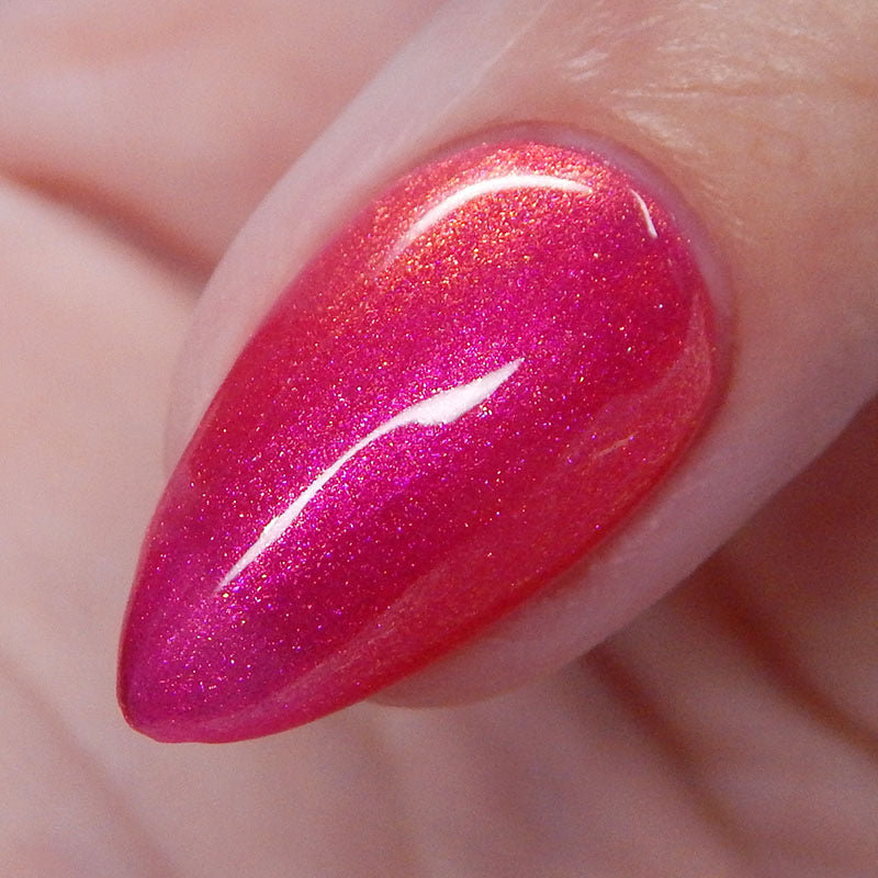 A pinkish-red jelly base with aurora shimmer that shifts from pink to orange to gold